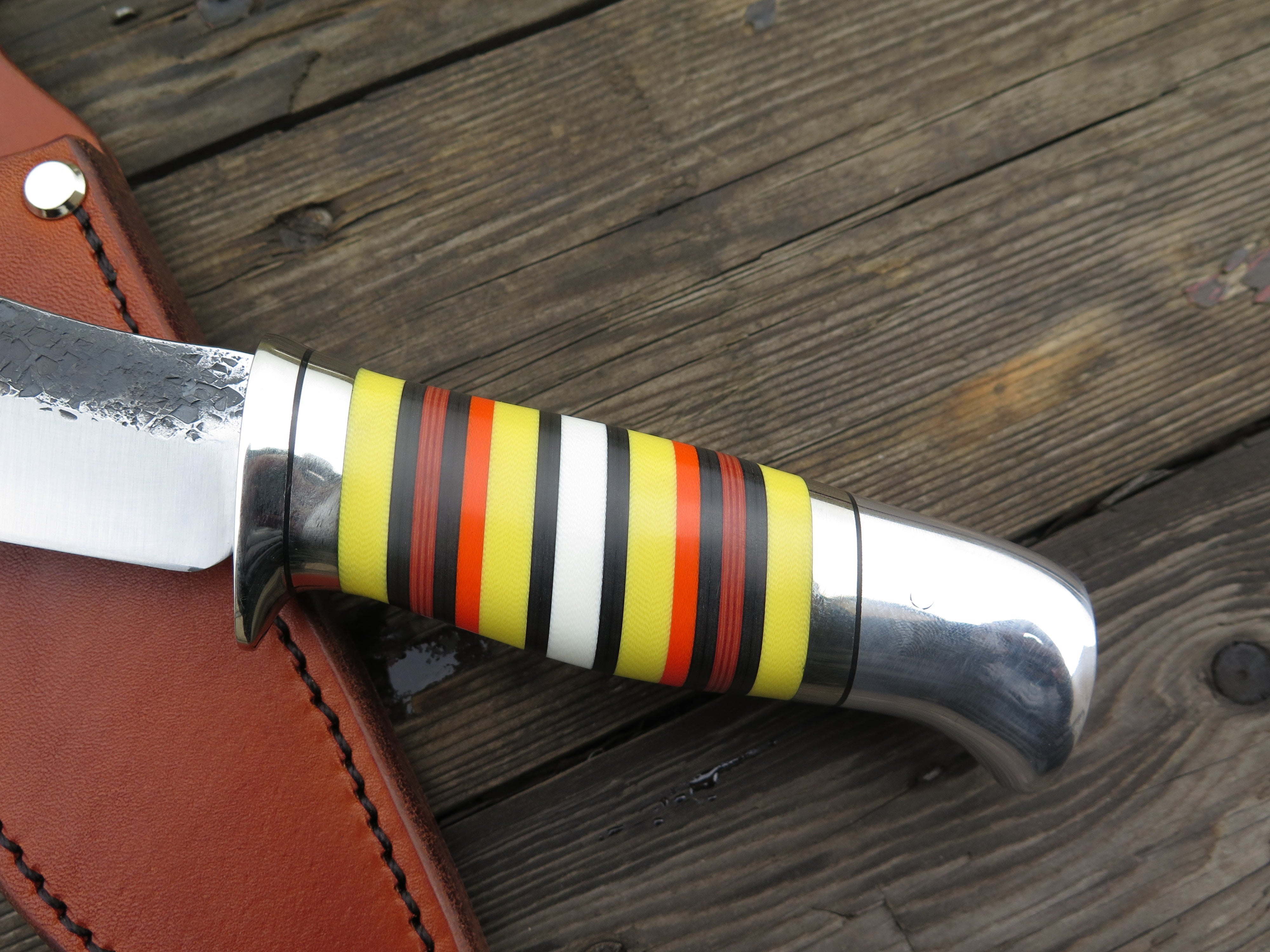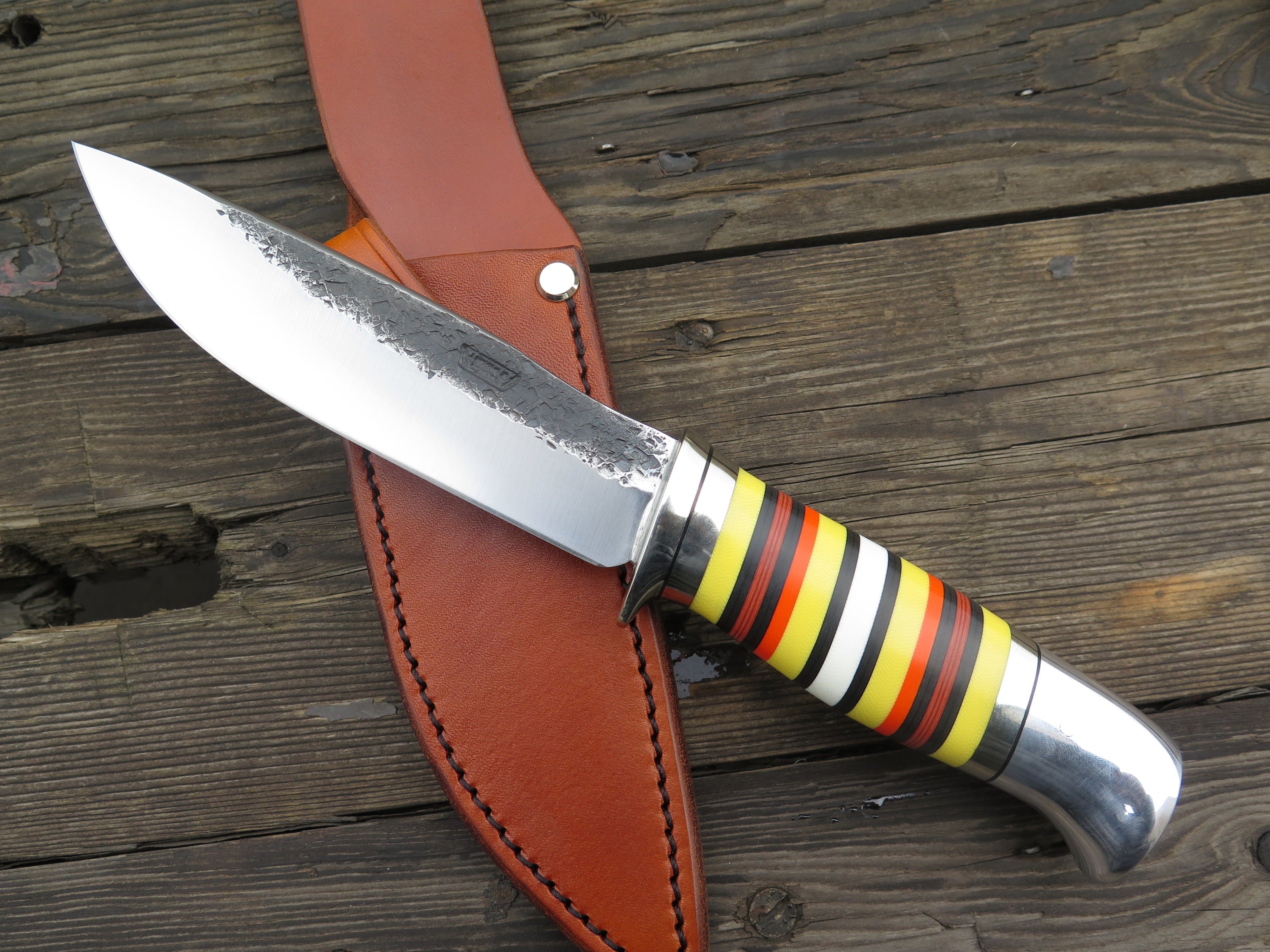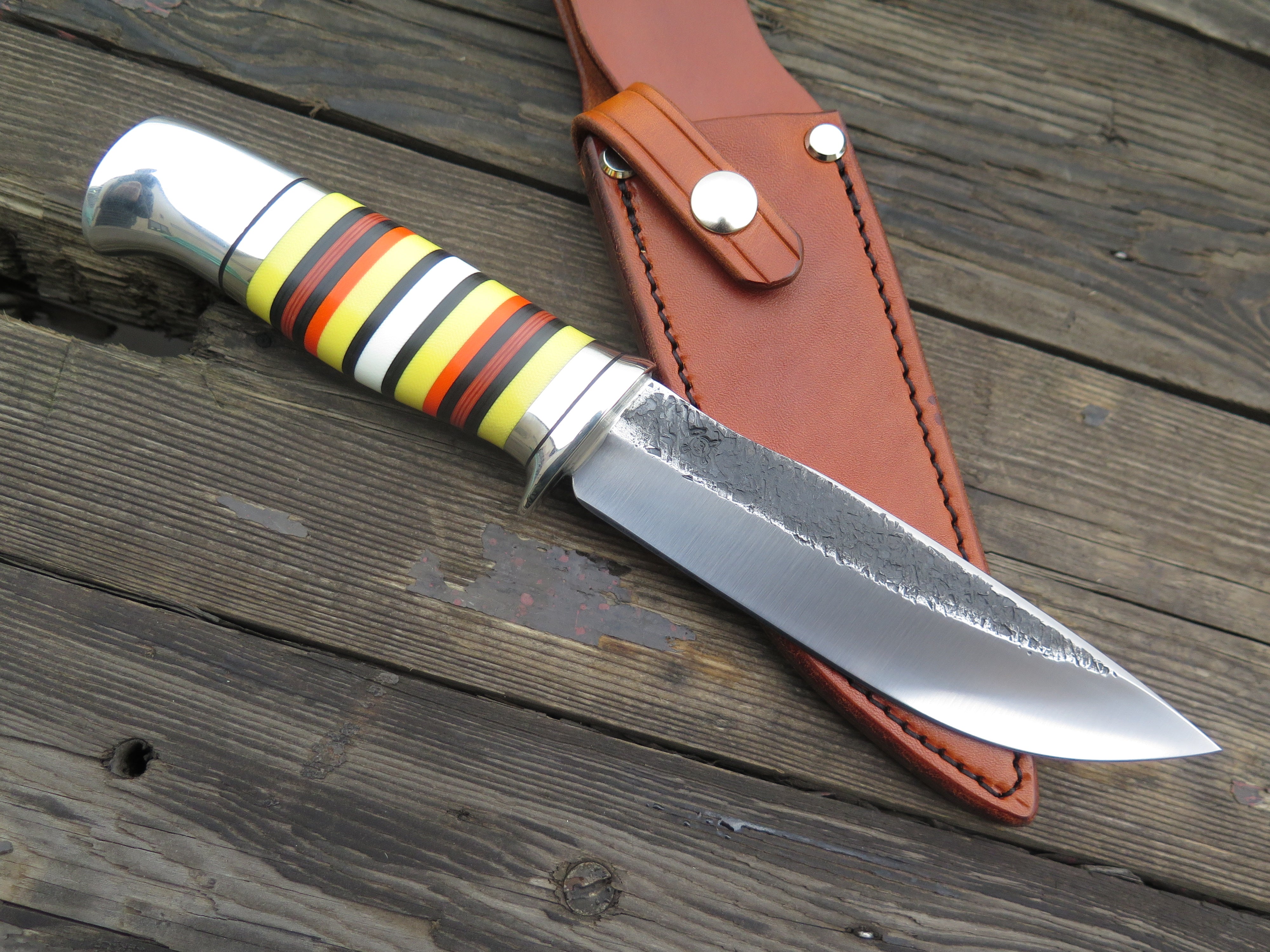 This incredible new Drop Point from Behring Made© is a tribute to the knives made by soldiers while deployed during WWII. Many would source loose materials and create brilliant works of art- in this case it cuts like a razor too! The blade is hand forged from 13/64" thick 5160 spring steel and it measures 6" from tip to guard with a razor sharp hollow grind and our hammermark finish. The nickel silver guard is soldered in place above black and maroon fiber, aluminum, white, orange and yellow g10 with an aluminum butt that's also pinned through the tang. The overall length measures 10 1/2" and it comes in a custom sheath from Warlander Leather. As this is an archive listing, please allow 6-8 weeks for production and delivery. Behring Made zipper case optional.