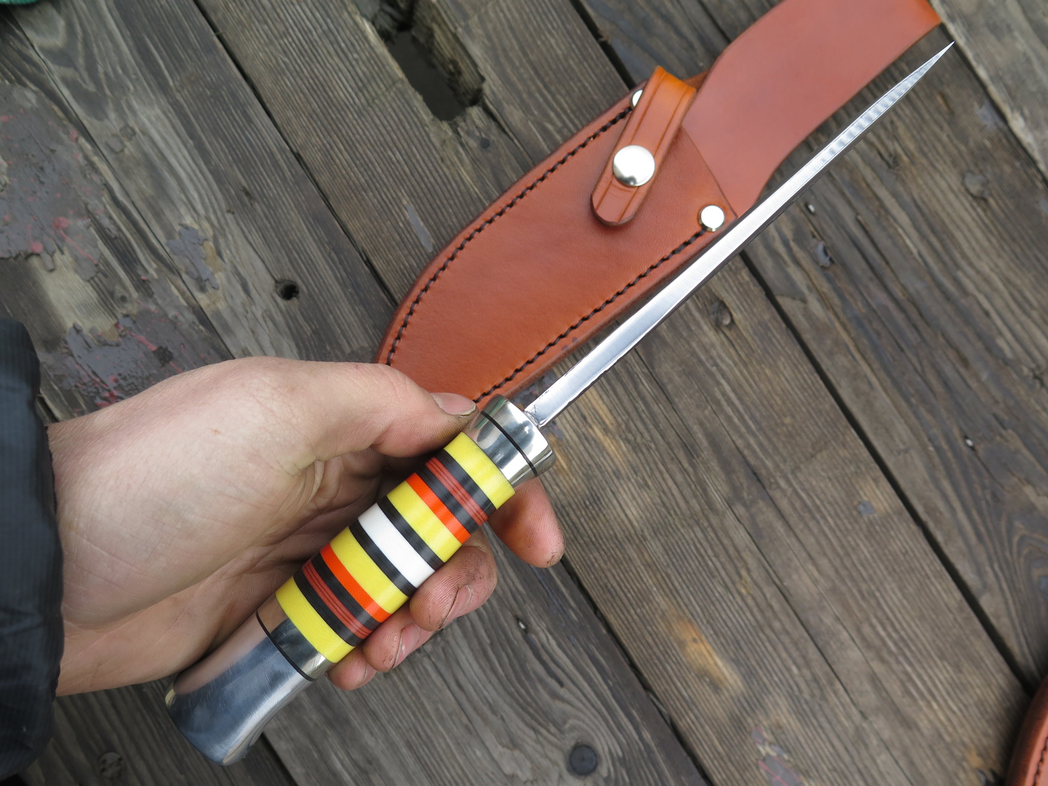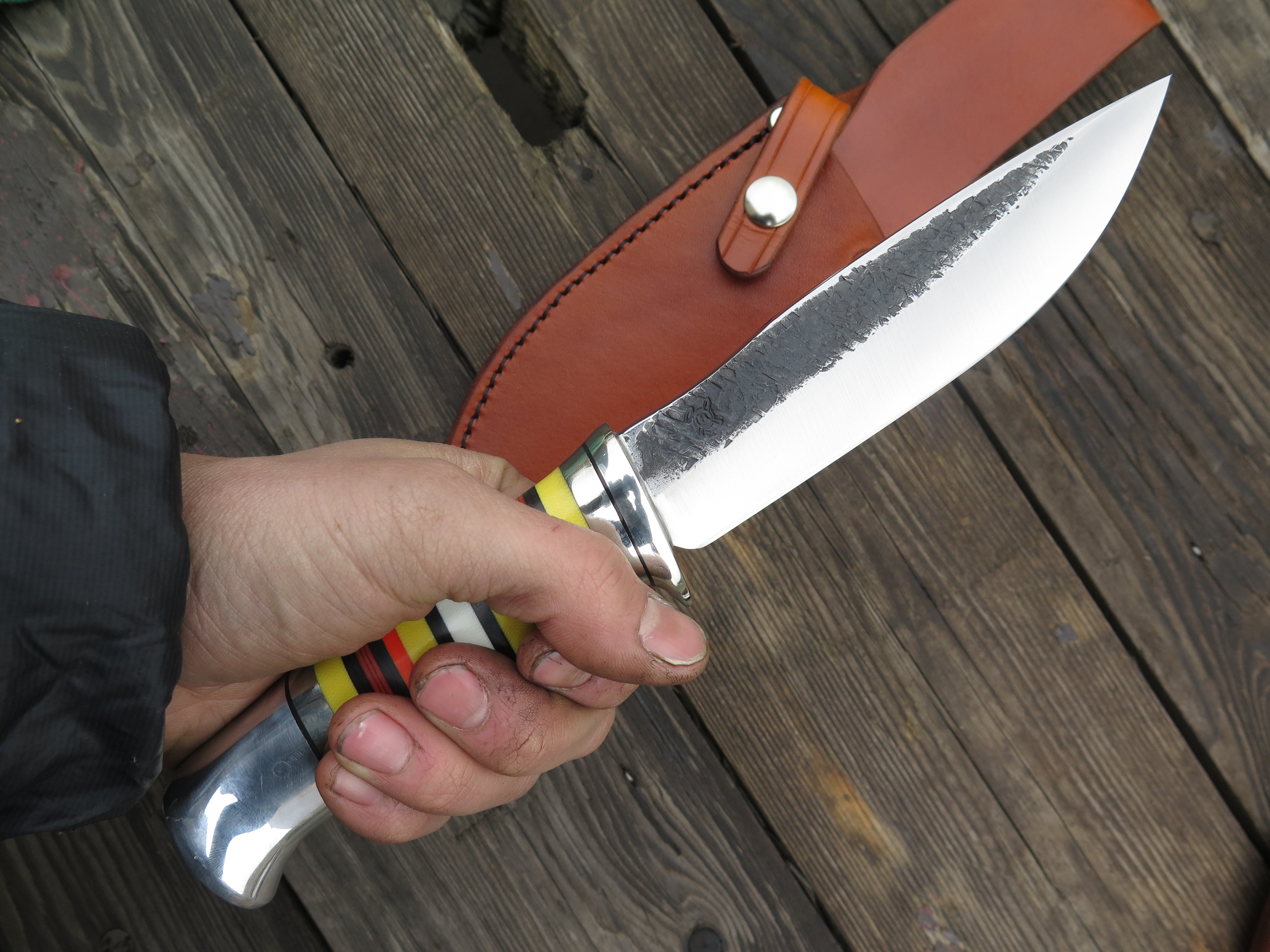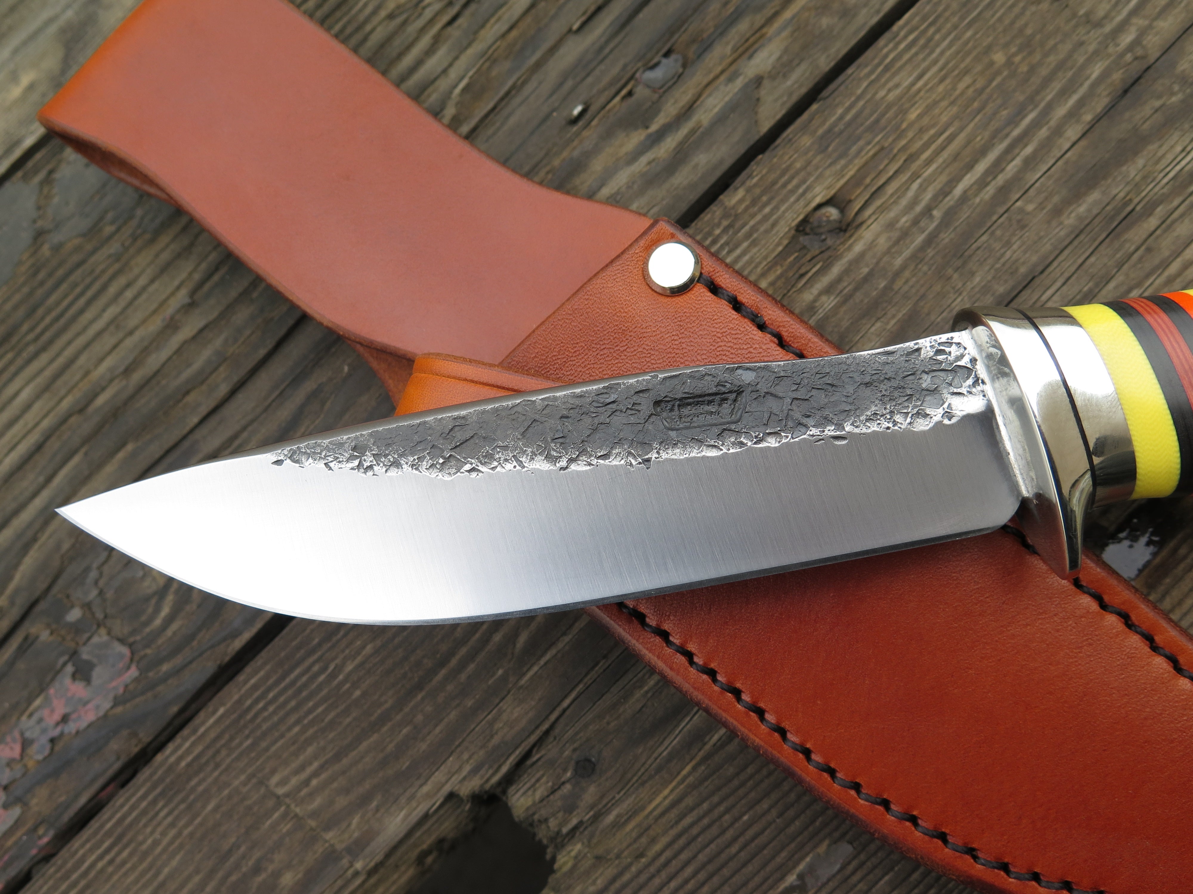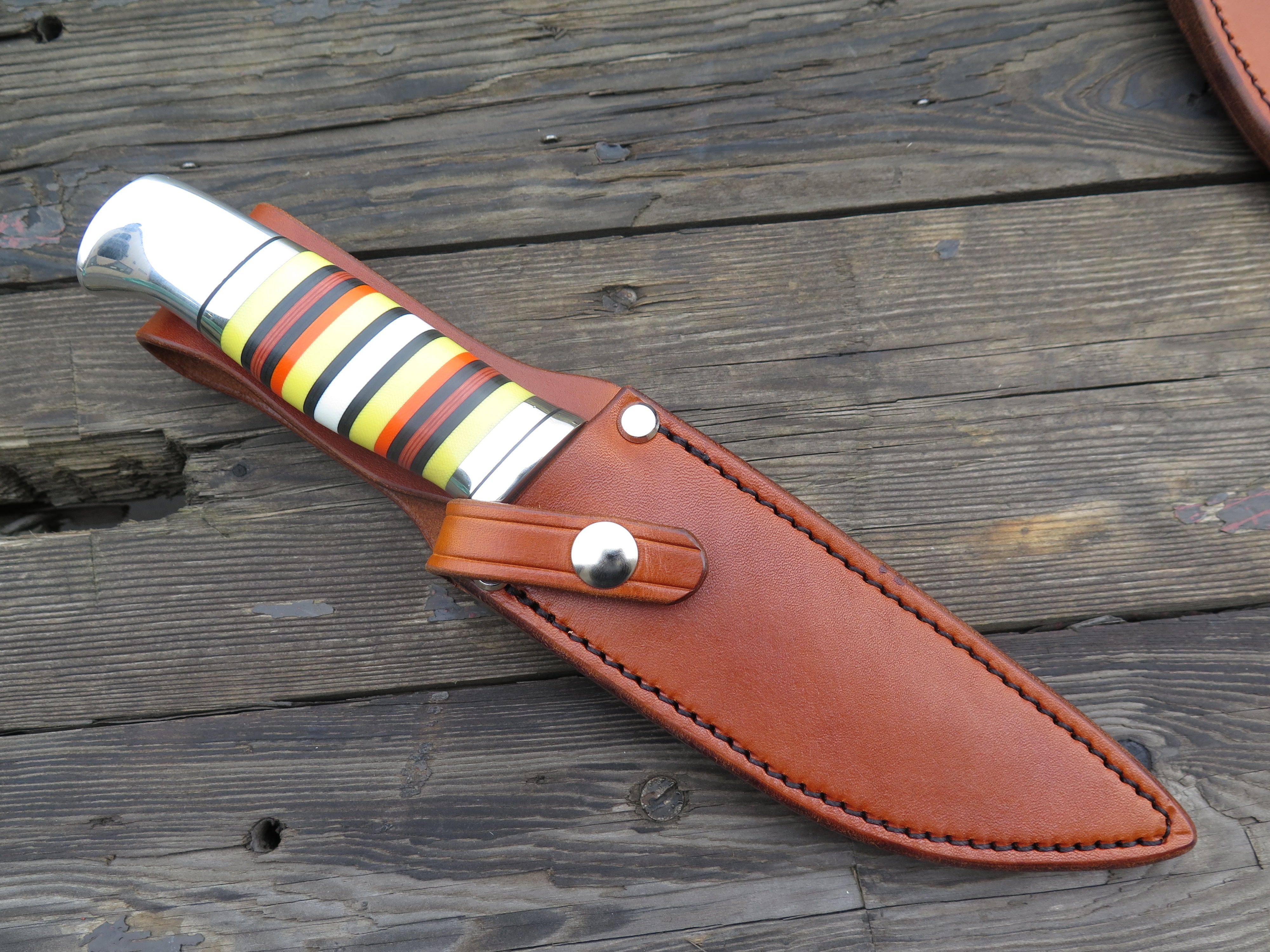 This incredible new Drop Point from Behring Made© is a tribute to the knives made by soldiers while deployed during WWII. Many would source loose materials and create brilliant works of art- in this case it cuts like a razor too! The blade is hand forged from 13/64" thick 5160 spring steel and it measures 6" from tip to guard with a razor sharp hollow grind and our hammermark finish. The nickel silver guard is soldered in place above black and maroon fiber, aluminum, white, orange and yellow g10 with an aluminum butt that's also pinned through the tang. The overall length measures 10 1/2" and it comes in a custom sheath from Warlander Leather. As this is an archive listing, please allow 6-8 weeks for production and delivery. Behring Made zipper case optional.