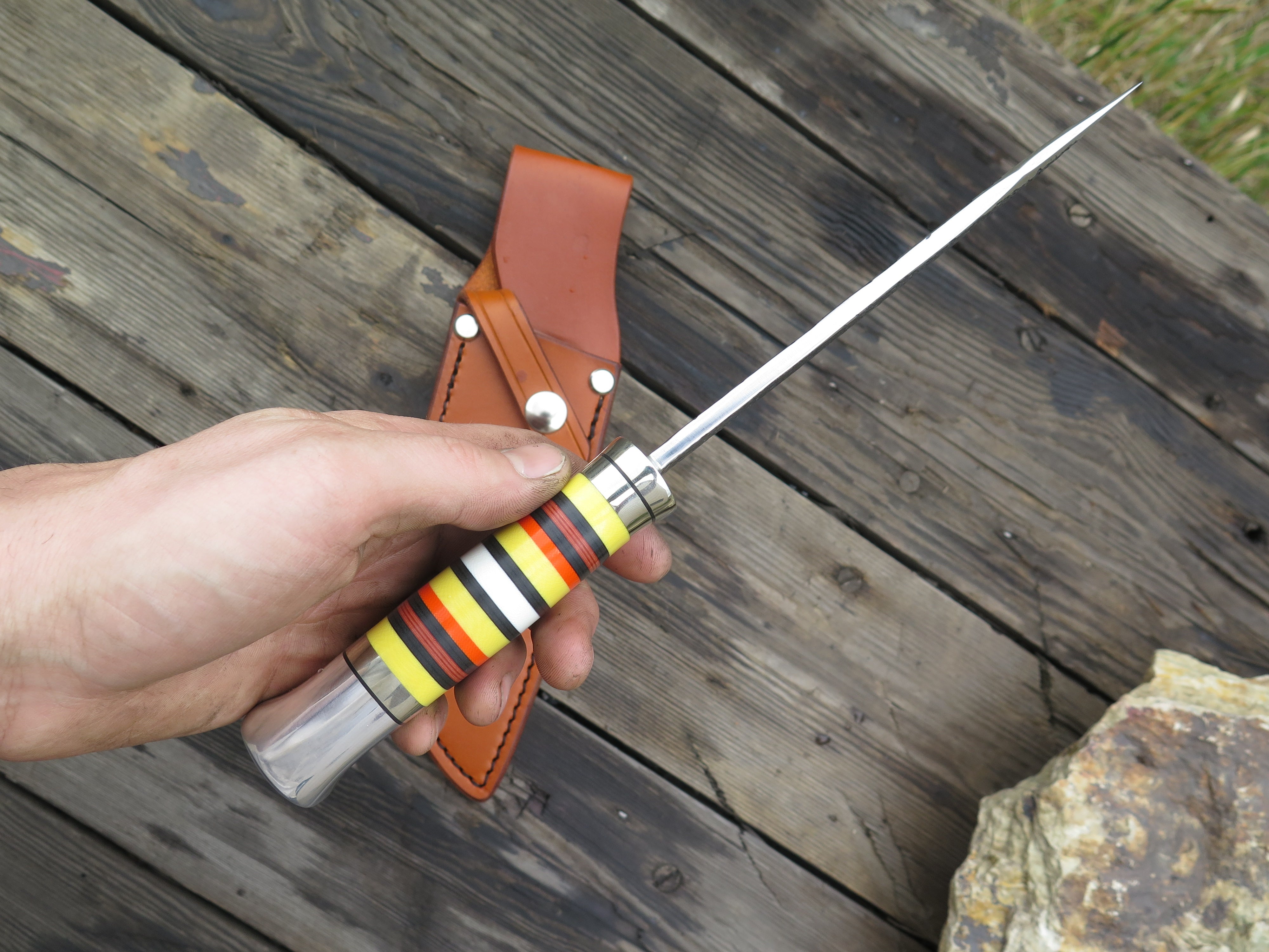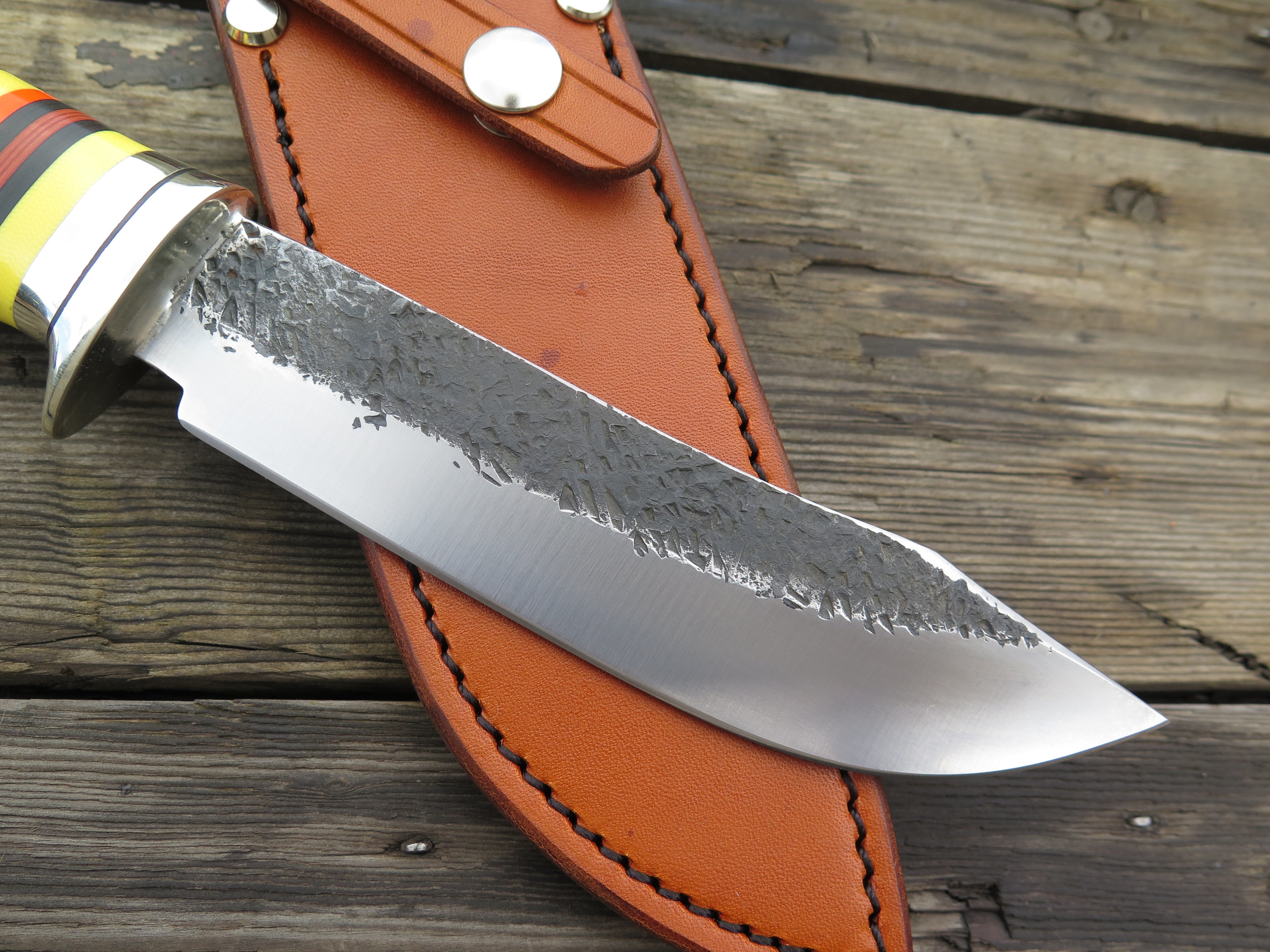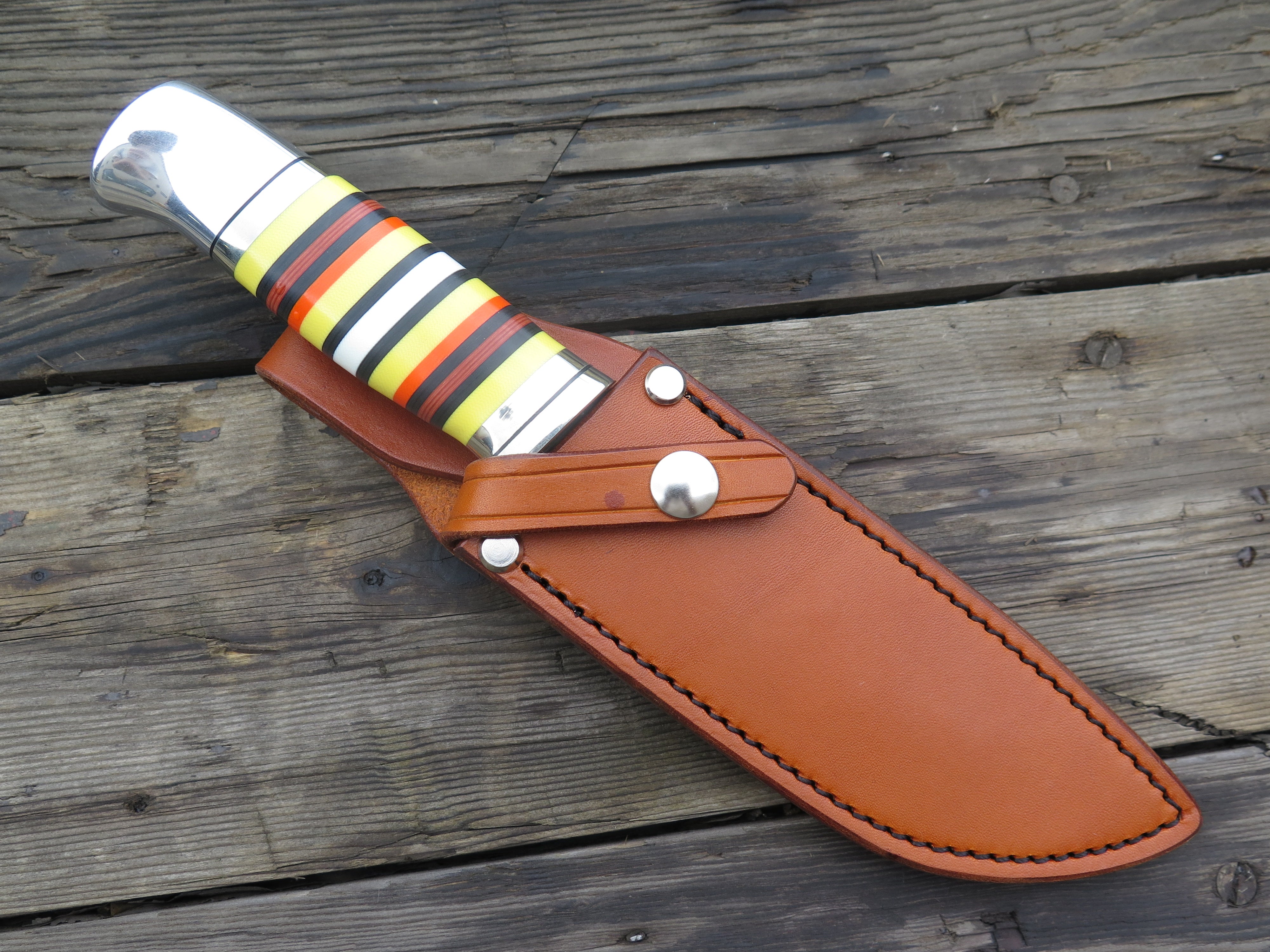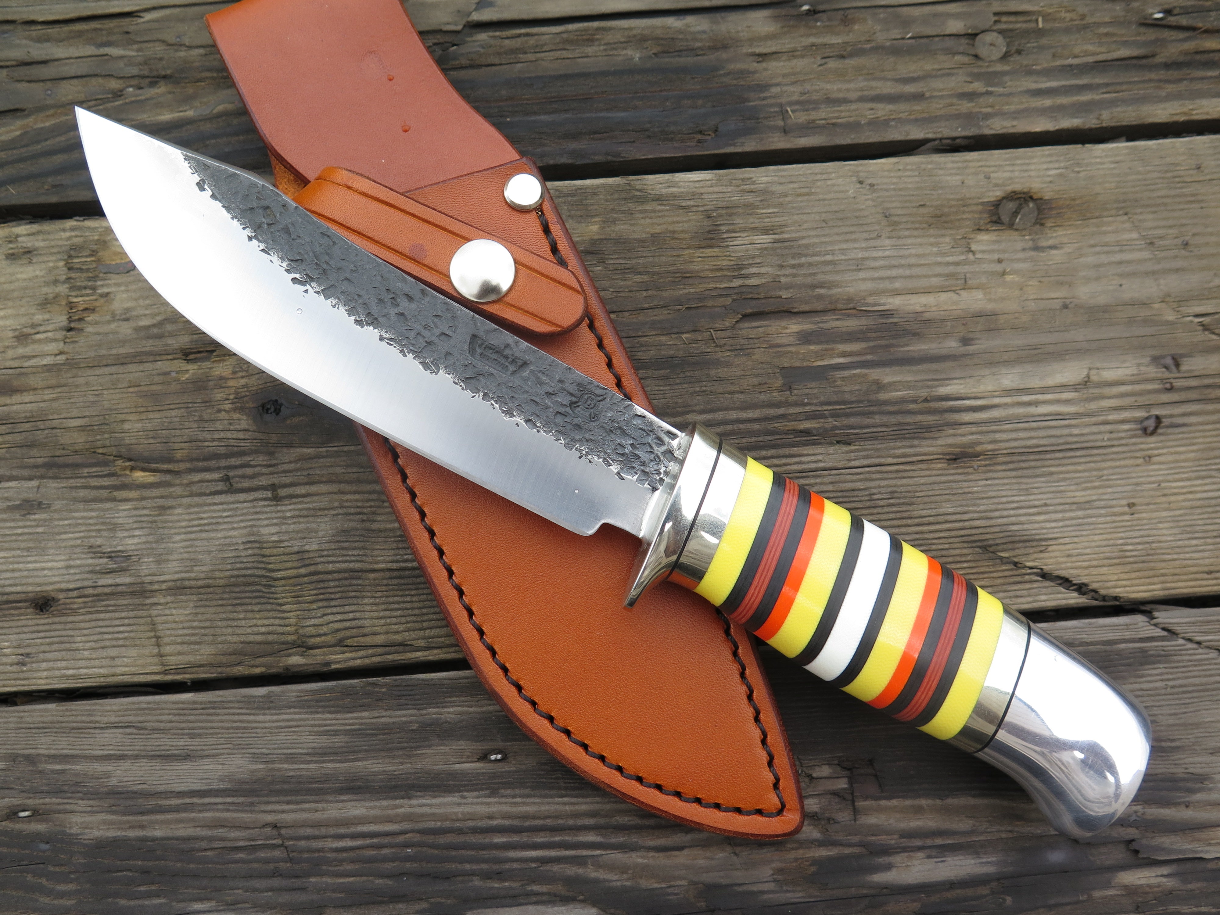 This incredible new offering from Behring Made© comes with quite the backstory. I received a phone call several months ago, with a horror story from a gentleman about a knife his great uncle had gifted him as a youth. It was one of a small set of WWII theater knives that had been given to he and his cousins and carried then for a lifetime- that is until his knife was stolen during a home remodel. He'd had but one photo of the original and from this James and I were able to recreate this tribute knife for him. The blade is hand forged from 13/64" and measures 6" from tip to guard with a razor sharp hollow grind and our hammermark finish. The nickel silver guard is soldered in place above black fiber, aluminum, white, yellow and orange G10, black and maroon fiber spacers with a big aluminum butt that's pinned with aluminum. The overall length measures 10 3/4" and it comes in a custom sheath from Warlander Leather.
