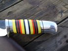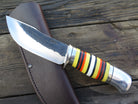 This incredible new Woodcraft from Behring Made© is a tribute to the theater knives made my deployed military personnel during wartime. They would typically source whatever scrap materials were available for handles and the outcomes were often bright and beautiful. The one is hand forged from 3/16" thick high carbon 01 tool steel and it measures 4 1/2" from tip to guard with a razor sharp hollow grind and our hammermark finish. The nickel silver guard is soldered in place above black and maroon fiber with white, orange and yellow g10 spacers above a big aluminum butt that's pinned through the tang with aluminum too. The overall length measures 9 1/2" and it comes in a Warlander Leather pouch sheath.