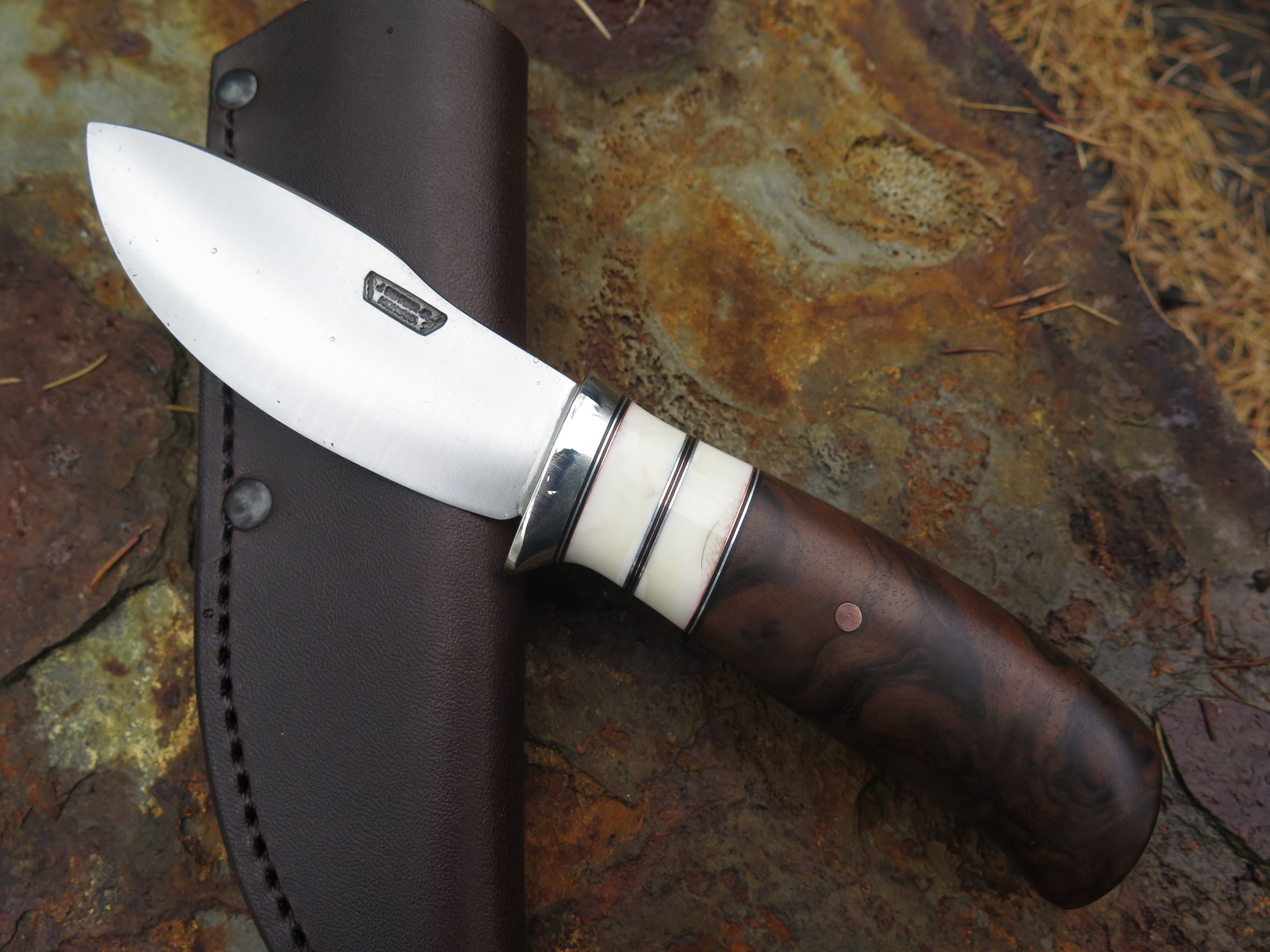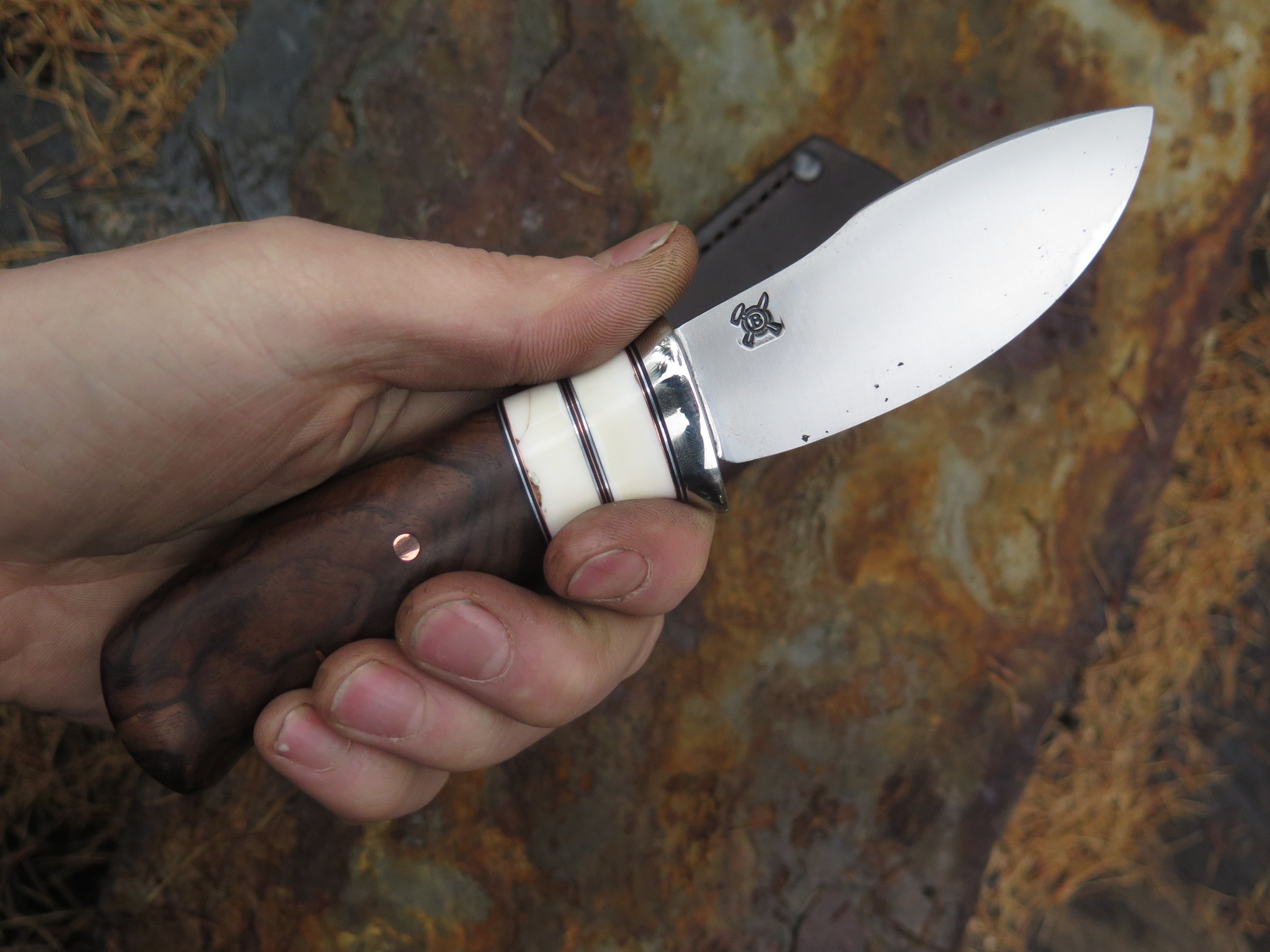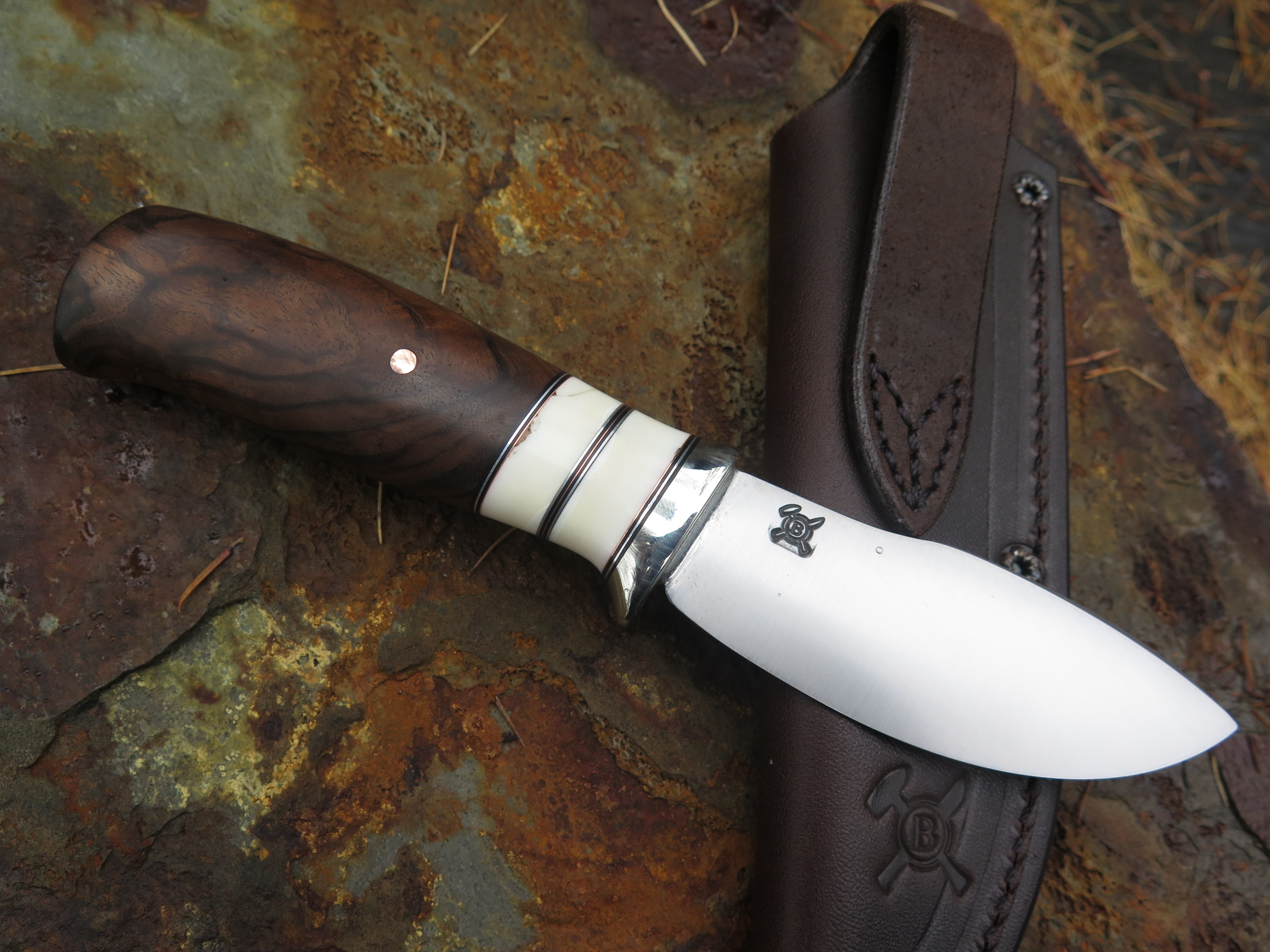 This dandy canoe knife from Behring Made© is hand forged from 1/8 thick high carbon 01 tool steel and it measures 3 1/2" from tip to guard with a razor sharp convex grind. The nickel silver guard is soldered in place above black fiber, copper, aluminum and two fossil walrus ivory spacers. The premium Turkish walnut handle is pinned through the tang with copper and overall it measures out to a little over 7 1/2", plus it comes in a classic leather belt pouch sheath.