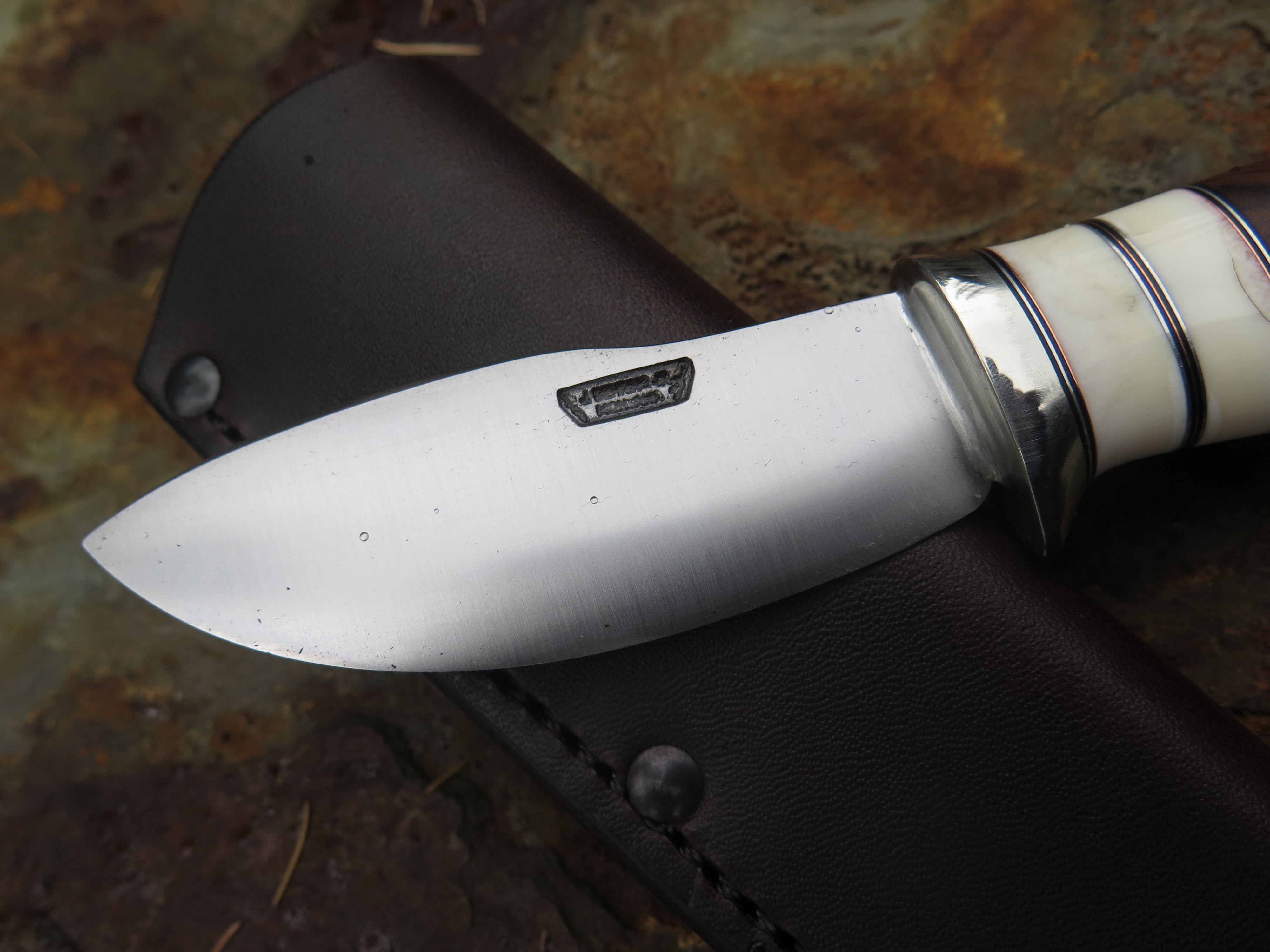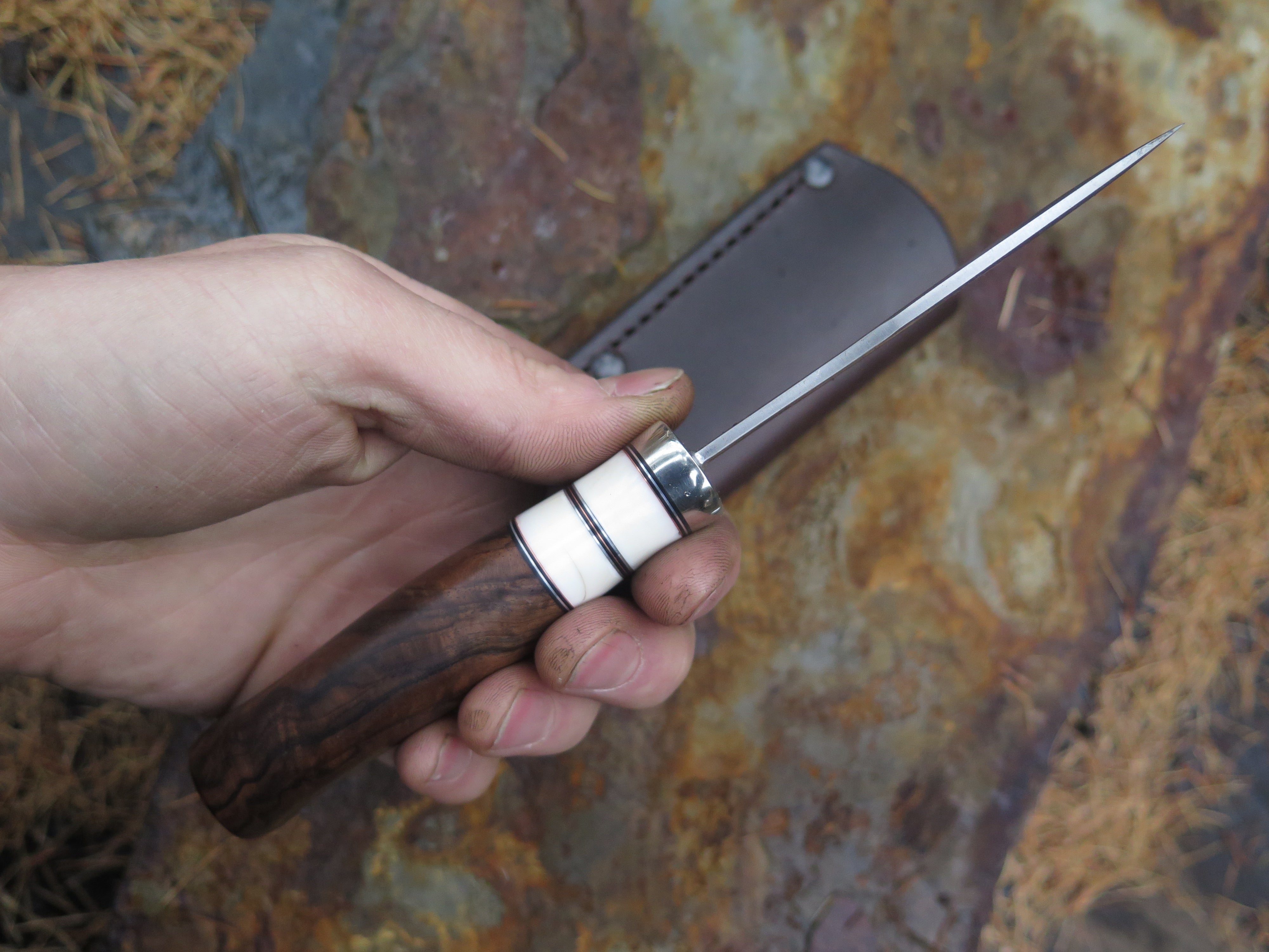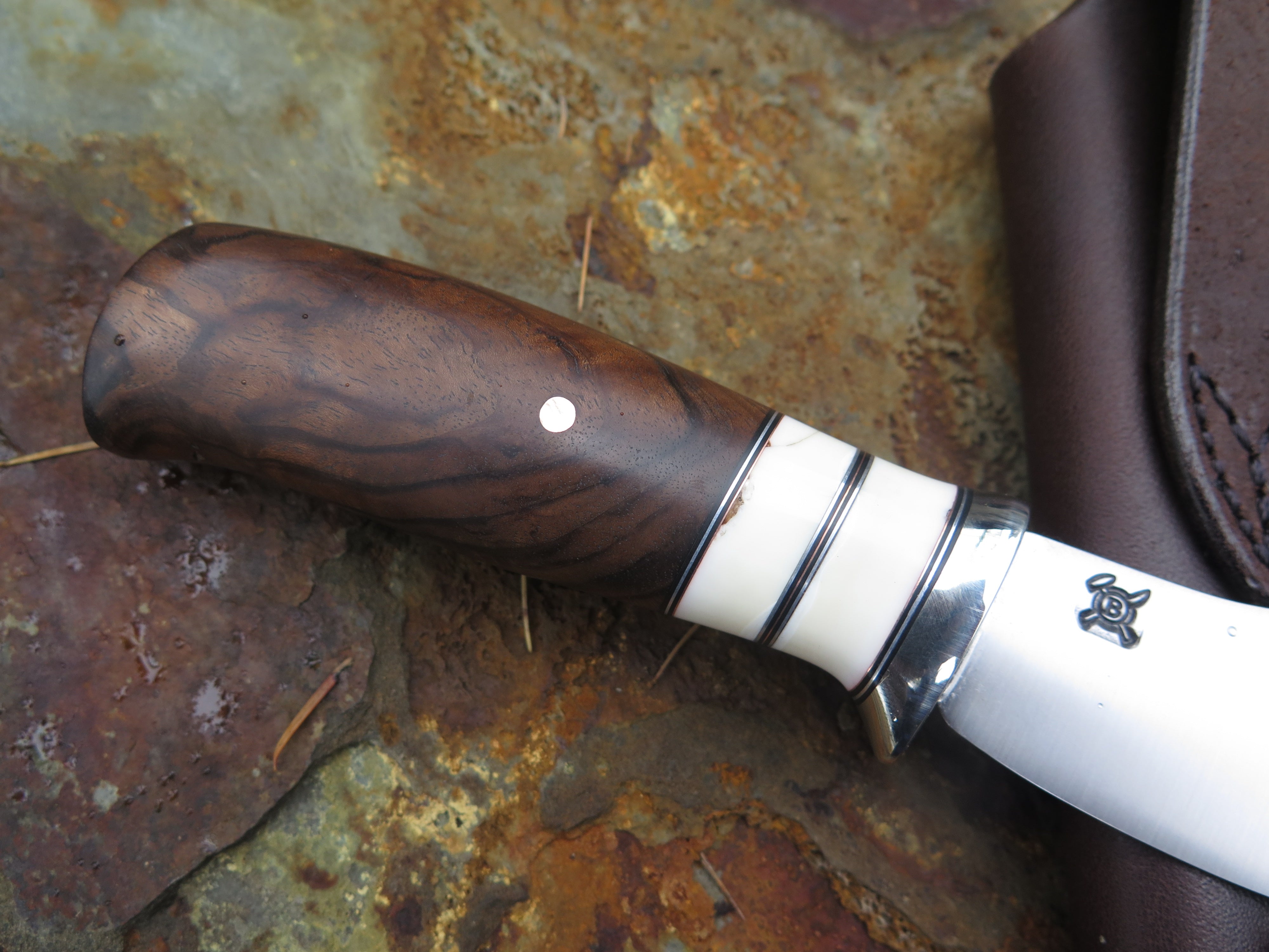 This dandy canoe knife from Behring Made© is hand forged from 1/8 thick high carbon 01 tool steel and it measures 3 1/2" from tip to guard with a razor sharp convex grind. The nickel silver guard is soldered in place above black fiber, copper, aluminum and two fossil walrus ivory spacers. The premium Turkish walnut handle is pinned through the tang with copper and overall it measures out to a little over 7 1/2", plus it comes in a classic leather belt pouch sheath.