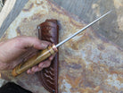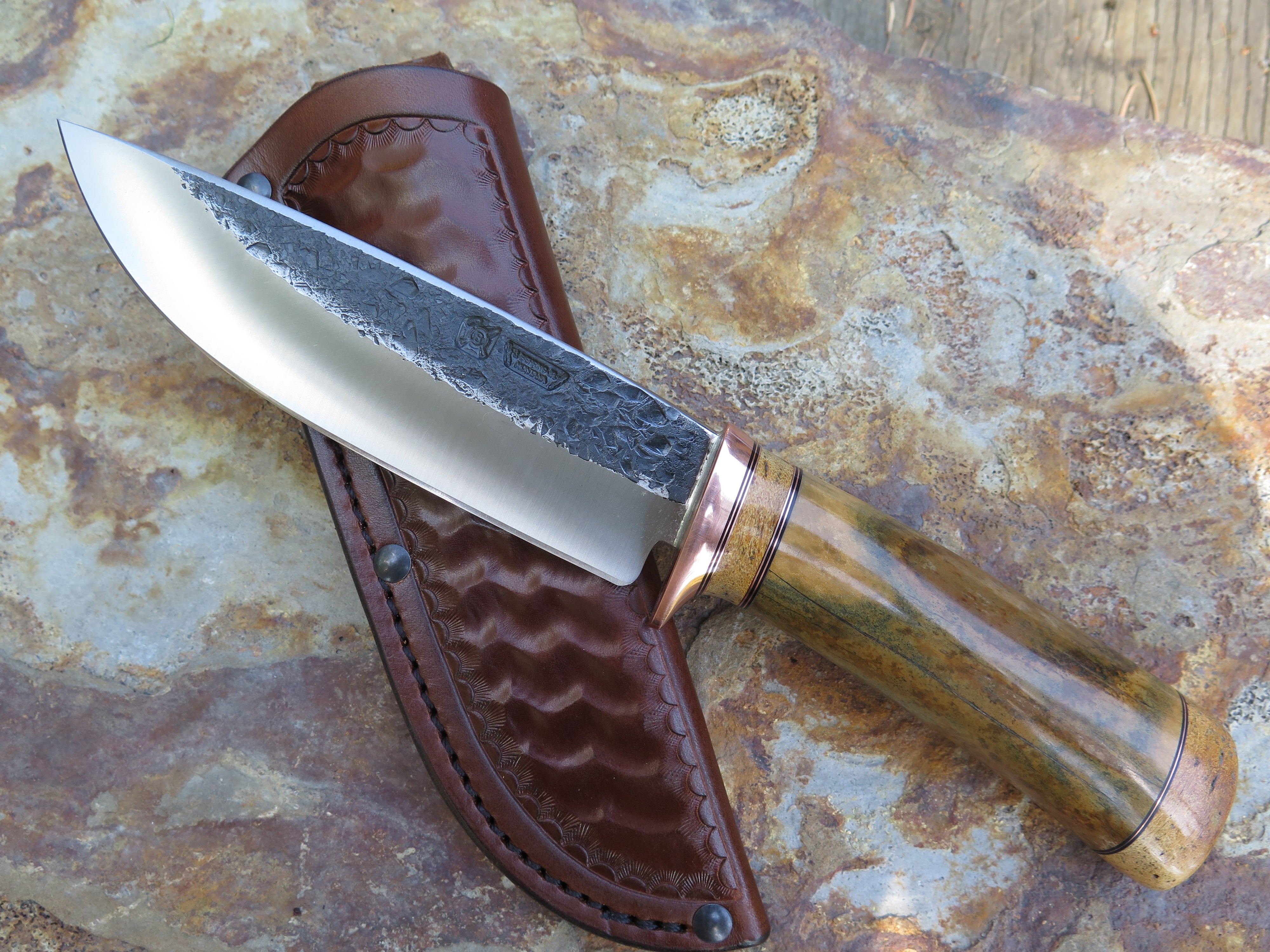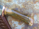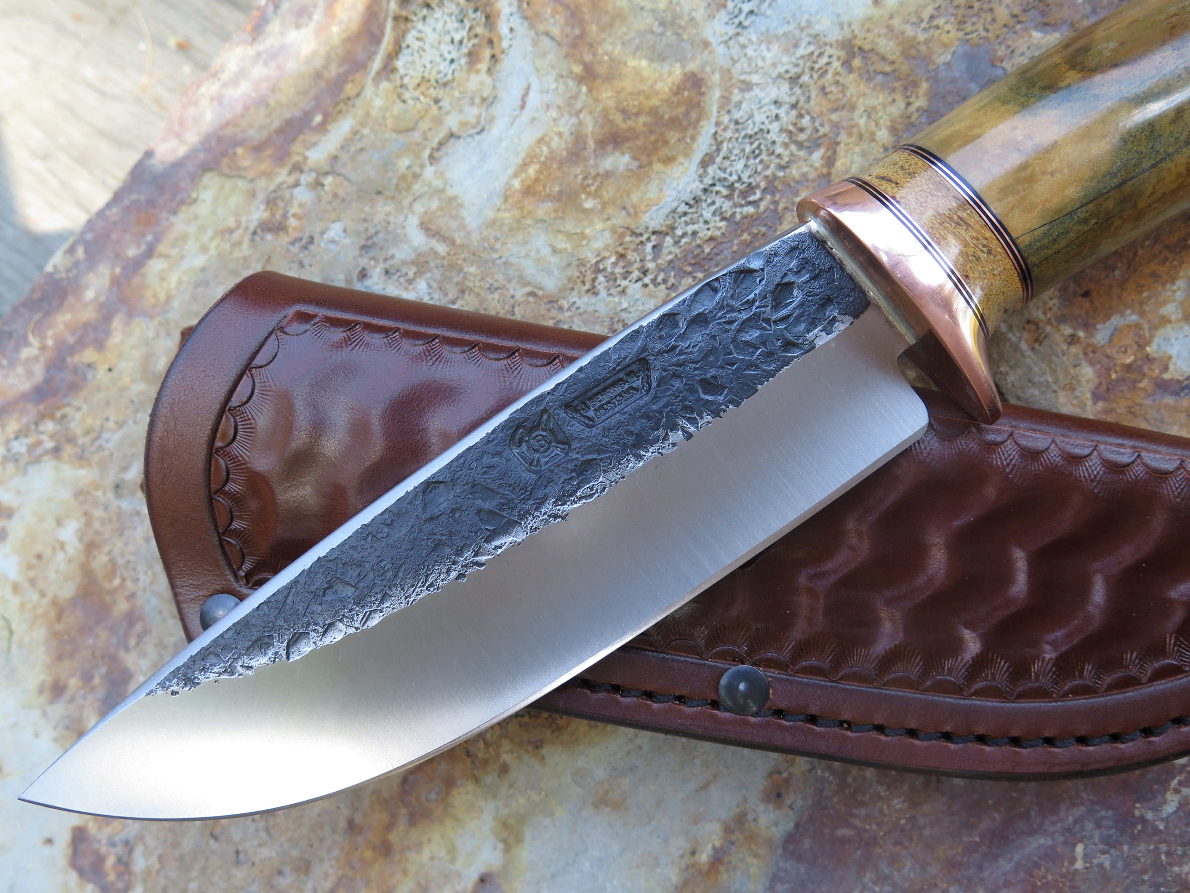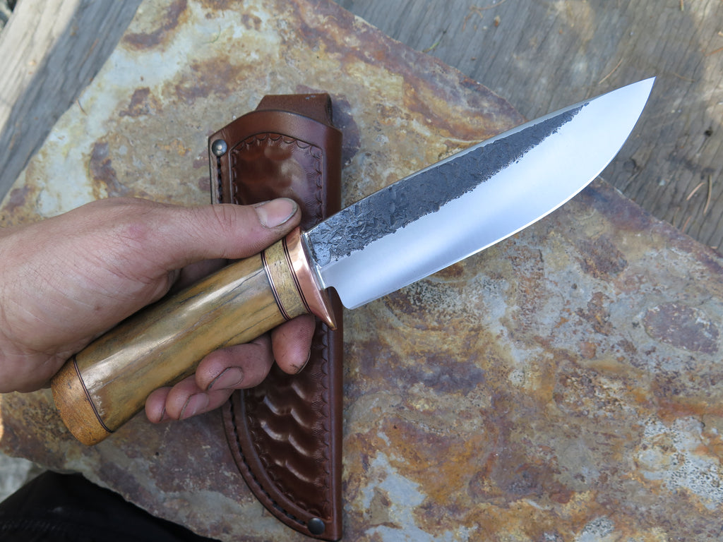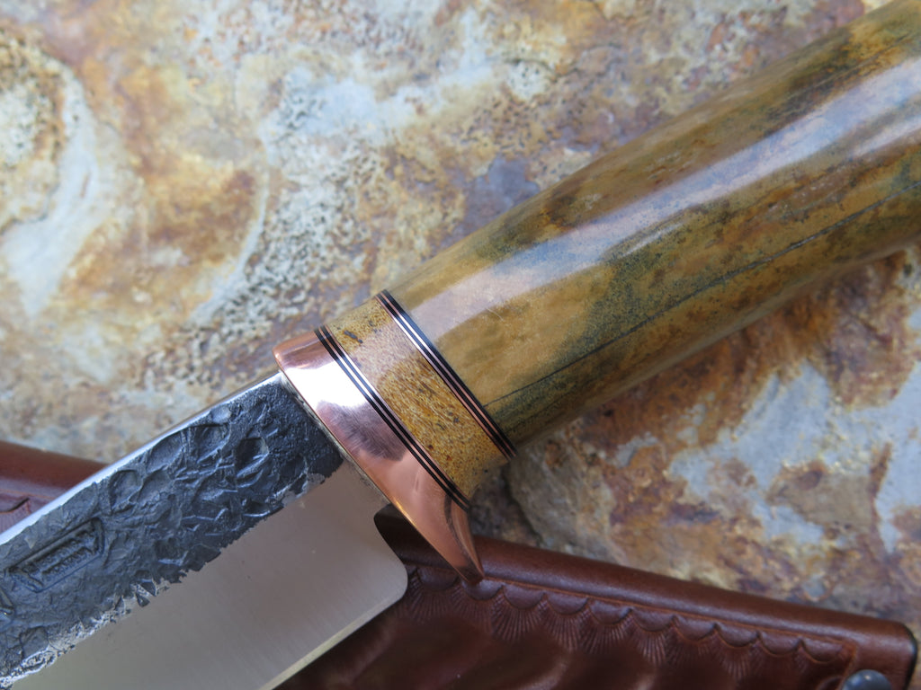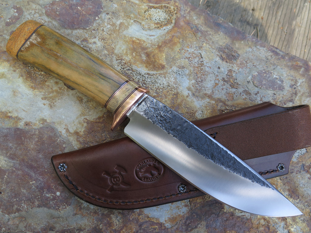This is a first of it's kind from Behring Made©! James came across this pleistocene era bison bone (metacarpal or metatarsal) and the turnout is outstanding. The blade is hand forged from 13/64" thick high carbon 01 tool steel and it measures 6" from tip to guard with a razor sharp hollow grind and our hammermark finish. The copper guard is soldered in place above black fiber, copper with a section of Stellar's sea cow rib bone in the spacer and on the butt. The overall length measures 10 5/8" and it comes in a custom tooled leather belt pouch sheath.