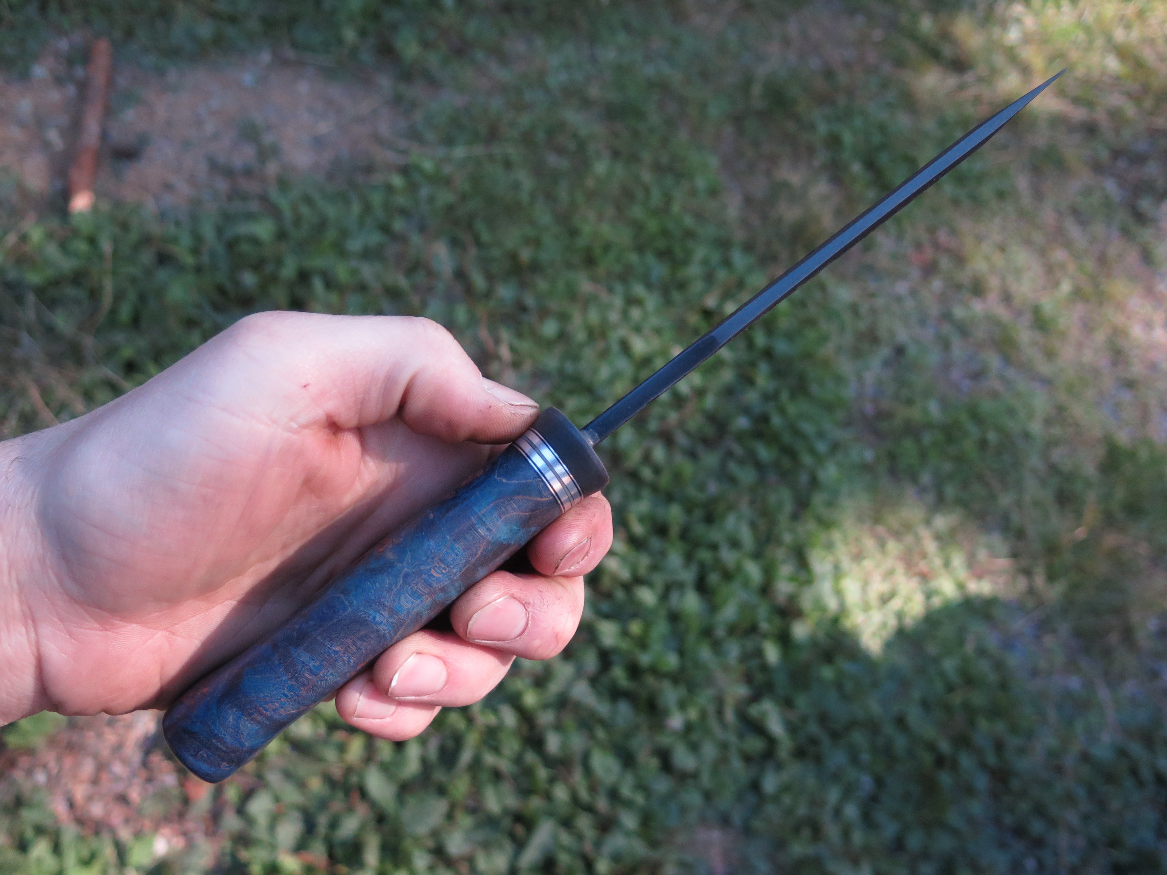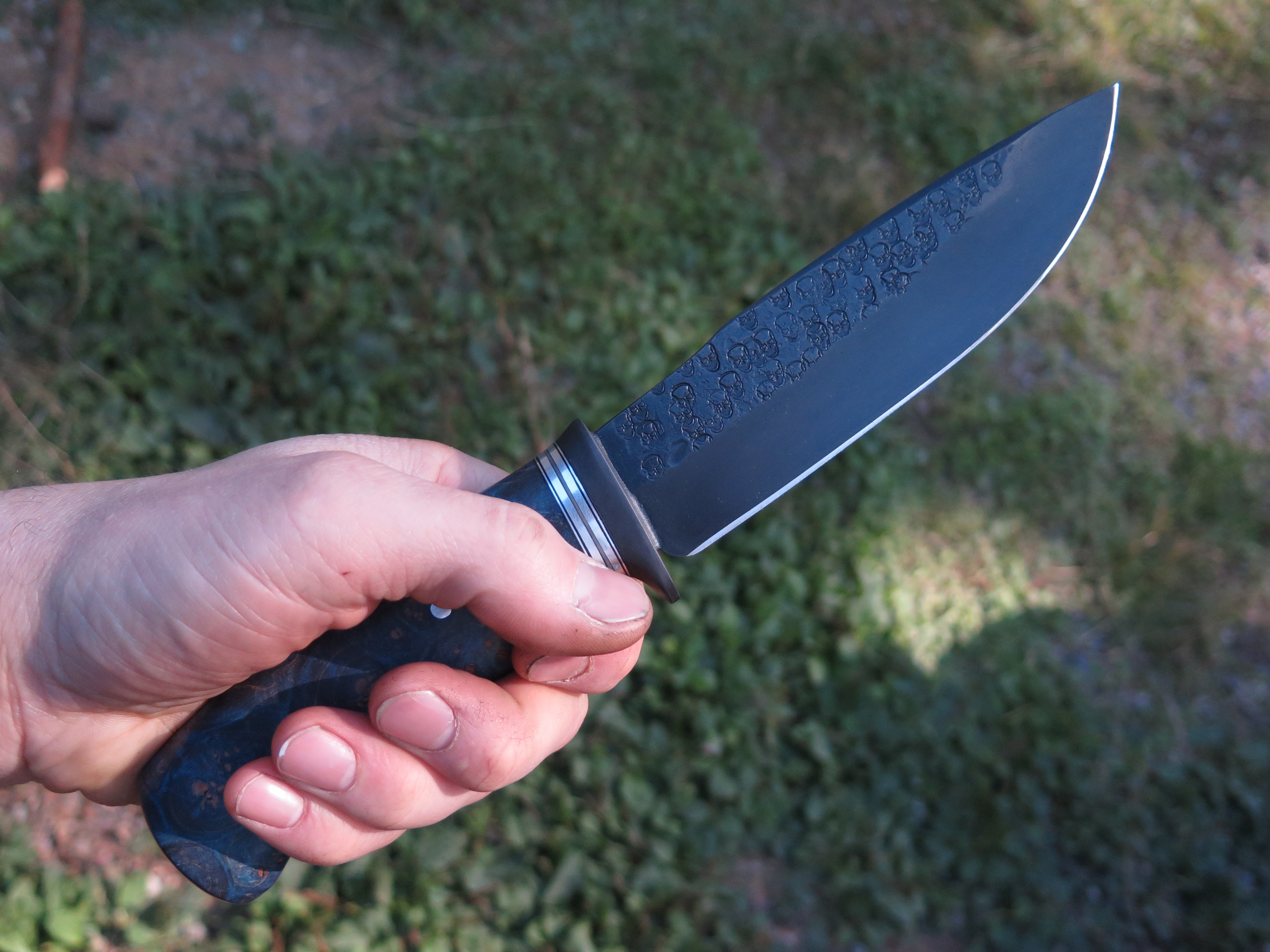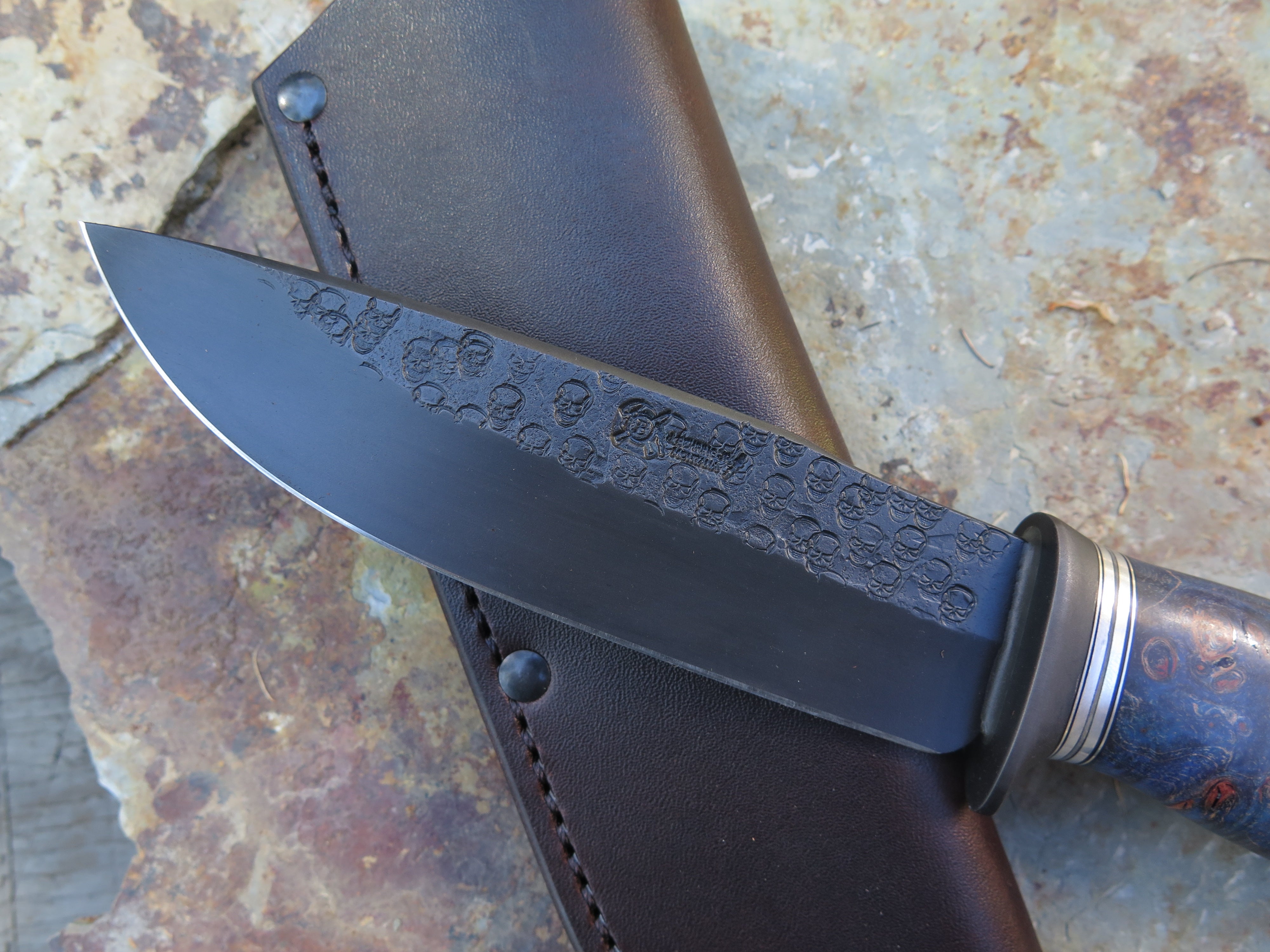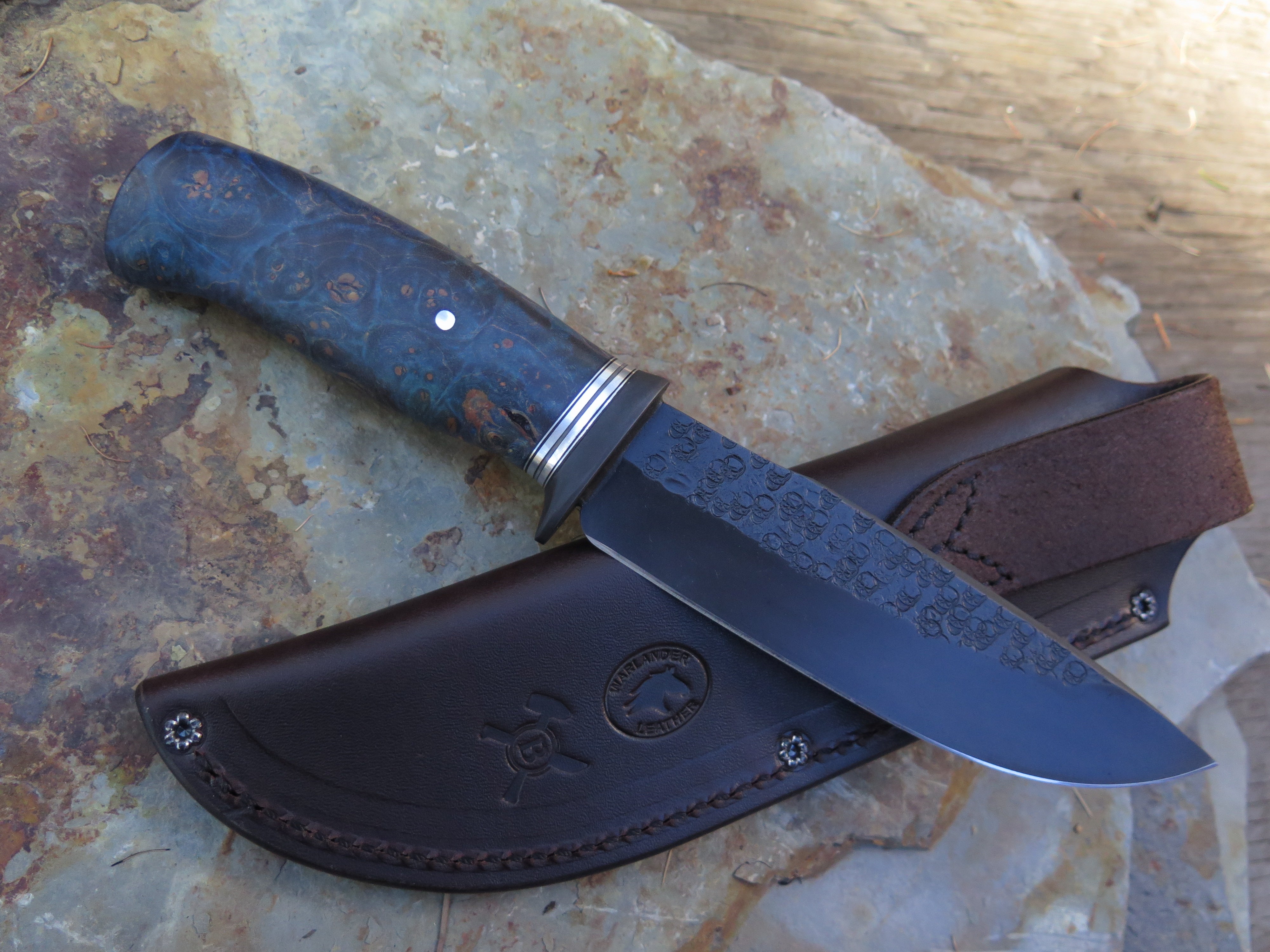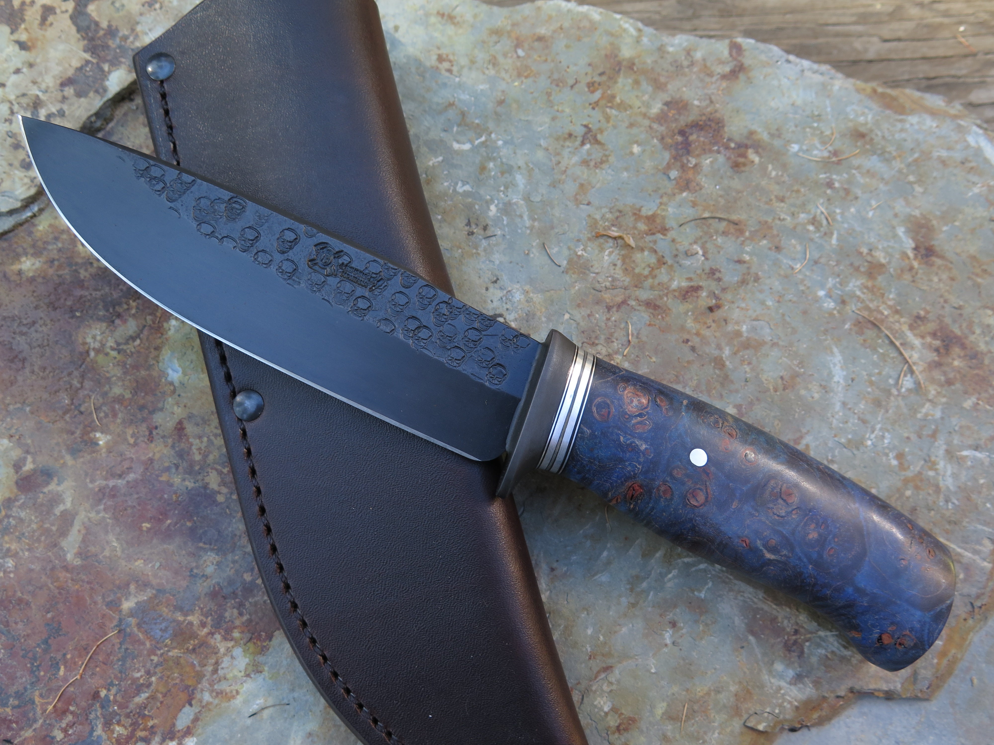 This unique addition to the Archives is a Modified Behring Made© Drop Point that's hand forged from 5 1/2” from tip to guard with a razor sharp hollow grind, a forced patina finish and our Ghost Skull hammermarks. The blued steel guard is soldered in place above black, gray and aluminum spacers with a premium stabilized maple burl handle that is pinned through the tang with aluminum. The overall length measures just over 10” and it comes in a classic leather belt pouch sheath. Please allow 4-8 weeks for production and delivery.