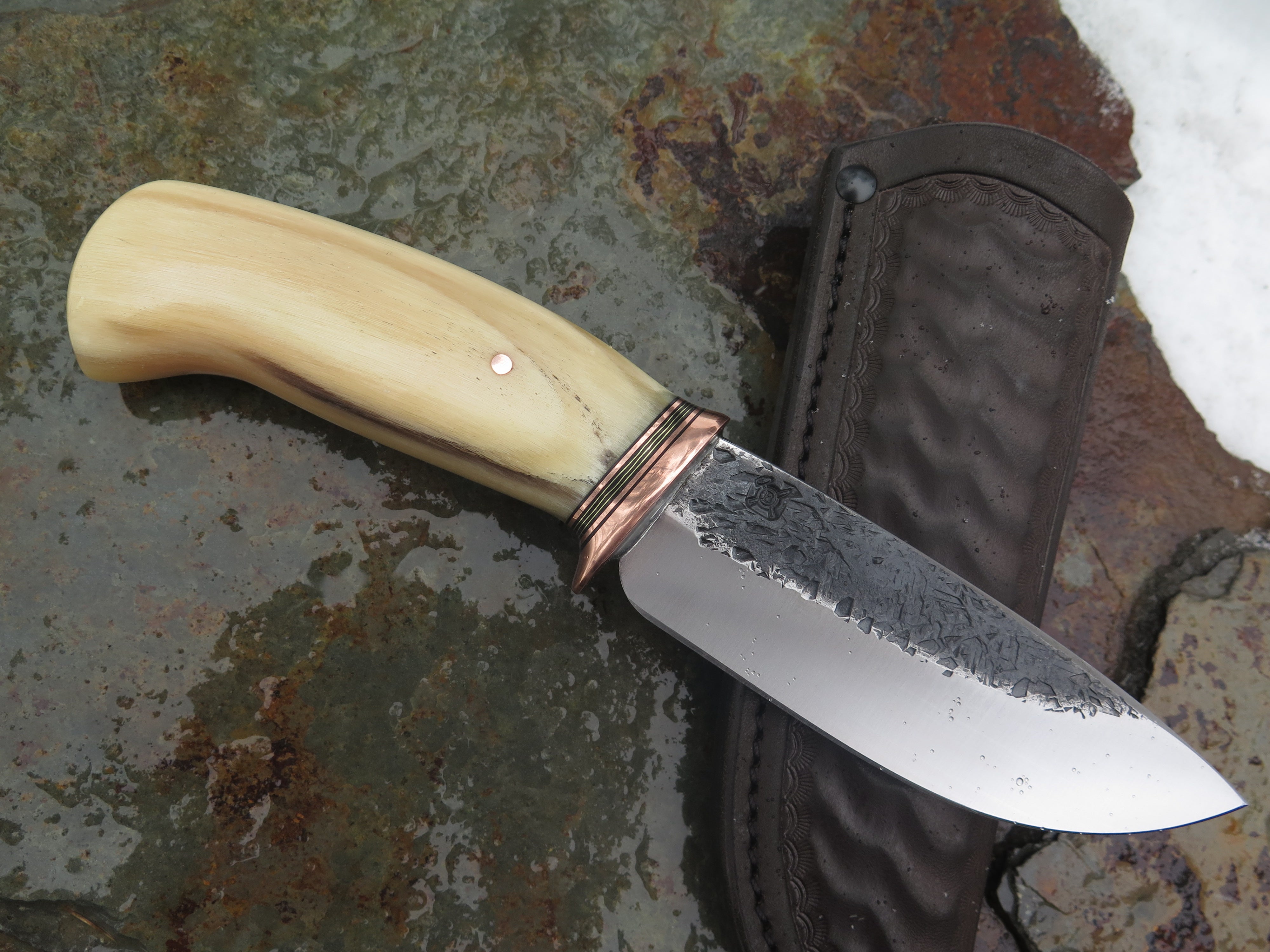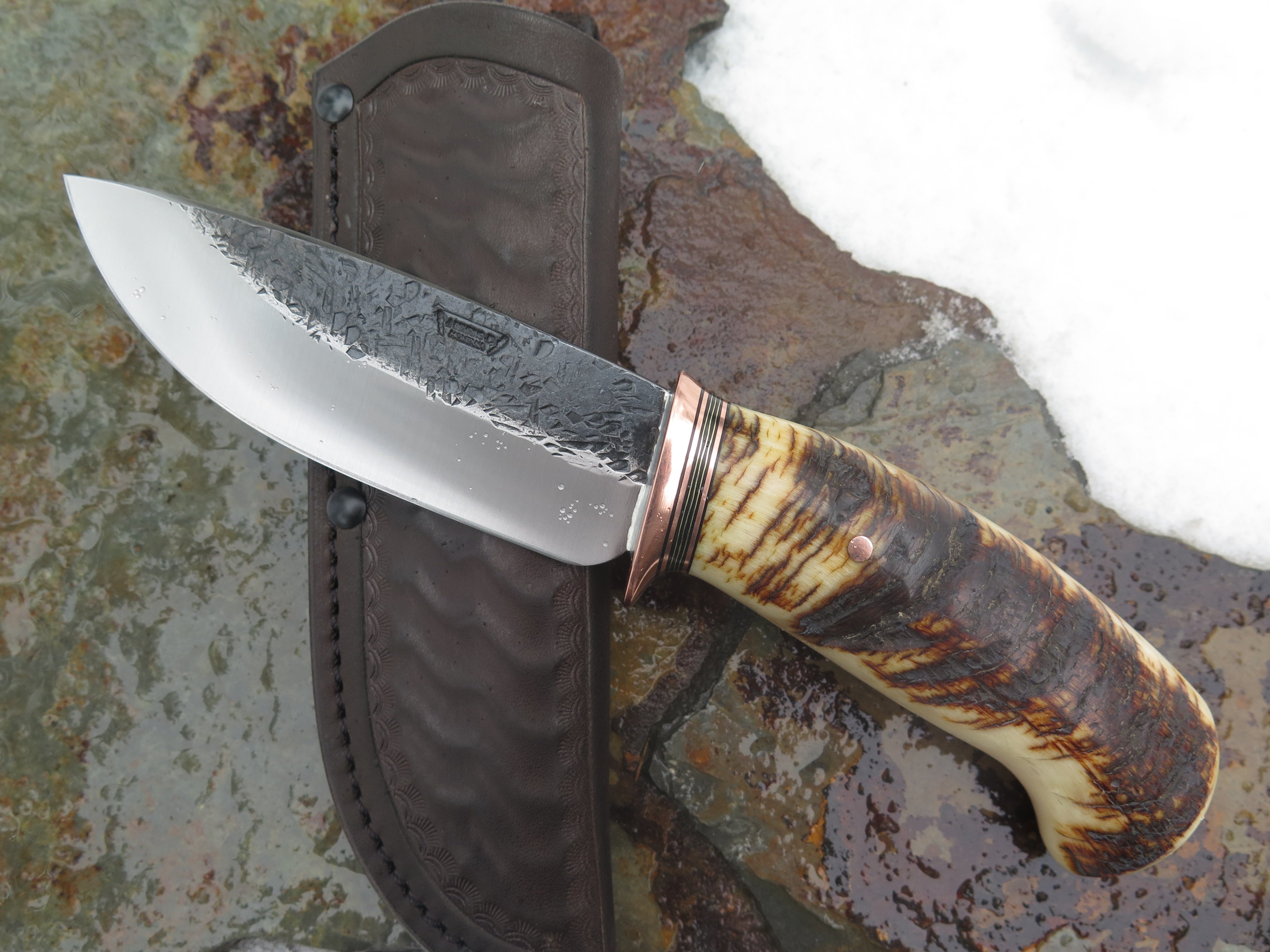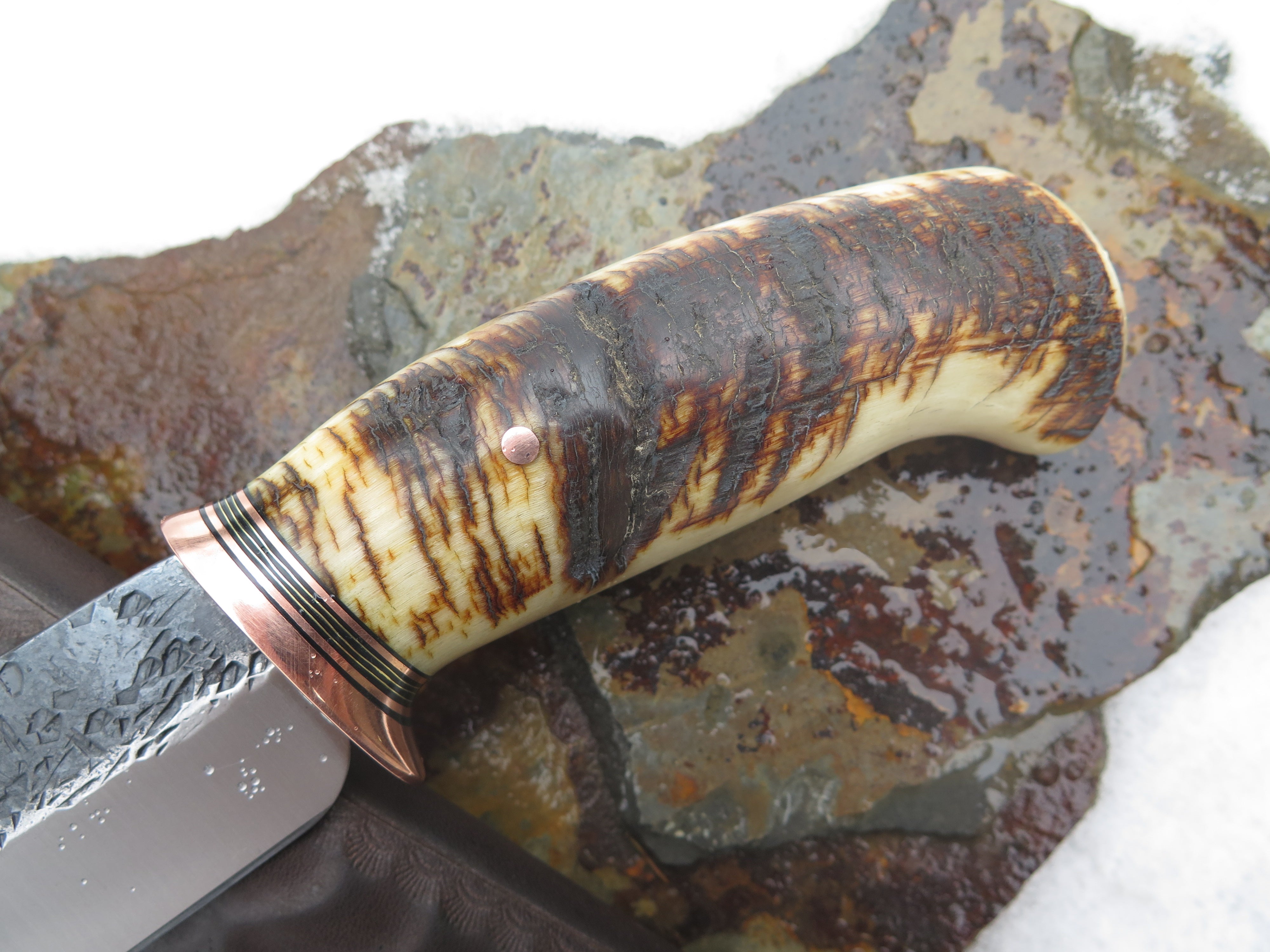 This remarkable Drop Point from Behring Made© is hand forged from 3/16" thick high carbon 01 tool steel and it measures 5" from tip to guard with a razor sharp convex grind. The copper guard is soldered in place above black, brass and copper spacers in addition to the top shelf Dall's sheep horn handle with a wonderful texture and color range. The overall length measures 9 1/2" and it comes in a full cover classic belt pouch sheath.