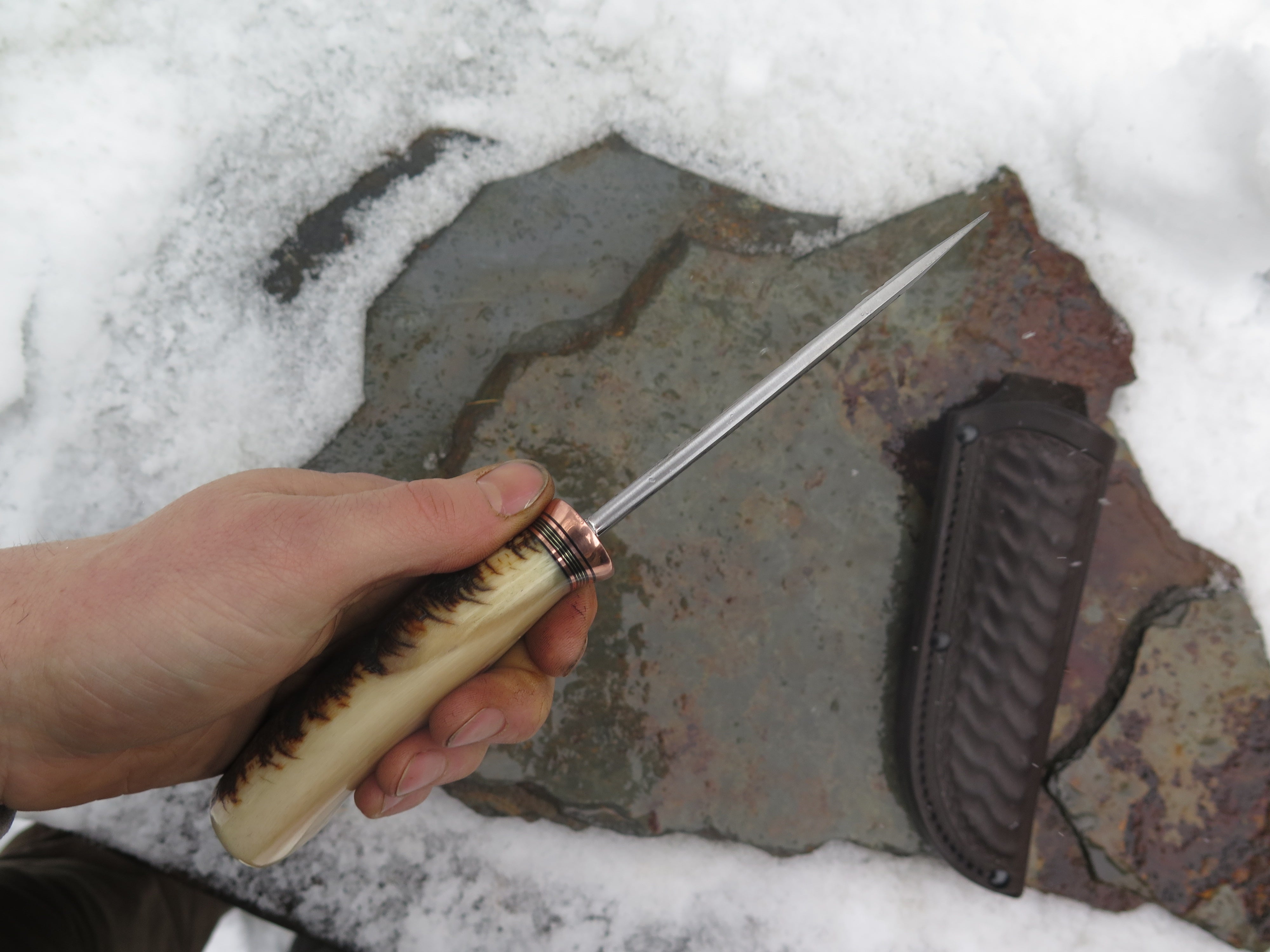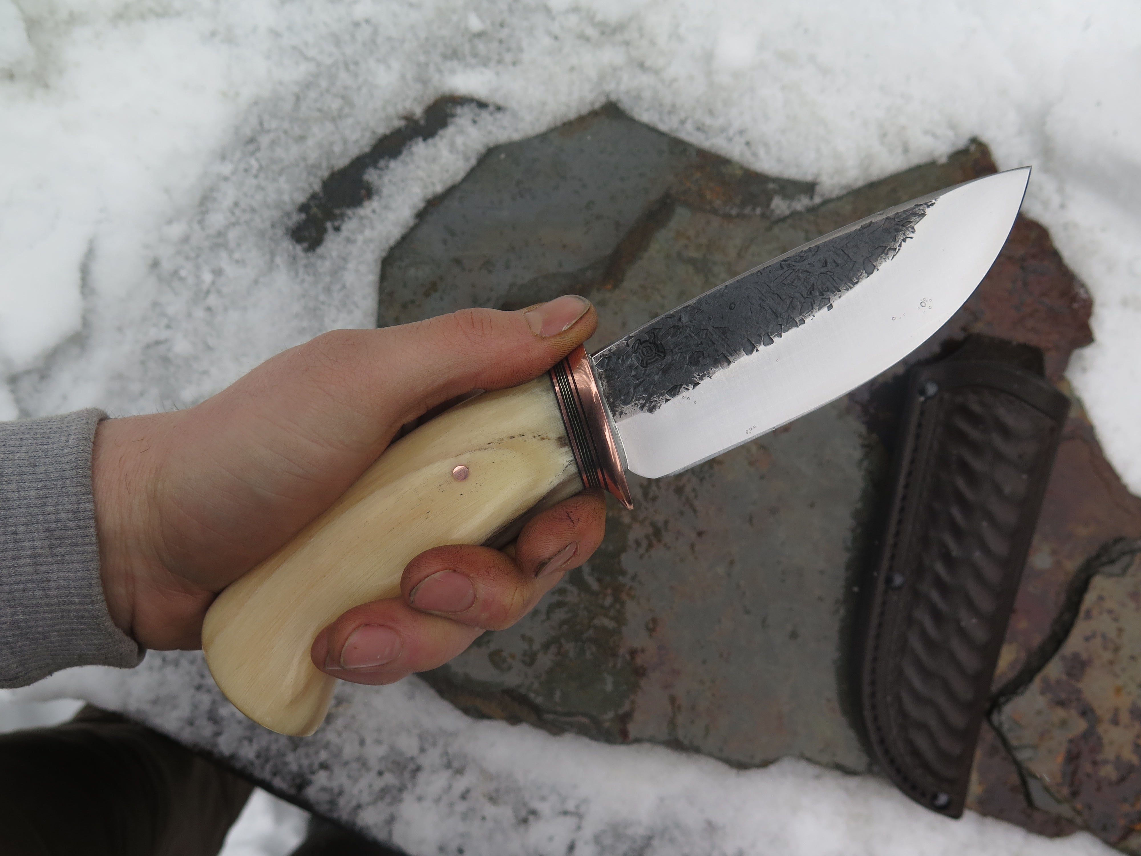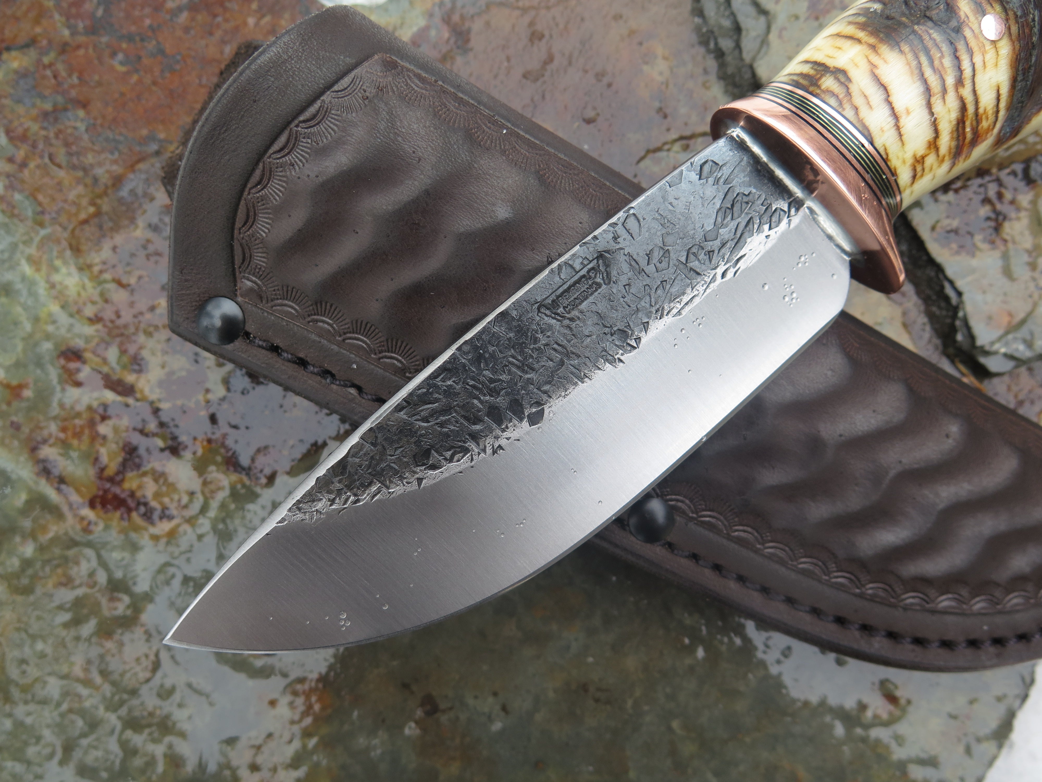 This remarkable Drop Point from Behring Made© is hand forged from 3/16" thick high carbon 01 tool steel and it measures 5" from tip to guard with a razor sharp convex grind. The copper guard is soldered in place above black, brass and copper spacers in addition to the top shelf Dall's sheep horn handle with a wonderful texture and color range. The overall length measures 9 1/2" and it comes in a full cover classic belt pouch sheath.