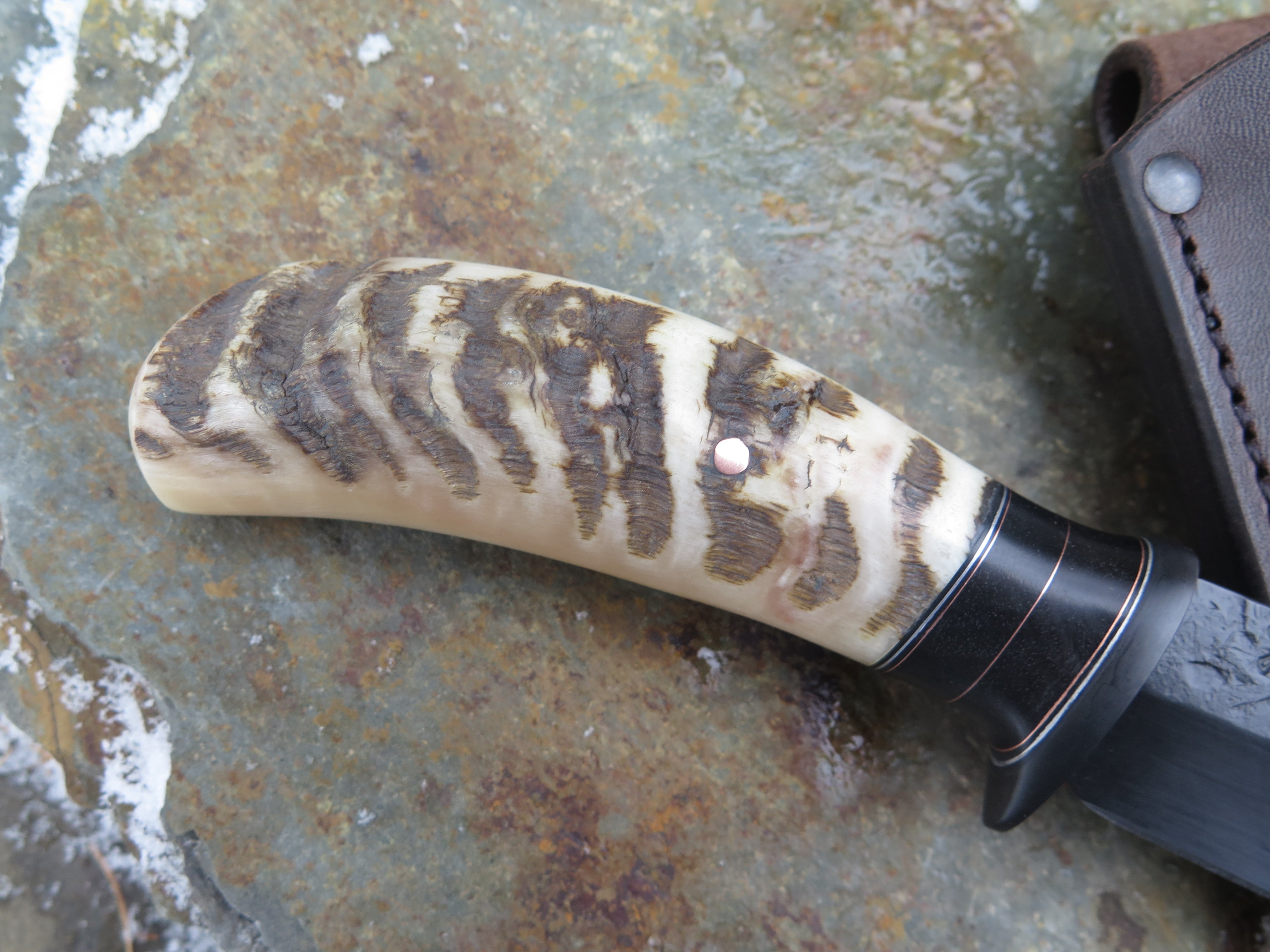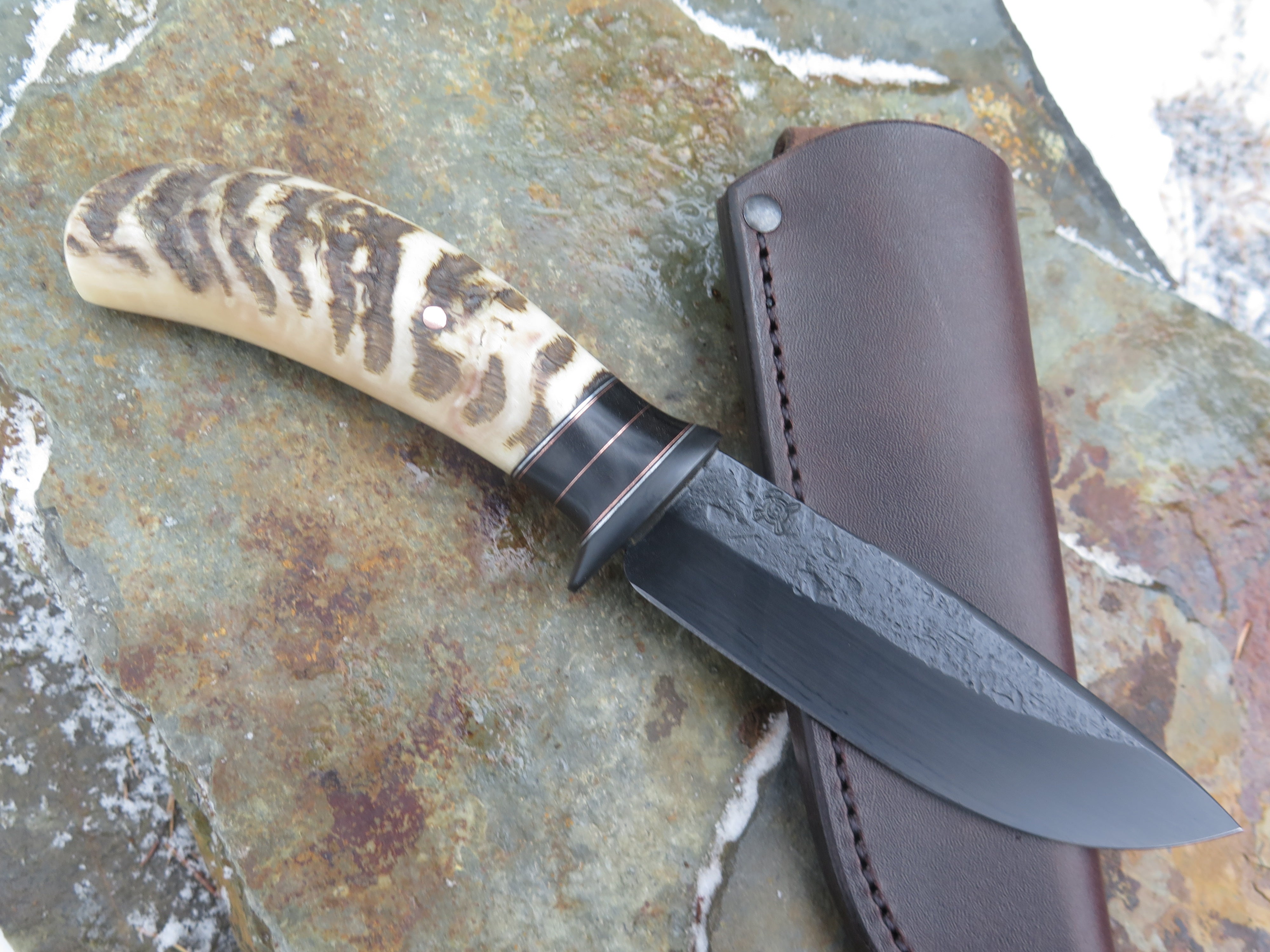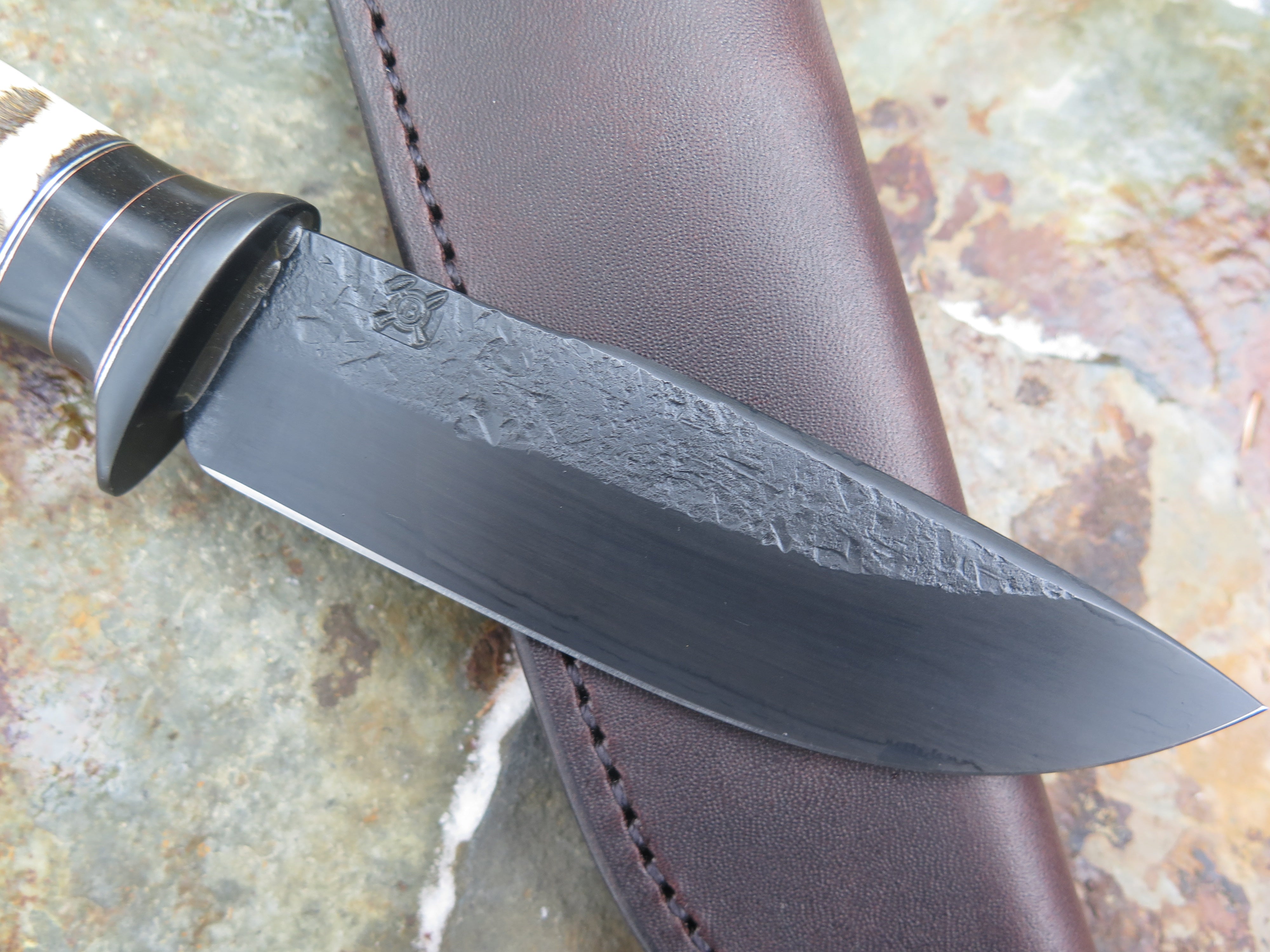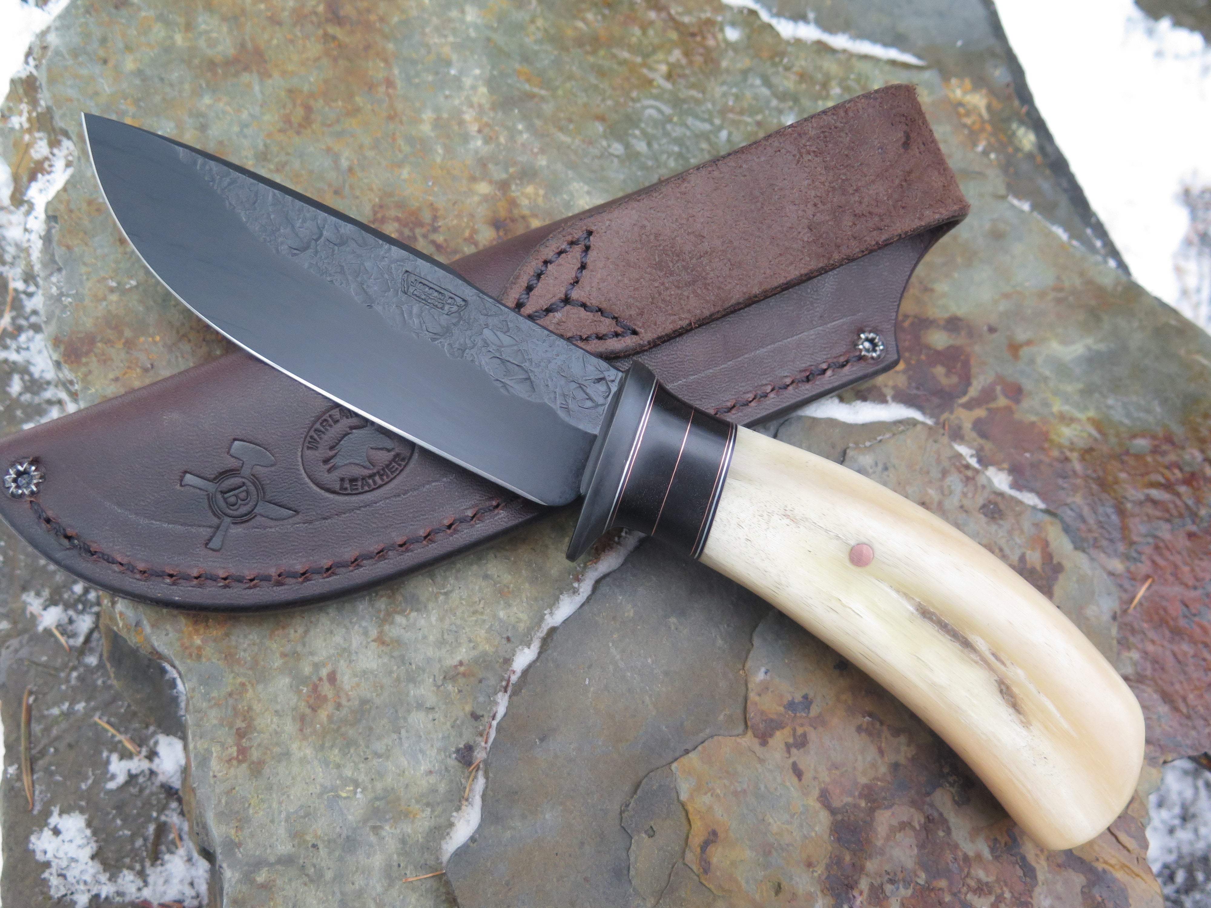 This incredible new Drop Point from Behring Made© is hand forged from 3/16" thick high carbon 01 tool steel and it measures 5" from tip to guard with a razor sharp hollow grind, hammermarks and a forced patina blued finish. The blued steel guard is soldered in place above black fiber, copper, aluminum and African ebony wood spacers as well as a premium Dall's sheep horn handle that is pinned with copper. The overall length measures 9 3/8" and it comes in a classic leather belt pouch sheath.
