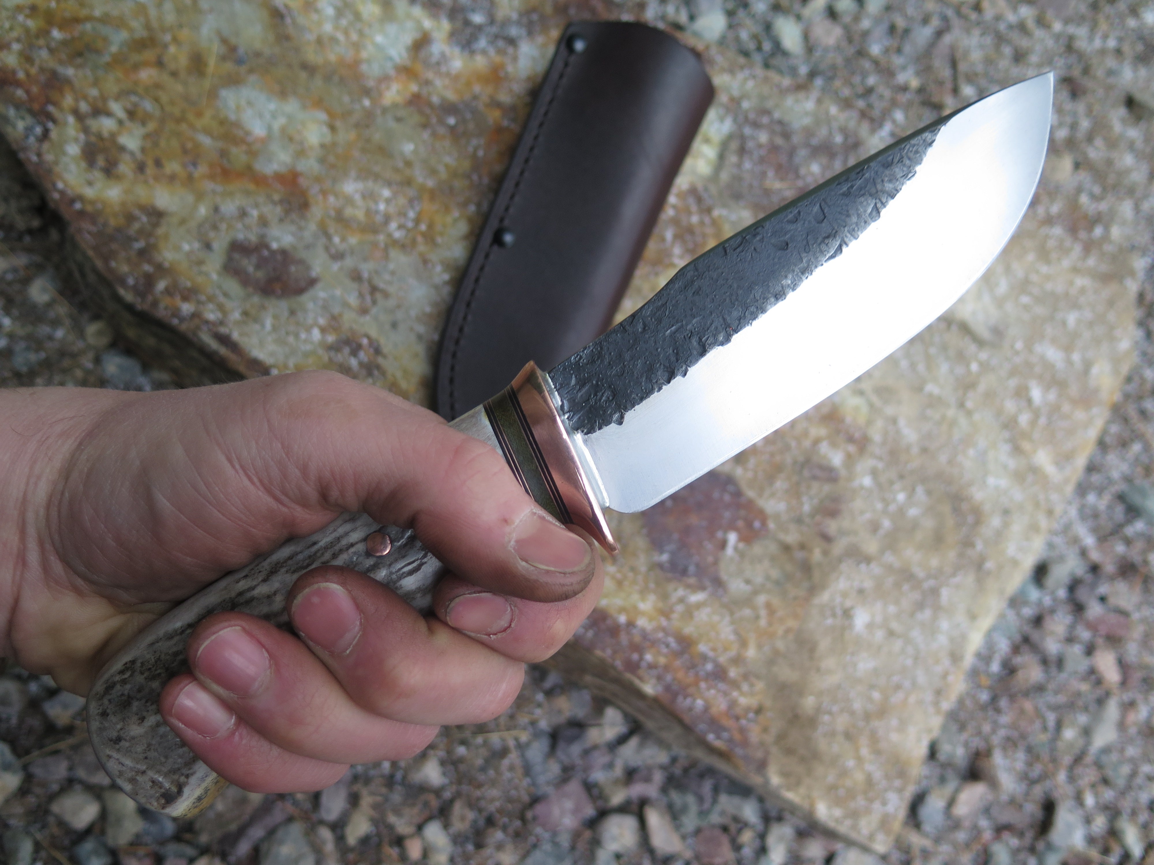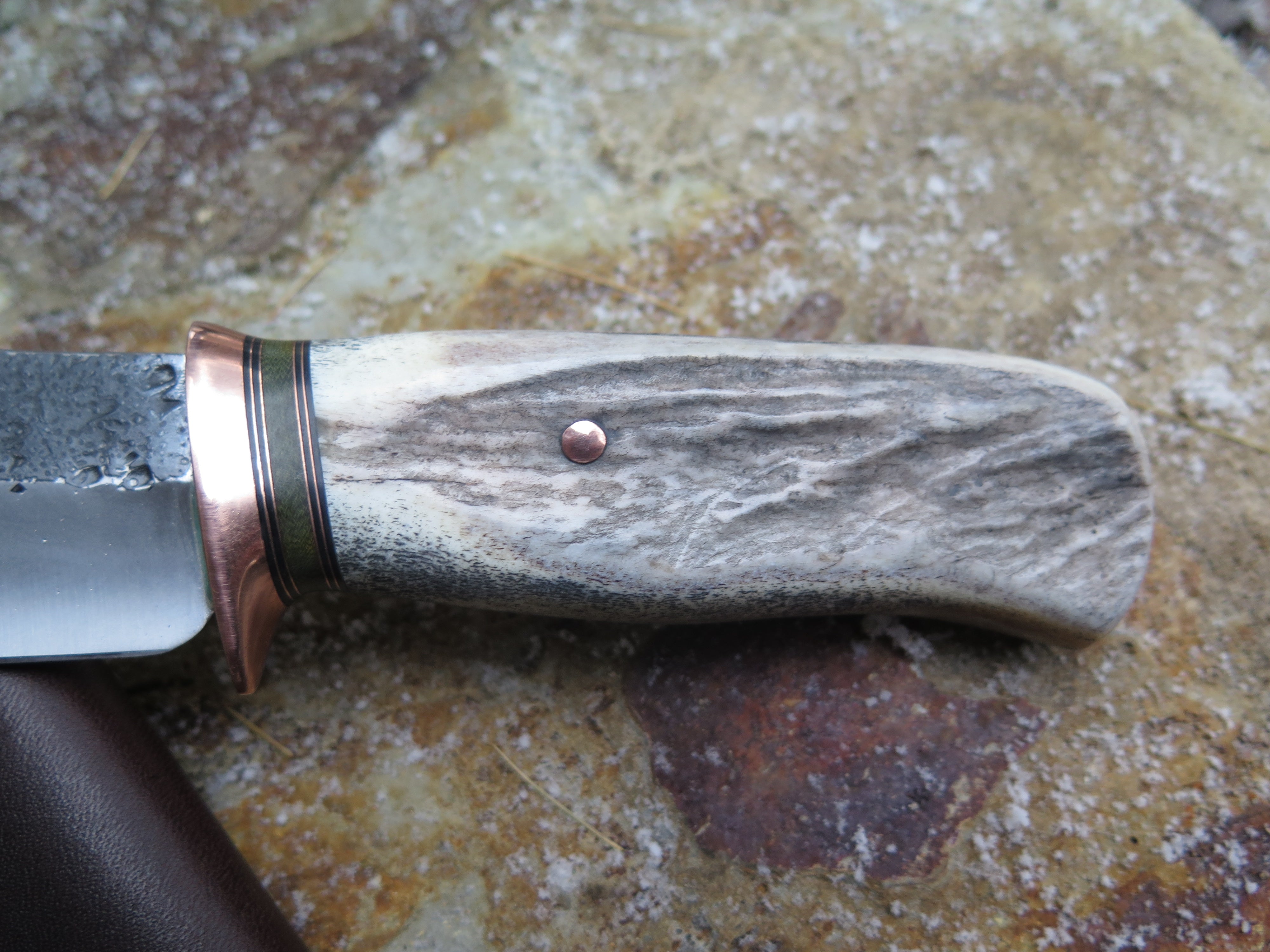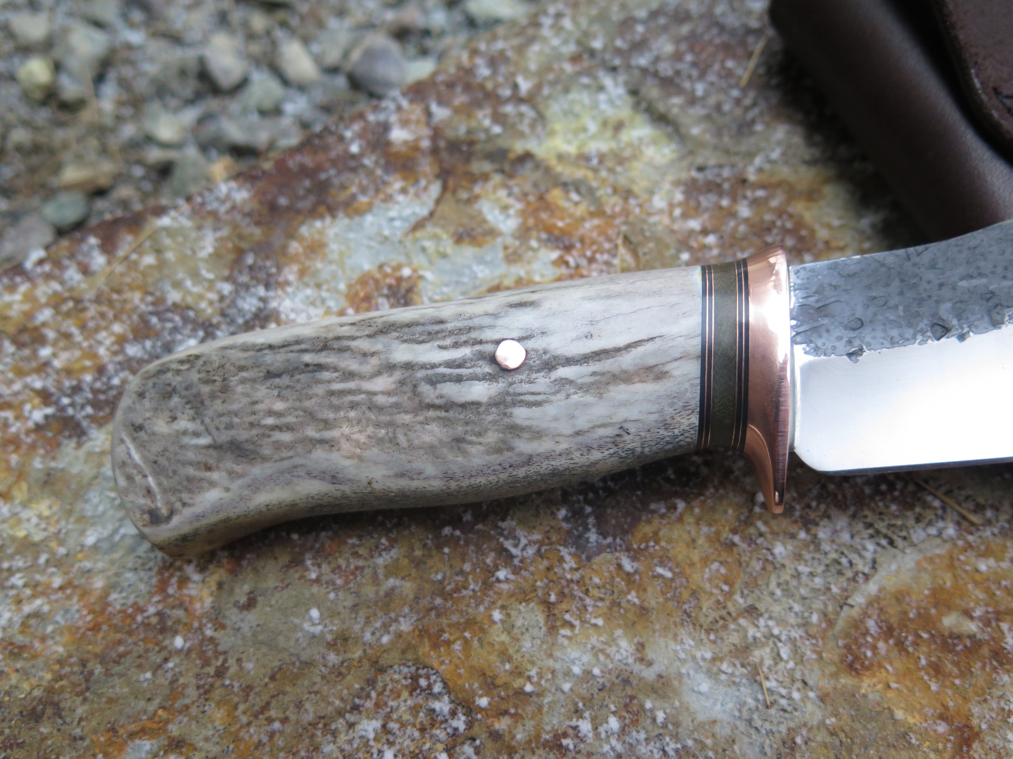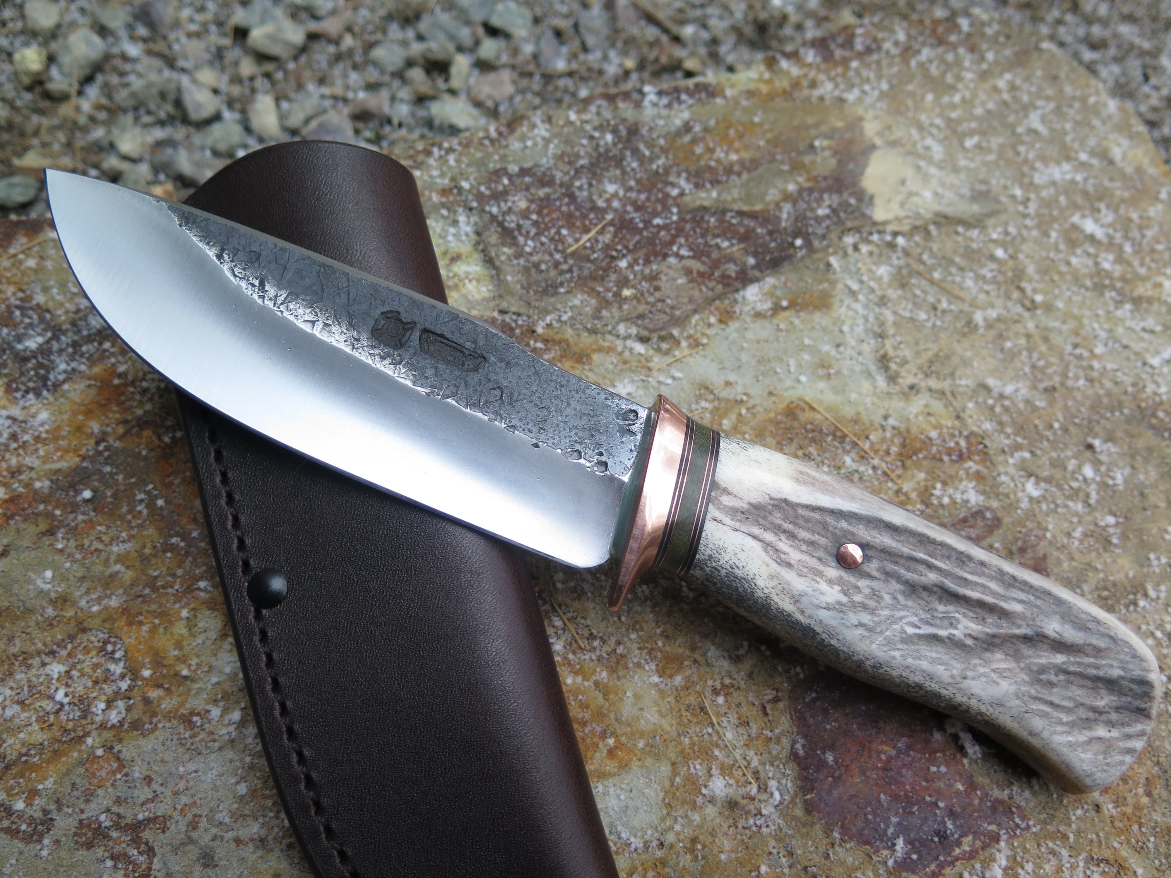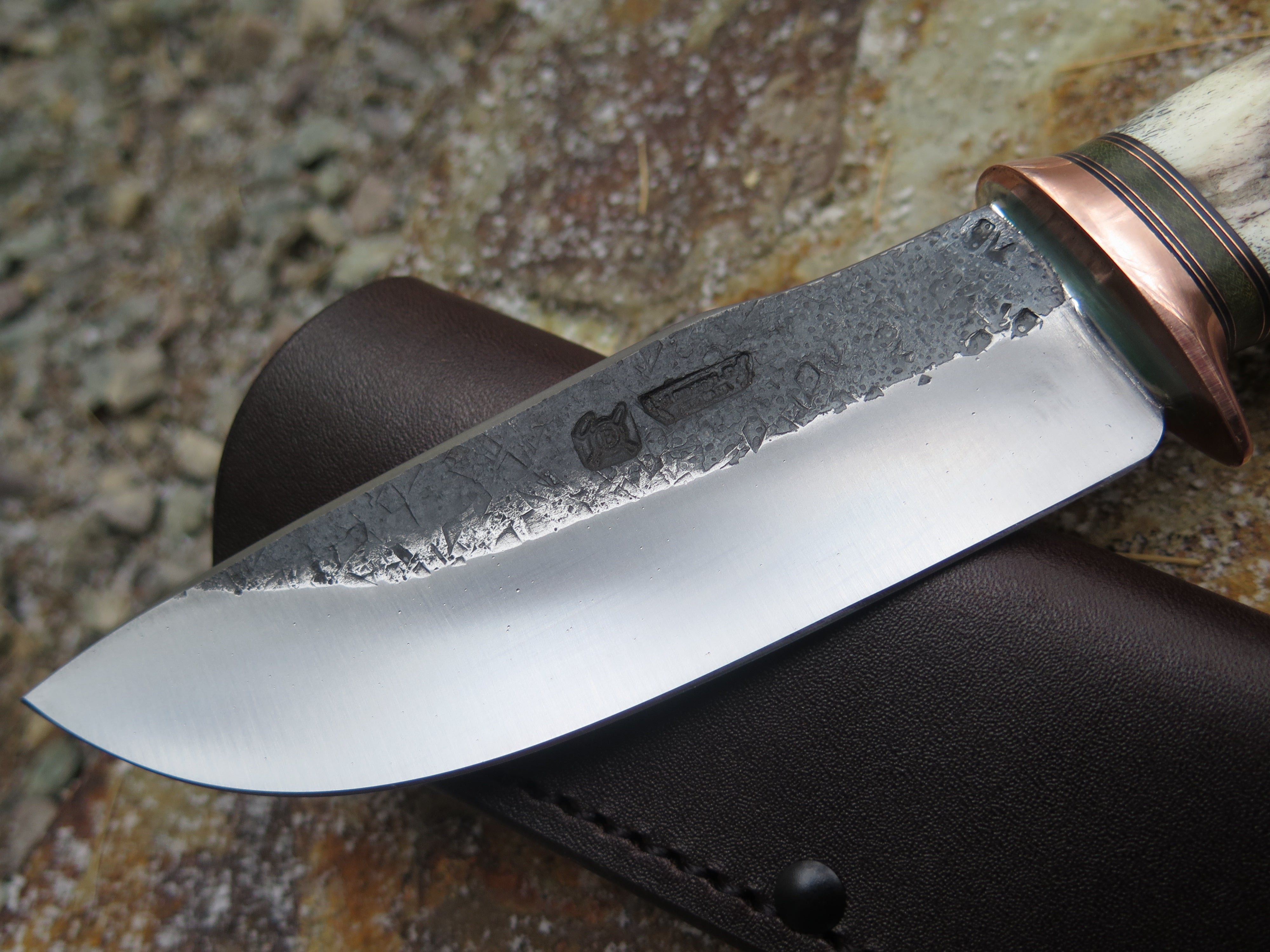 This bad ass modified drop point from Behring Made© is hand forged from 13/64" thick 5160 spring steel and it measures 5 1/2" from tip to guard with a razor sharp hollow grind and our hammermark finish. The copper guard is soldered in place above black fiber, green micarta and copper spacers as well as a shiras moose antler handle that we've pinned through the tang with copper. The overall length measures 10" and it comes in a classic belt pouch sheath.