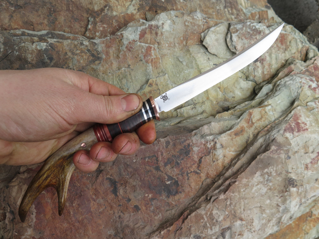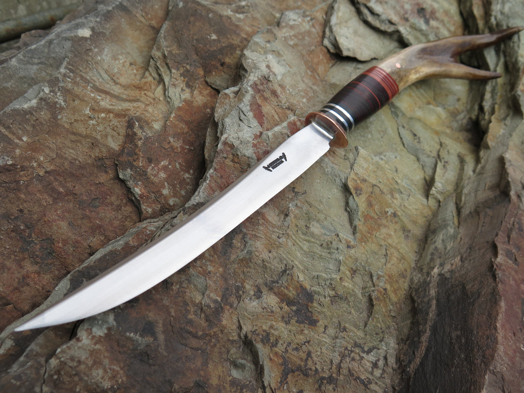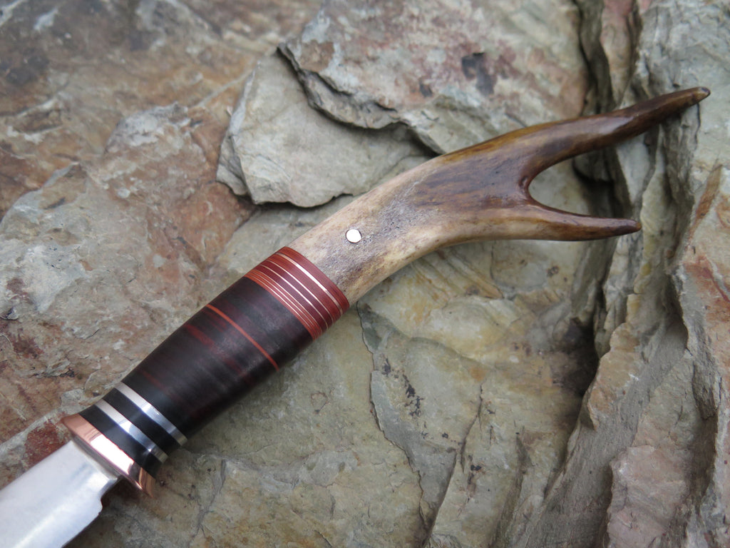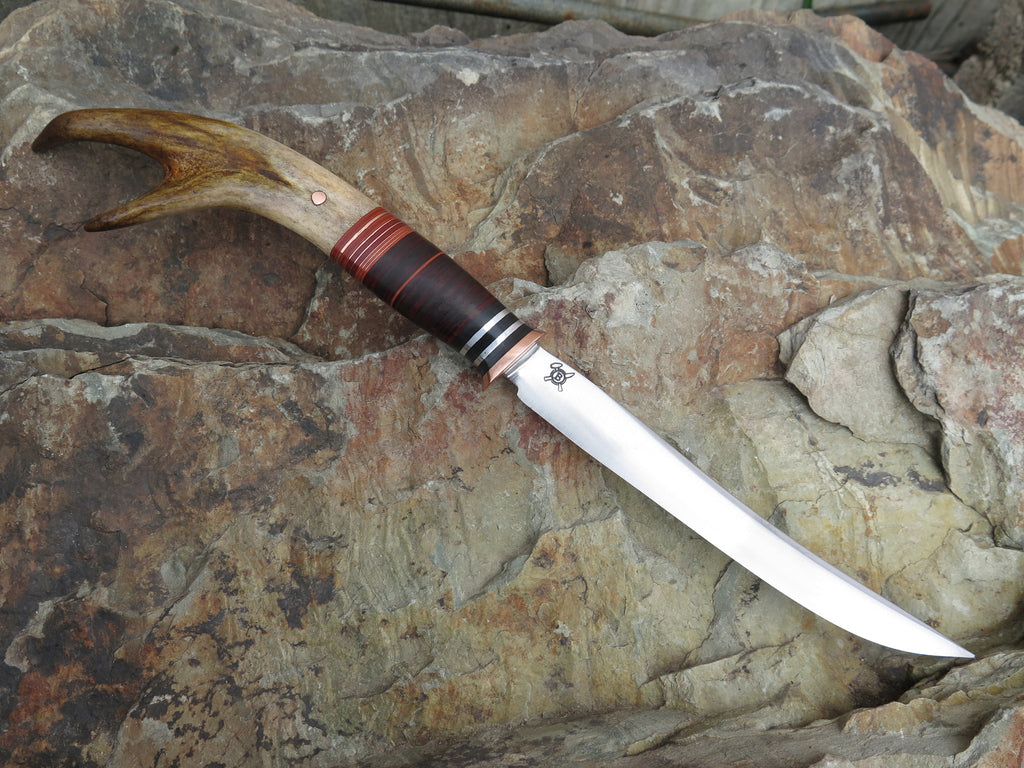 This beautiful Behring Made Fillet features a hand forged high carbon steel blade that measures 5 5/8" from tip to guard with a razor sharp convex grind. The copper guard is soldered in place above black, maroon, copper, aluminum and horsehide spacers as well as an awesome stag fishtail butt, reminiscent of the old Scagel knives. The overall length measures just under 12" and it comes in a classic leather belt pouch sheath.