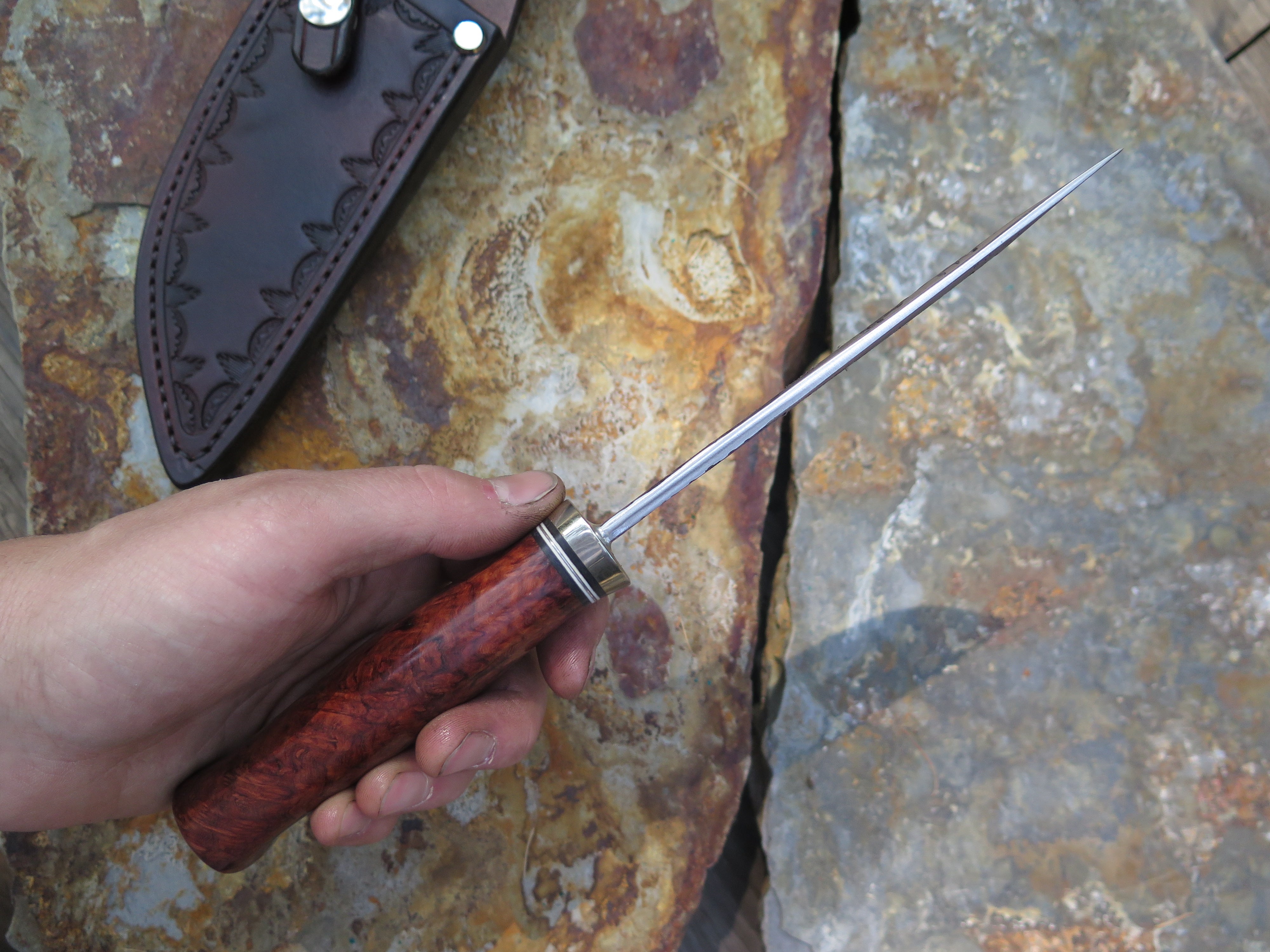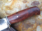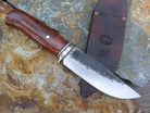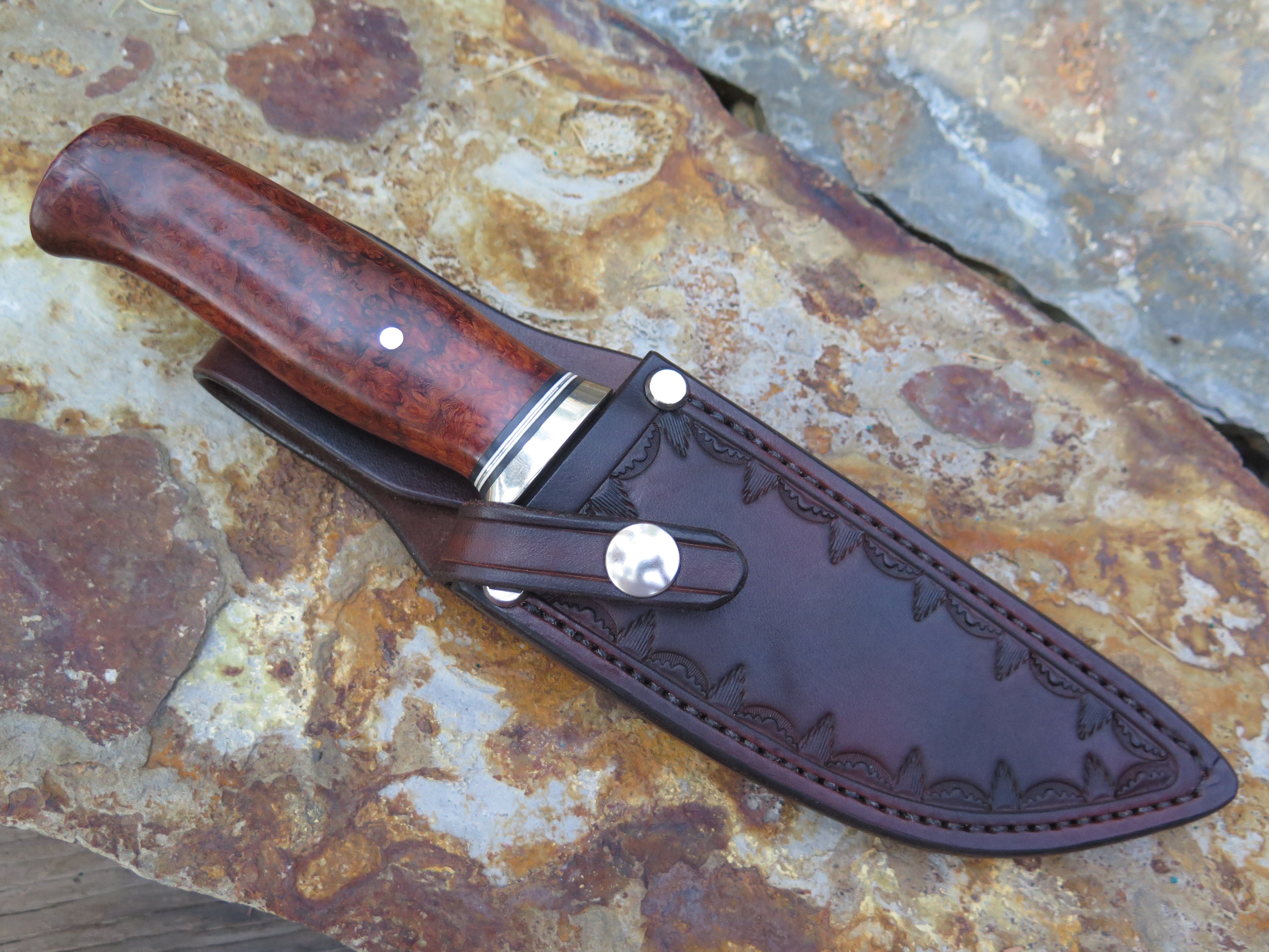 This beautiful Behring Made© Drop Point is hand forged from high carbon 5160 spring steel and measures 5 1/2" from tip to guard with a razor sharp hollow grind and a hammermark finish and a nice fat belly. The nickel silver guard is soldered in place above black, white and aluminum spacers as well as a premium amboyna burl crow's beak handle that's pinned through the tang with aluminum. The overall length measures just over 10" and it comes in a custom Warlander Leather sheath.