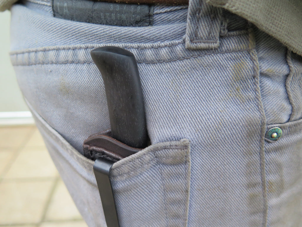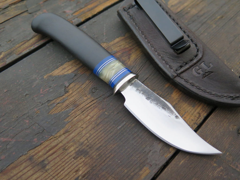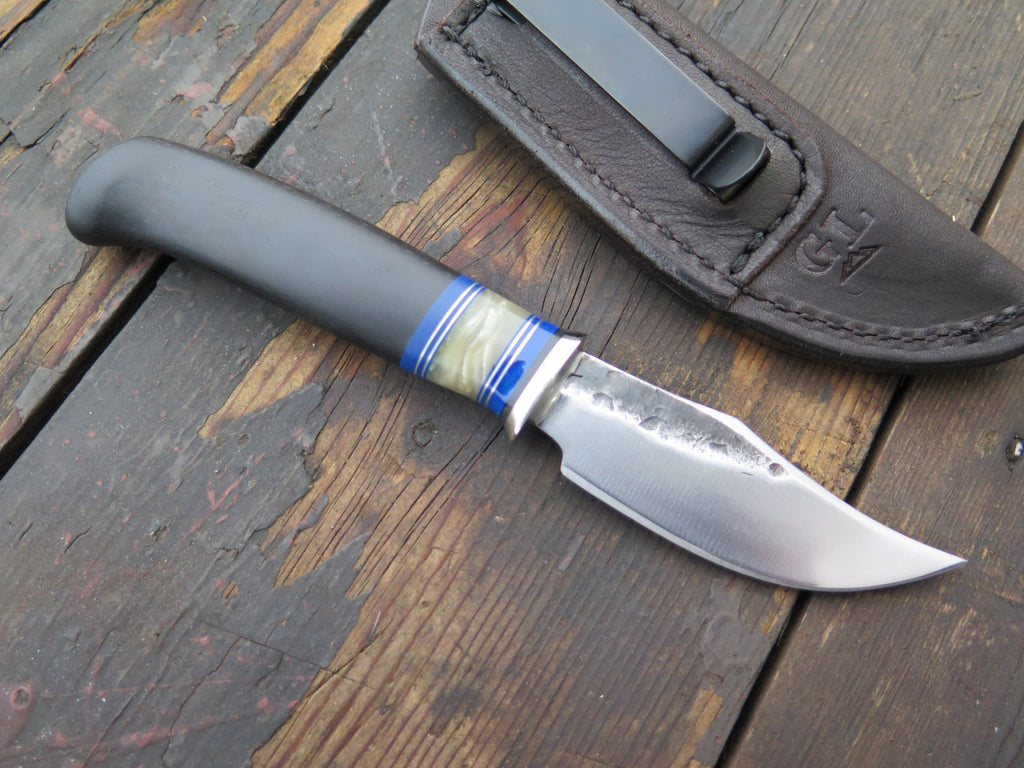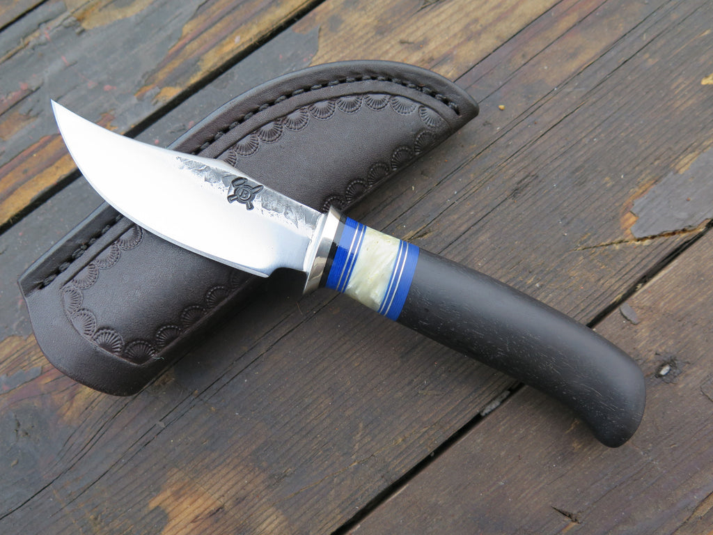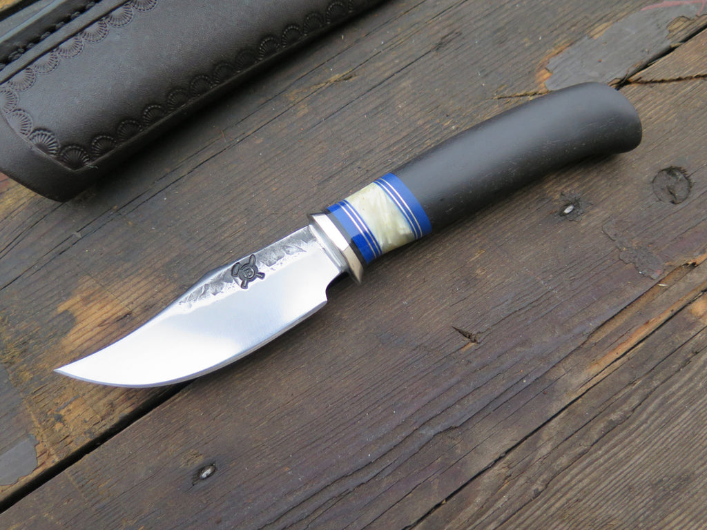 This beautiful Behring Made fits right inside the pocket with ease like any folding knife, with the integrity of a fixed blade. We've got four ready to ship, and each one will make a perfect gift this holiday and a user that will last a lifetime. The blades are hand forged from 1/8" thick high carbon 01 tool steel. They measure 2 3/4" from tip to guard with our razor sharp convex grind. The nickel silver guard is soldered in place above blue, musk ox boss and aluminum spacers. The ebony crow's beak handle brings the overall length to 6 1/2" and it comes in a Glacier Leather pocket sheath. These can be personalized so please inquire upon ordering!