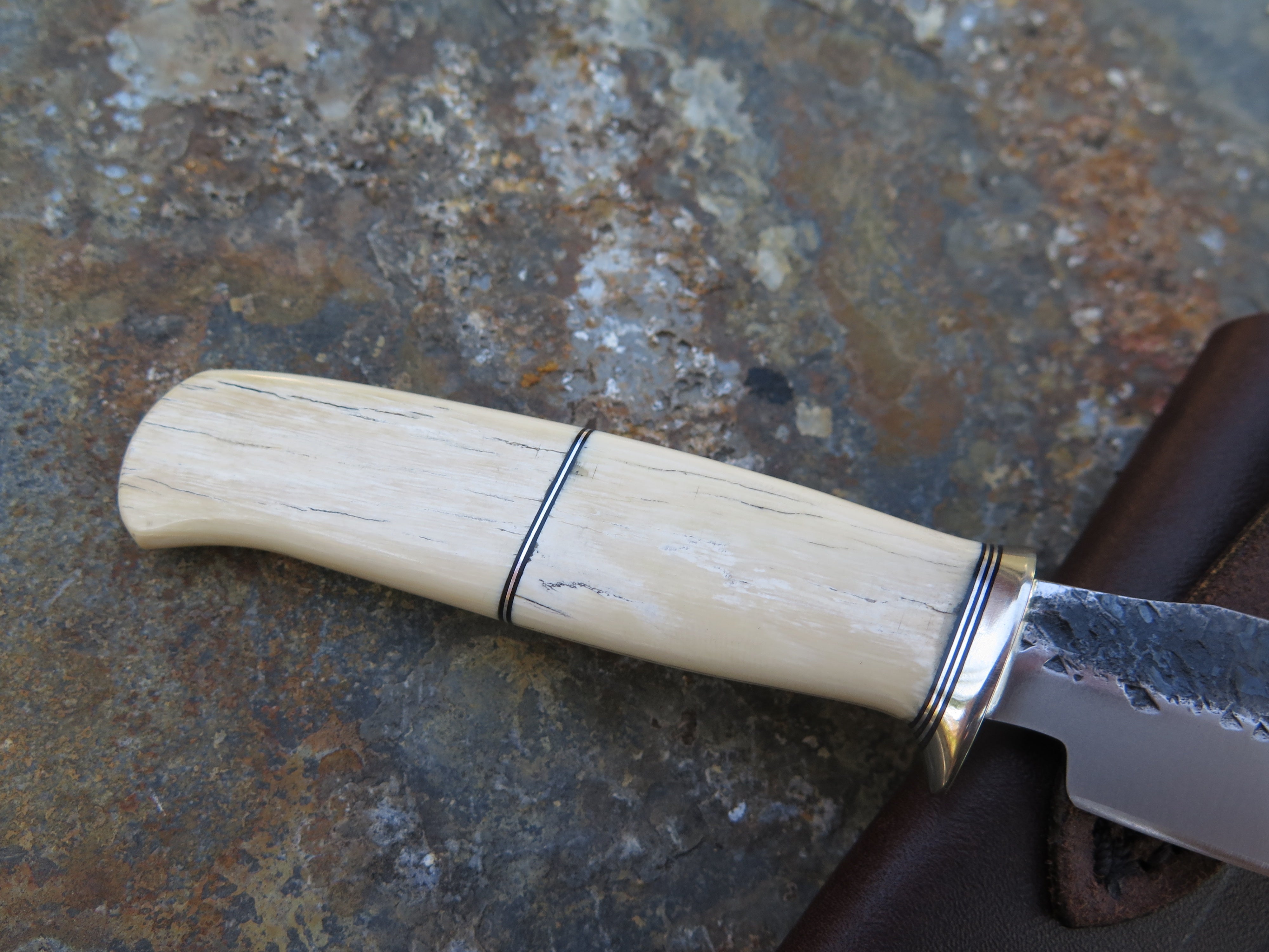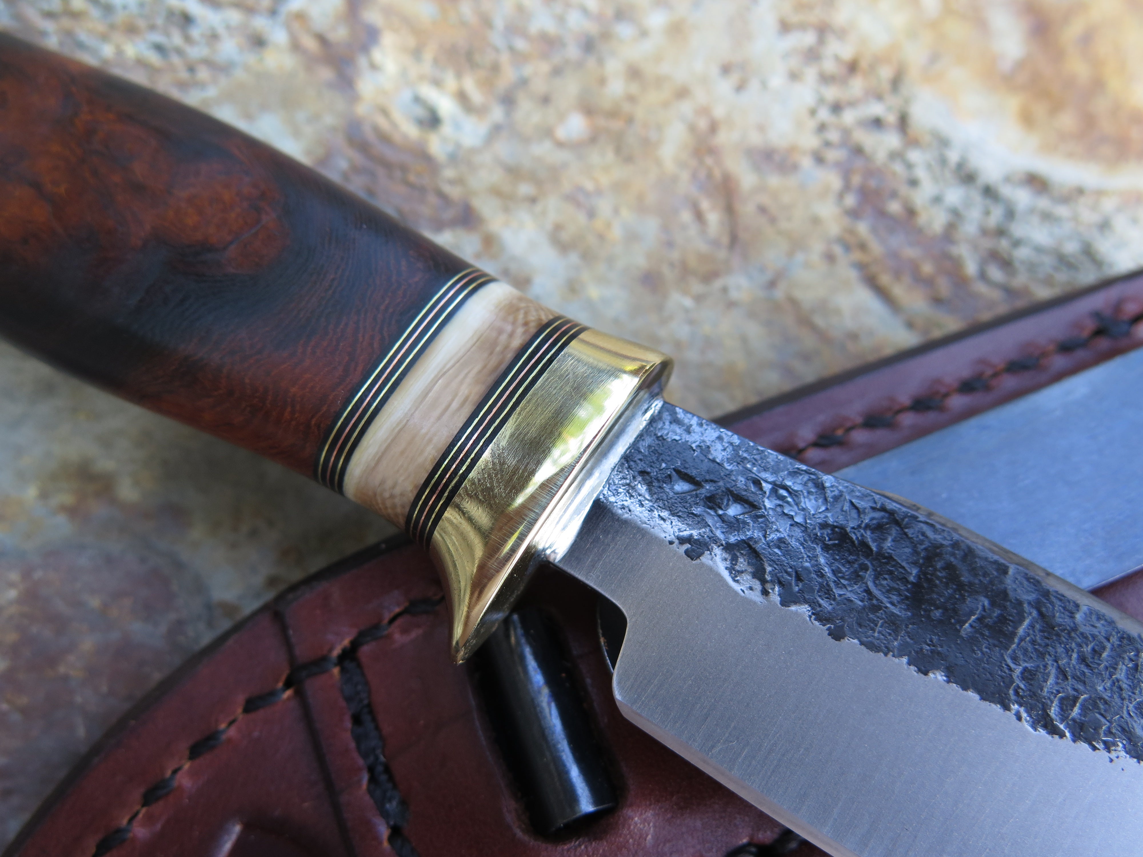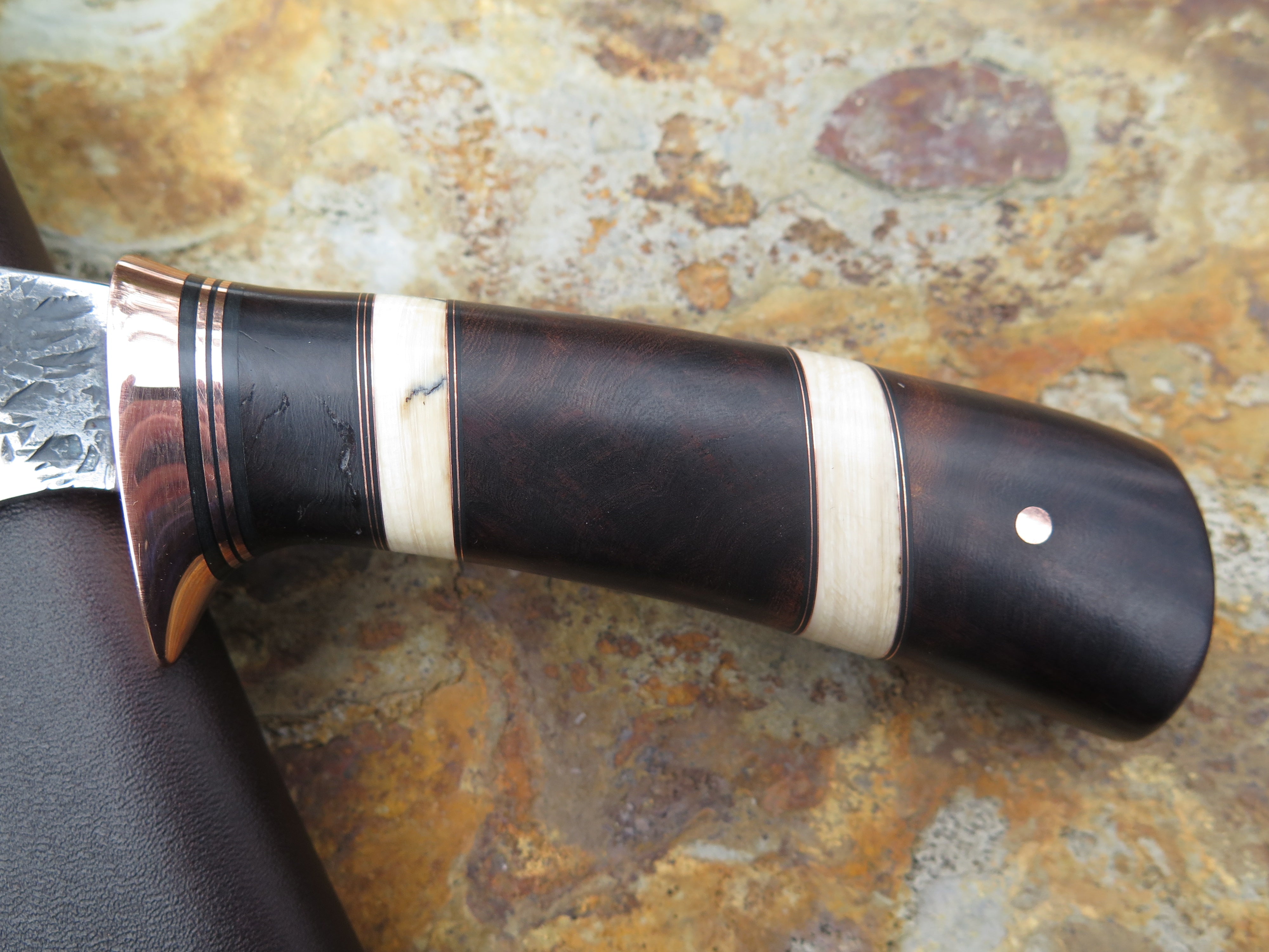 This incredible new Alaskan from Behring Made© is hand forged from 3/16" thick high carbon 01 tool steel and it measures 4 1/2" from tip to guard with a razor sharp hollow grind and our hammermark finish. The copper guard is soldered in place above black and copper spacers with an array of intense desert ironwood burl and contrasting accents of ancient mammoth ivory spacers to boot. The butt is pinned through the tang with copper and overall length rings in at 8 7/8". This one comes in a leather belt pouch sheath and we guarantee it for life.