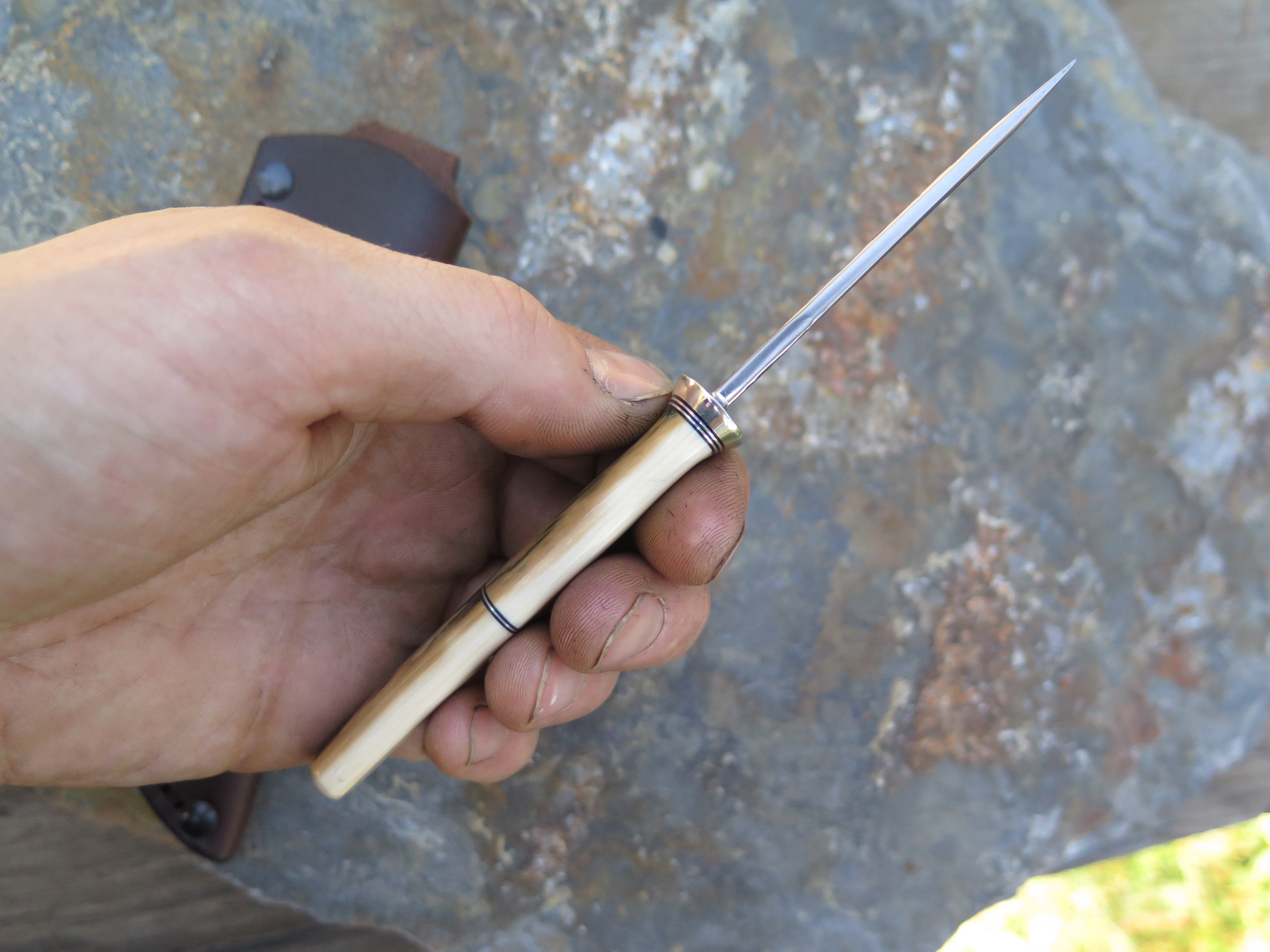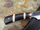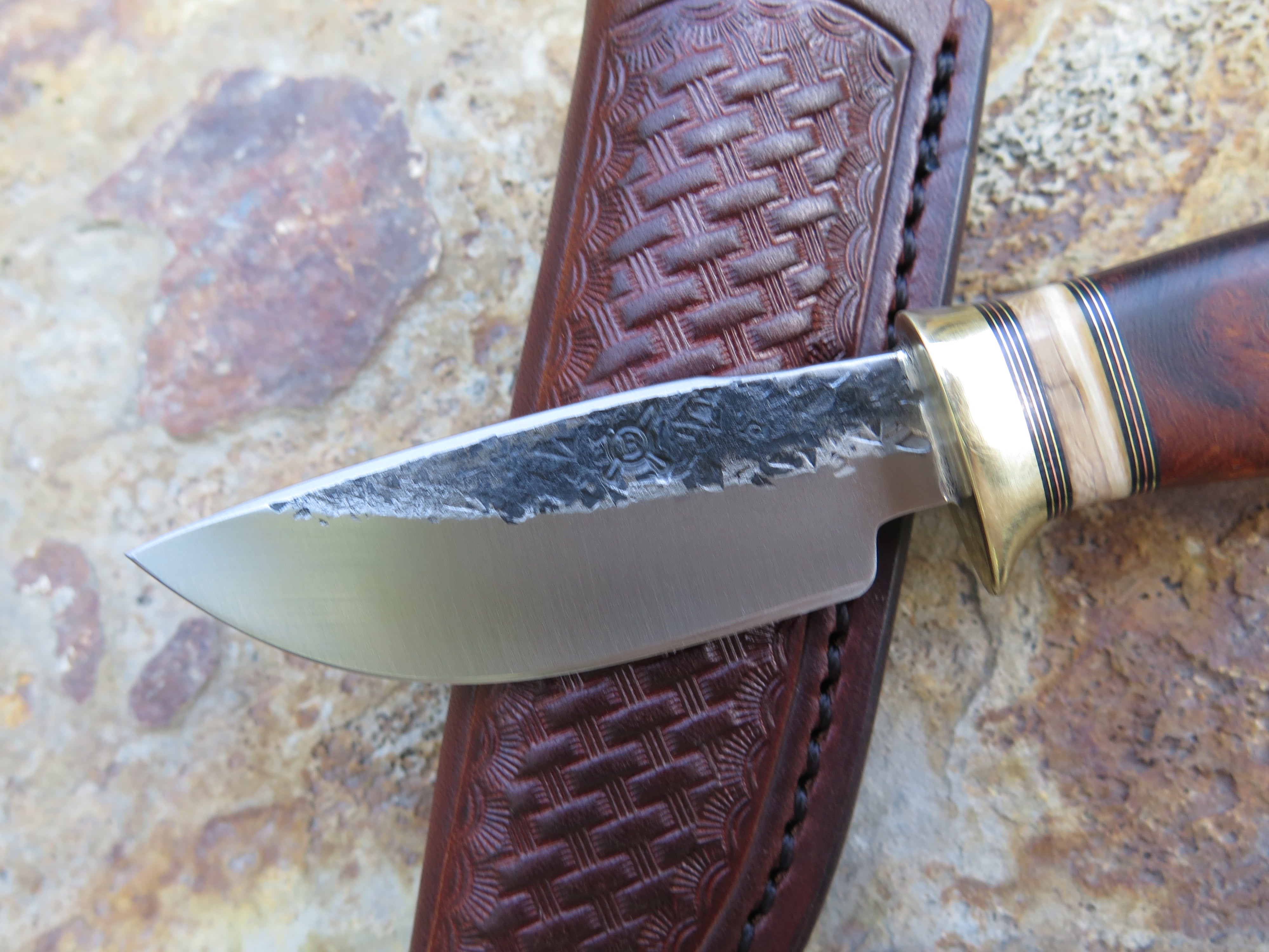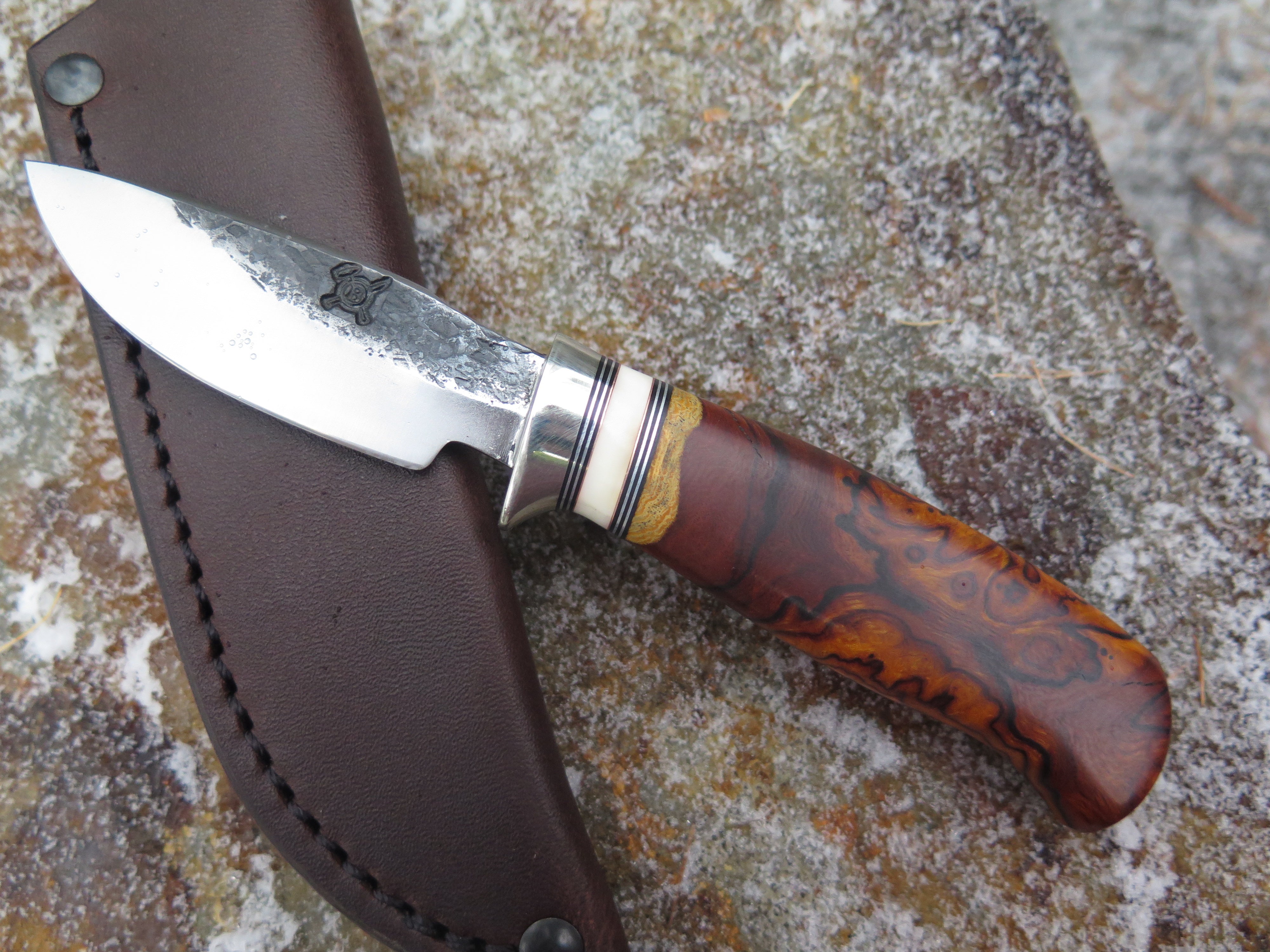 This incredible new Alaskan from Behring Made© is hand forged from 3/16" thick high carbon 01 tool steel and it measures 4 1/2" from tip to guard with a razor sharp hollow grind and our hammermark finish. The copper guard is soldered in place above black and copper spacers with an array of intense desert ironwood burl and contrasting accents of ancient mammoth ivory spacers to boot. The butt is pinned through the tang with copper and overall length rings in at 8 7/8". This one comes in a leather belt pouch sheath and we guarantee it for life.