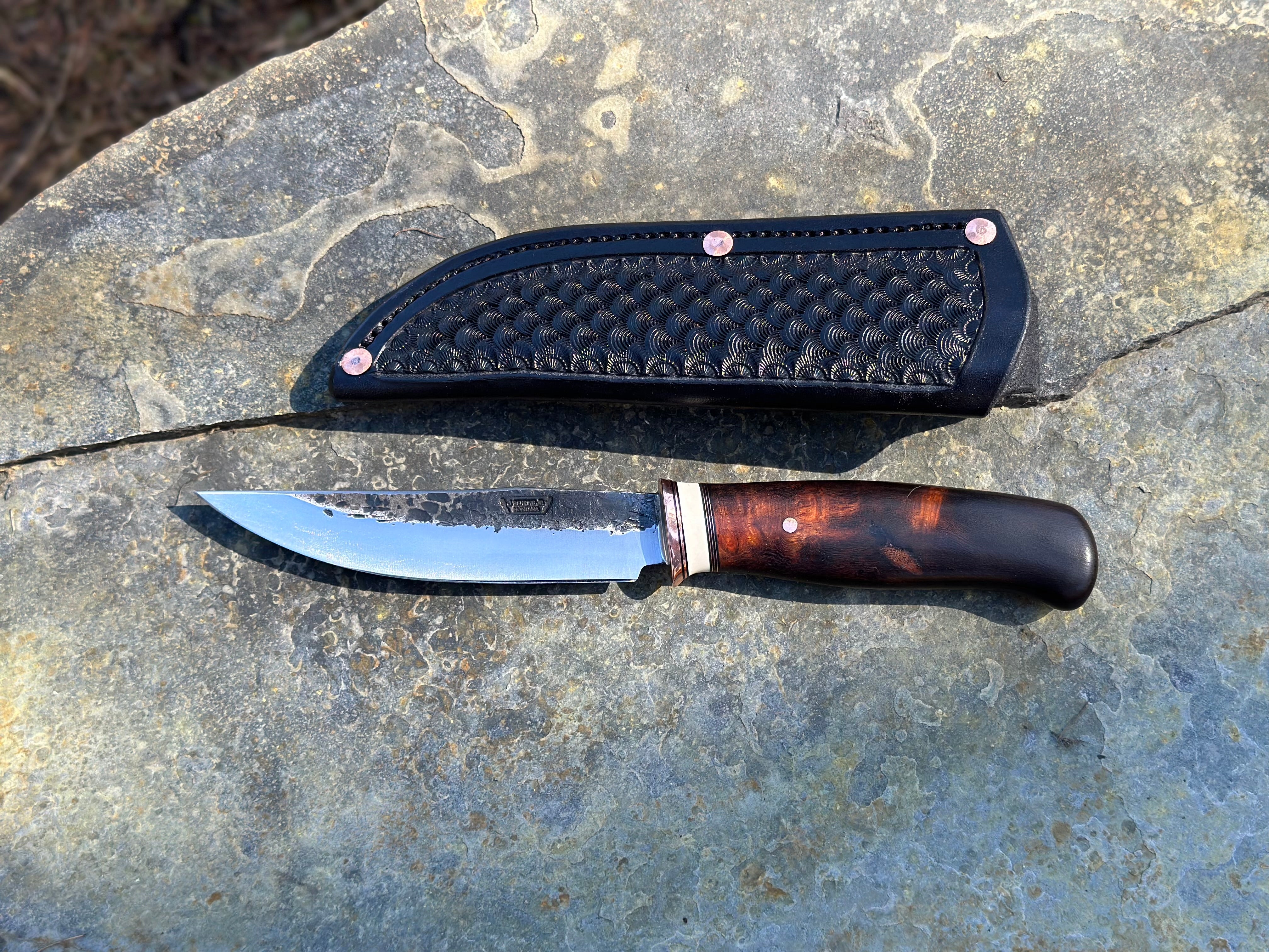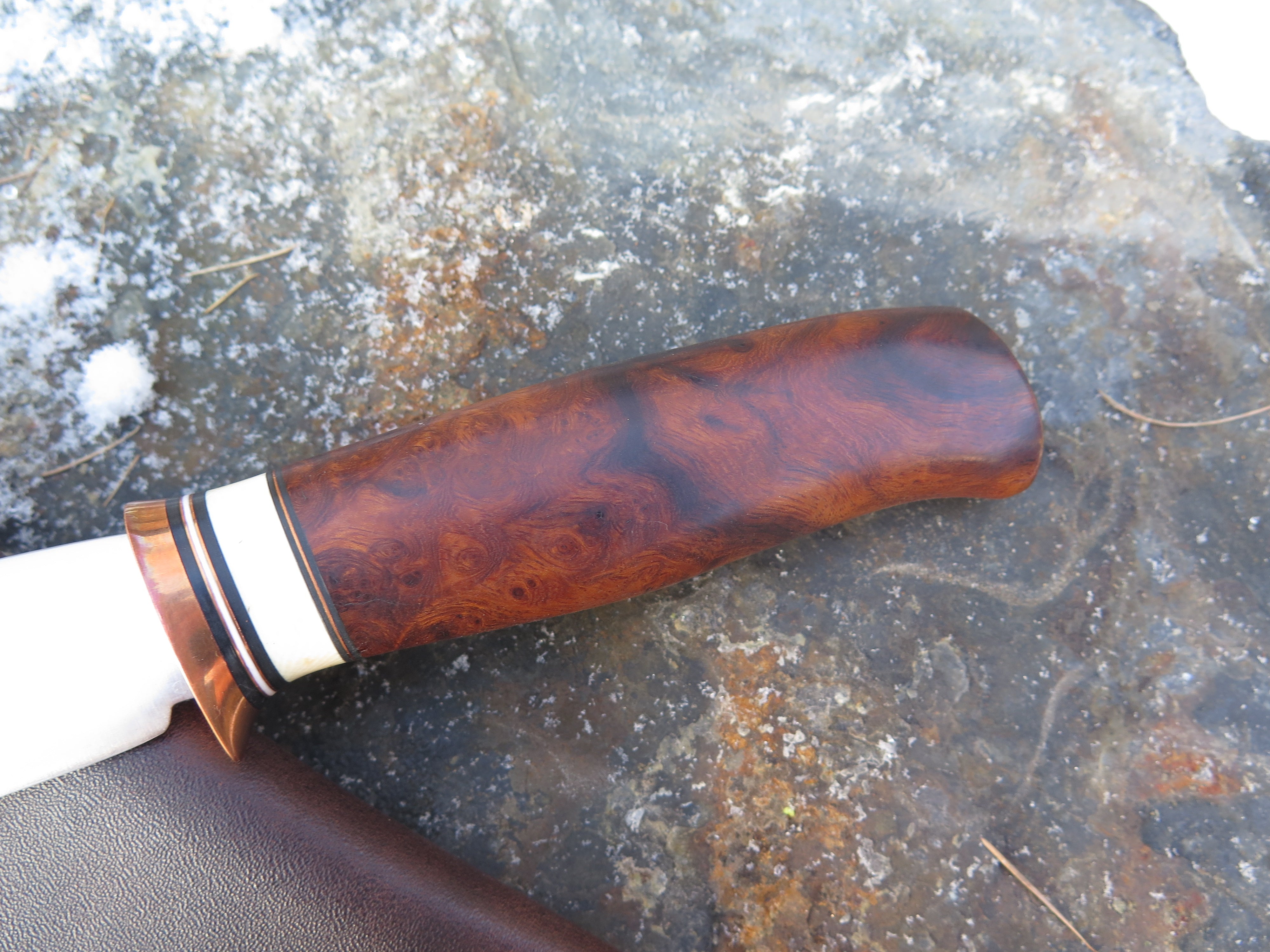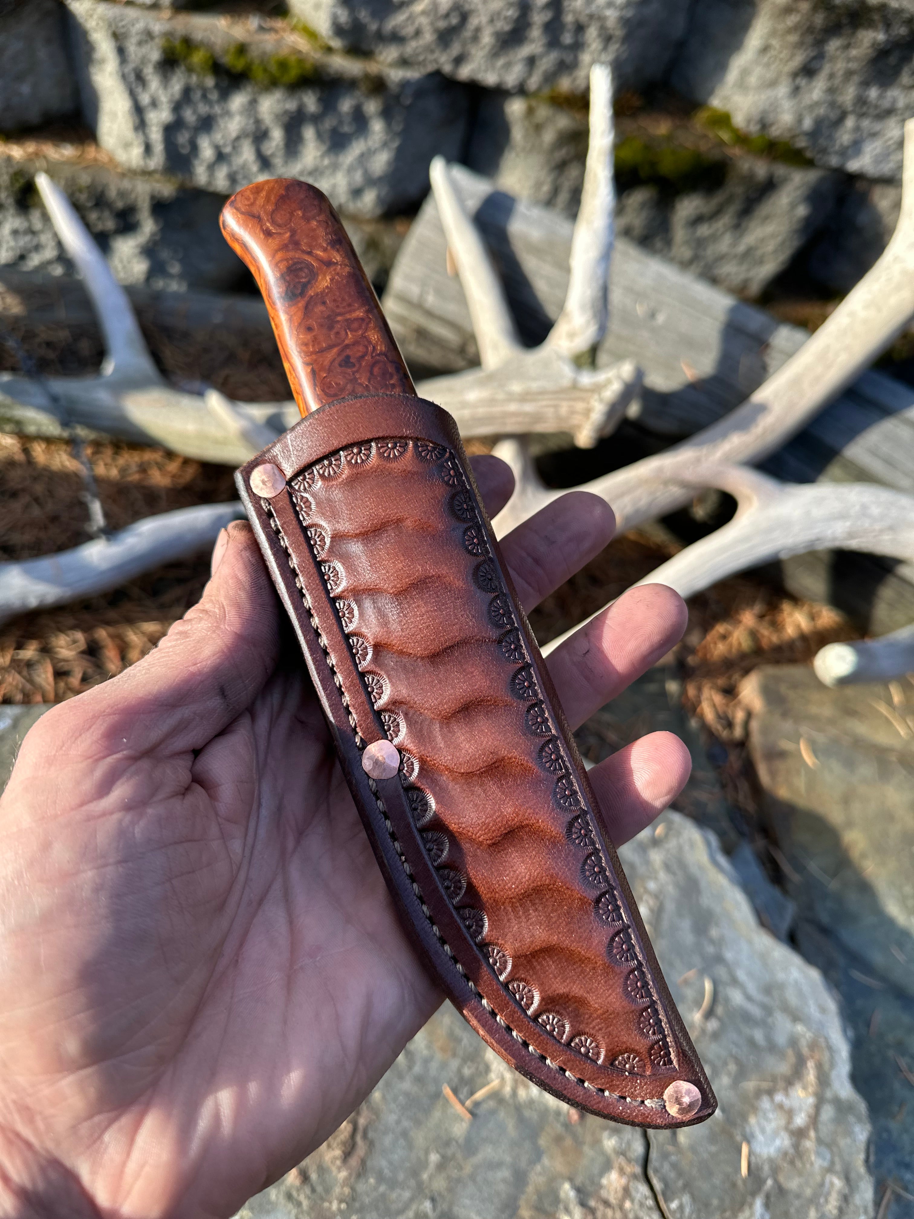 This beautiful Trout and Bird from Behring Made© is entirely handmade starting with the 440c stainless blades that measure just about 4 3/4" from tip to guard with a razor sharp convex grind. The copper guard is soldered in place above black and white fiber, copper and ancient mammoth ivory spacers that yield a wonderful contrast against the premium desert ironwood burl handle. The overall length measures about 9 1/2" and it comes guaranteed for life in a classic leather belt sheath.