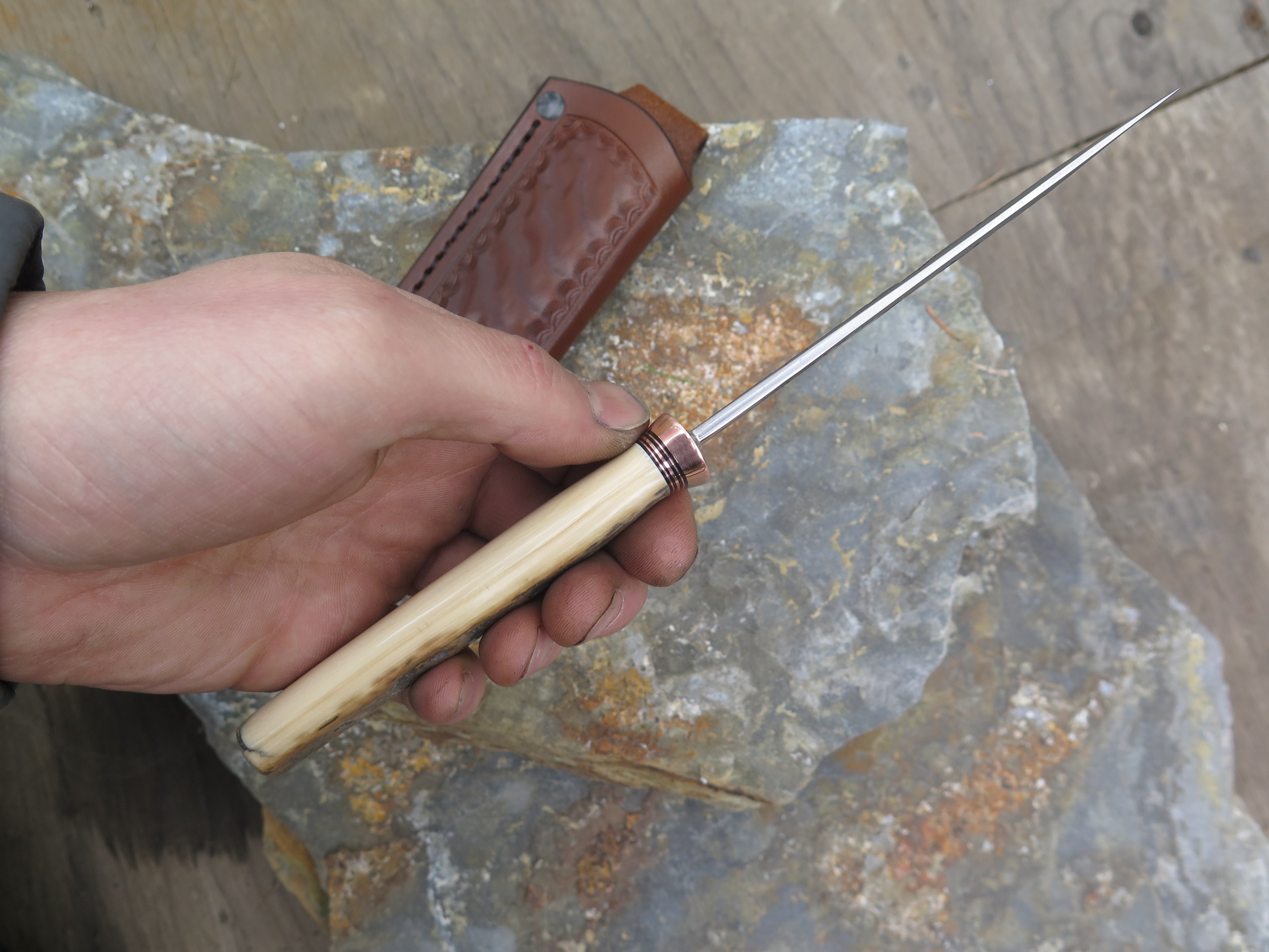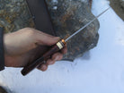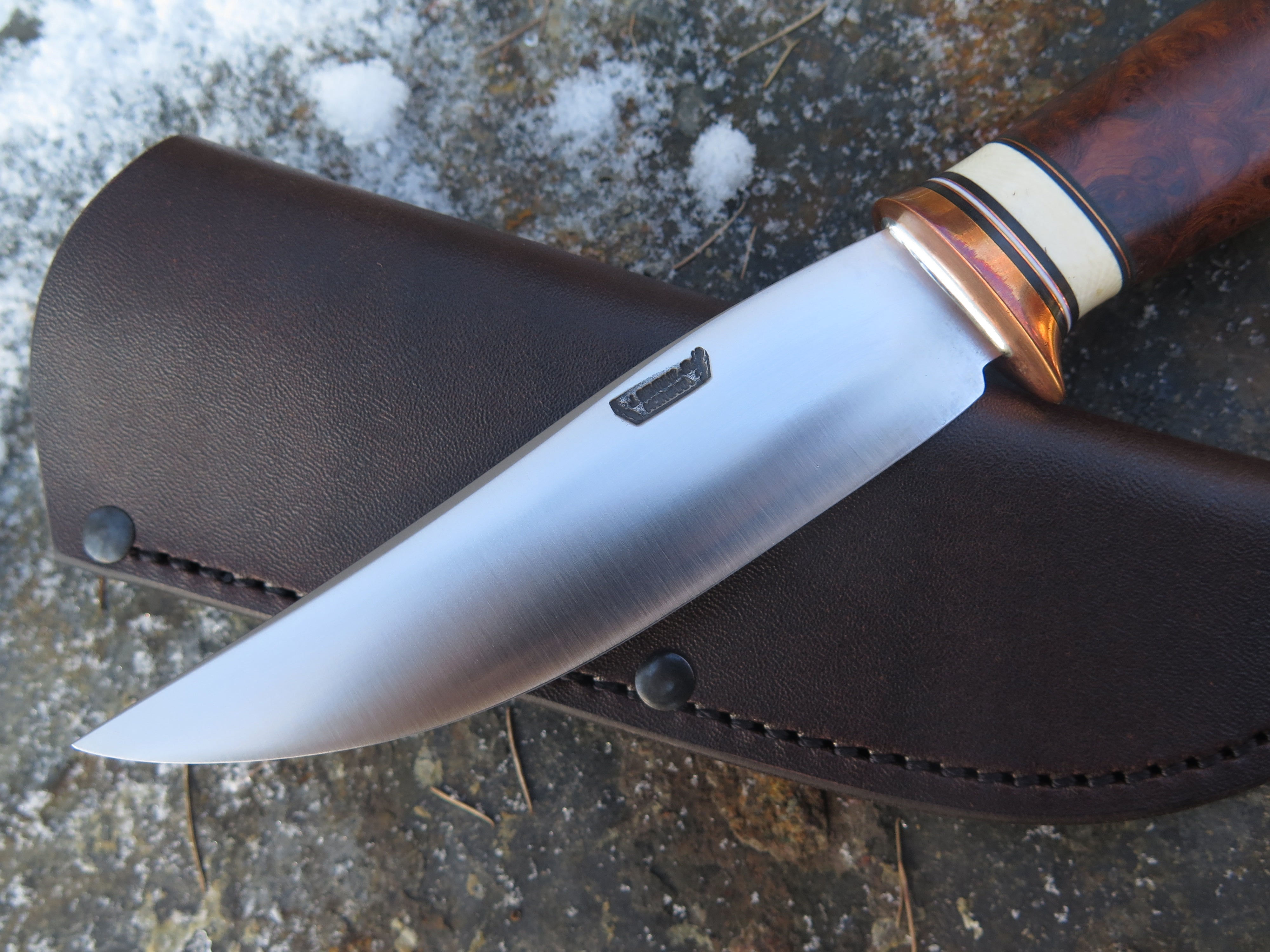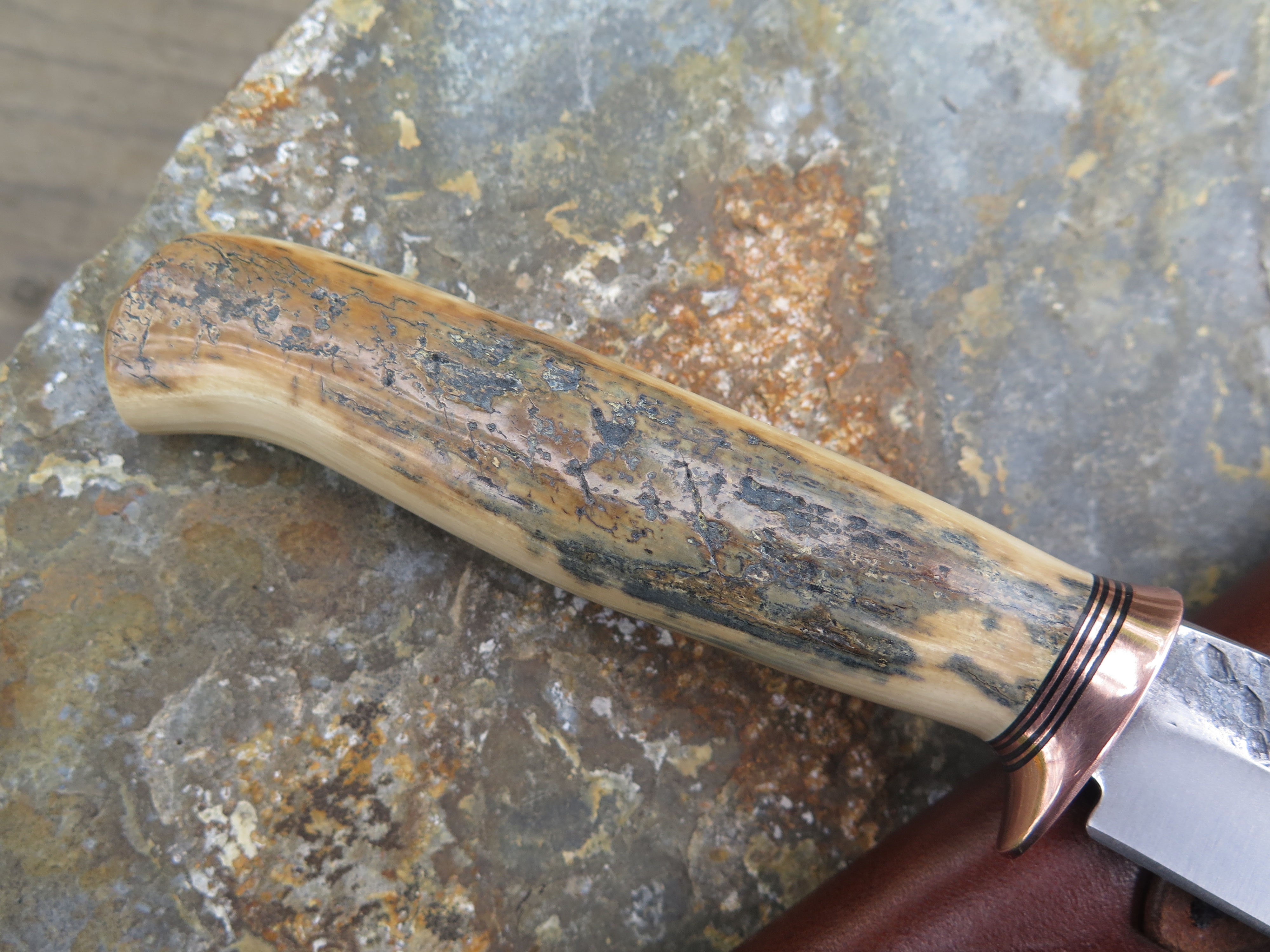 This beautiful Trout and Bird from Behring Made© is entirely handmade starting with the 440c stainless blades that measure just about 4 3/4" from tip to guard with a razor sharp convex grind. The copper guard is soldered in place above black and white fiber, copper and ancient mammoth ivory spacers that yield a wonderful contrast against the premium desert ironwood burl handle. The overall length measures about 9 1/2" and it comes guaranteed for life in a classic leather belt sheath.