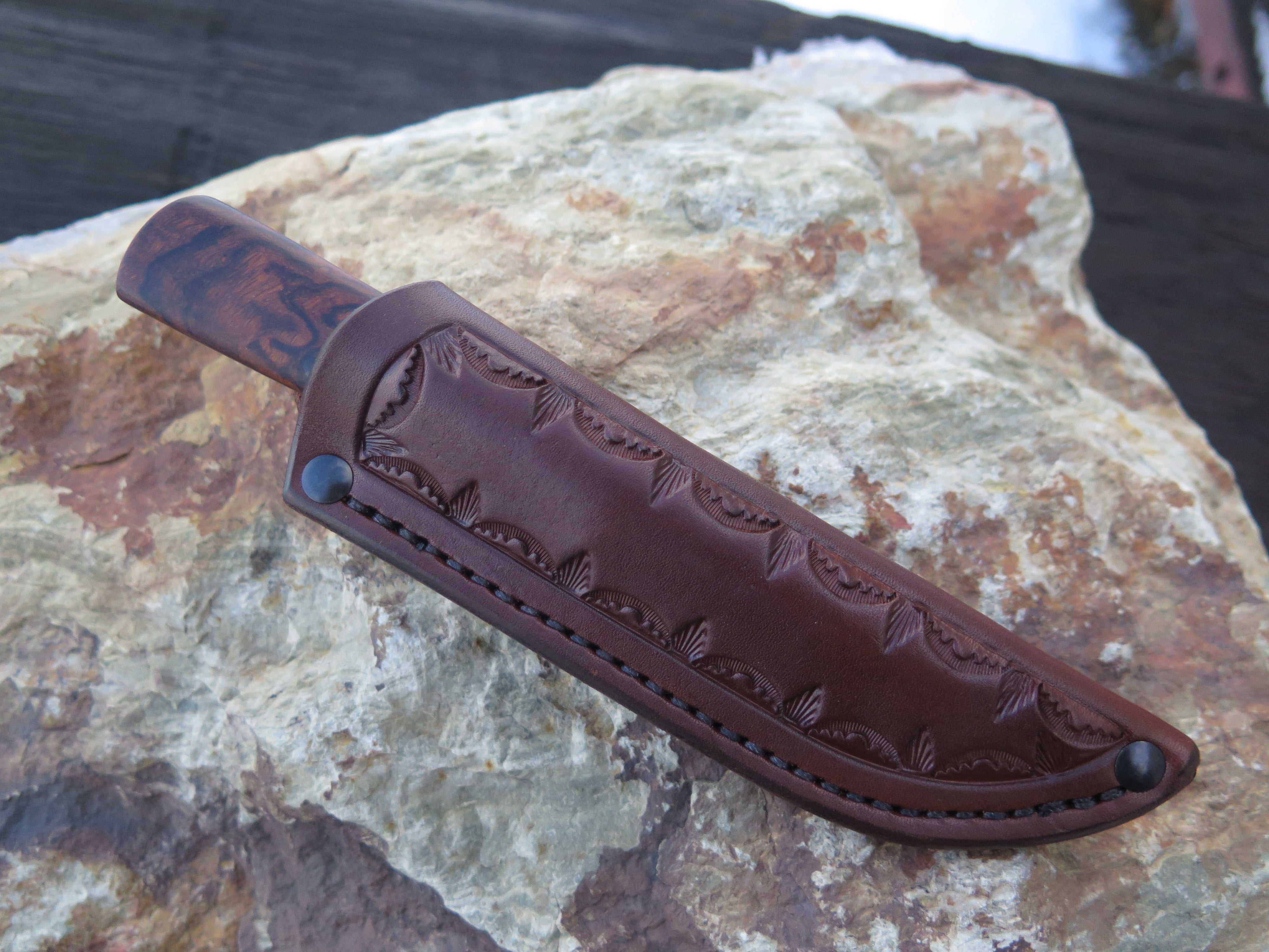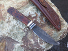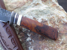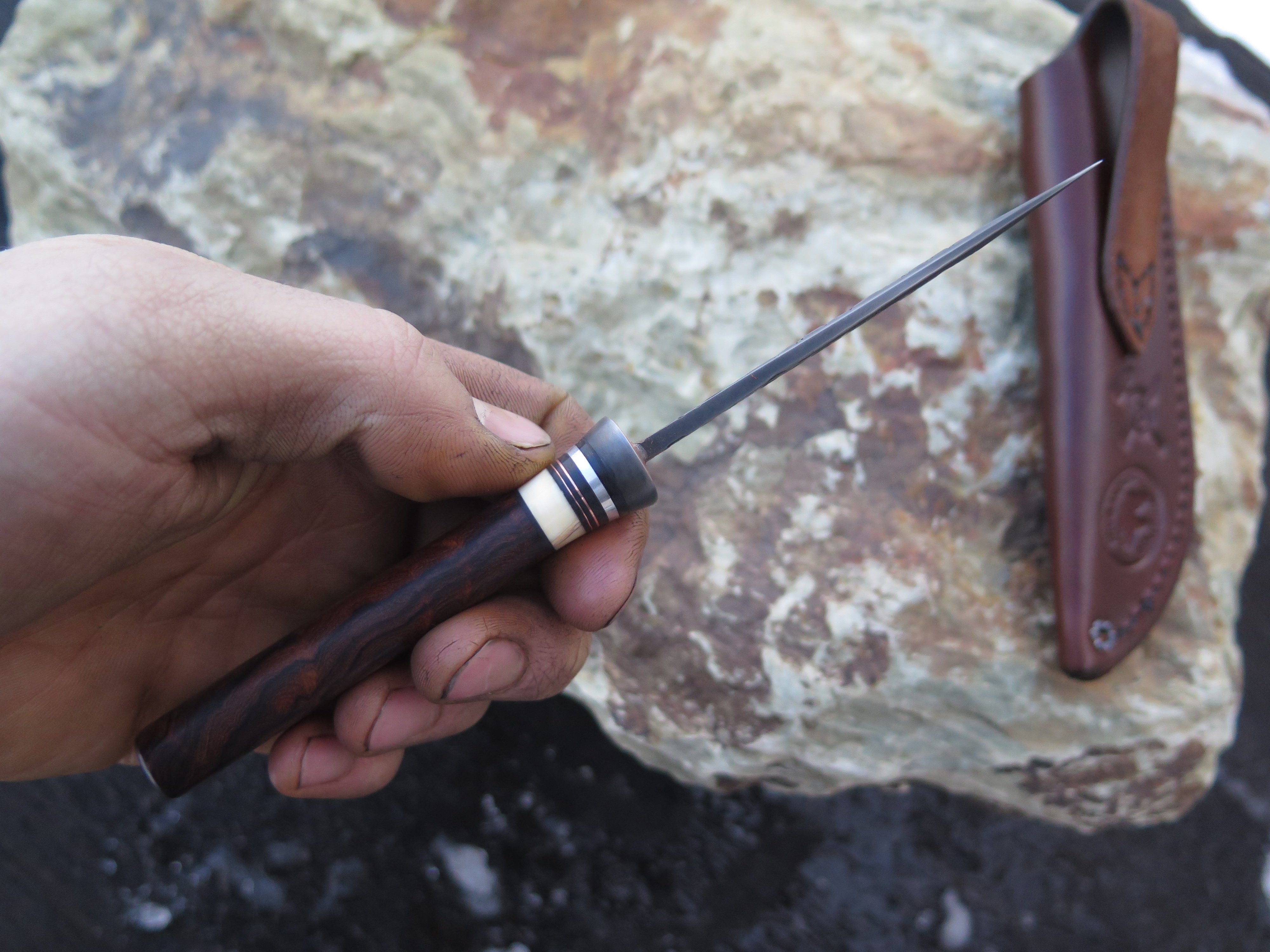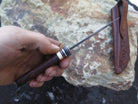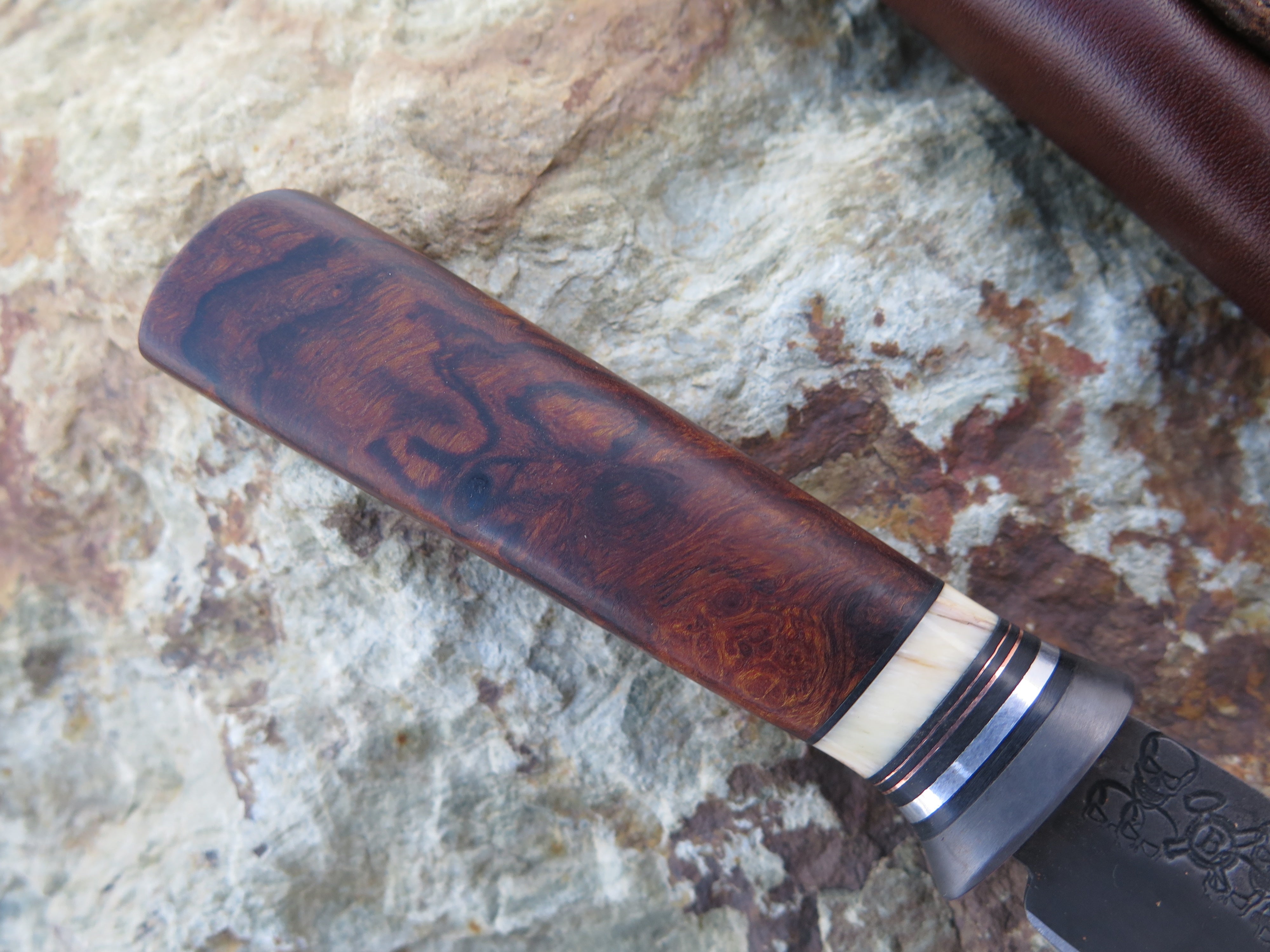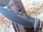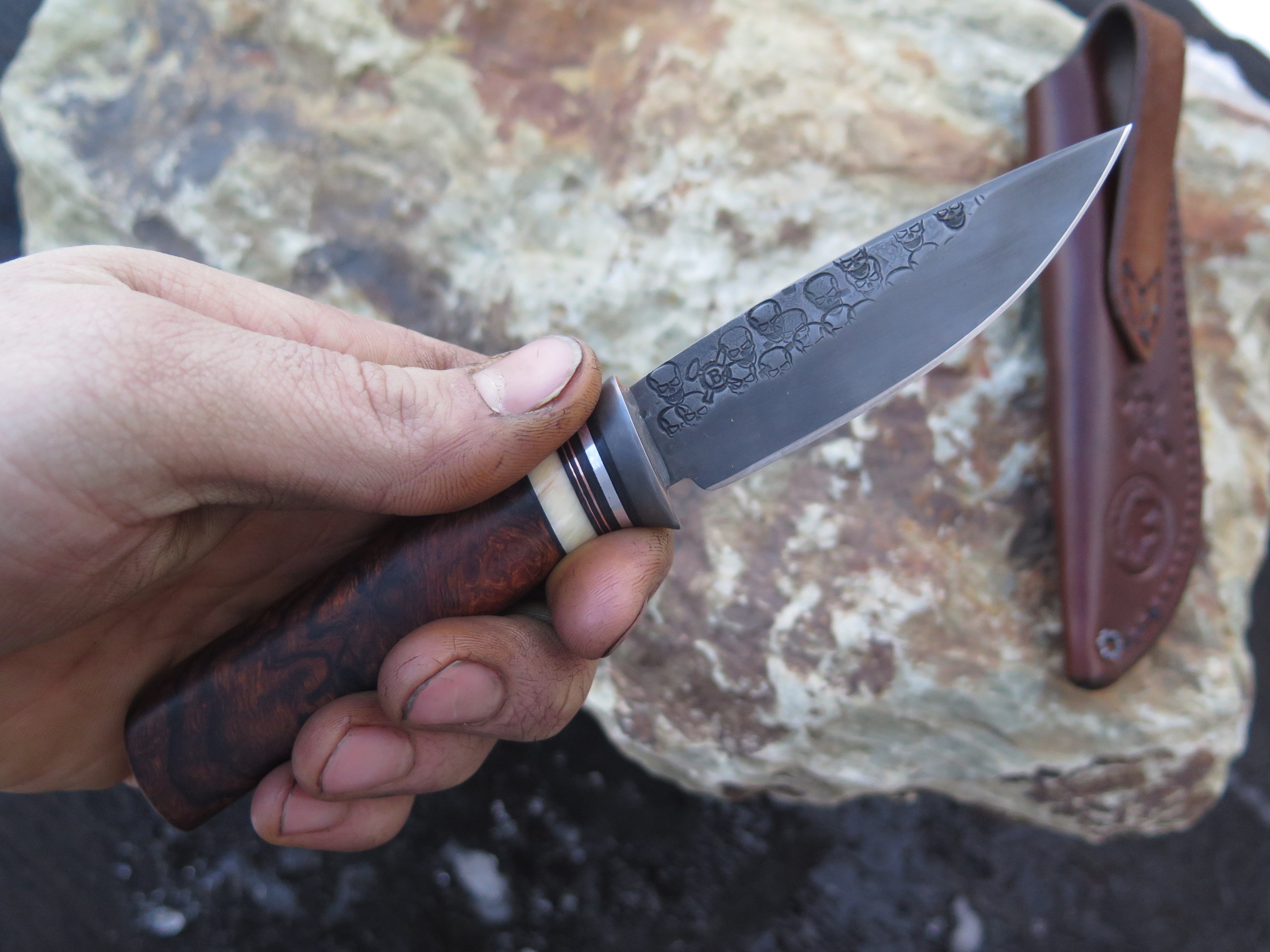 This incredible new Mini Drop Point from Behring Made™ features no shortage of premium options! The blade is hand forged from 1/8" thick high carbon 01 tool steel and dons our ghost skull hammermarks, a blued finish and a razor sharp hollow grind that measures 3 1/4" from tip to guard. The blued steel guard is soldered in place above black fiber, copper, aluminum and beautiful fossil walrus ivory spacers that are a wonderful compliment to the desert ironwood burl handle that brings the overall length to measure 6 3/4". This one comes in a Warlander Leather pouch sheath and is guaranteed for life.