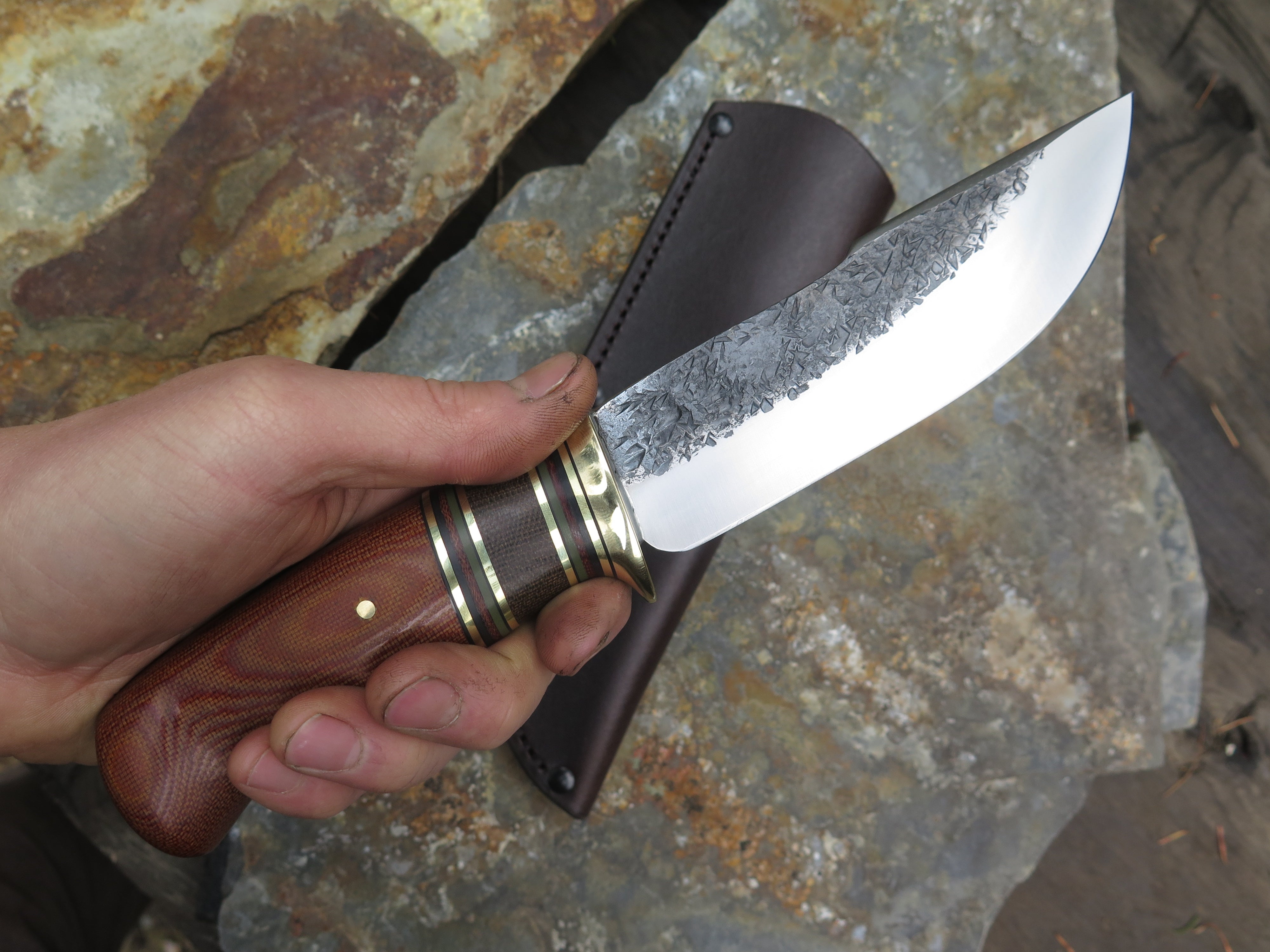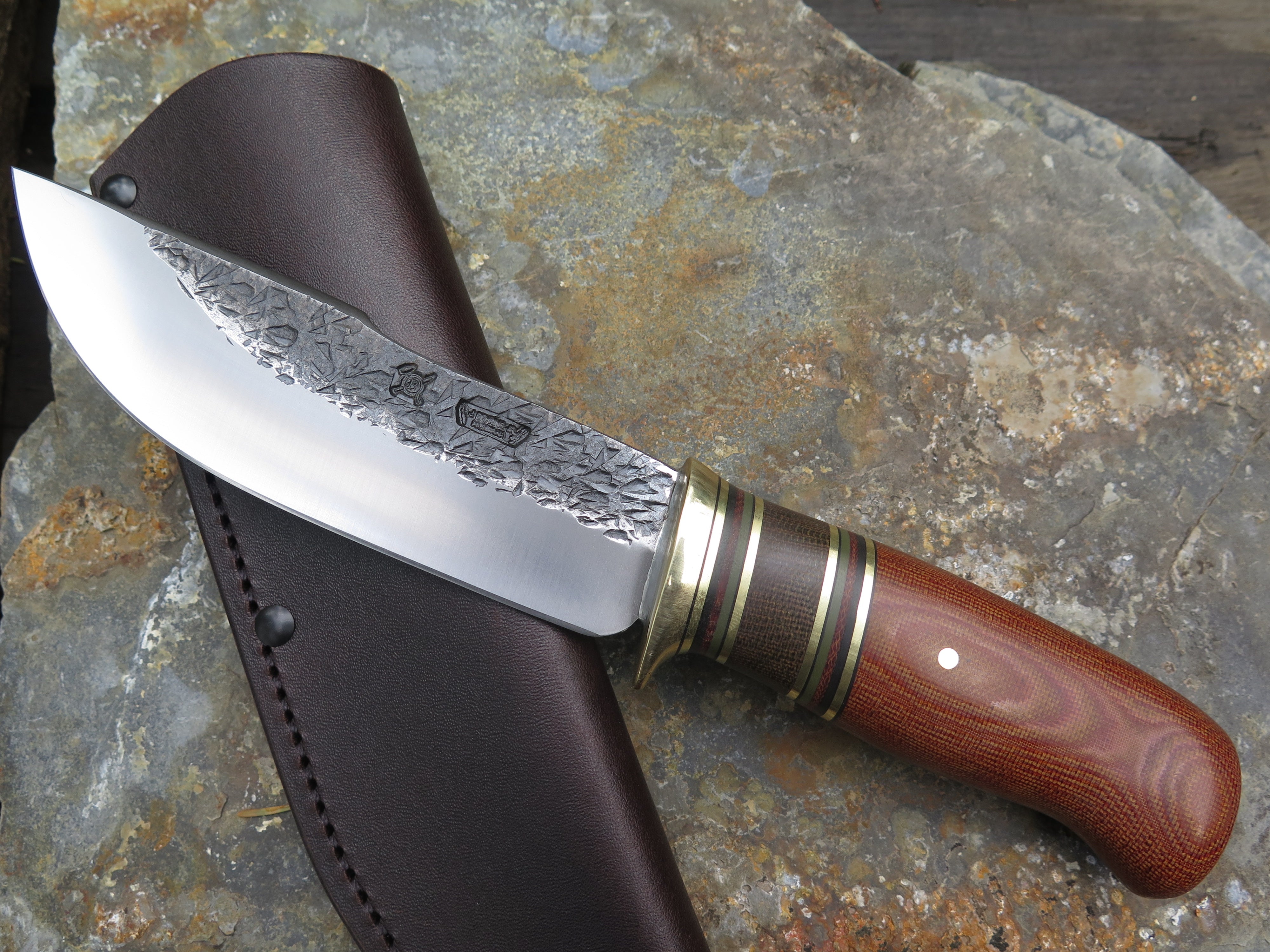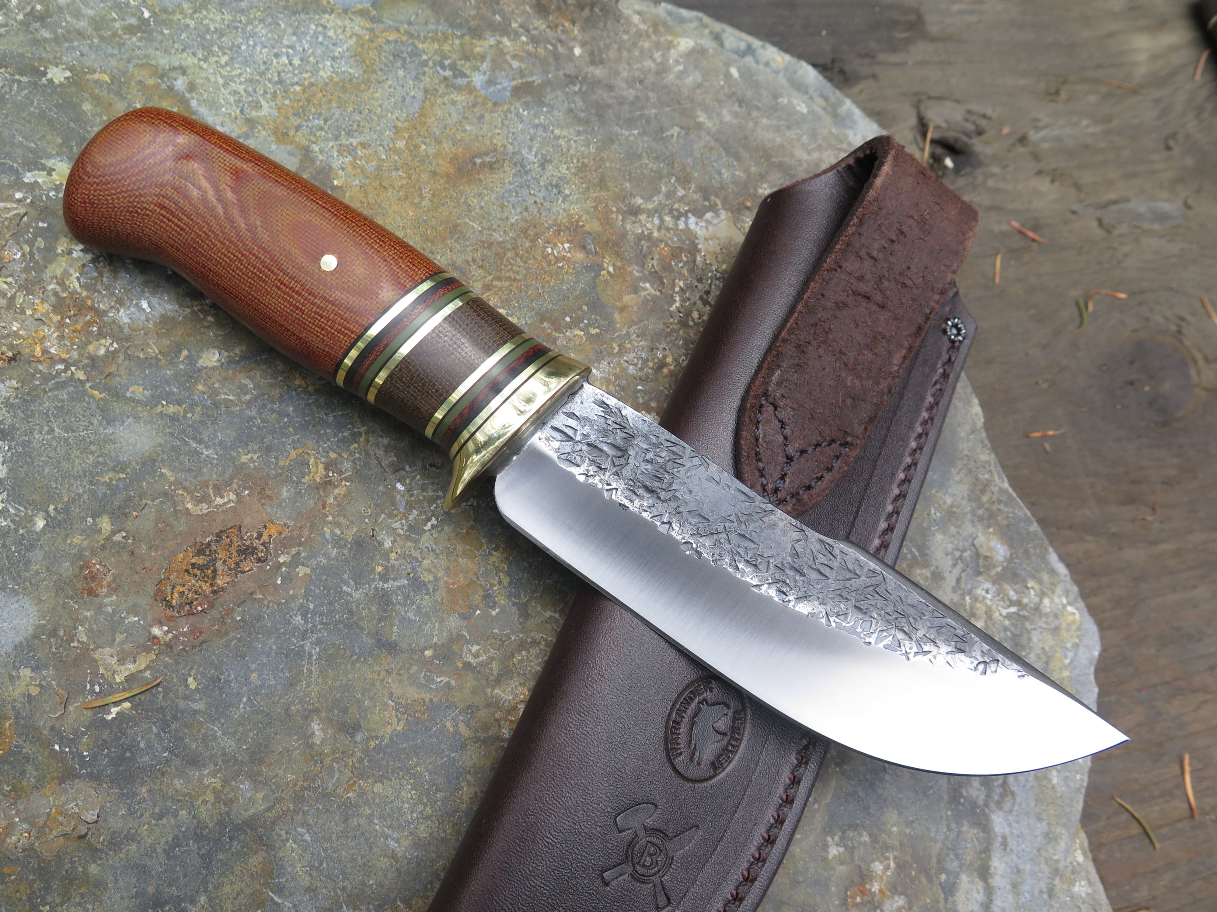 This outstanding new Woodcraft from Behring Made© is hand forged from 3/16" thick high carbon 01 tool steel and it measures 5 1/2" from tip to guard with a razor sharp hollow grind and our hammermark finish. The brass guard is soldered in place above black fiber, brass, green micarta, natural micarta and green g10 spacers as well as a natural canvas micarta that's pinned through the tang with brass. The overall length measures 10 1/4" and it comes in a classic leather belt pouch sheath.