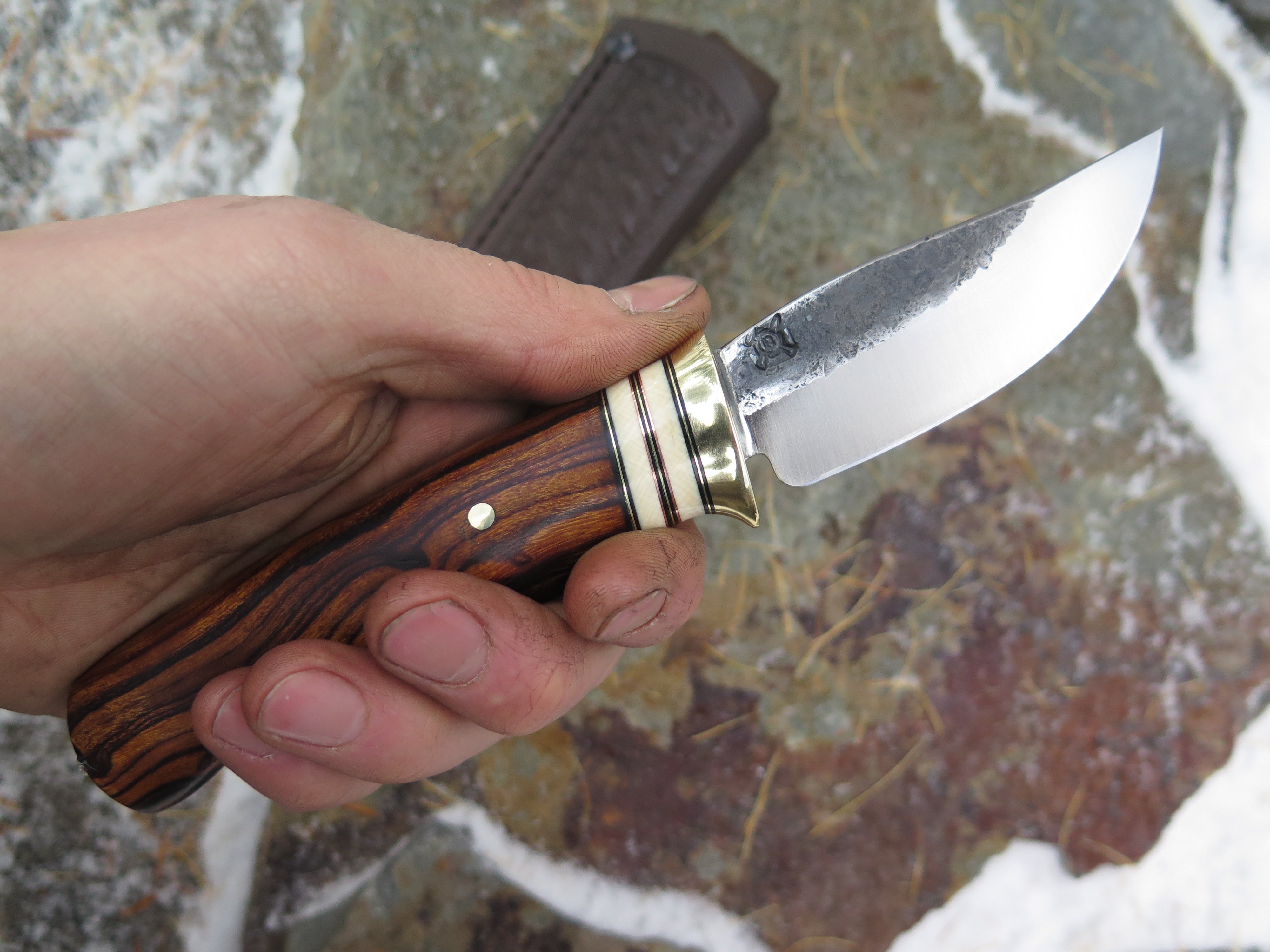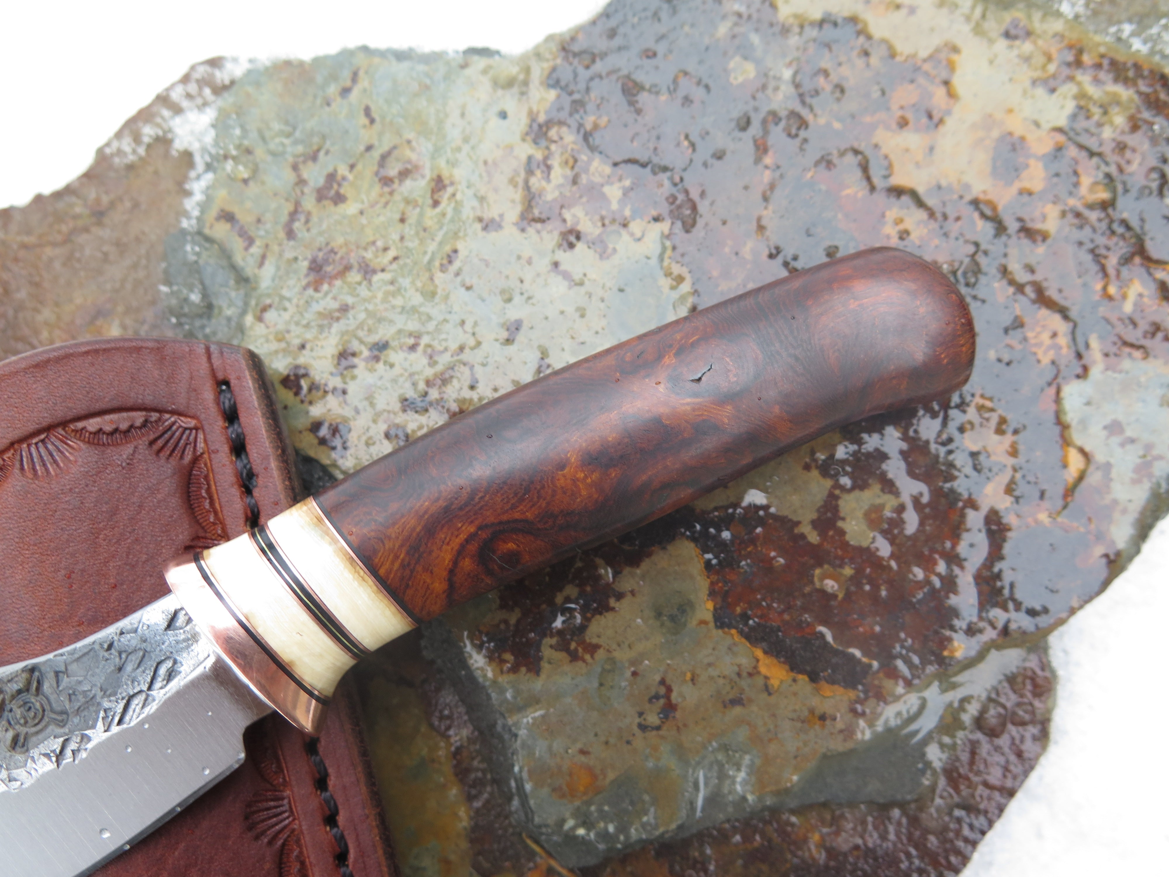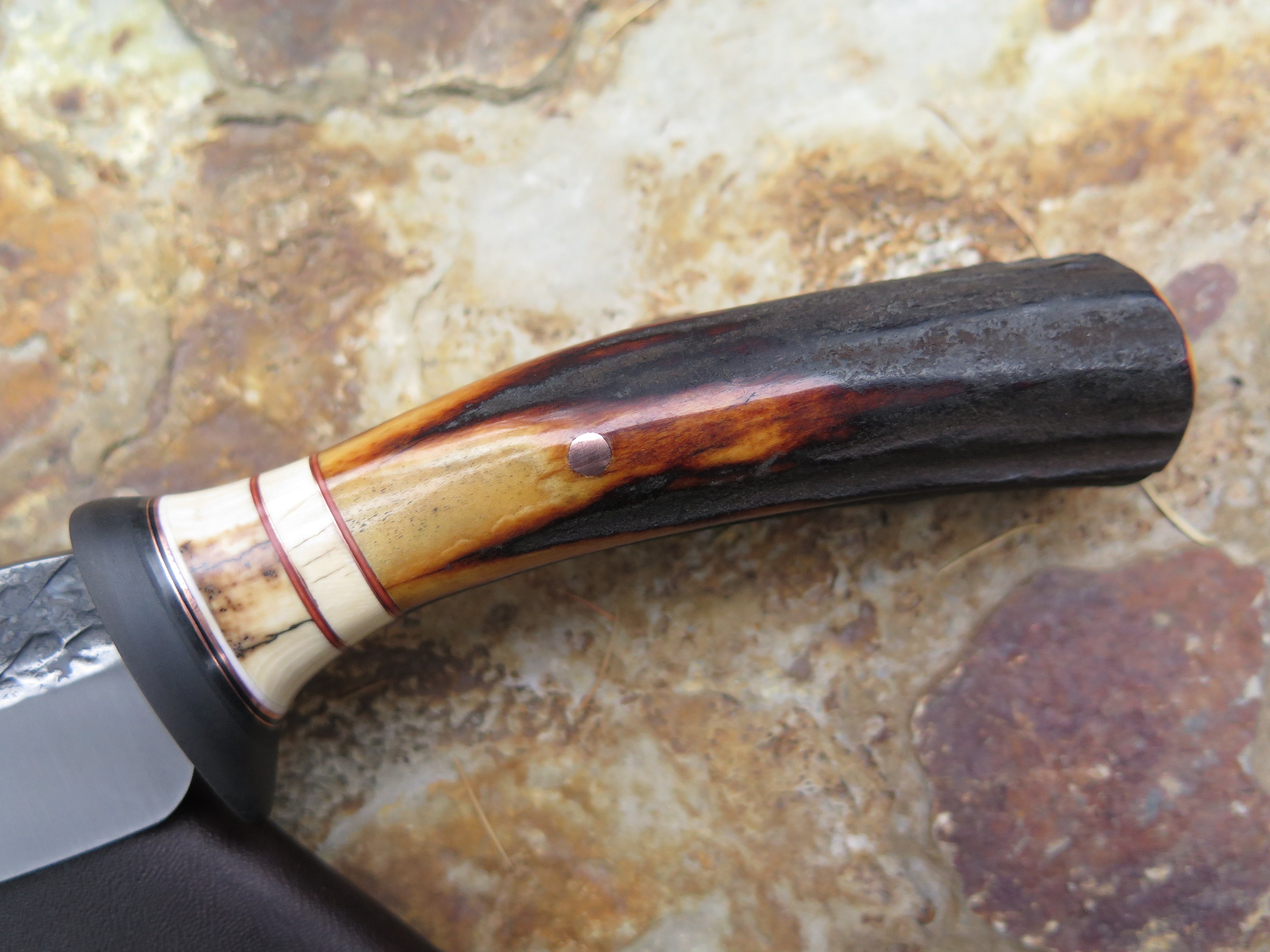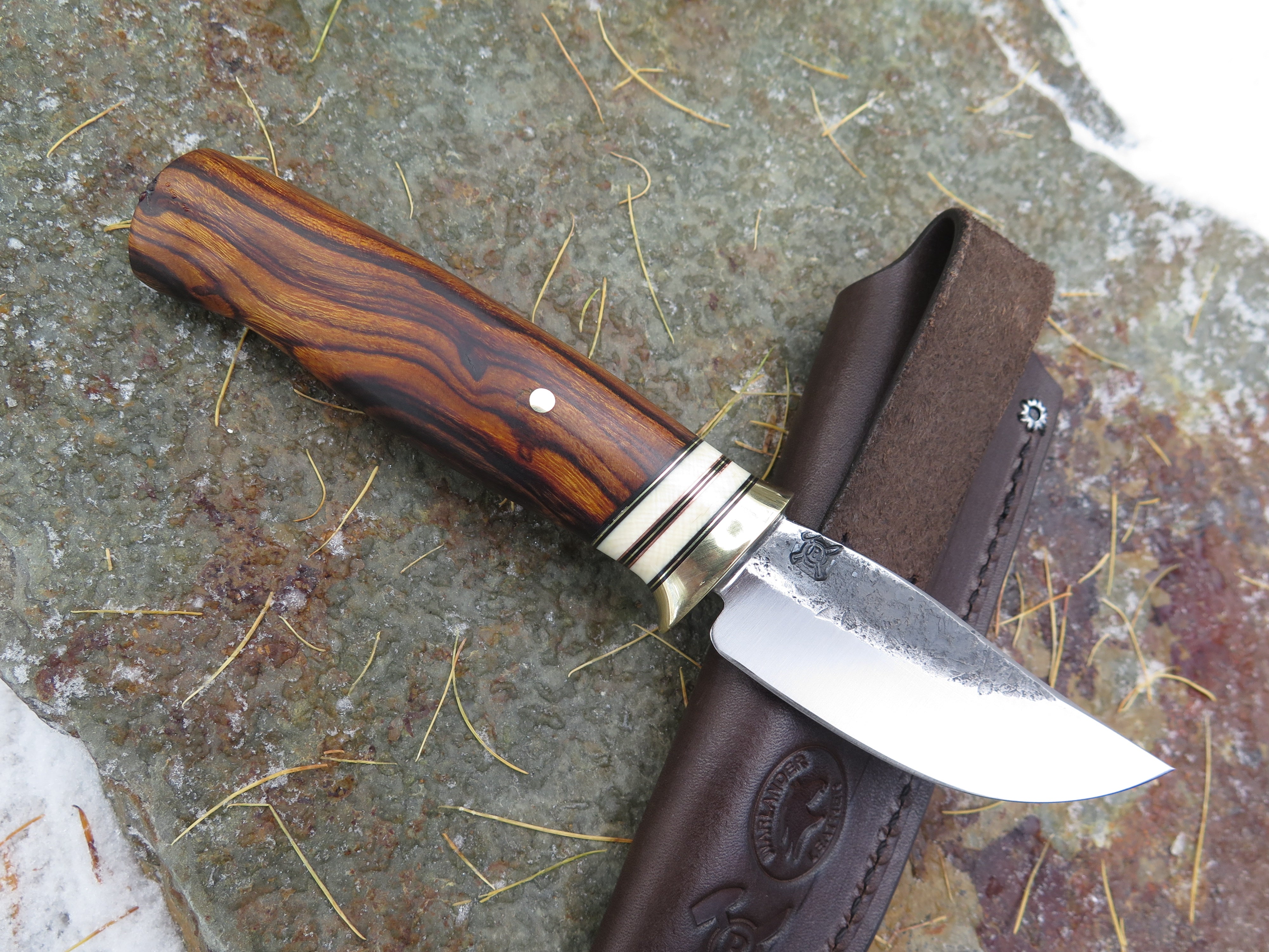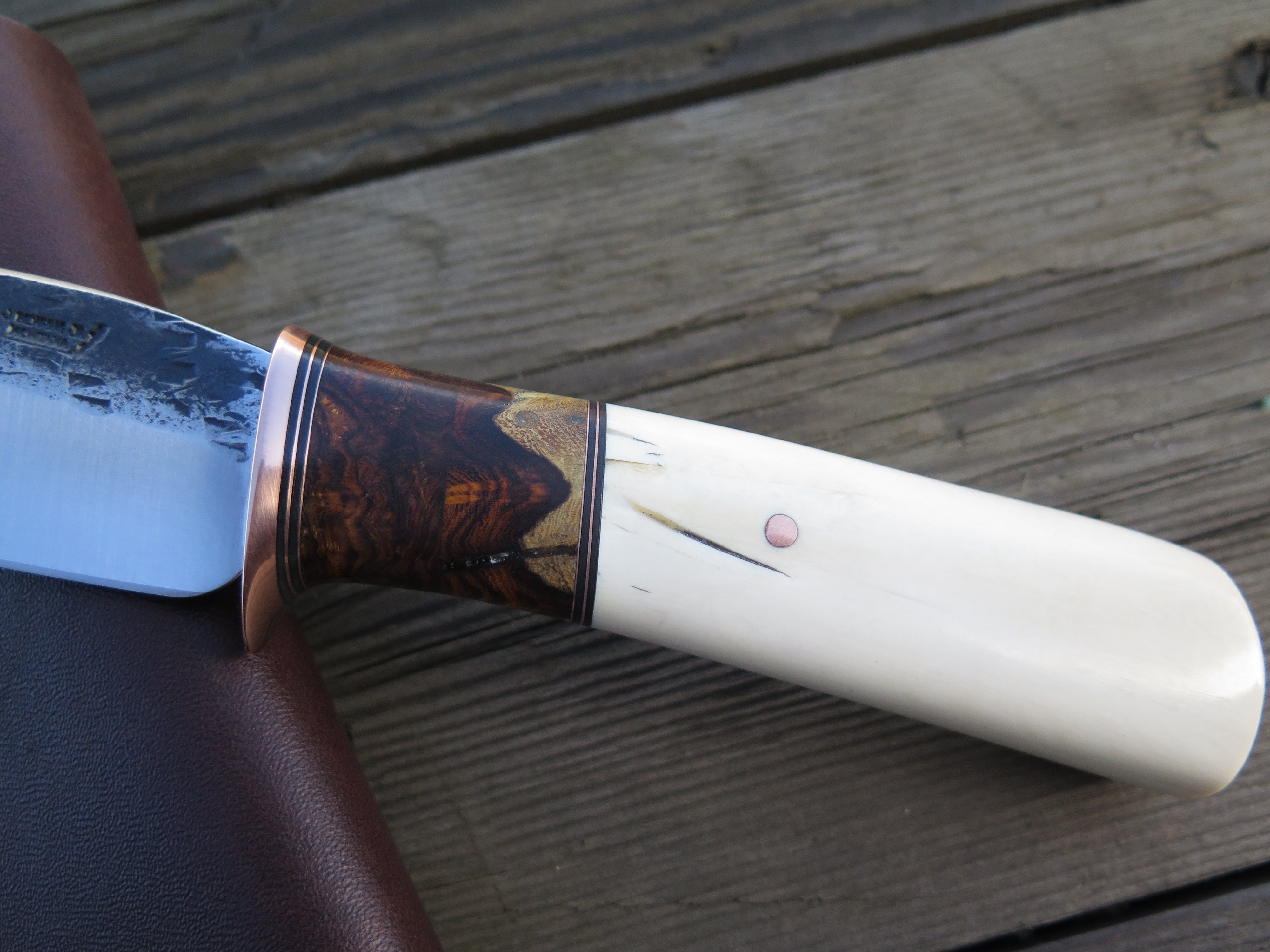 This beautiful new Sharptail from Behring Made© is hand forged from 1/8" thick high carbon 01 tool steel and measures 3 1/4" from tip to guard with a razor sharp hollow grind and our hammermark finish. The brass guard is soldered in place above black, brass, copper and two ancient mammoth ivory spacers as well as a premium desert ironwood handle that is pinned through the tang with brass. The overall length measures 7" and it comes in the shown leather belt pouch sheath, though substitutions are available upon request.