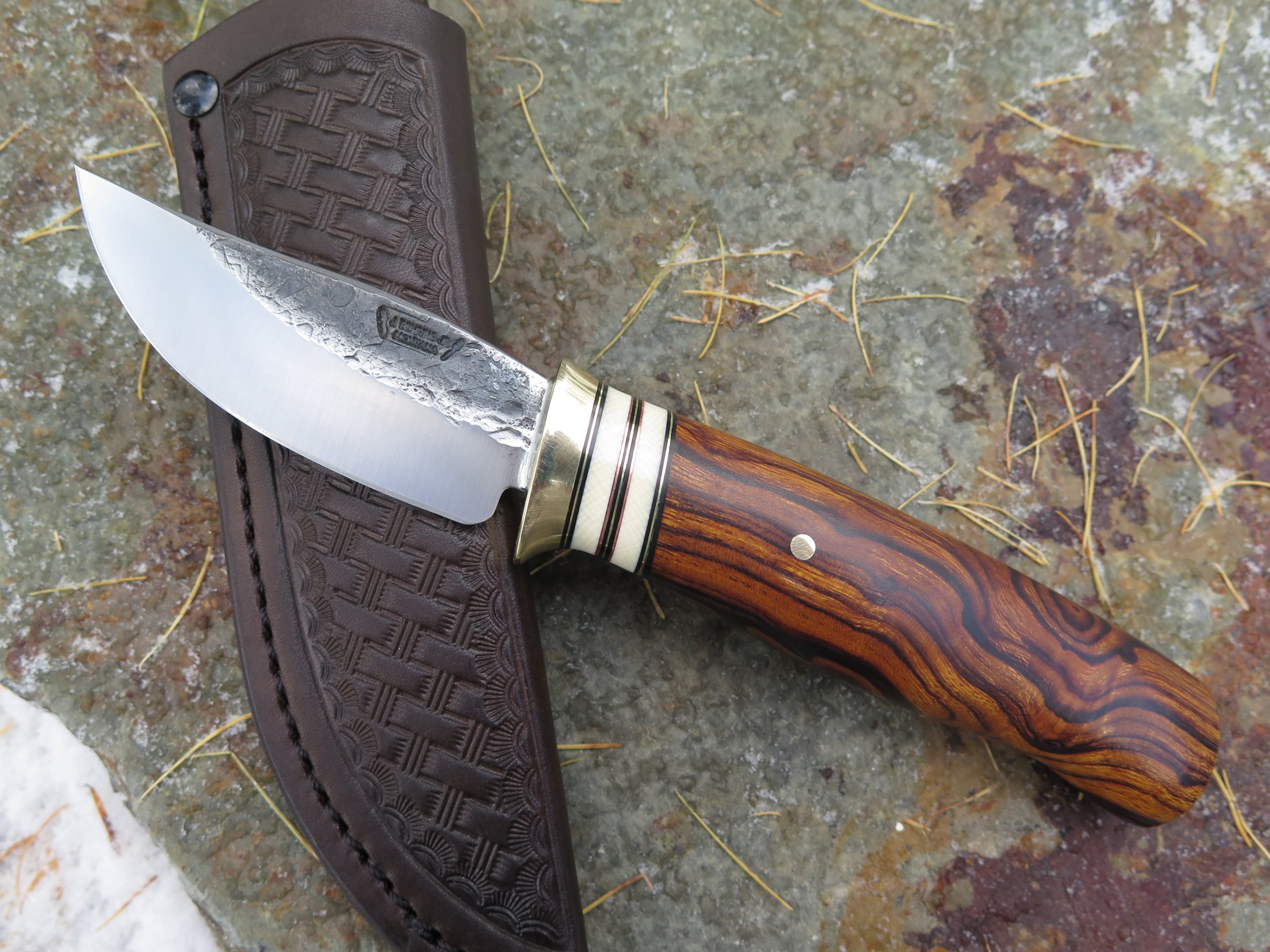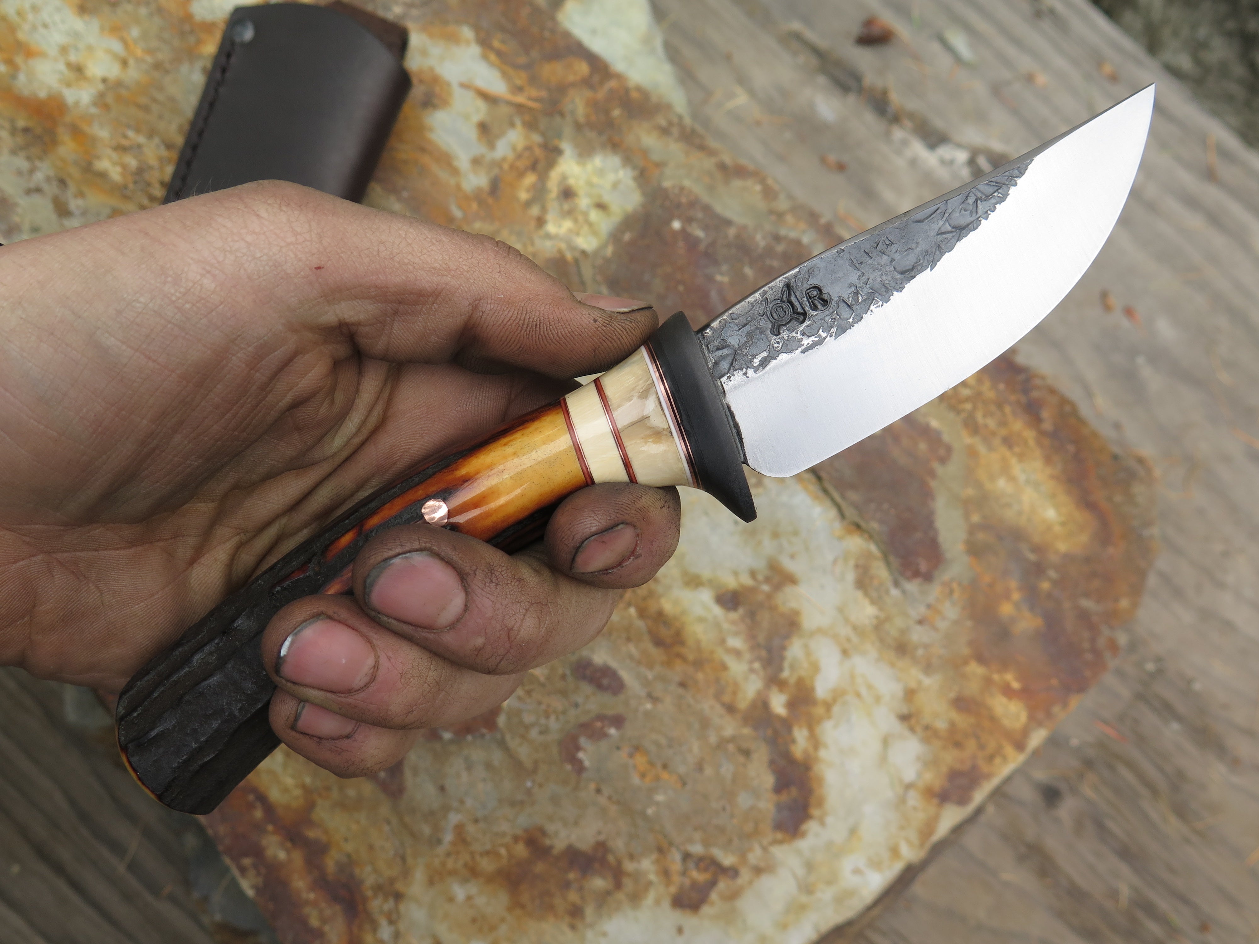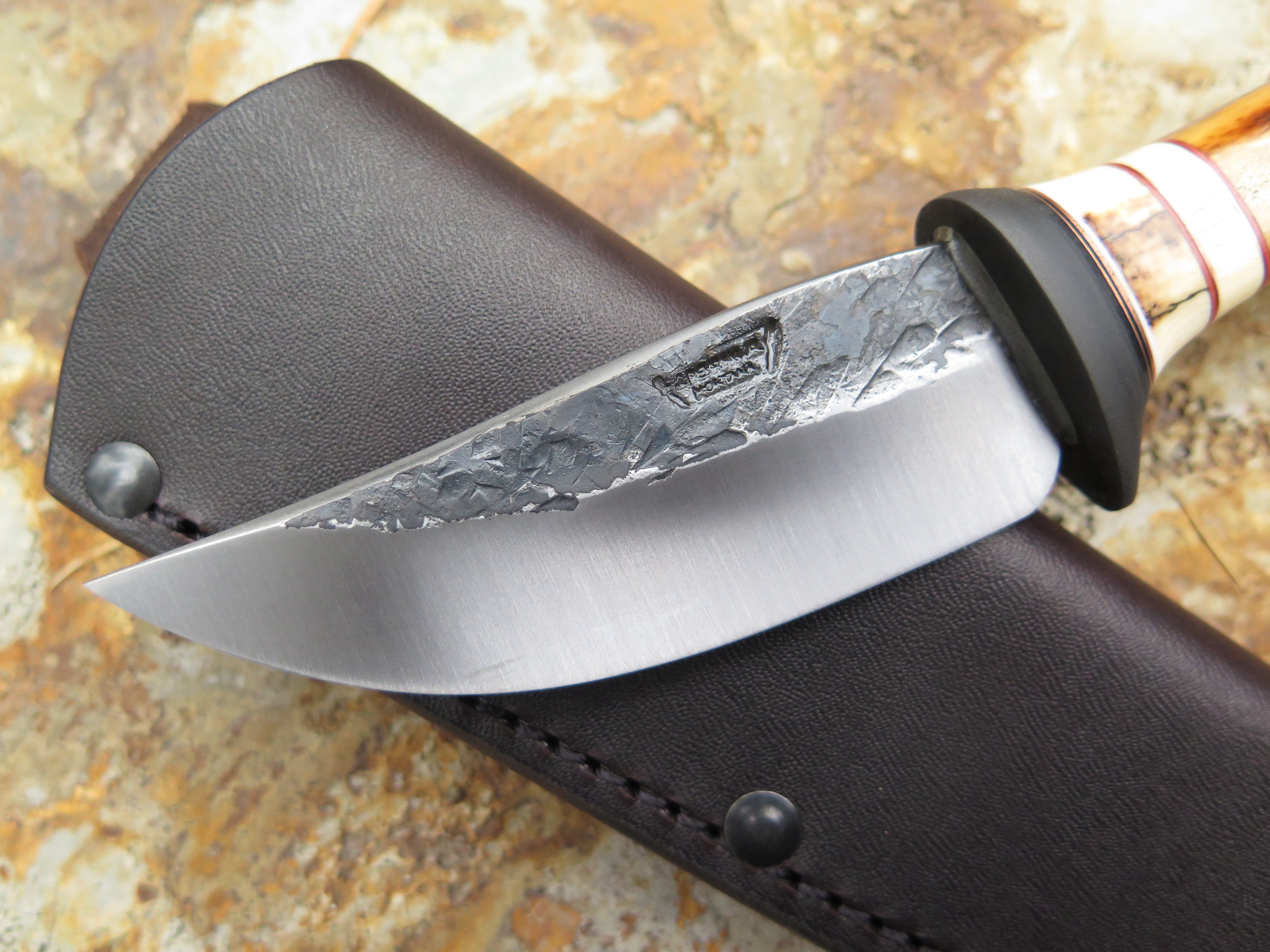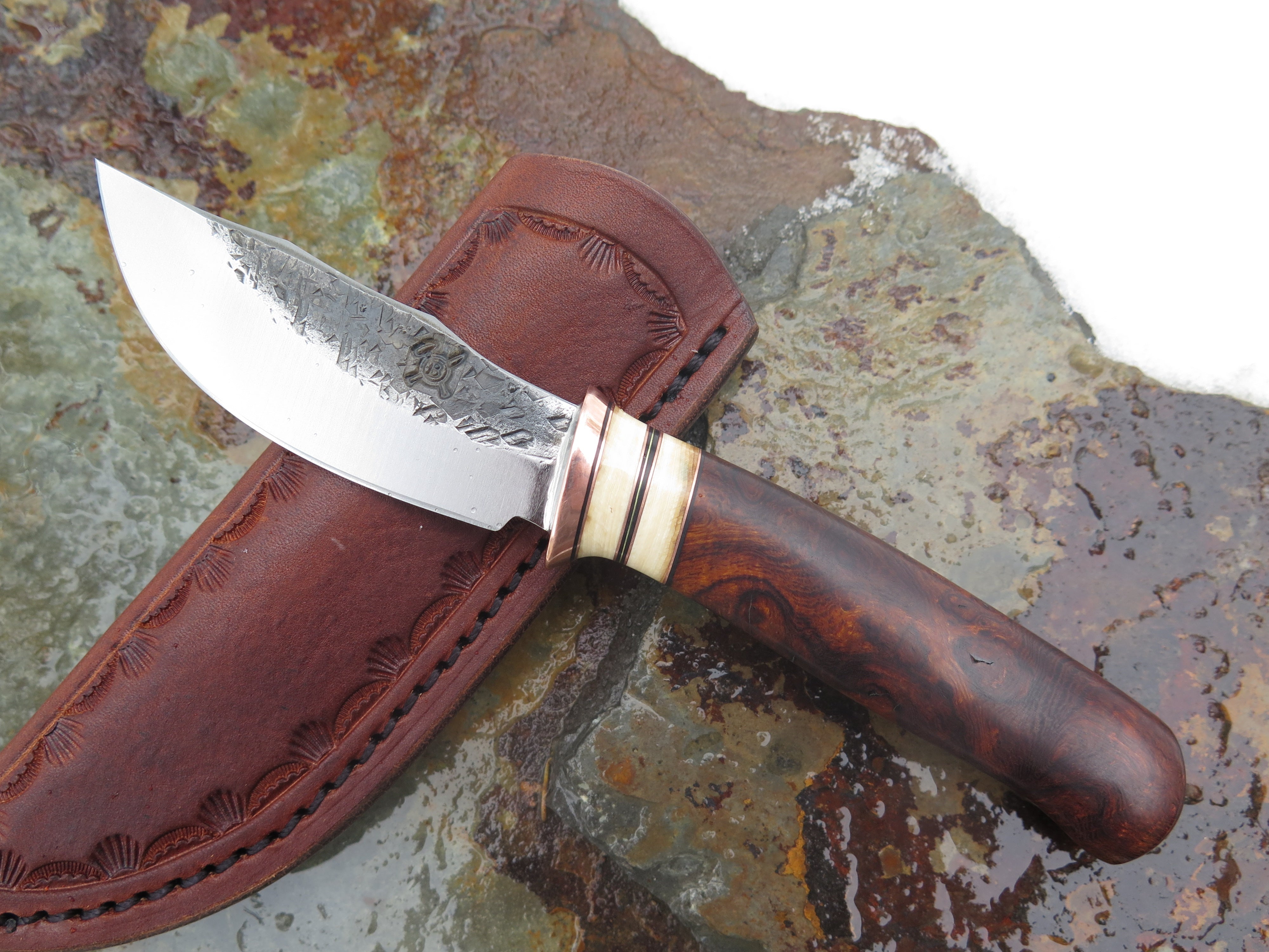 This beautiful new Sharptail from Behring Made© is hand forged from 1/8" thick high carbon 01 tool steel and measures 3 1/4" from tip to guard with a razor sharp hollow grind and our hammermark finish. The brass guard is soldered in place above black, brass, copper and two ancient mammoth ivory spacers as well as a premium desert ironwood handle that is pinned through the tang with brass. The overall length measures 7" and it comes in the shown leather belt pouch sheath, though substitutions are available upon request.