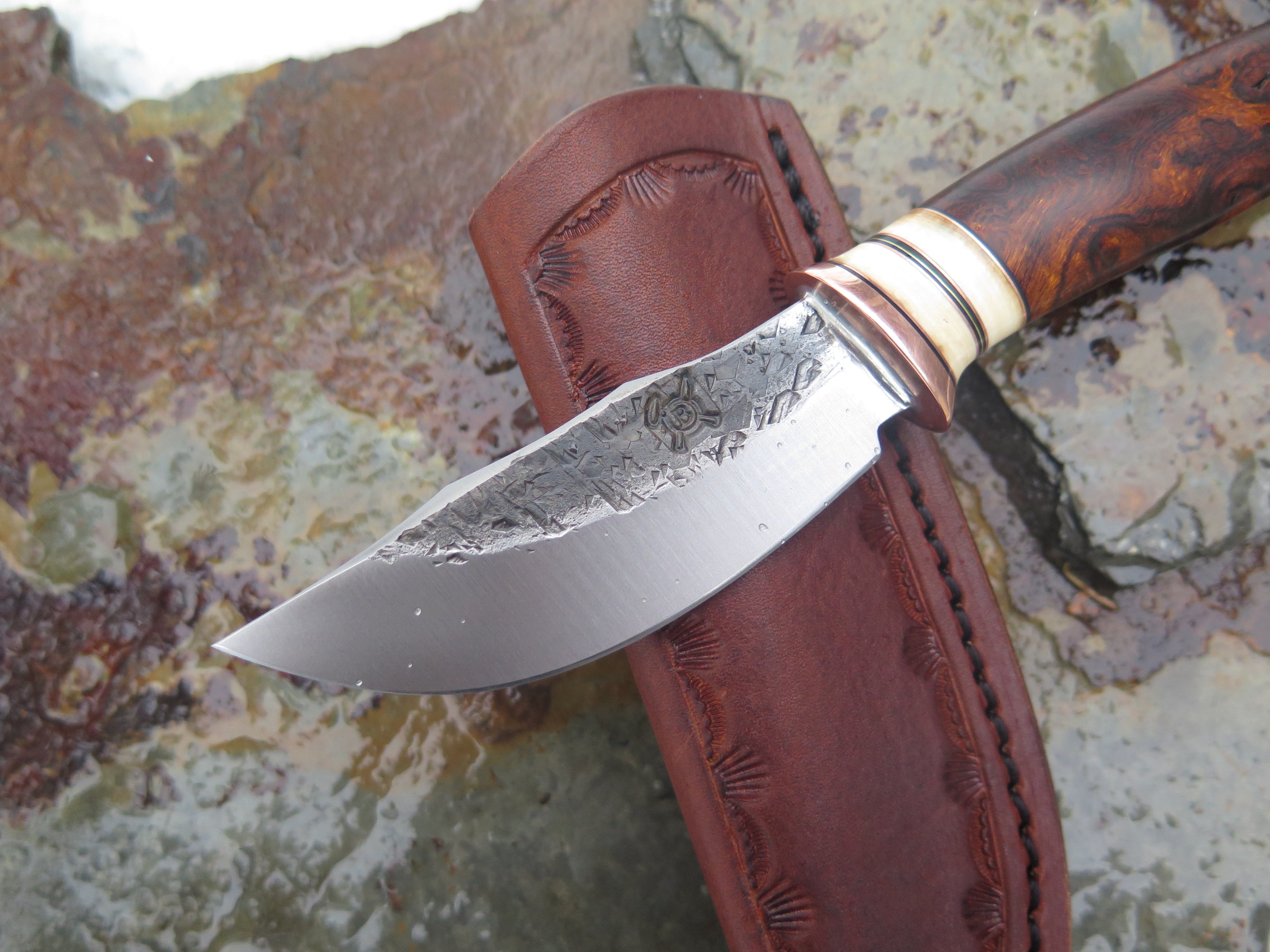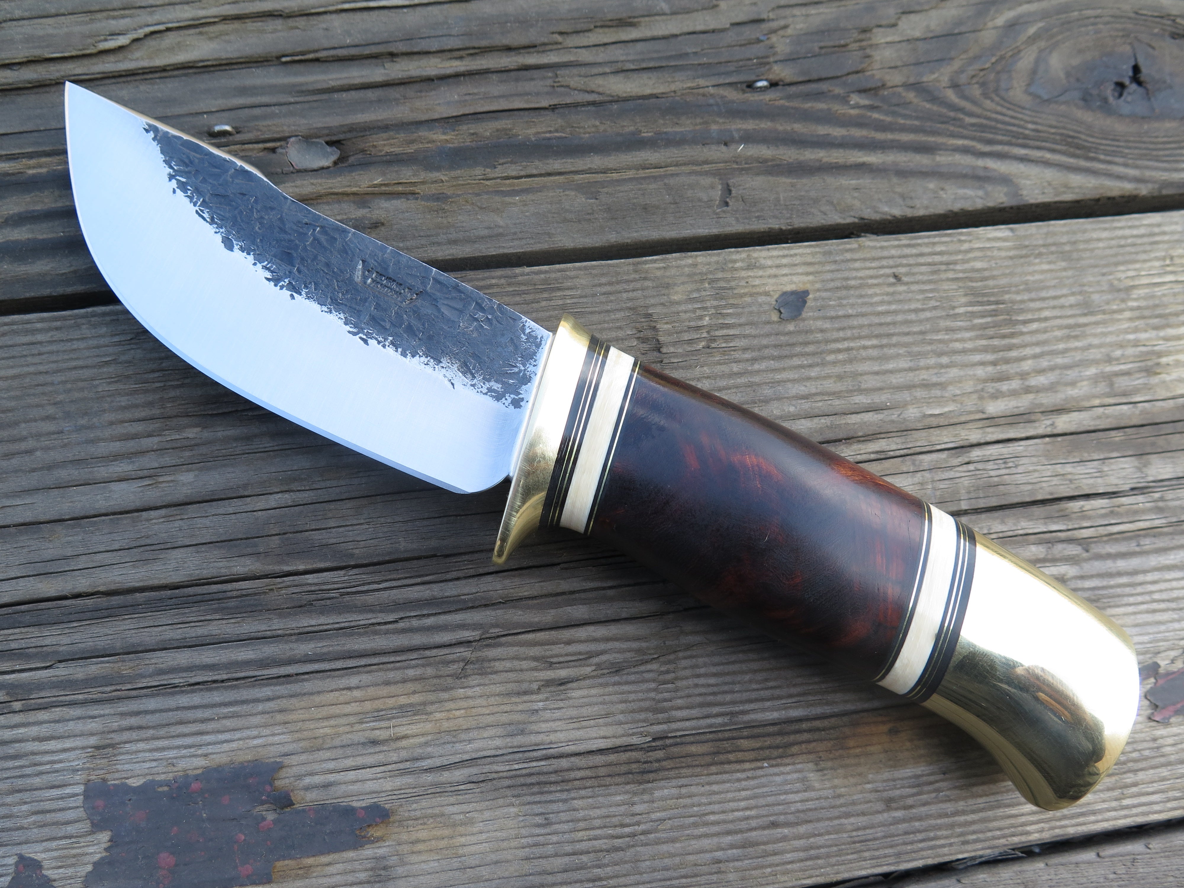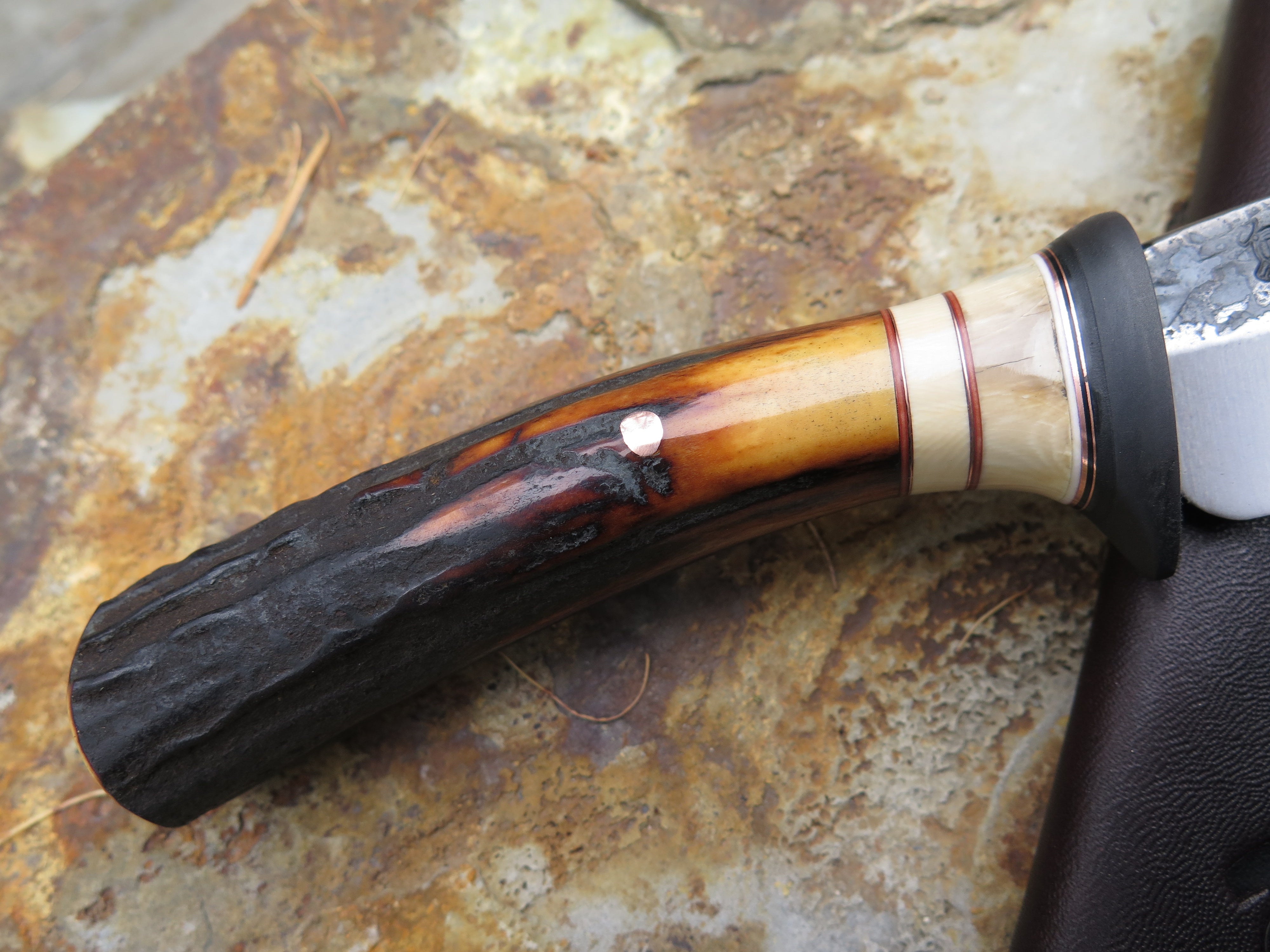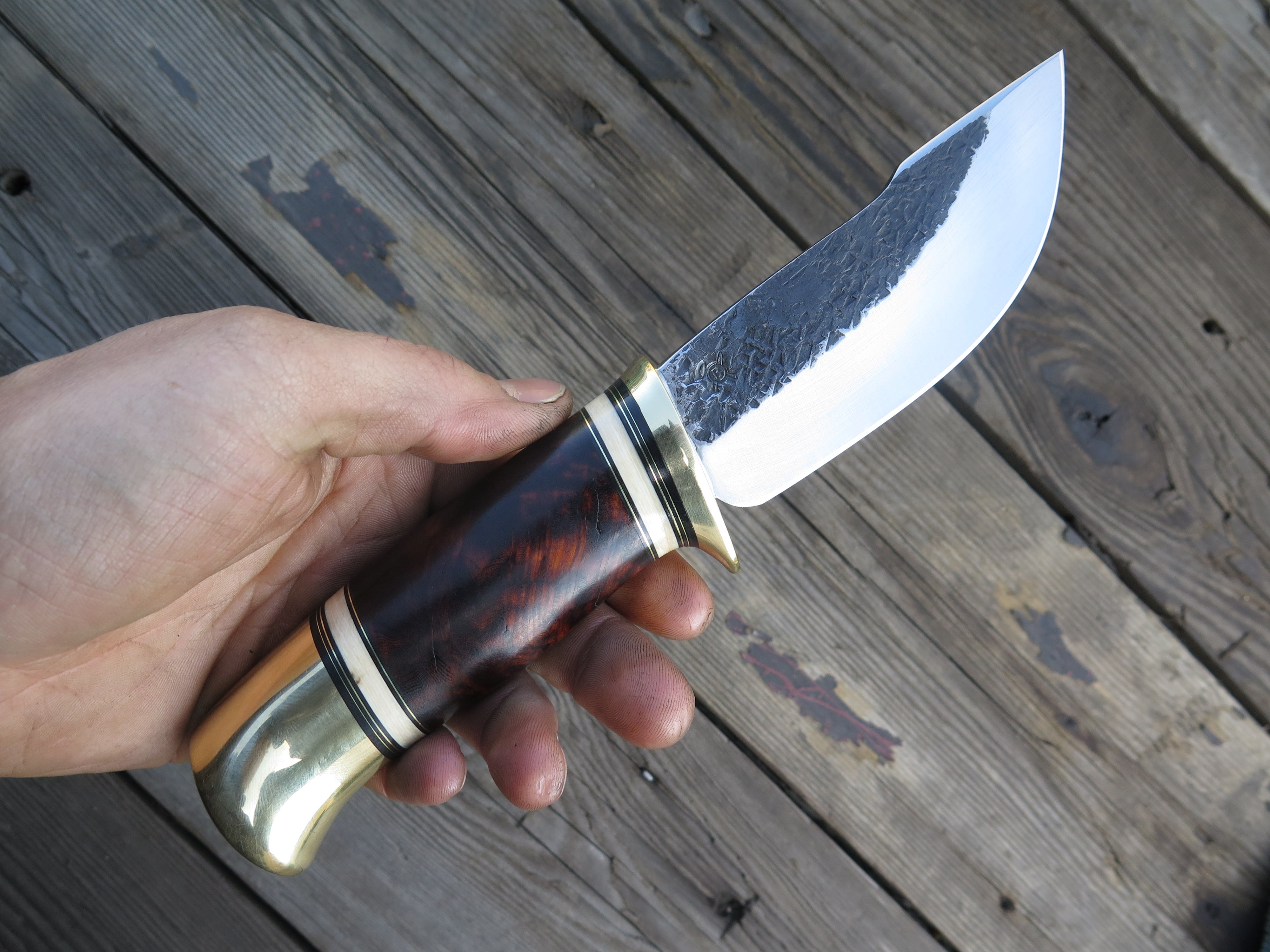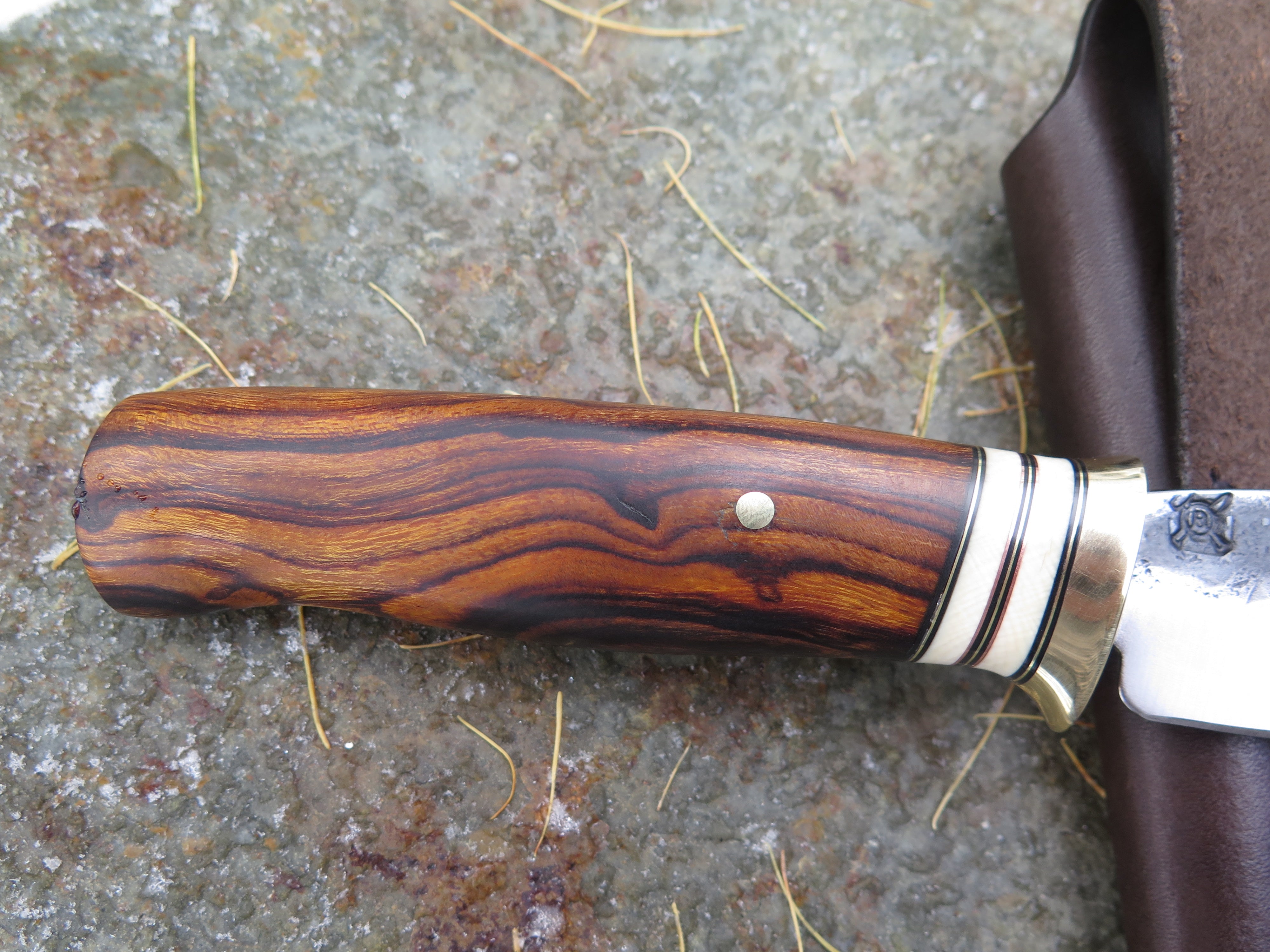 This beautiful new Sharptail from Behring Made© is hand forged from 1/8" thick high carbon 01 tool steel and measures 3 1/4" from tip to guard with a razor sharp hollow grind and our hammermark finish. The brass guard is soldered in place above black, brass, copper and two ancient mammoth ivory spacers as well as a premium desert ironwood handle that is pinned through the tang with brass. The overall length measures 7" and it comes in the shown leather belt pouch sheath, though substitutions are available upon request.