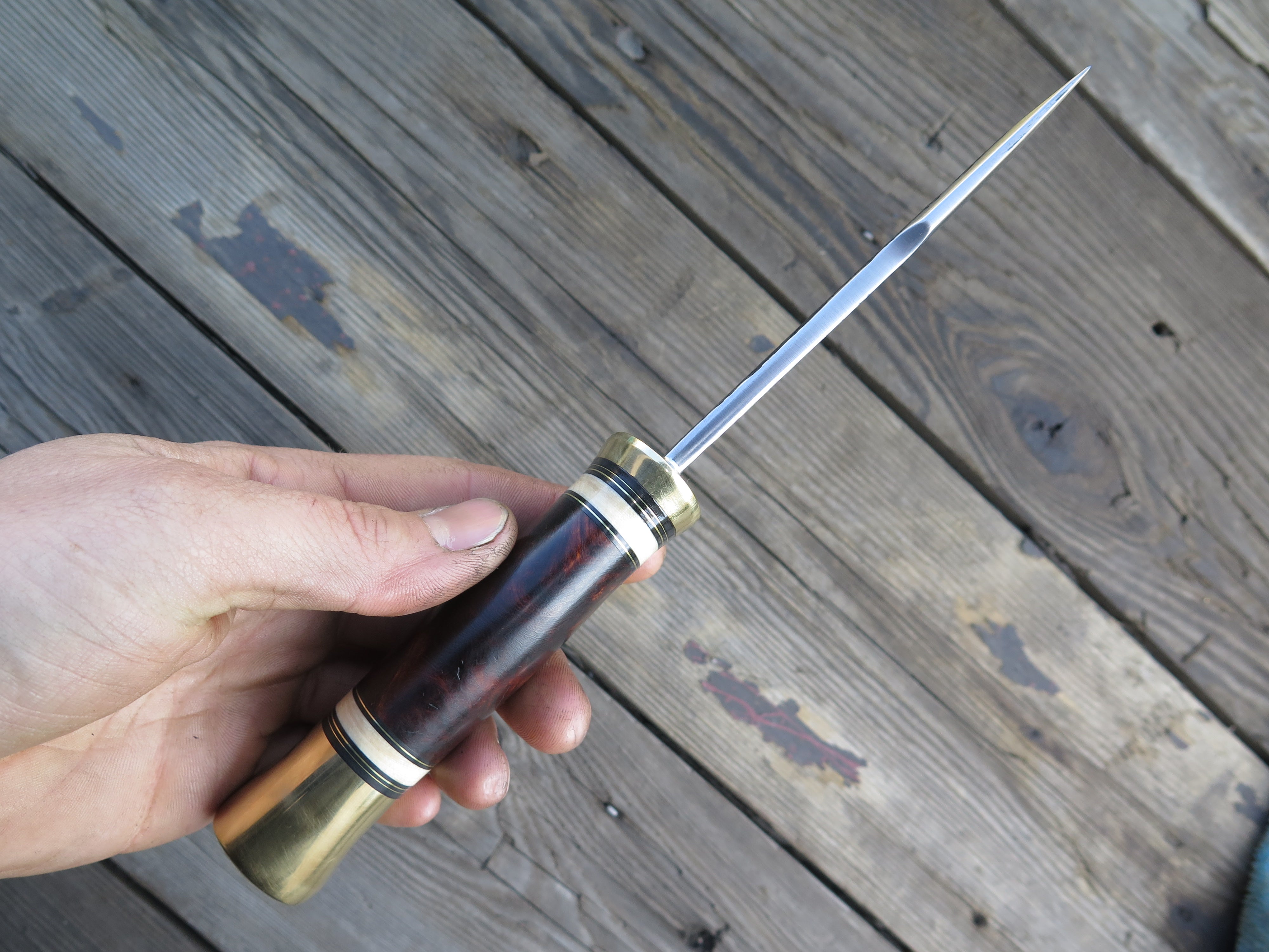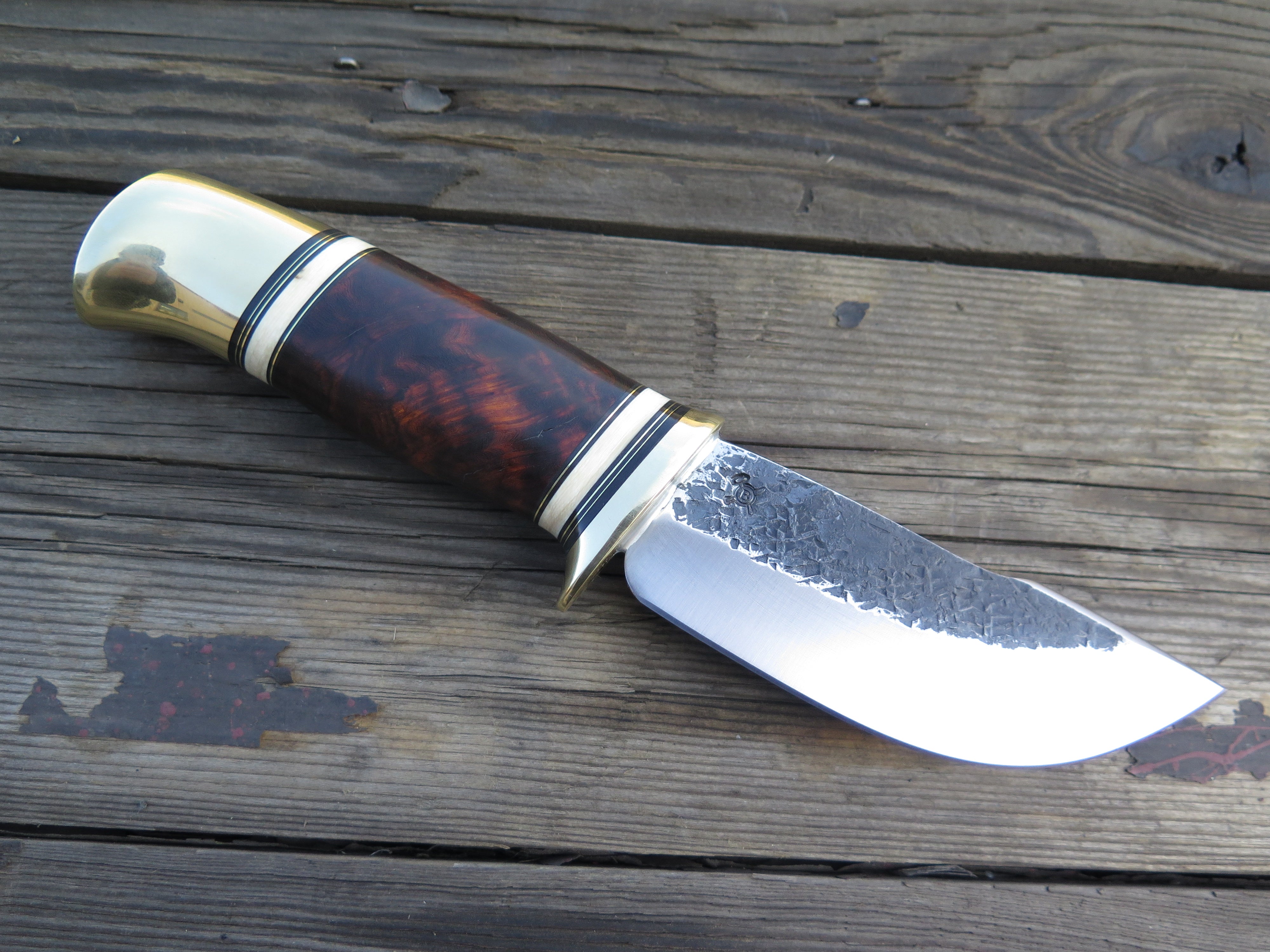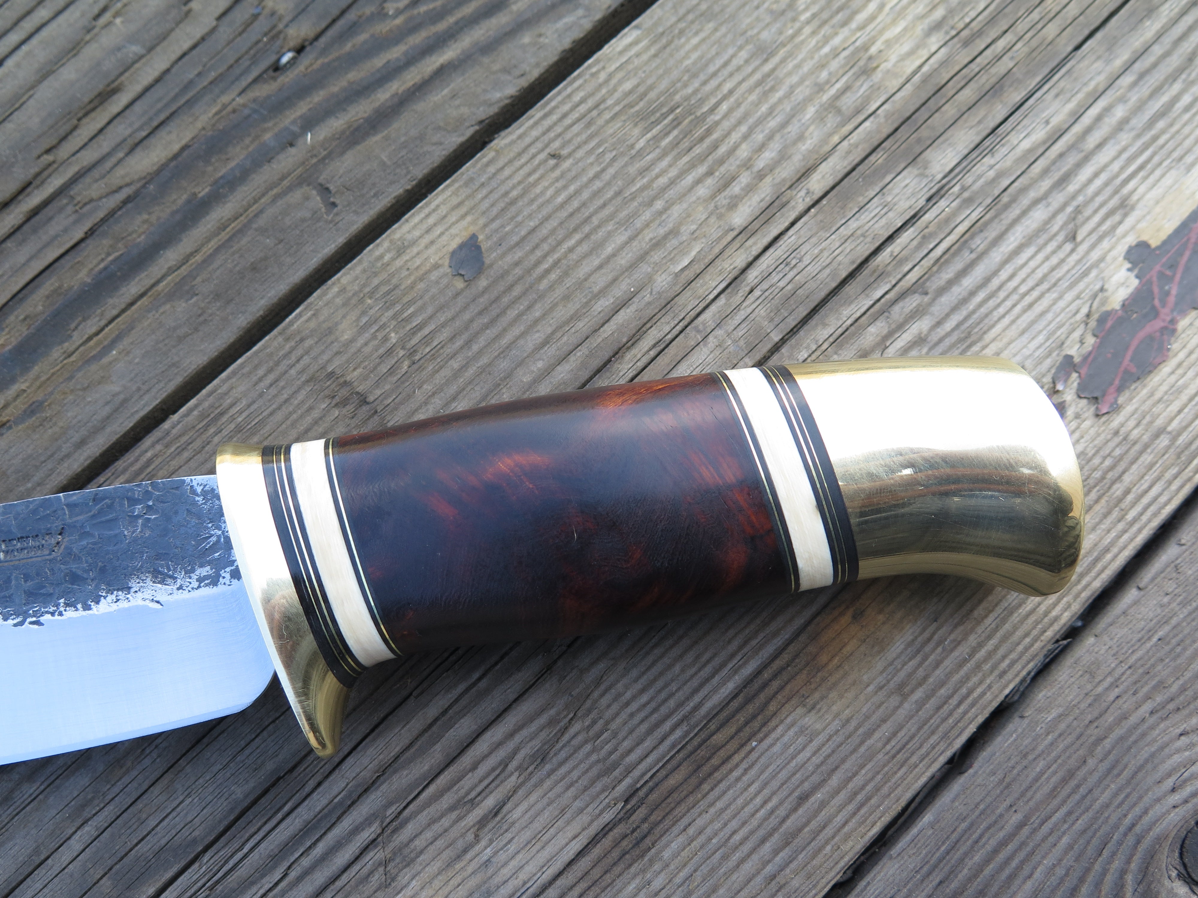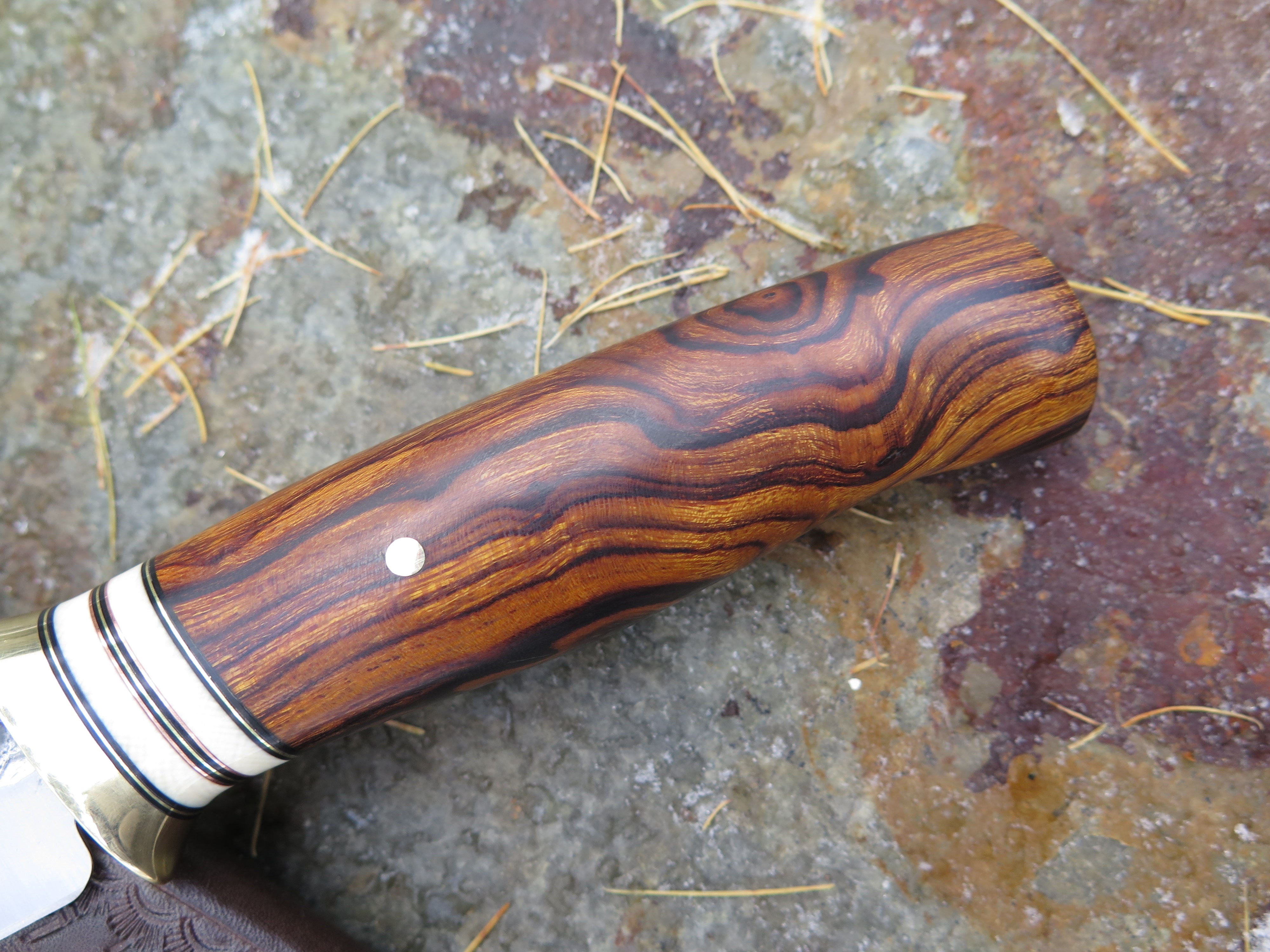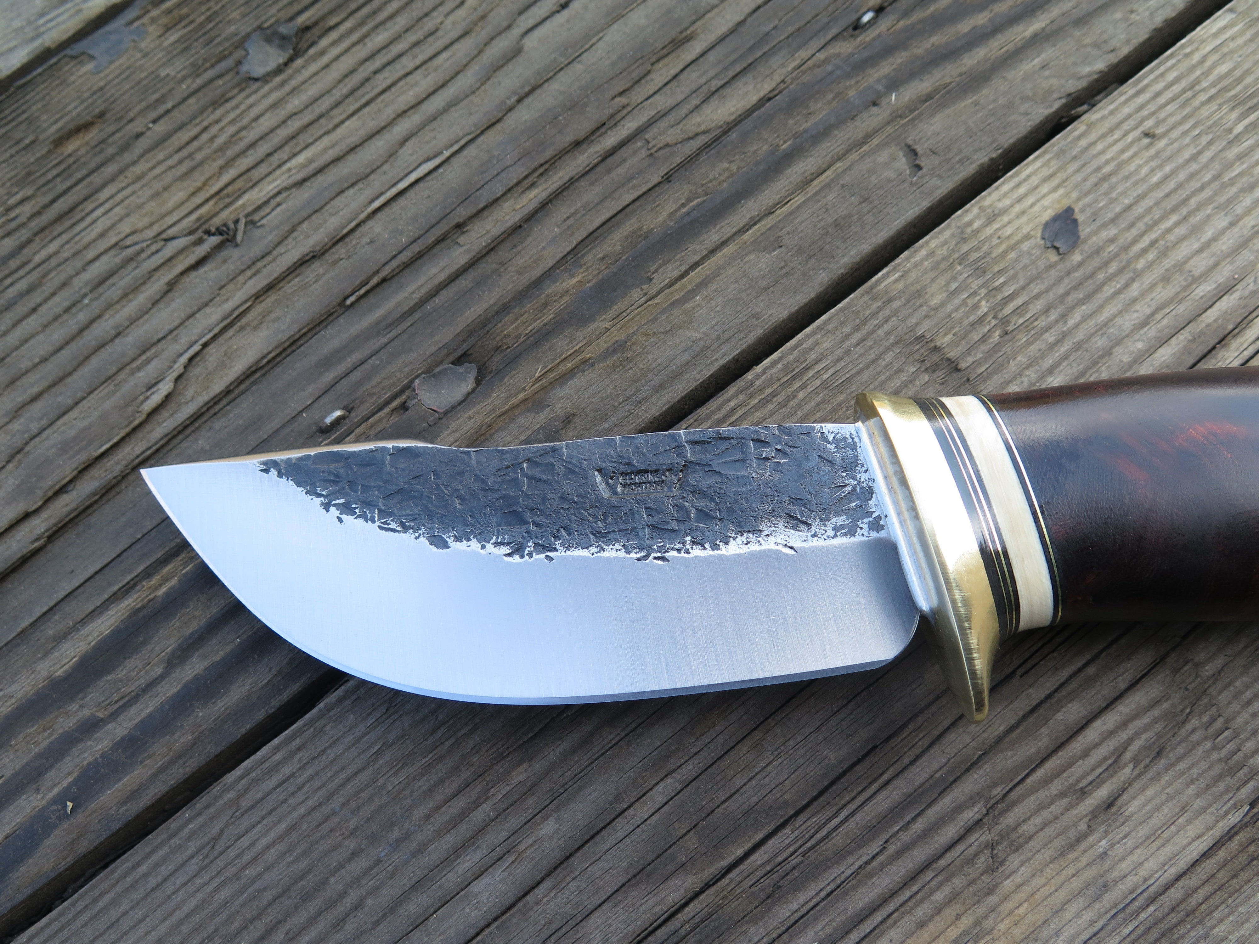 This beautiful new Sharptail from Behring Made© is hand forged from 1/8" thick high carbon 01 tool steel and measures 3 1/4" from tip to guard with a razor sharp hollow grind and our hammermark finish. The brass guard is soldered in place above black, brass, copper and two ancient mammoth ivory spacers as well as a premium desert ironwood handle that is pinned through the tang with brass. The overall length measures 7" and it comes in the shown leather belt pouch sheath, though substitutions are available upon request.