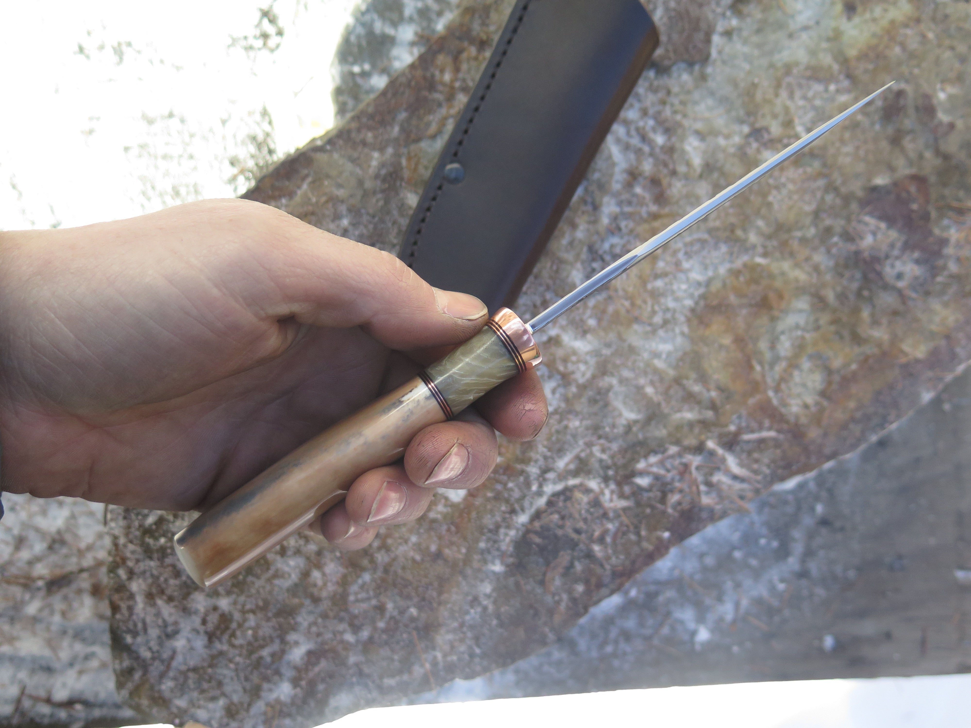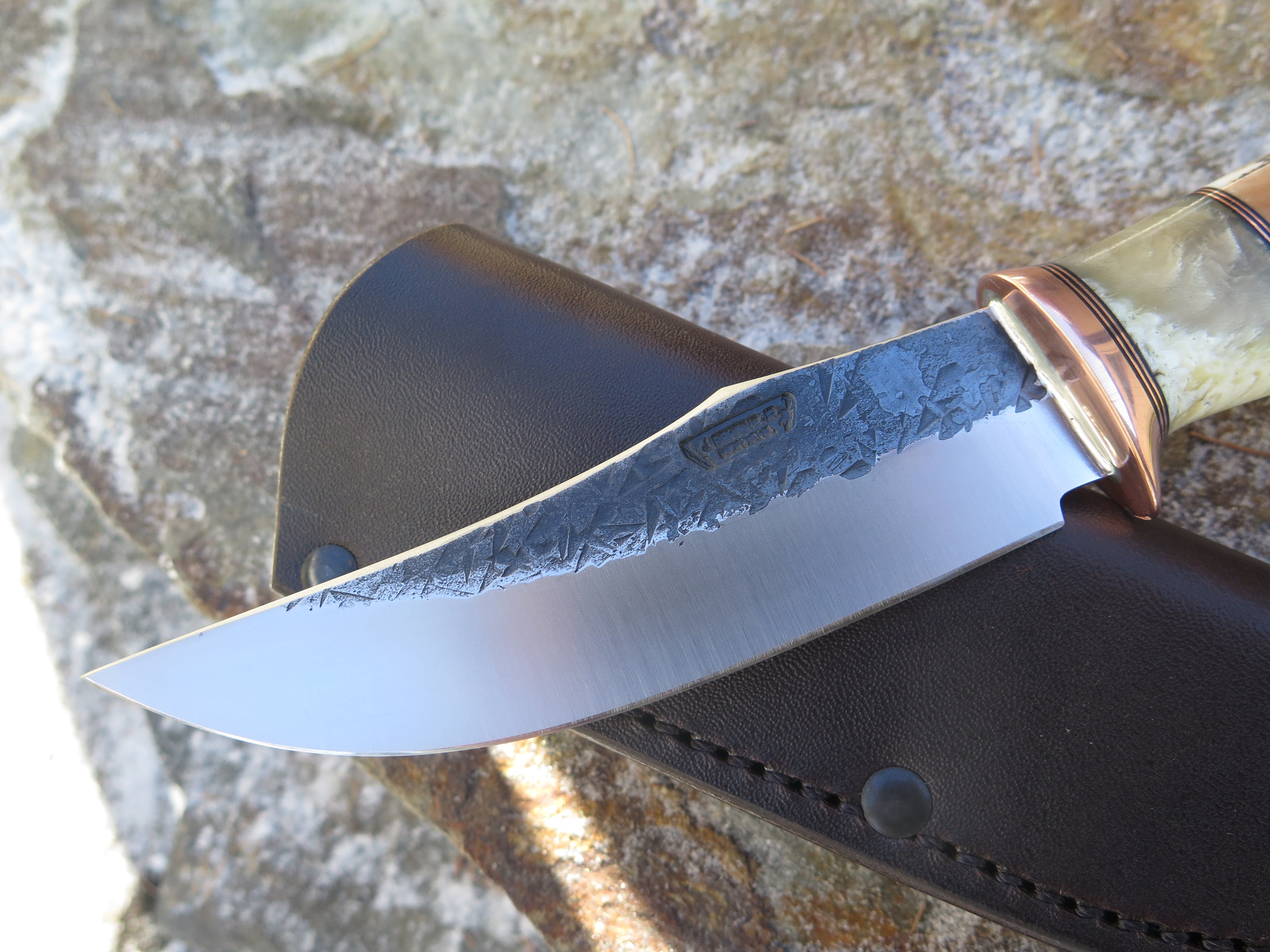 This beautiful new Trout & Bird from Behring Made© is hand forged from 1/8" thick high carbon 01 tool steel and it measures 4 1/2" from tip to guard with a razor sharp hollow grind and our hammermark finish. The copper guard is soldered in place above black fiber and copper spacers with a high figure musk ox boss accent above the premium fossil walrus ivory handle. The overall length measures 9" and it comes in a classic leather belt pouch sheath.