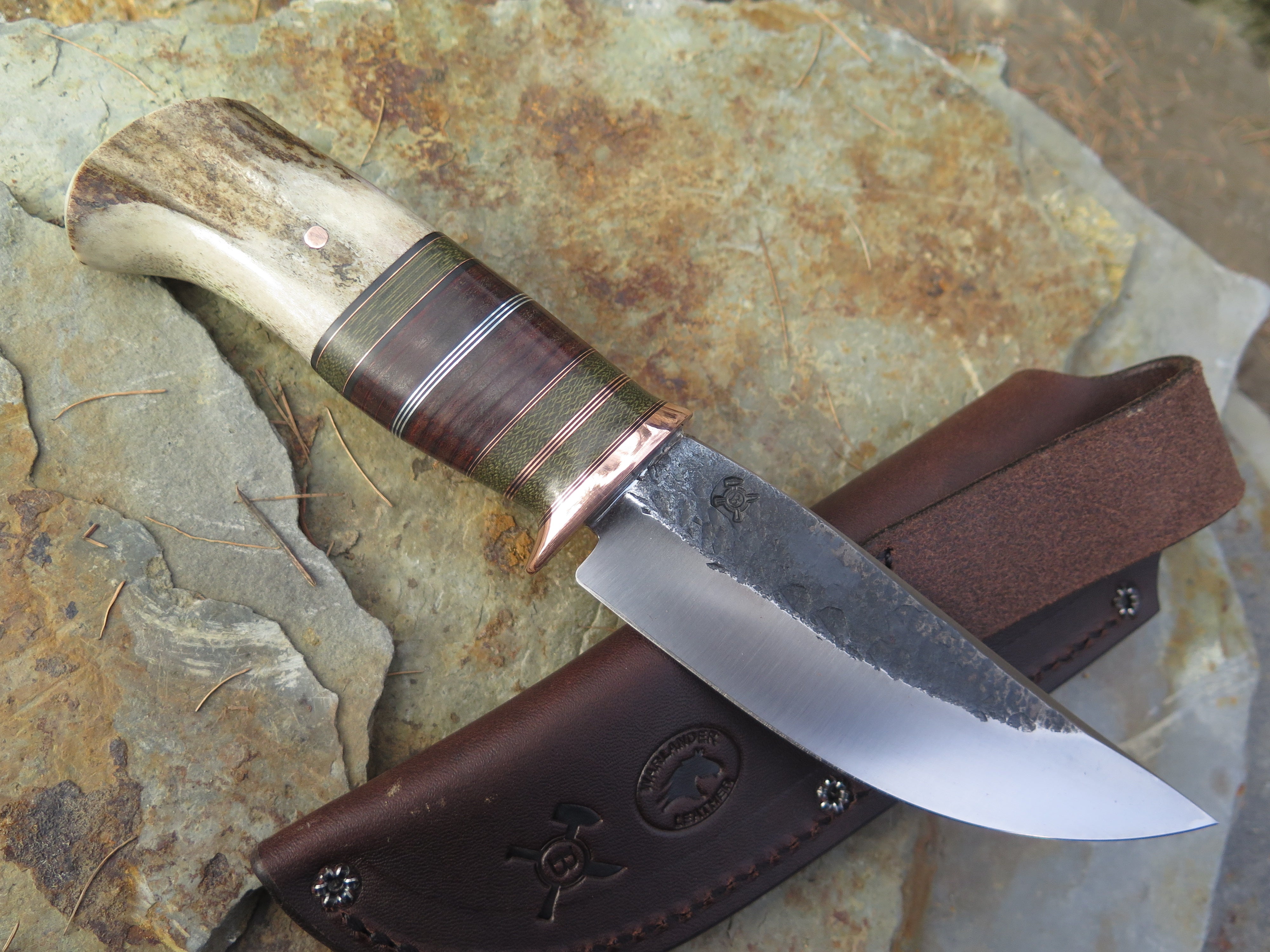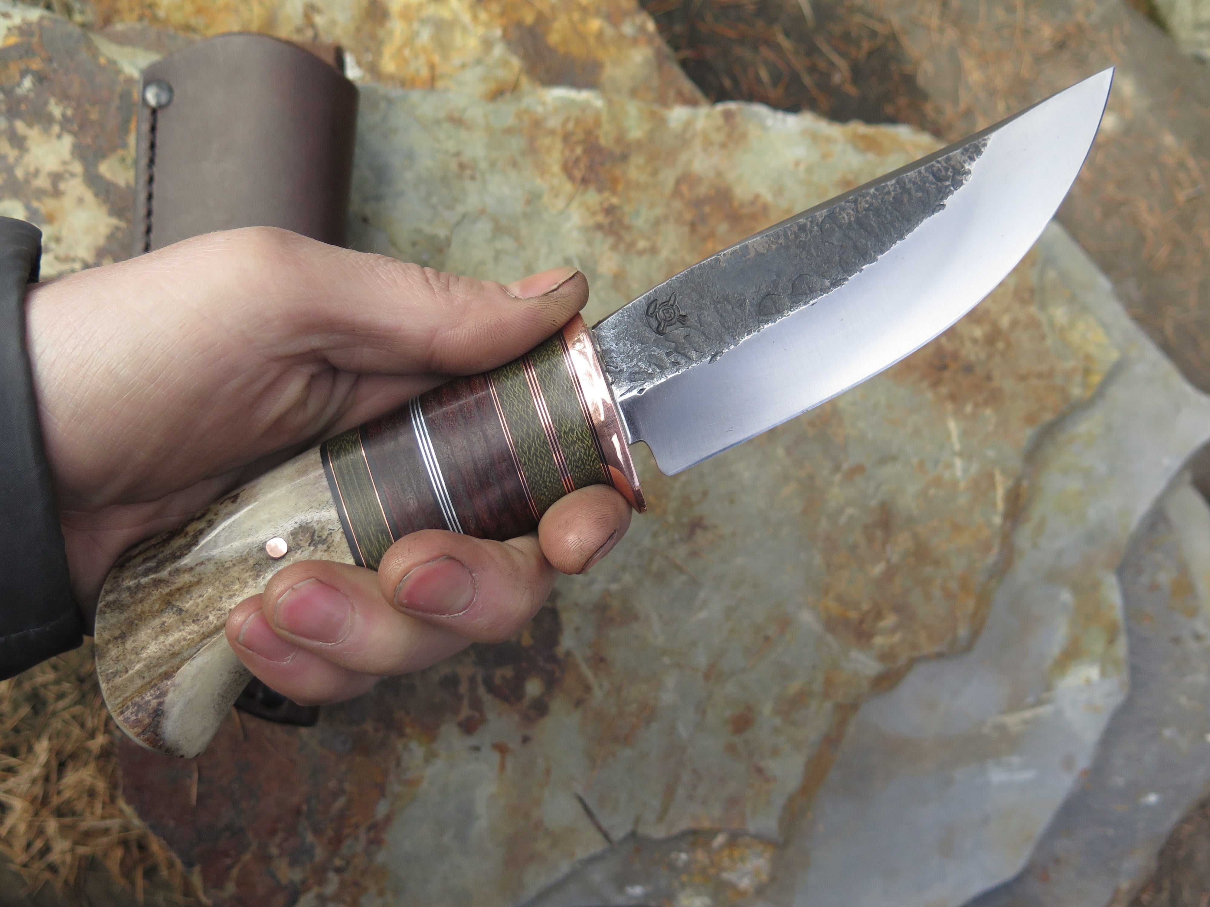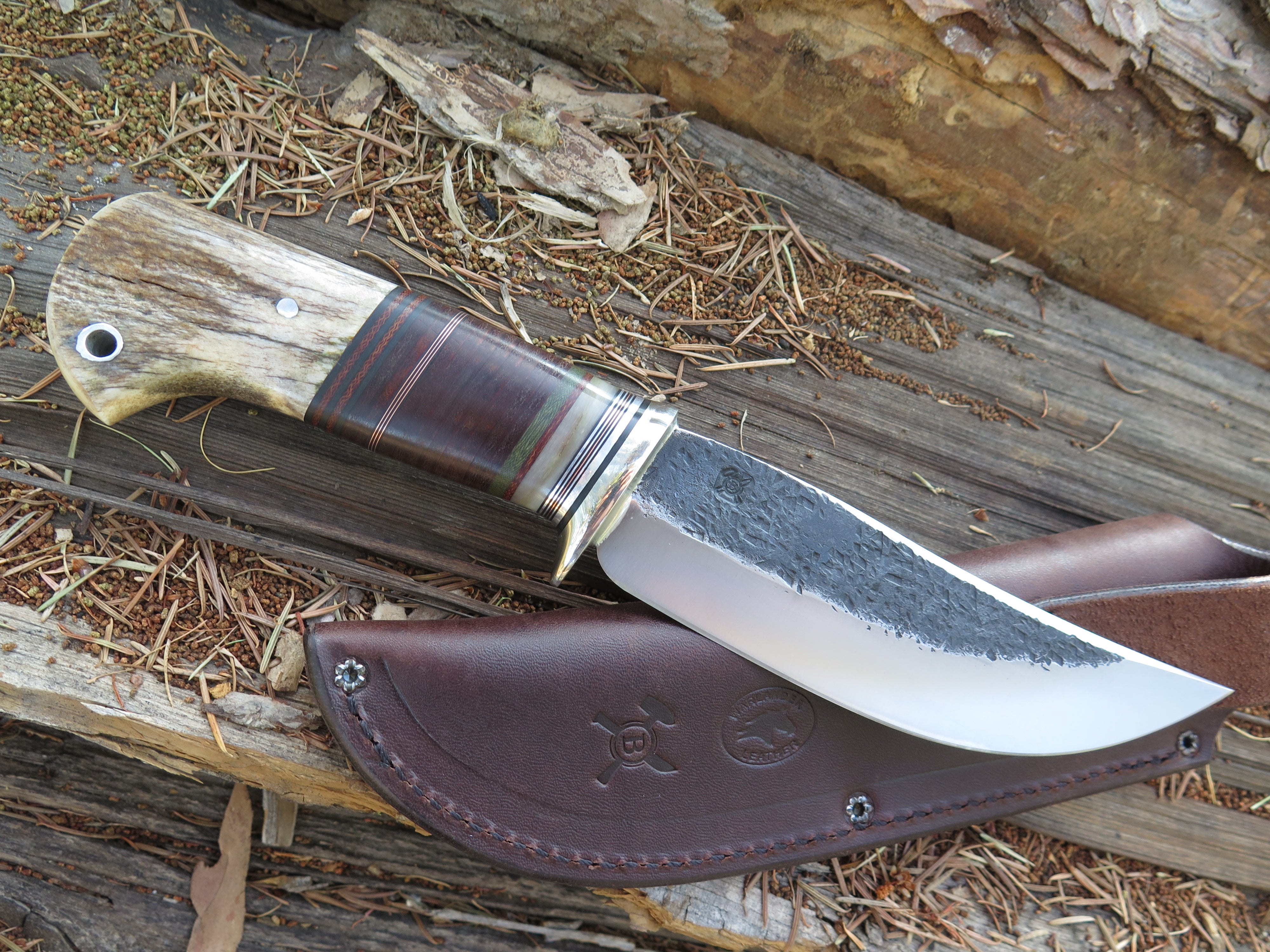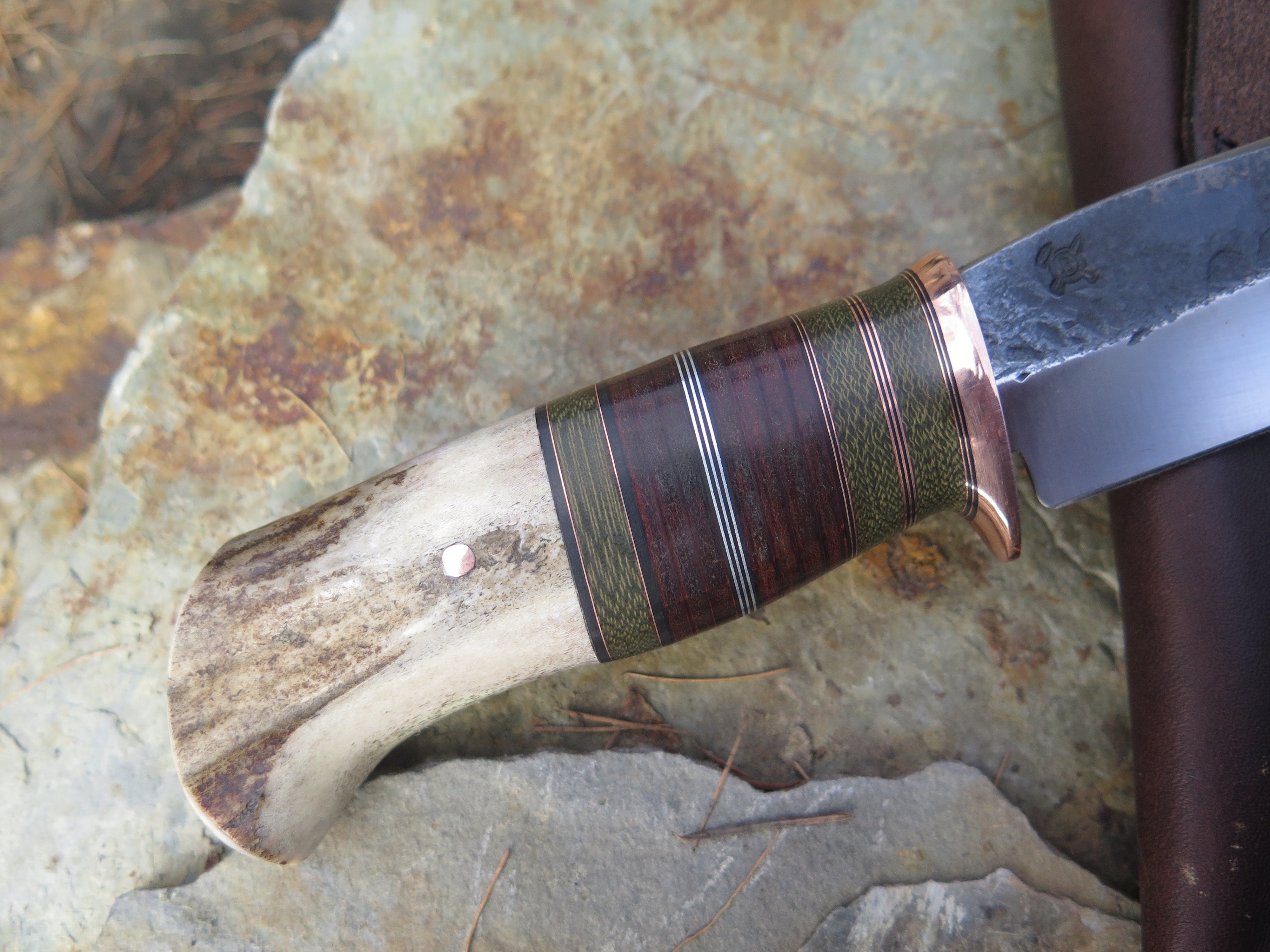 This incredible new XL Hunter from Behring Made© is hand forged from 13/64" thick 5160 spring steel and it measures a whopping 6" from tip to guard with a razor sharp hollow grind and our hammermark finish. The nickel silver guard is soldered in place above black fiber, green micarta, horsehide leather, musk ox, aluminum, copper and brown micarta spacers as well as a shiras moose paddle butt that's pinned and thonged with aluminum. The overall length measures 11" and it comes in a classic belt pouch sheath. You may never need another knife!