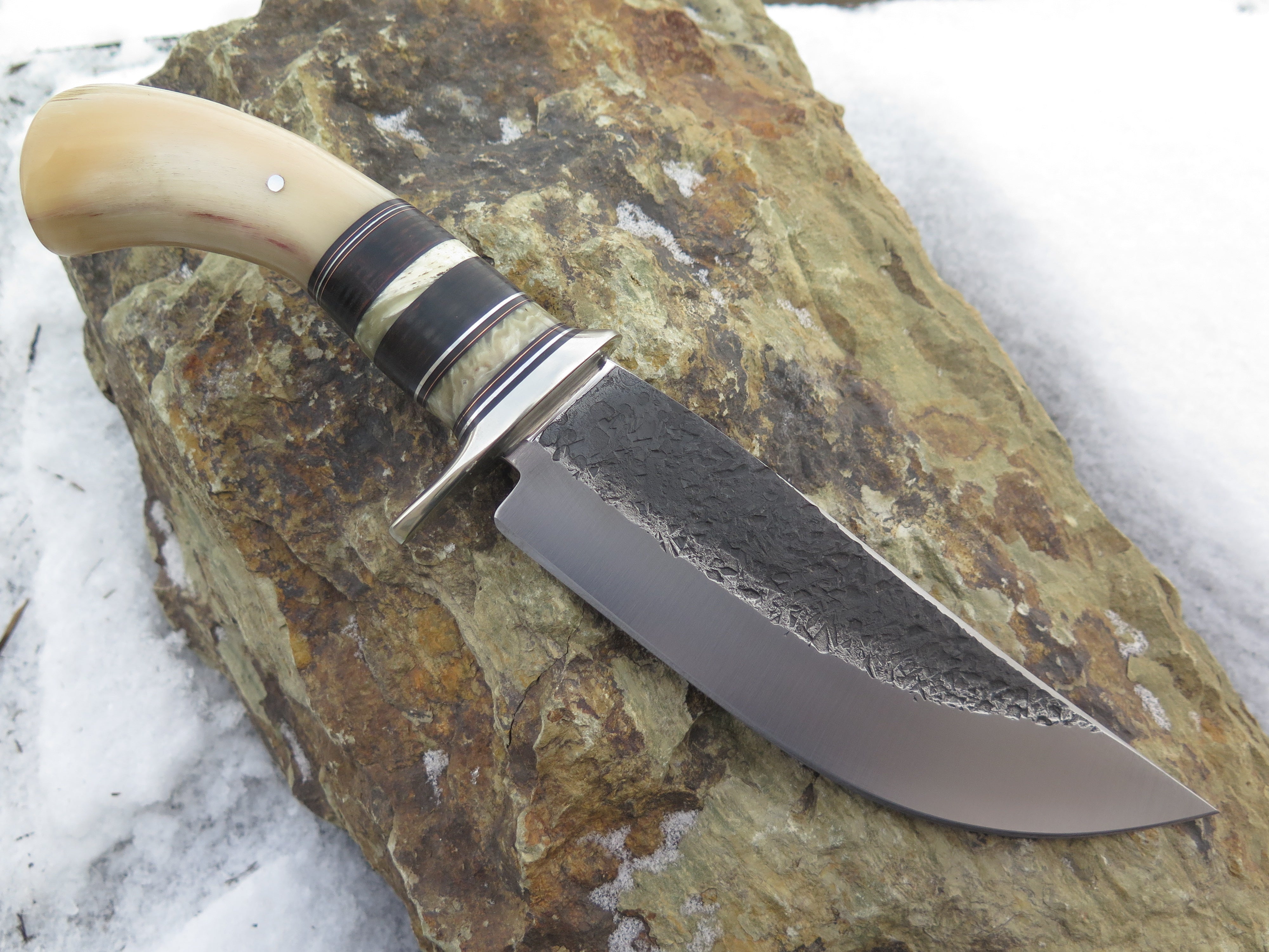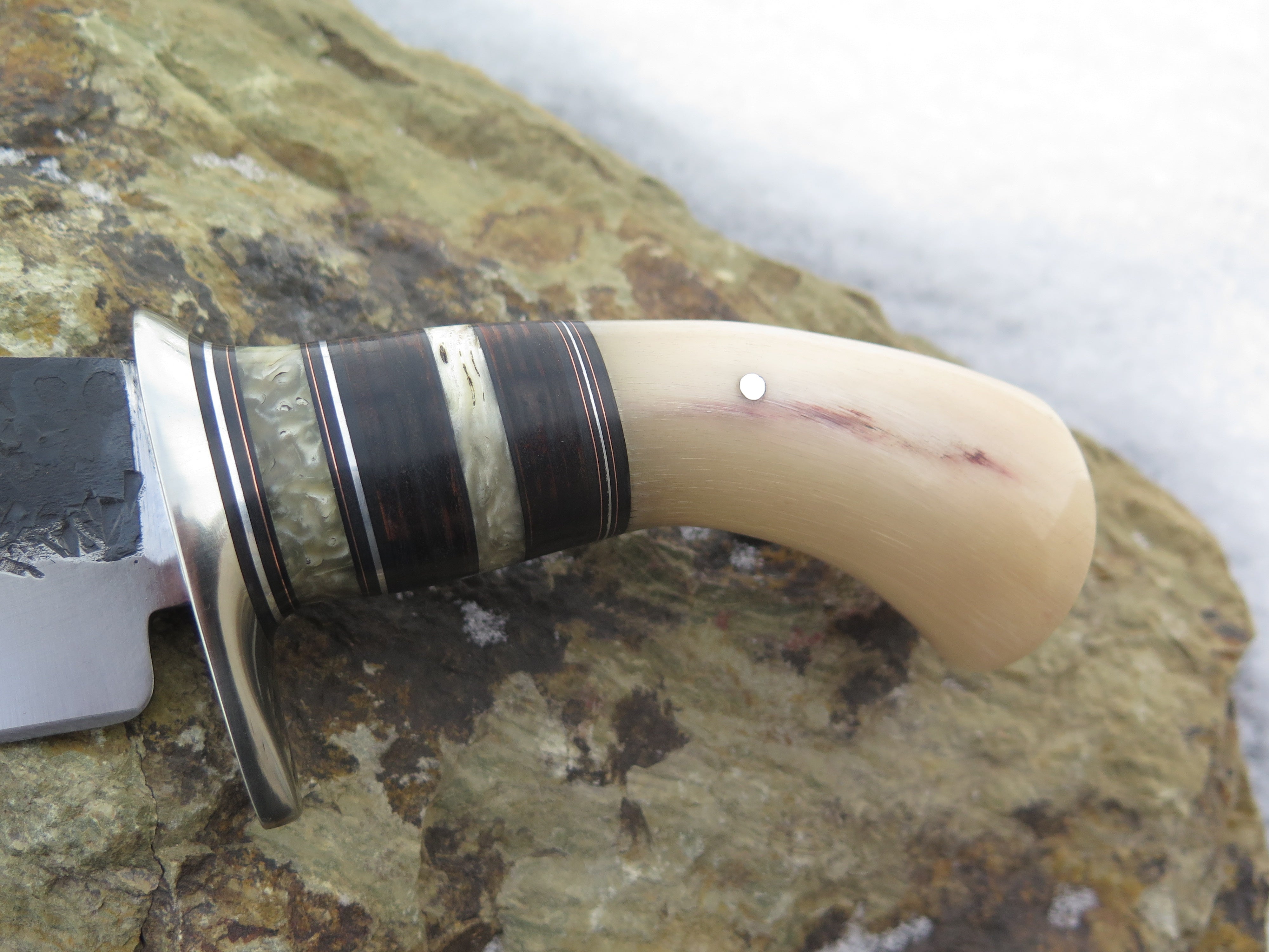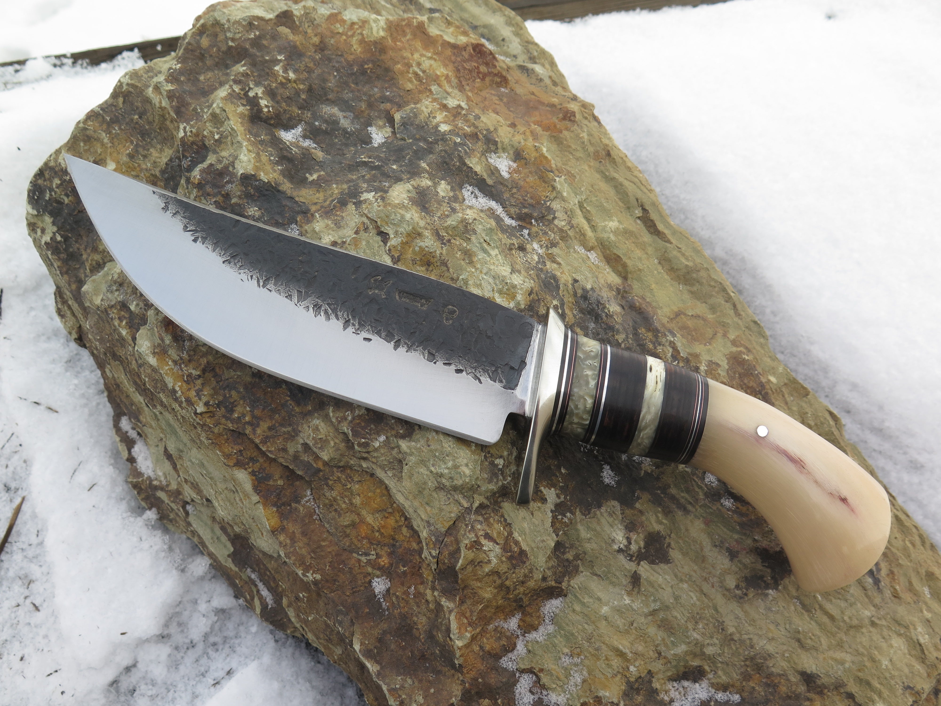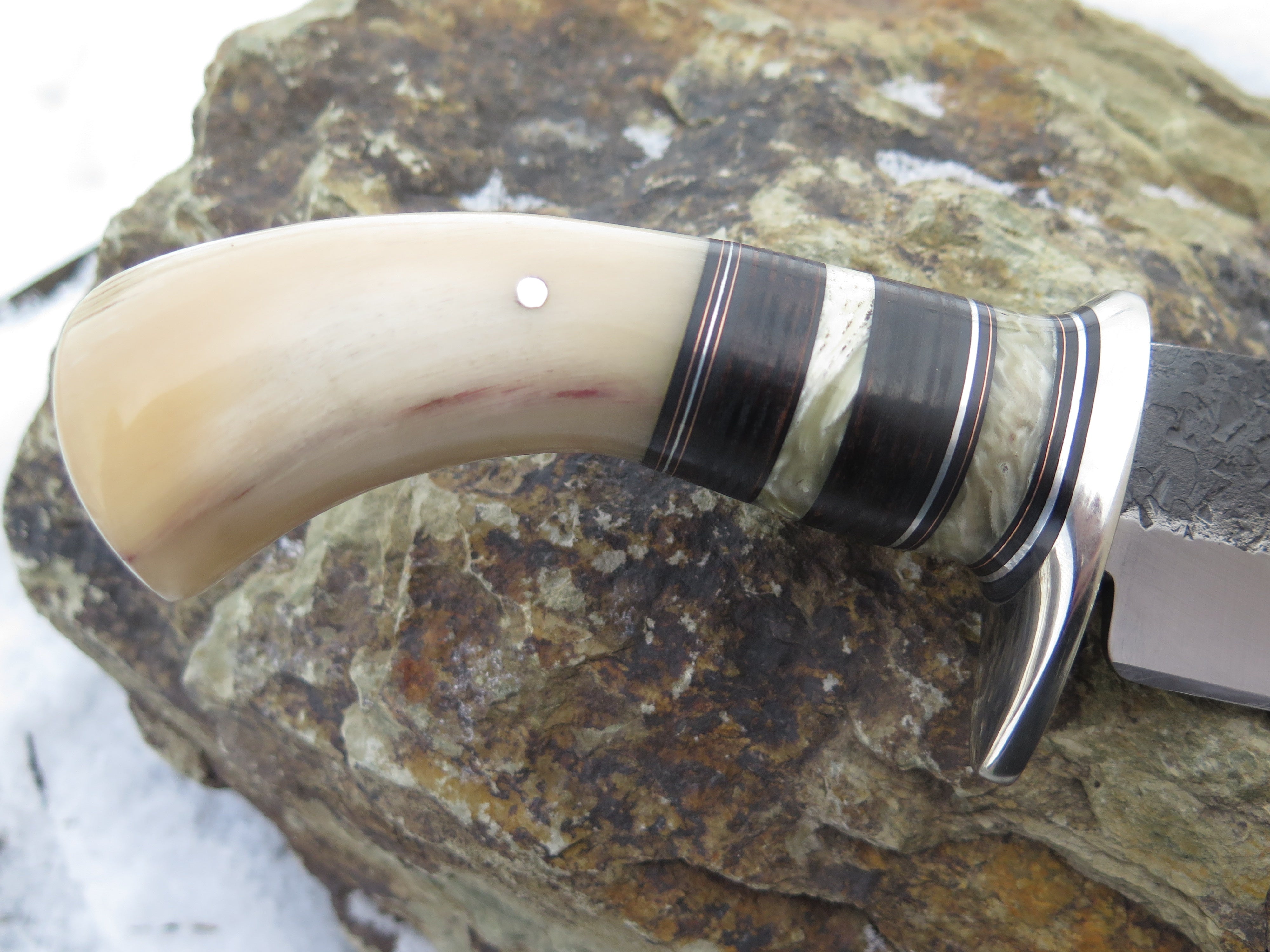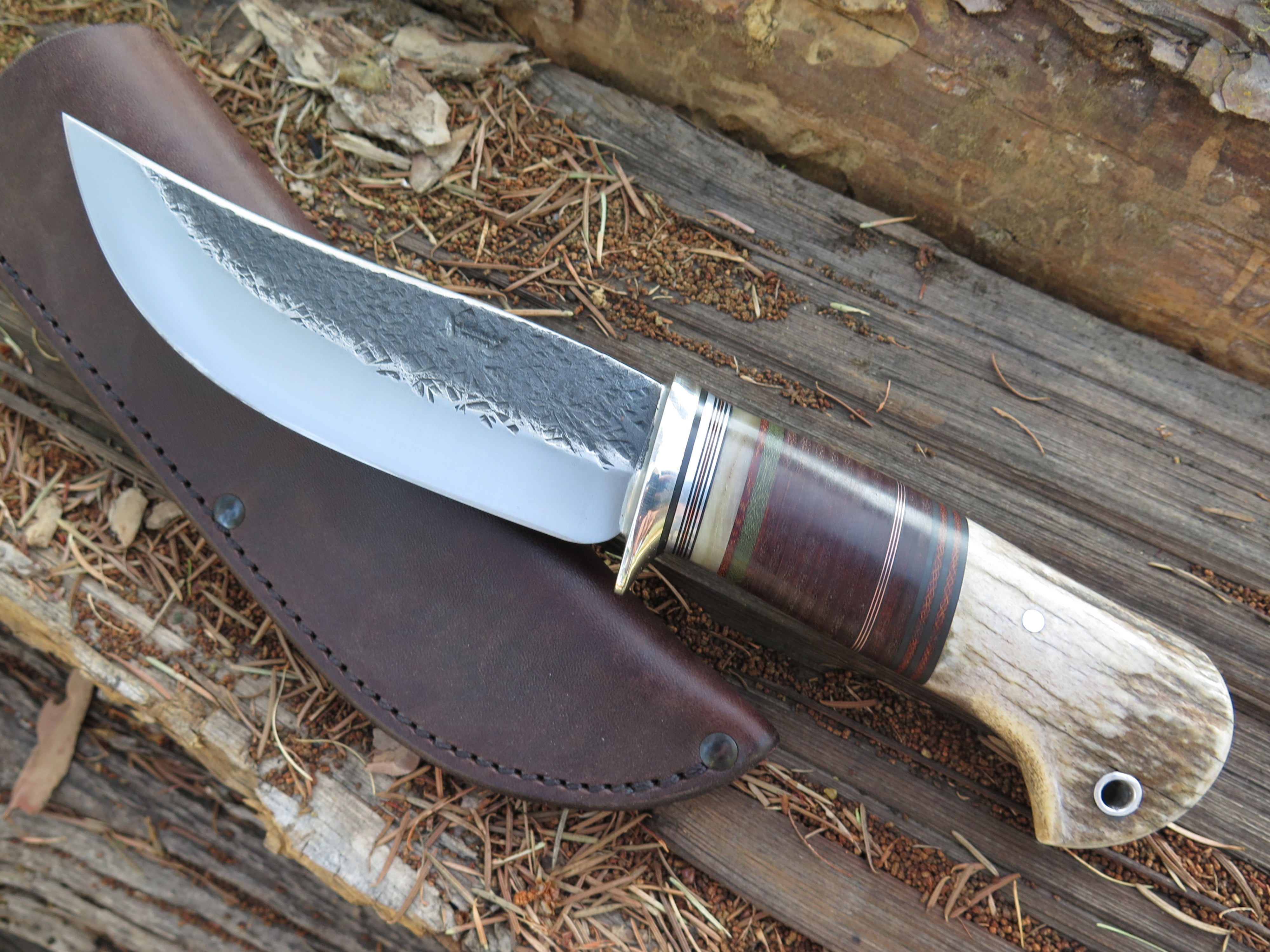 This incredible new XL Hunter from Behring Made© is hand forged from 13/64" thick 5160 spring steel and it measures a whopping 6" from tip to guard with a razor sharp hollow grind and our hammermark finish. The nickel silver guard is soldered in place above black fiber, green micarta, horsehide leather, musk ox, aluminum, copper and brown micarta spacers as well as a shiras moose paddle butt that's pinned and thonged with aluminum. The overall length measures 11" and it comes in a classic belt pouch sheath. You may never need another knife!