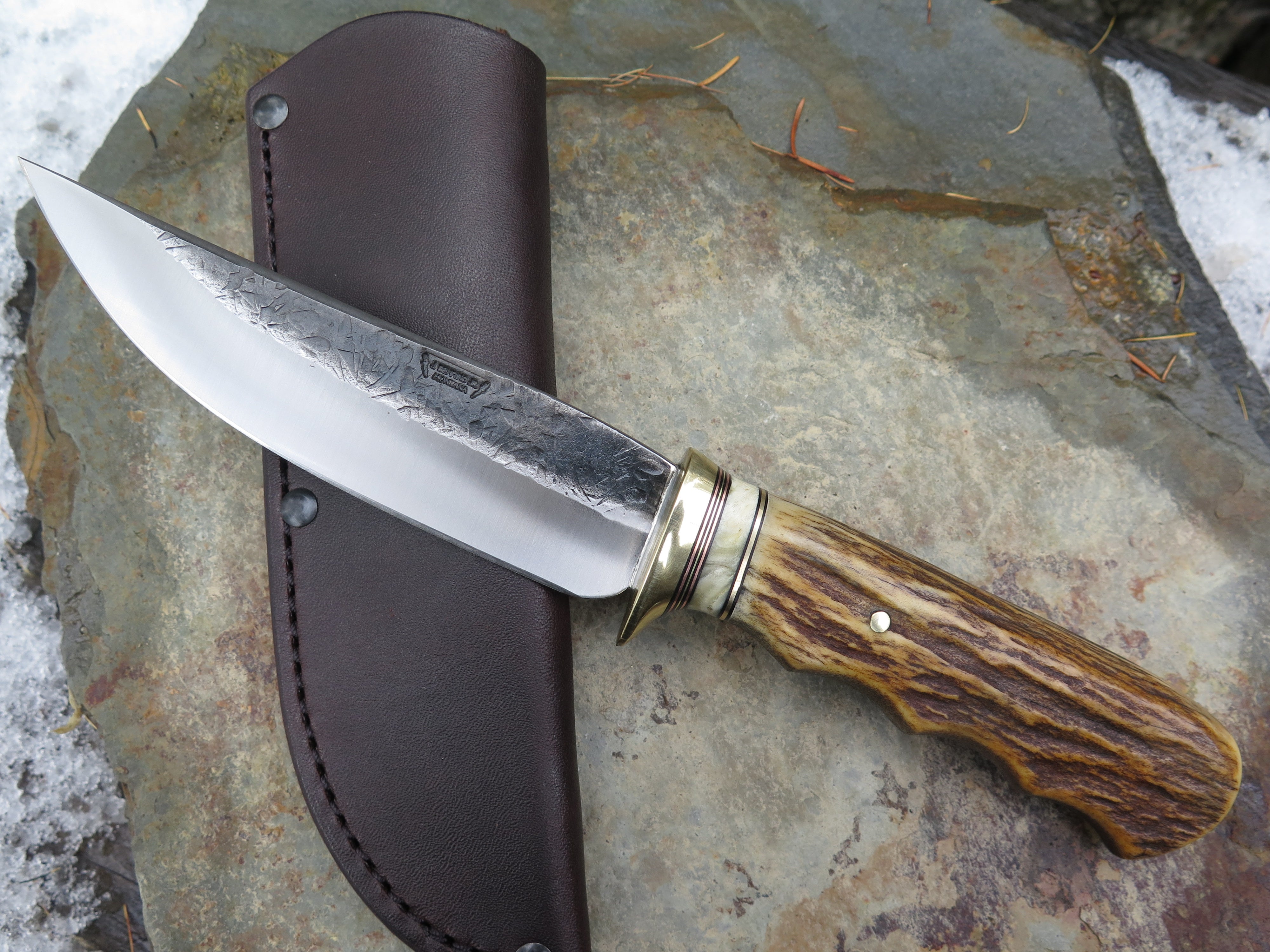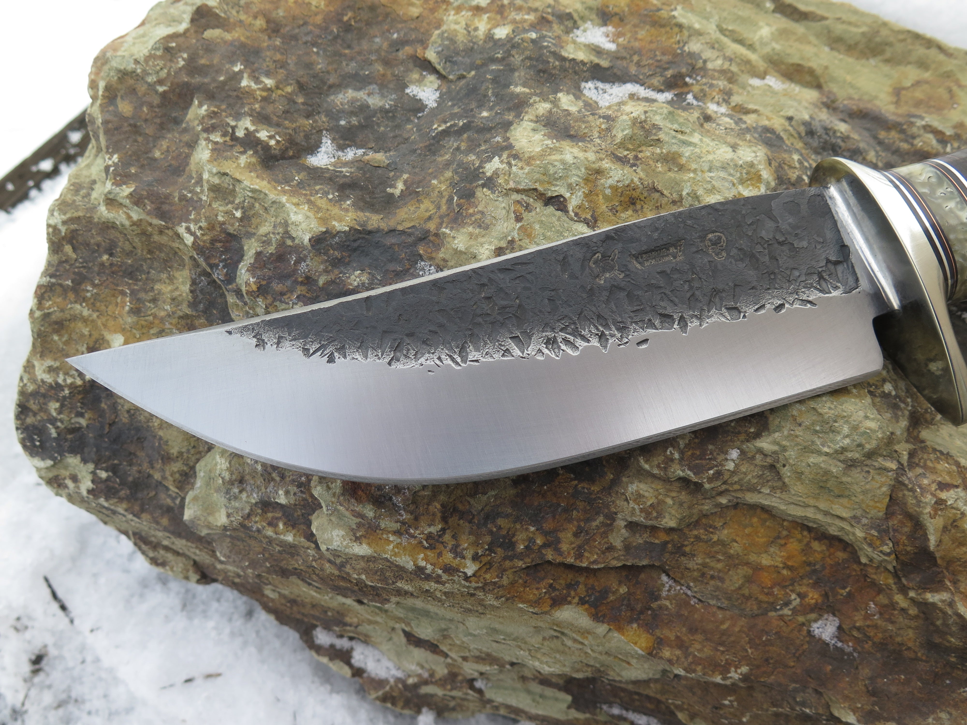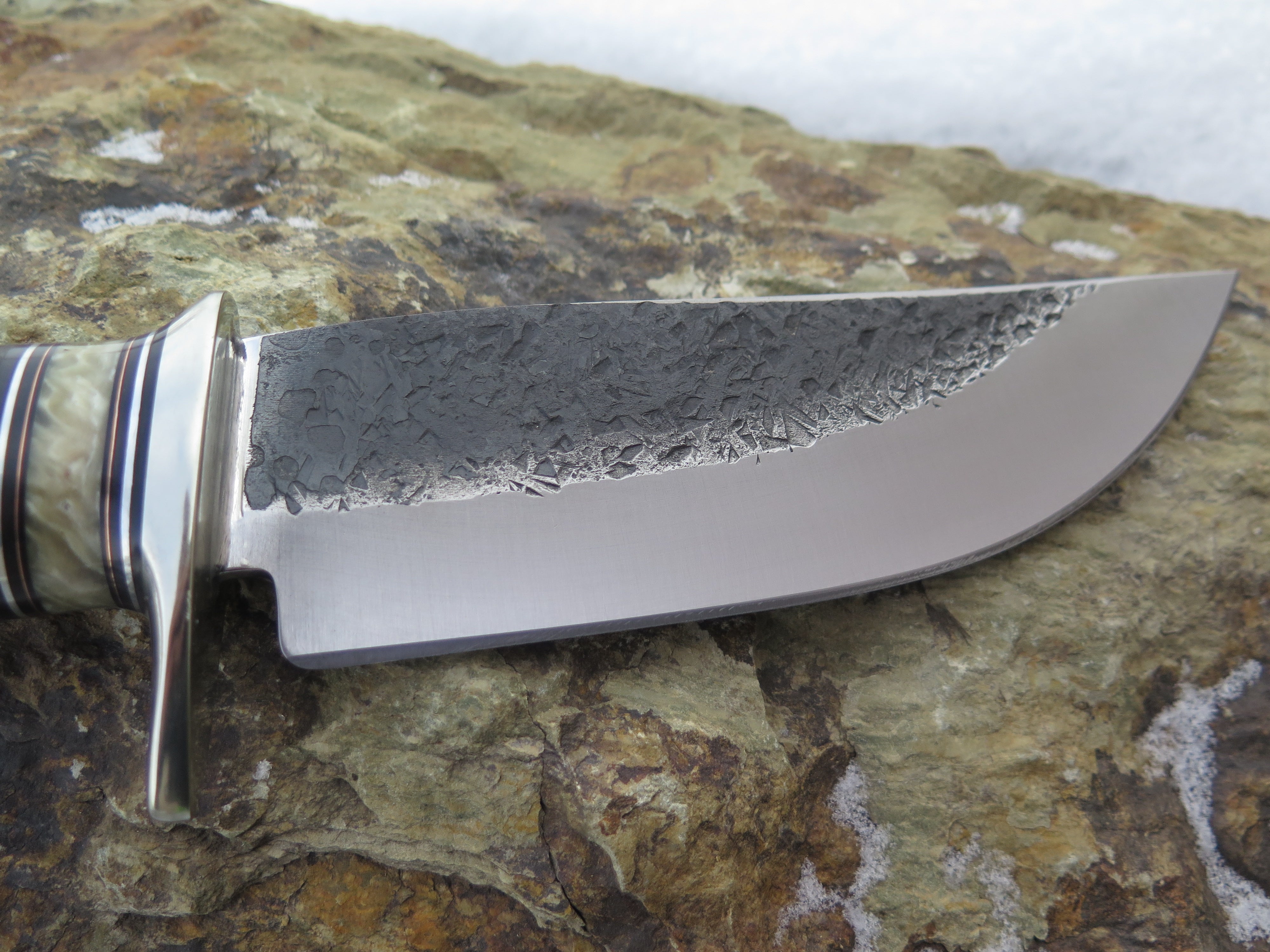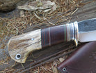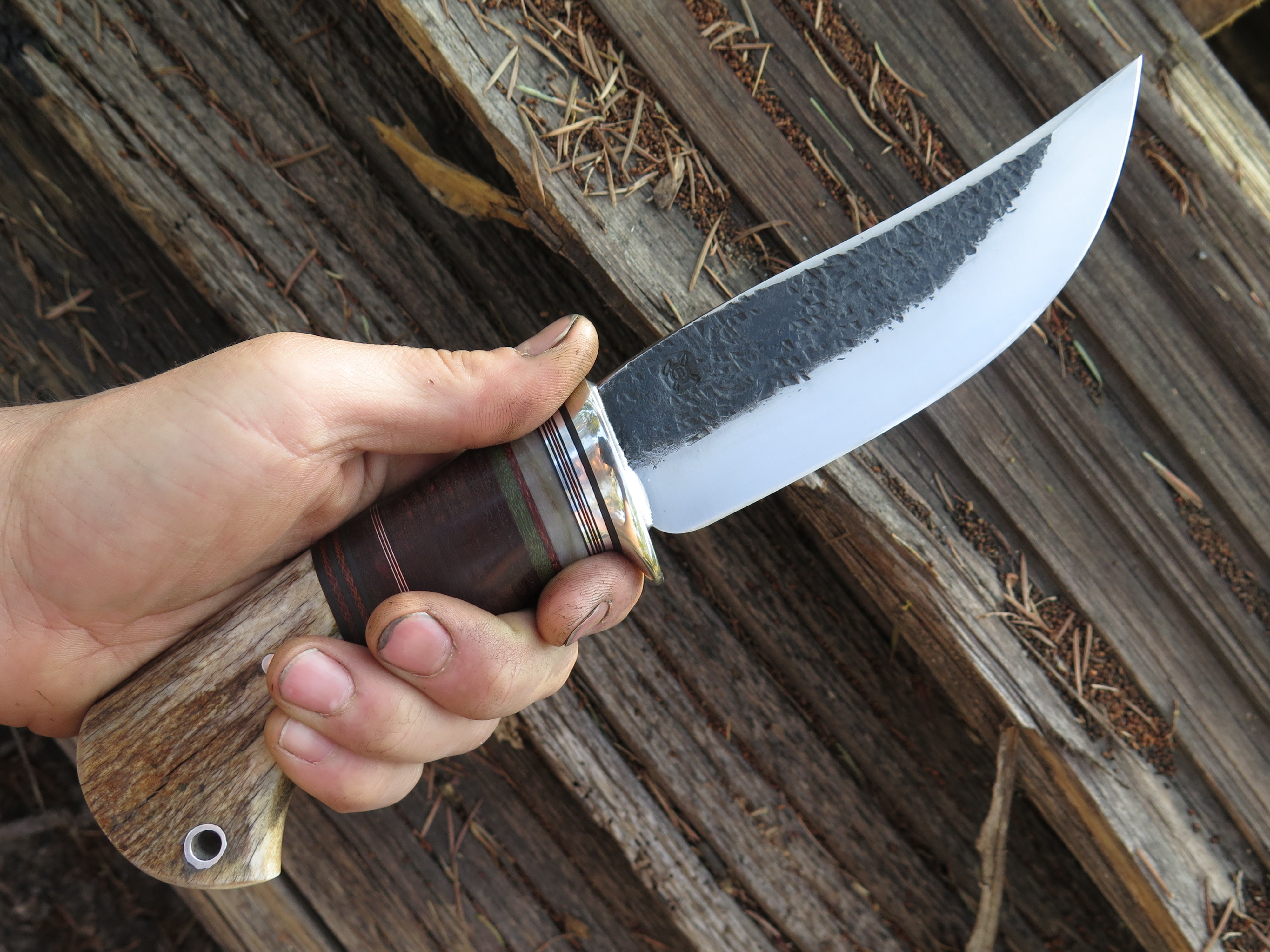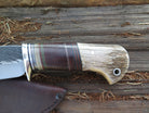 This incredible new XL Hunter from Behring Made© is hand forged from 13/64" thick 5160 spring steel and it measures a whopping 6" from tip to guard with a razor sharp hollow grind and our hammermark finish. The nickel silver guard is soldered in place above black fiber, green micarta, horsehide leather, musk ox, aluminum, copper and brown micarta spacers as well as a shiras moose paddle butt that's pinned and thonged with aluminum. The overall length measures 11" and it comes in a classic belt pouch sheath. You may never need another knife!