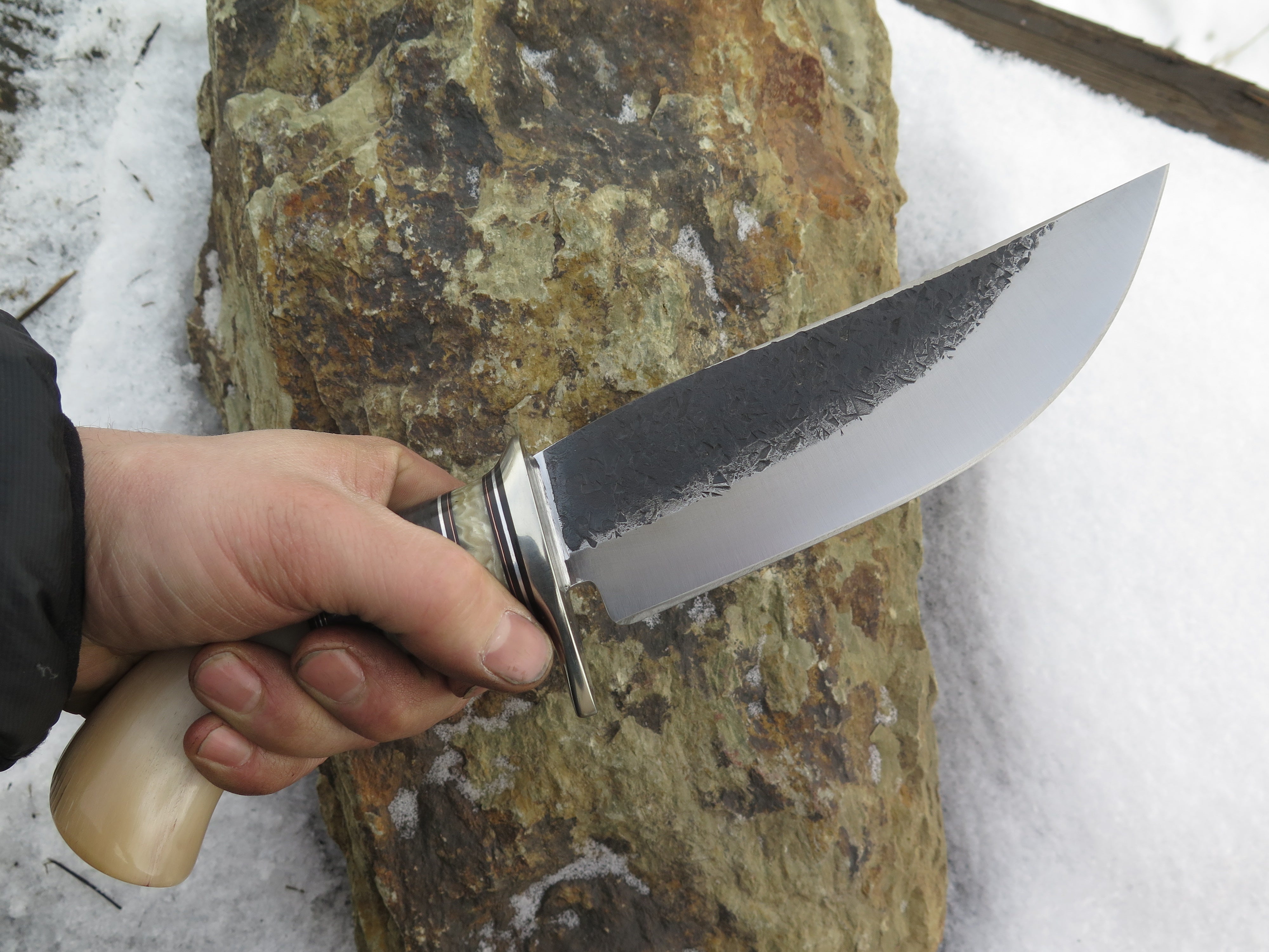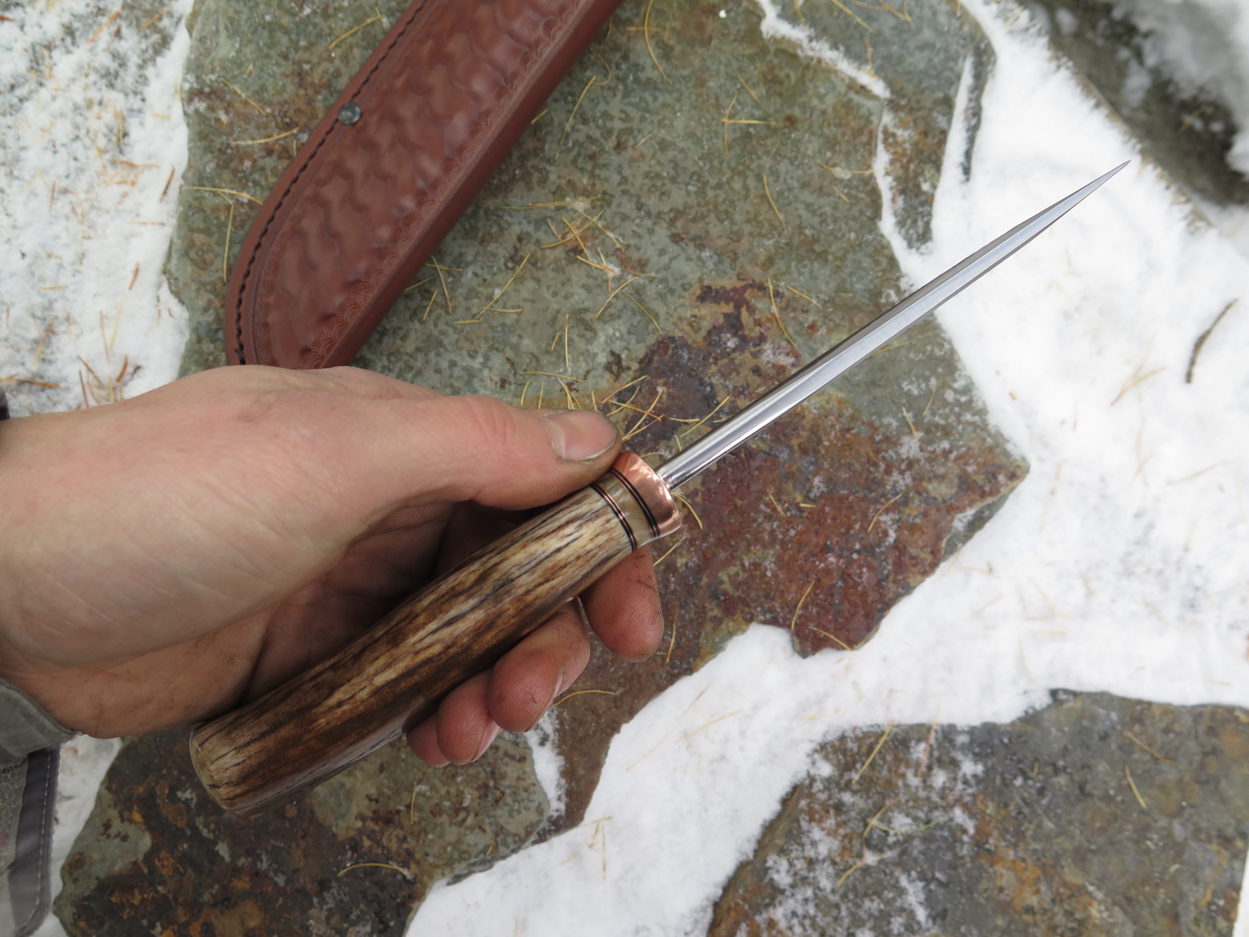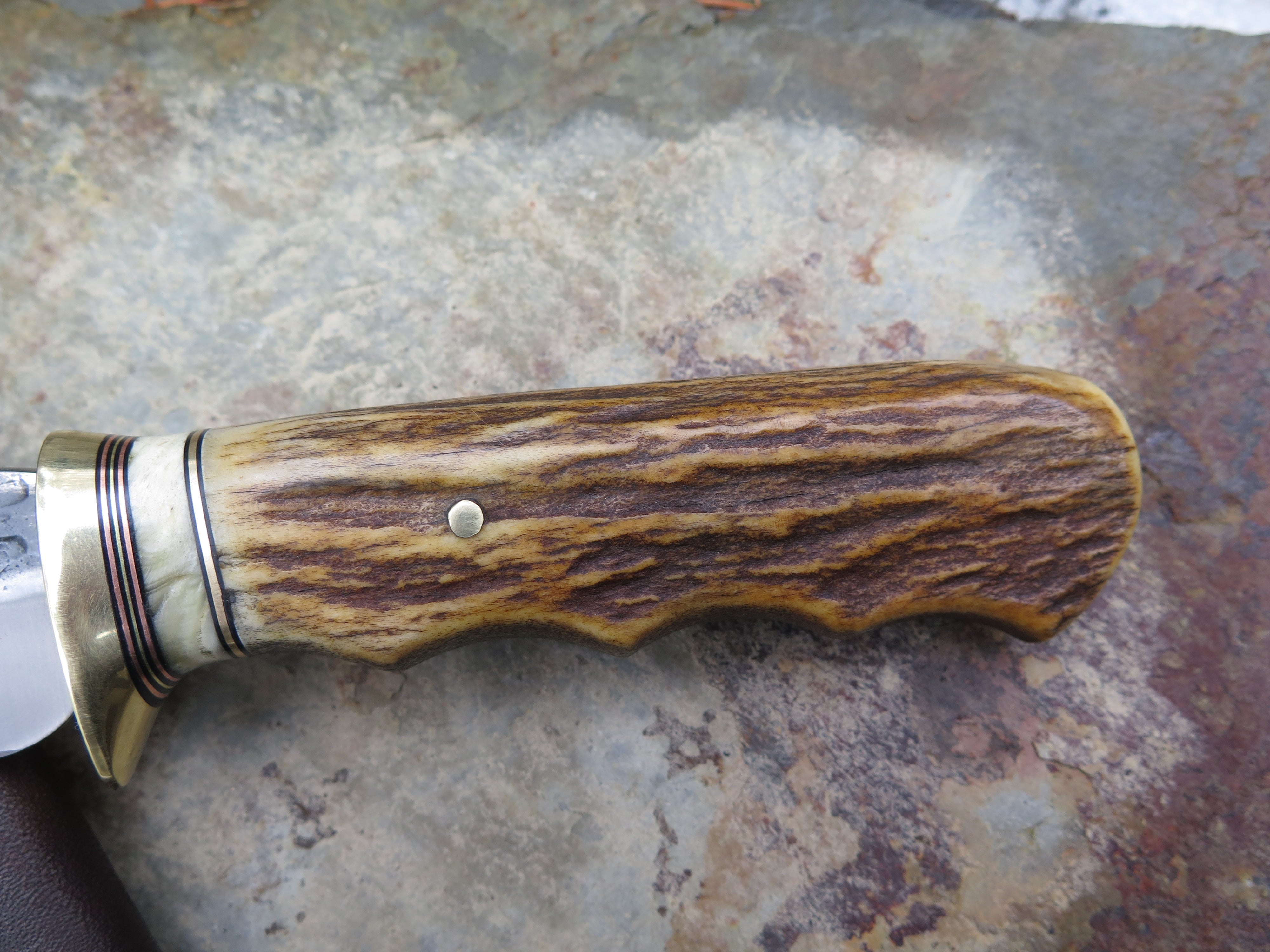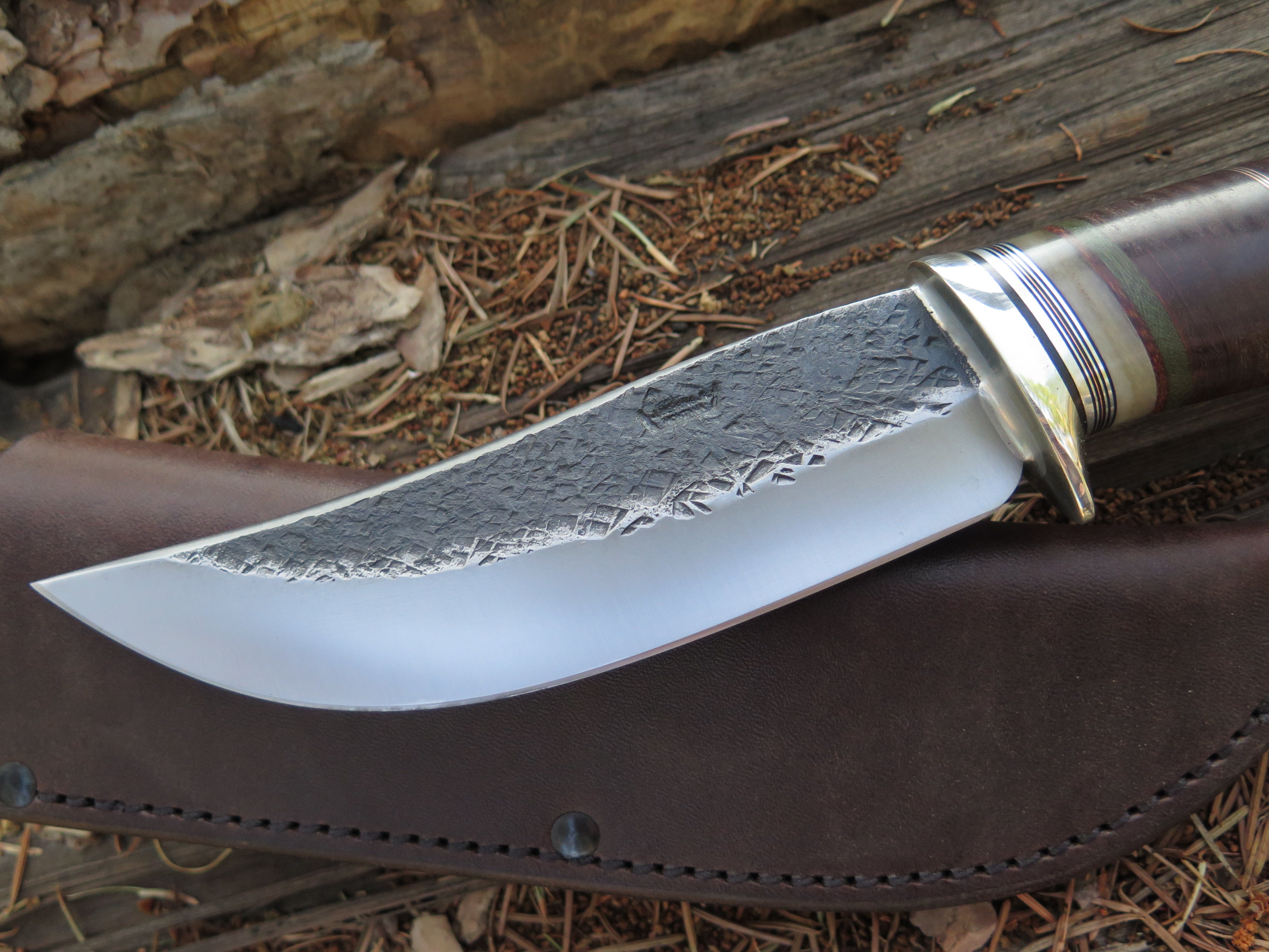 This incredible new XL Hunter from Behring Made© is hand forged from 13/64" thick 5160 spring steel and it measures a whopping 6" from tip to guard with a razor sharp hollow grind and our hammermark finish. The nickel silver guard is soldered in place above black fiber, green micarta, horsehide leather, musk ox, aluminum, copper and brown micarta spacers as well as a shiras moose paddle butt that's pinned and thonged with aluminum. The overall length measures 11" and it comes in a classic belt pouch sheath. You may never need another knife!