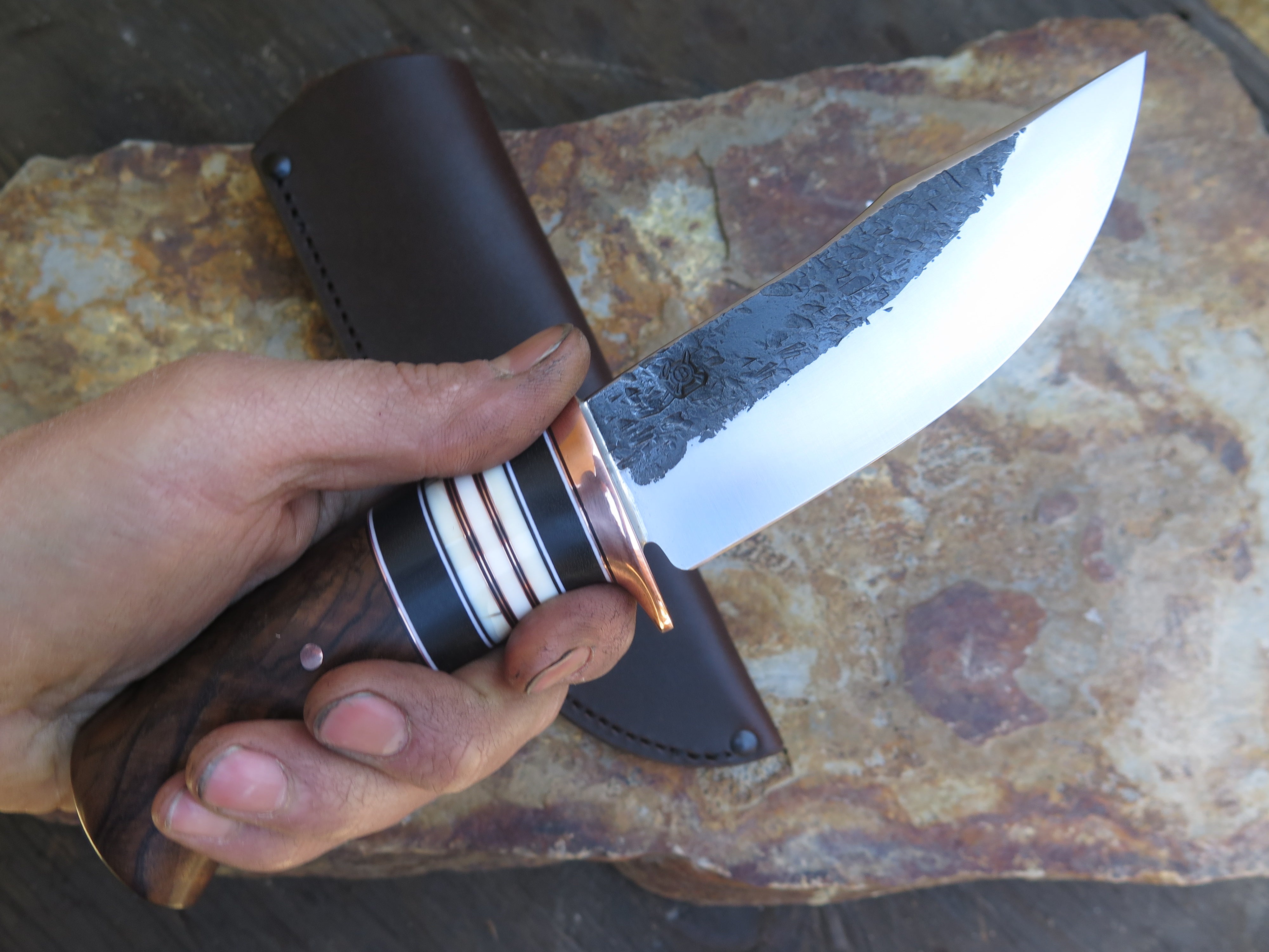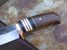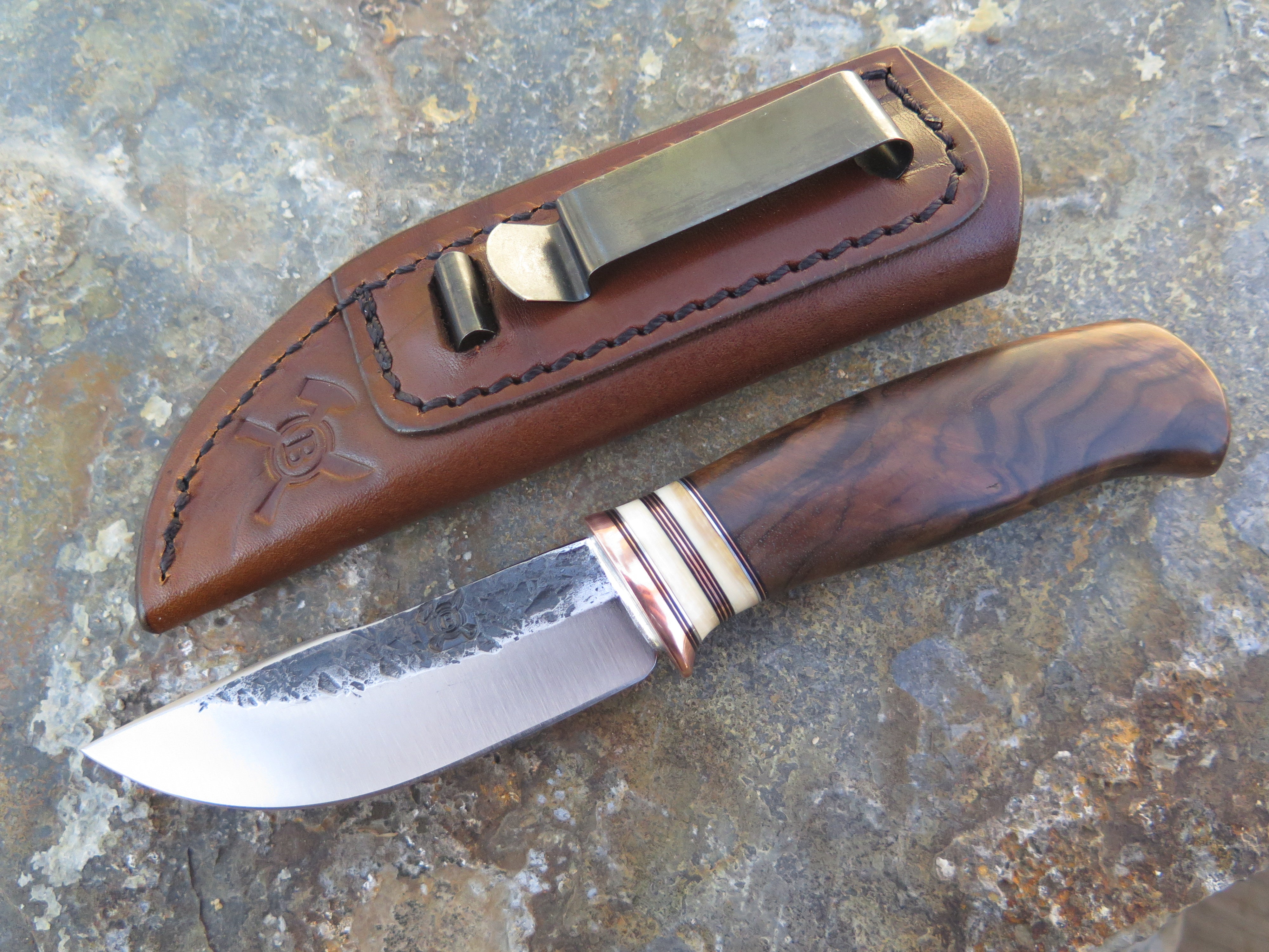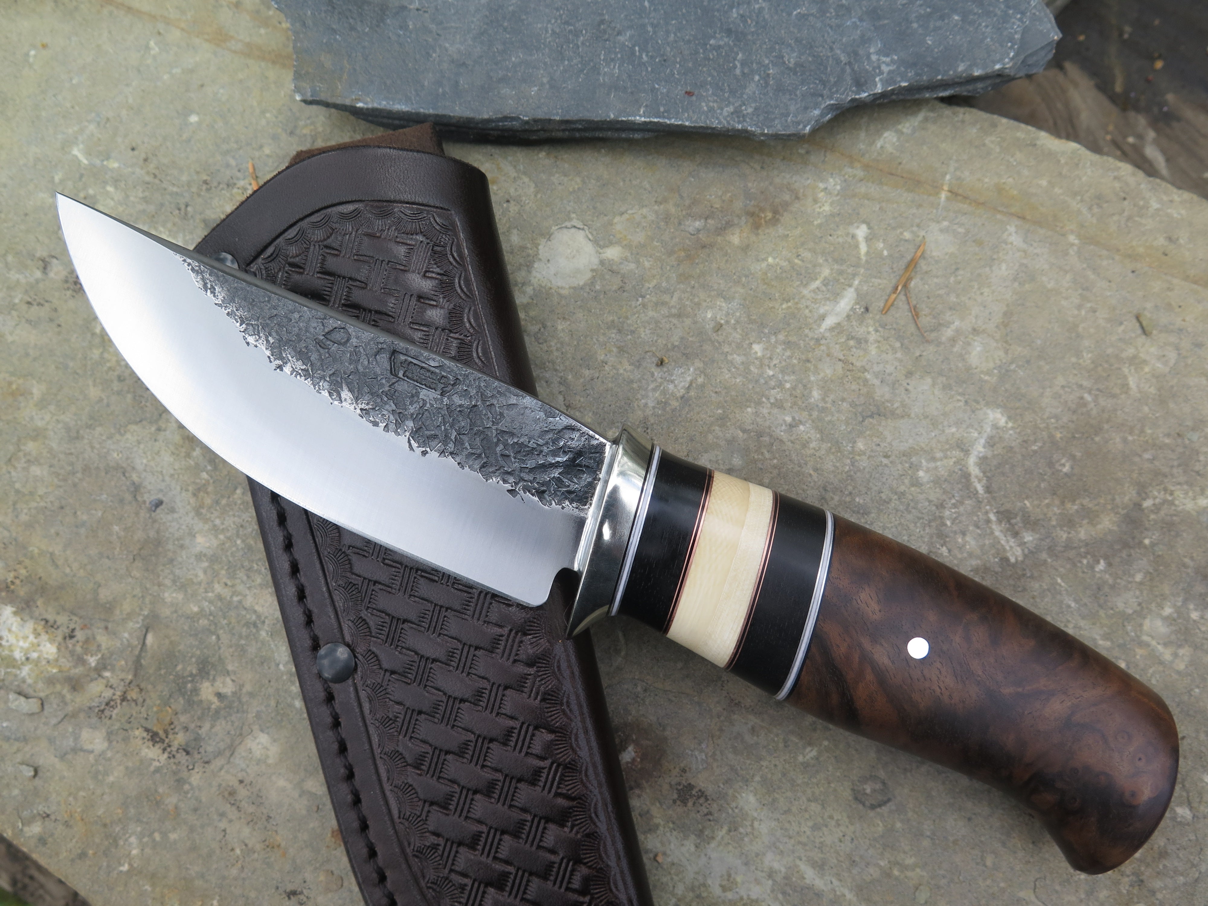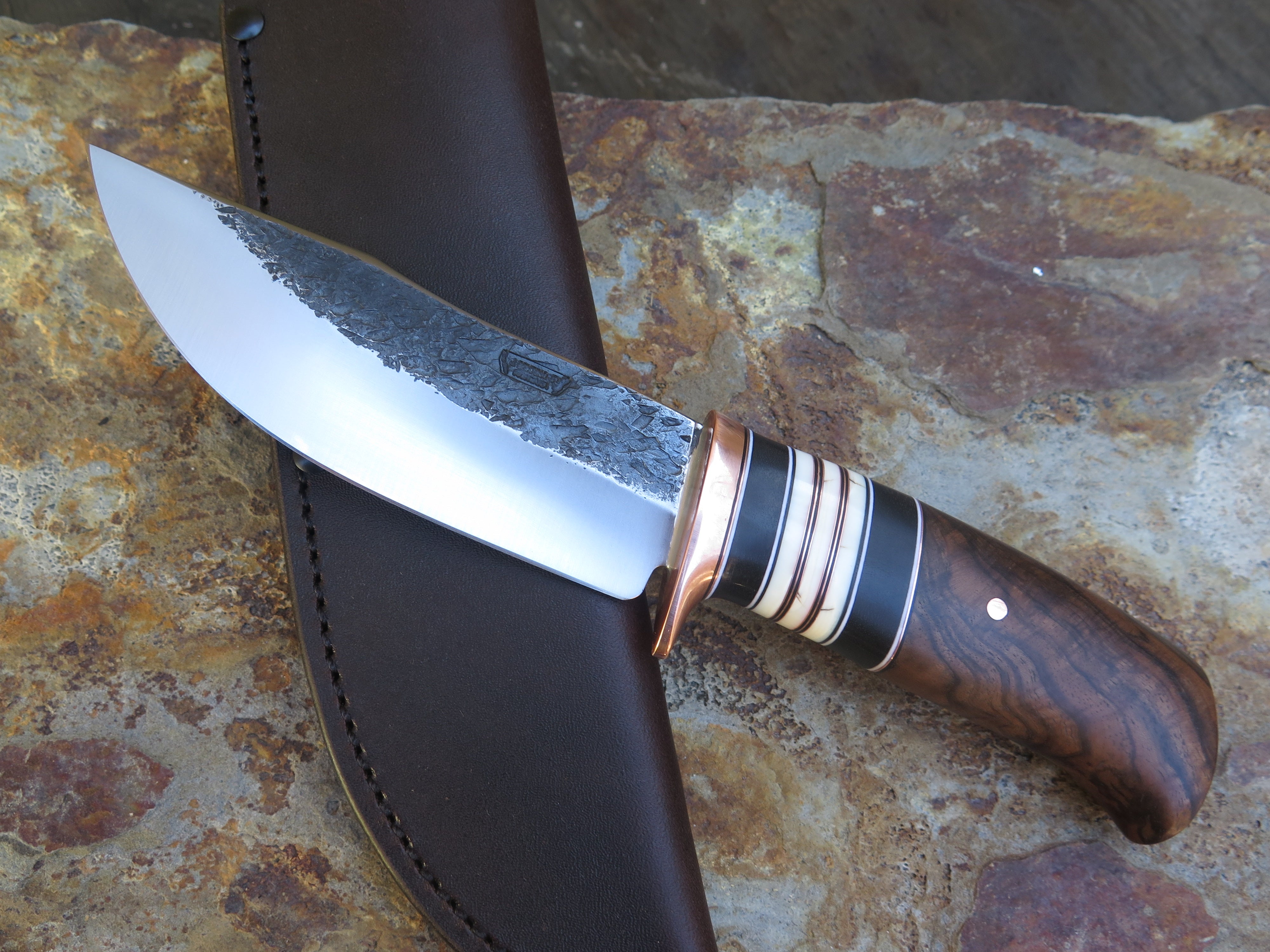 This awesome new one from Behring Made© is a Clip Point Hunter and it's hand forged from 3/16" thick high carbon 01 tool steel and it measures 5" from tip to guard with a razor sharp hollow grind and a hammermark finish. The copper guard is soldered in place above black and white fiber, copper, ebony and mammoth ivory spacers as well as a beautiful Turkish walnut handle that is pinned through the tang with copper. The overall length measures 9 1/2" and it comes in a classic leather belt pouch sheath.