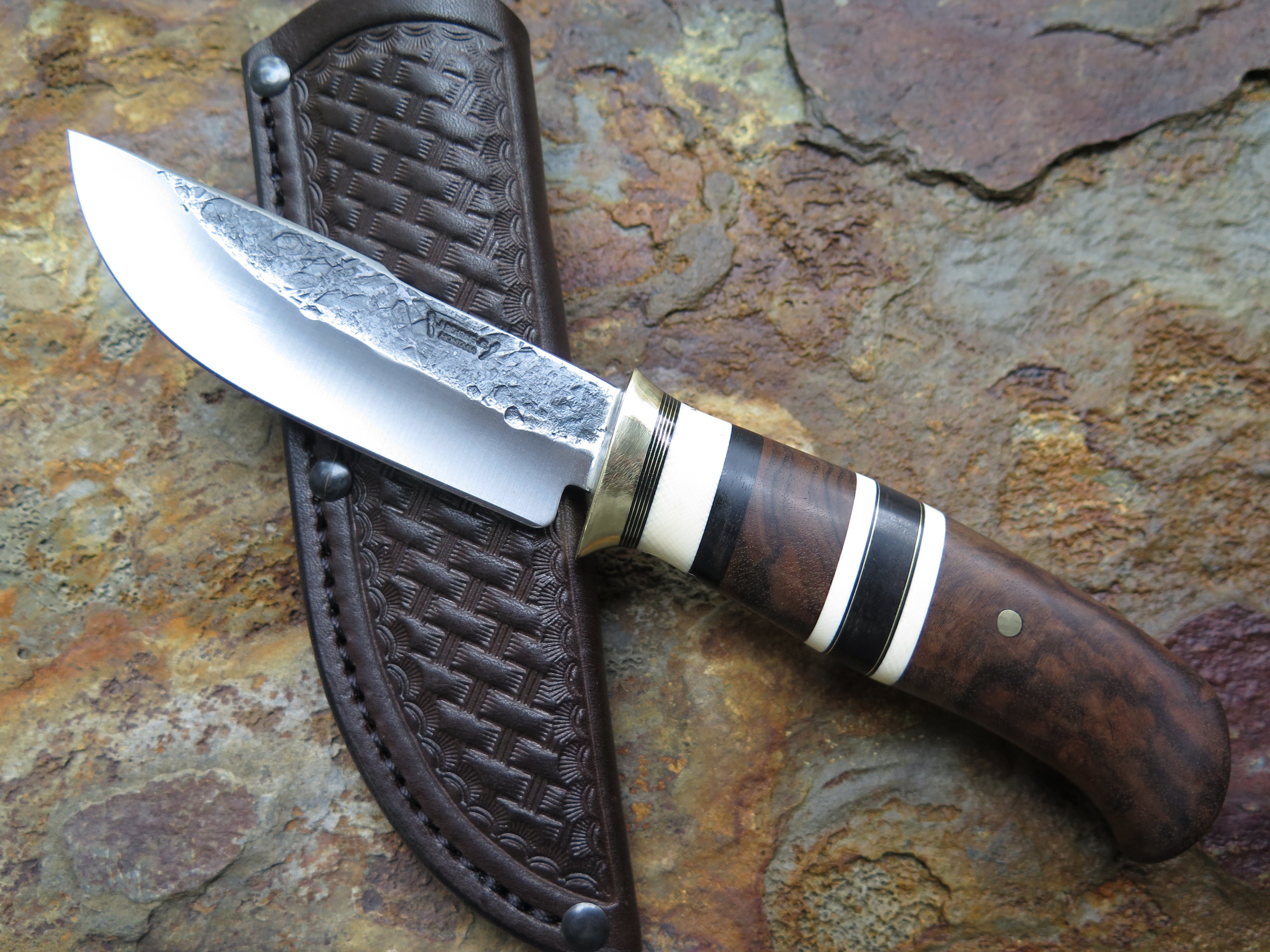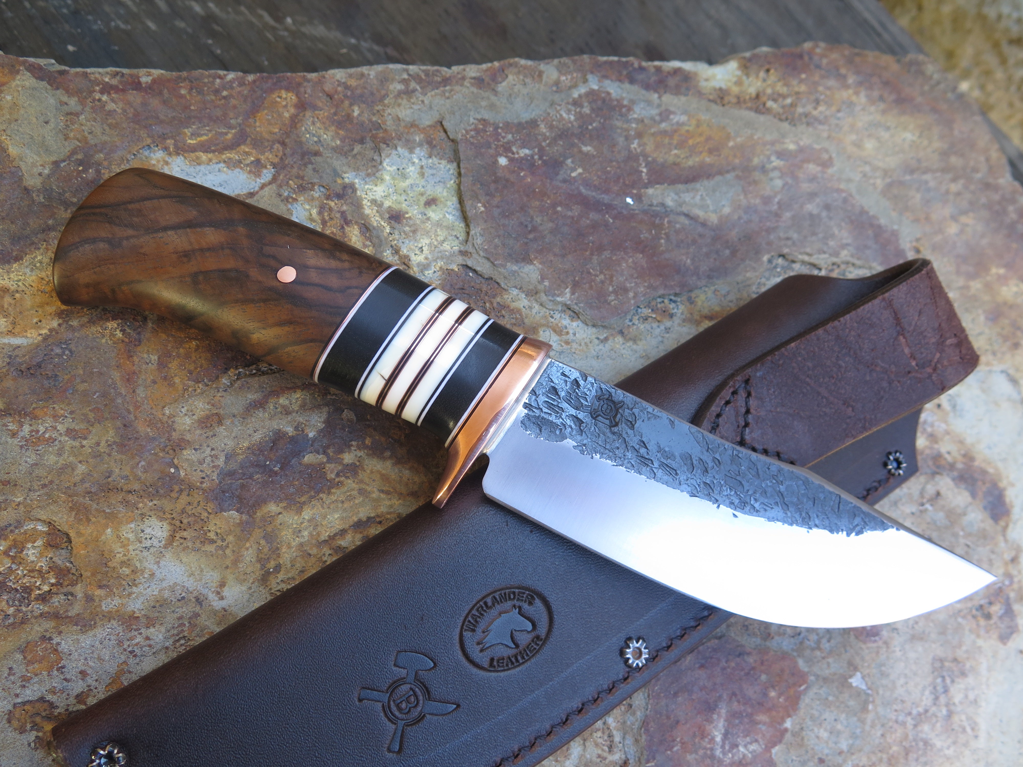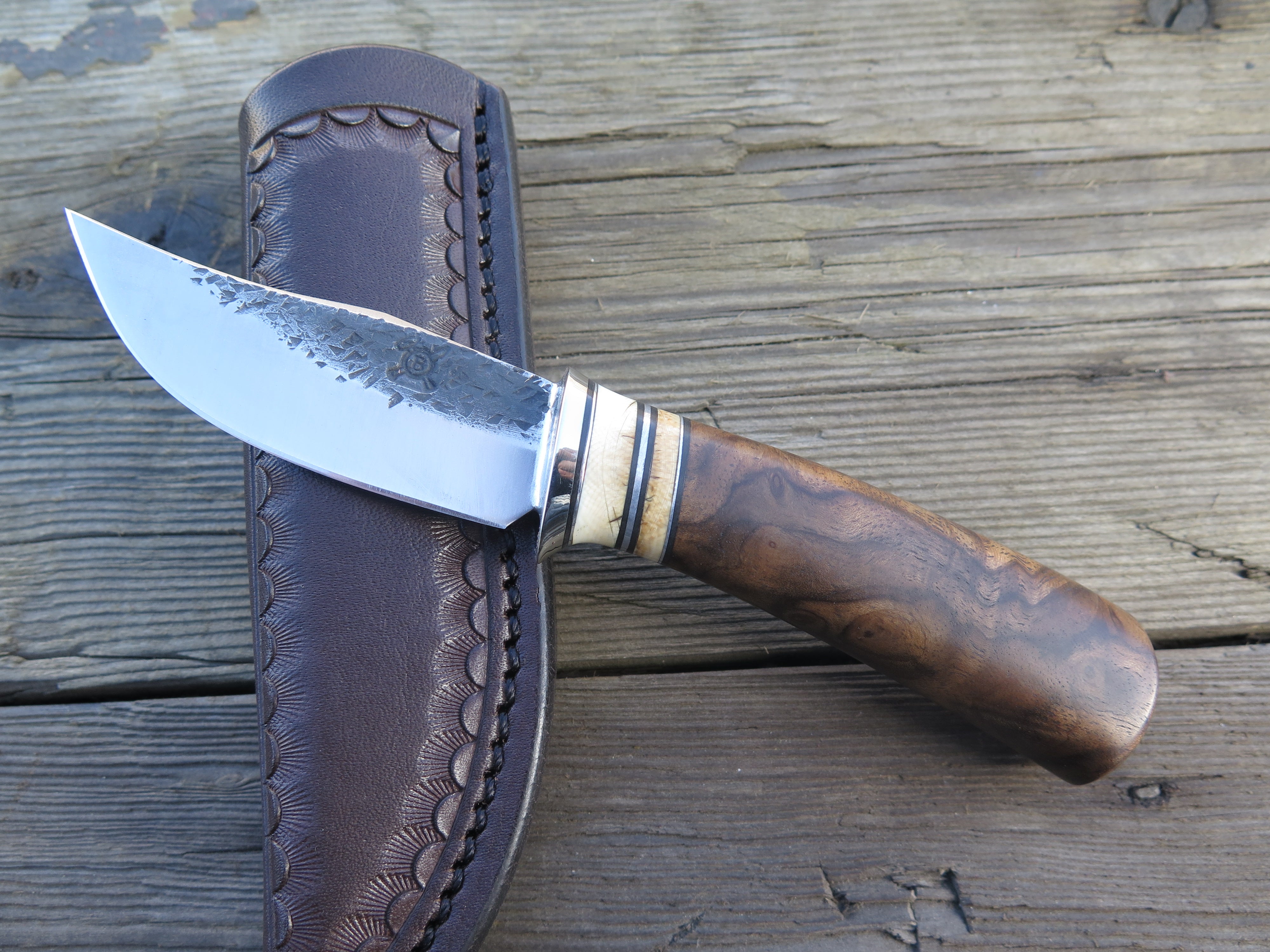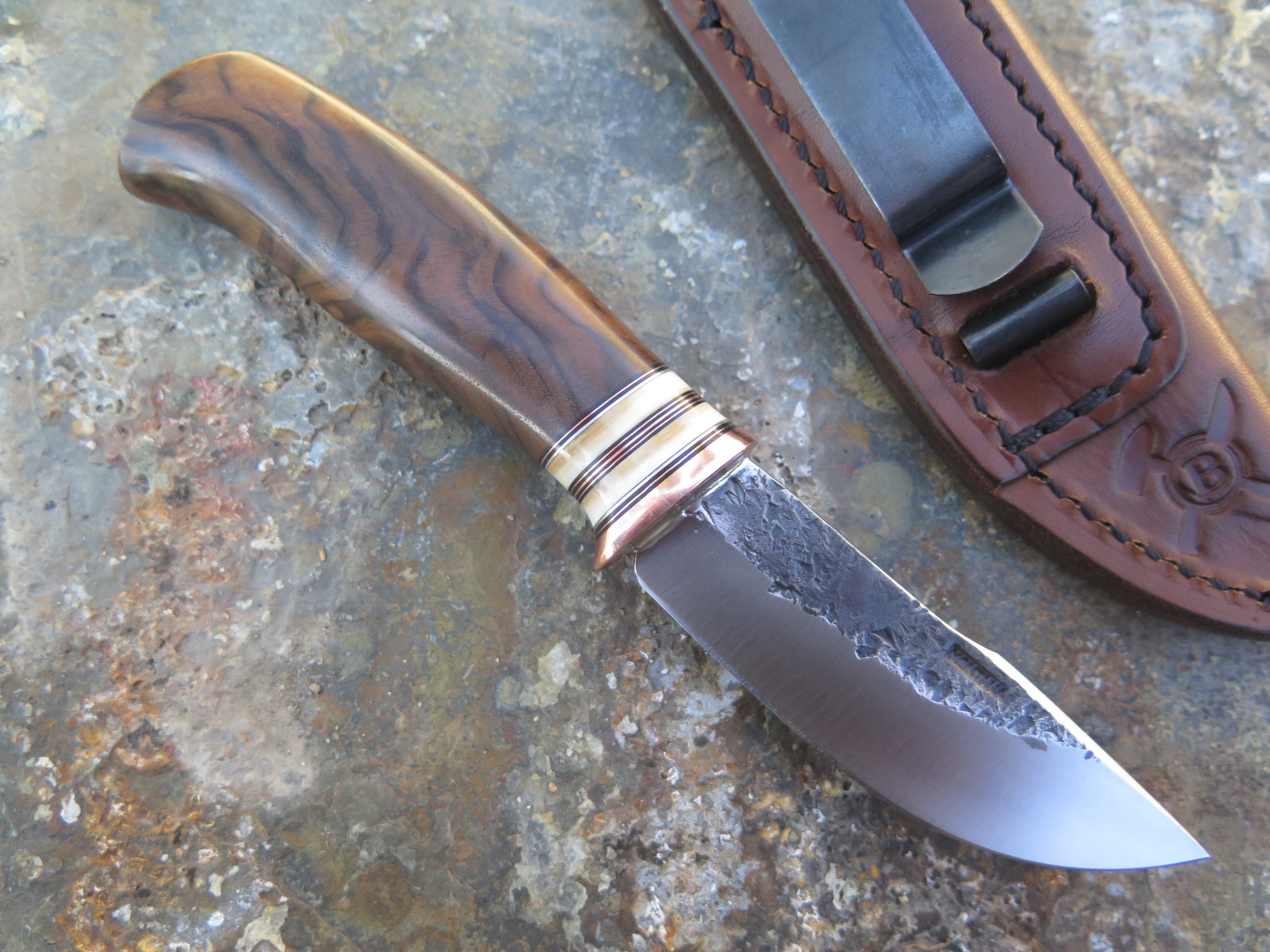 This awesome new one from Behring Made© is a Clip Point Hunter and it's hand forged from 3/16" thick high carbon 01 tool steel and it measures 5" from tip to guard with a razor sharp hollow grind and a hammermark finish. The copper guard is soldered in place above black and white fiber, copper, ebony and mammoth ivory spacers as well as a beautiful Turkish walnut handle that is pinned through the tang with copper. The overall length measures 9 1/2" and it comes in a classic leather belt pouch sheath.