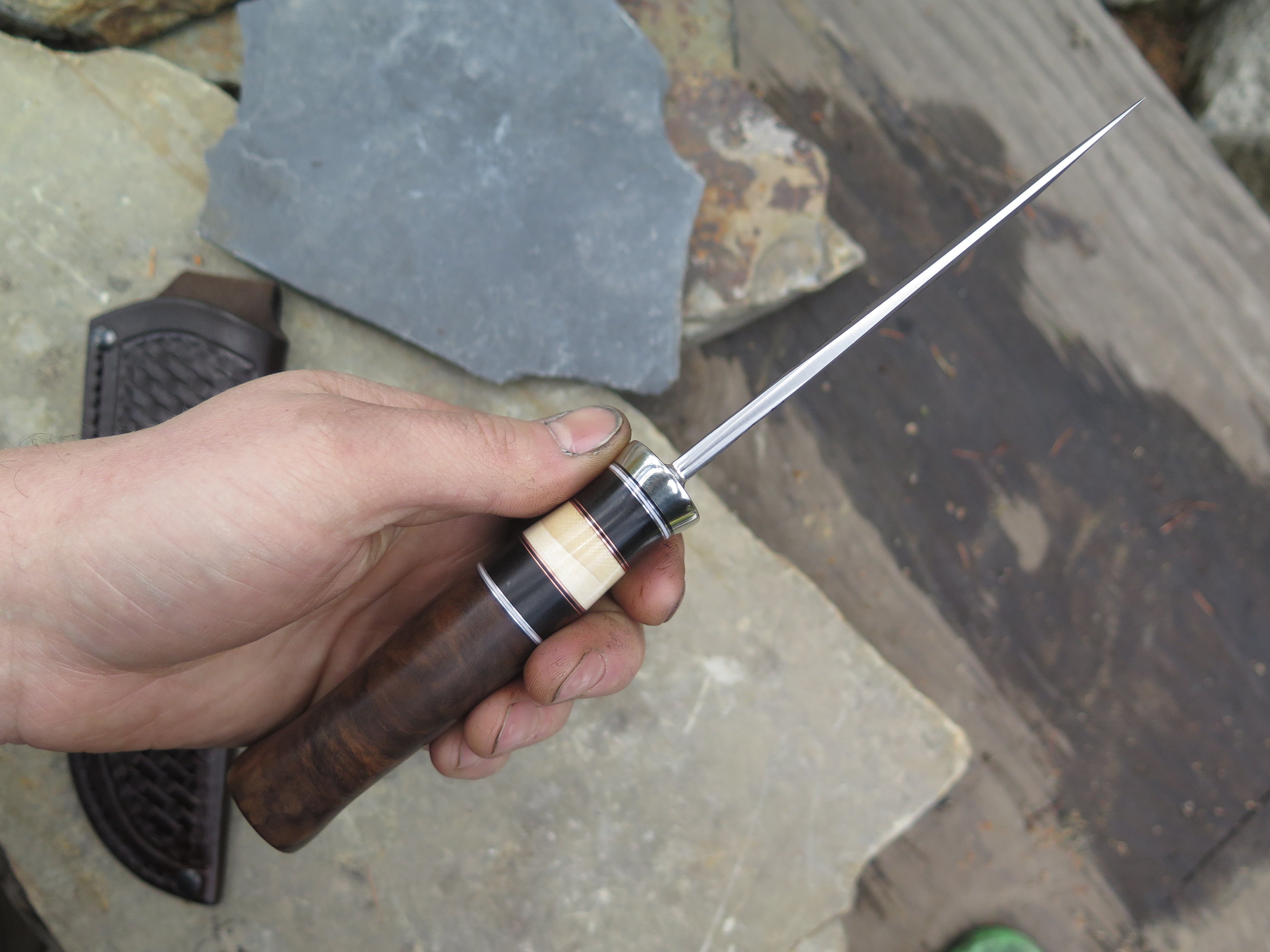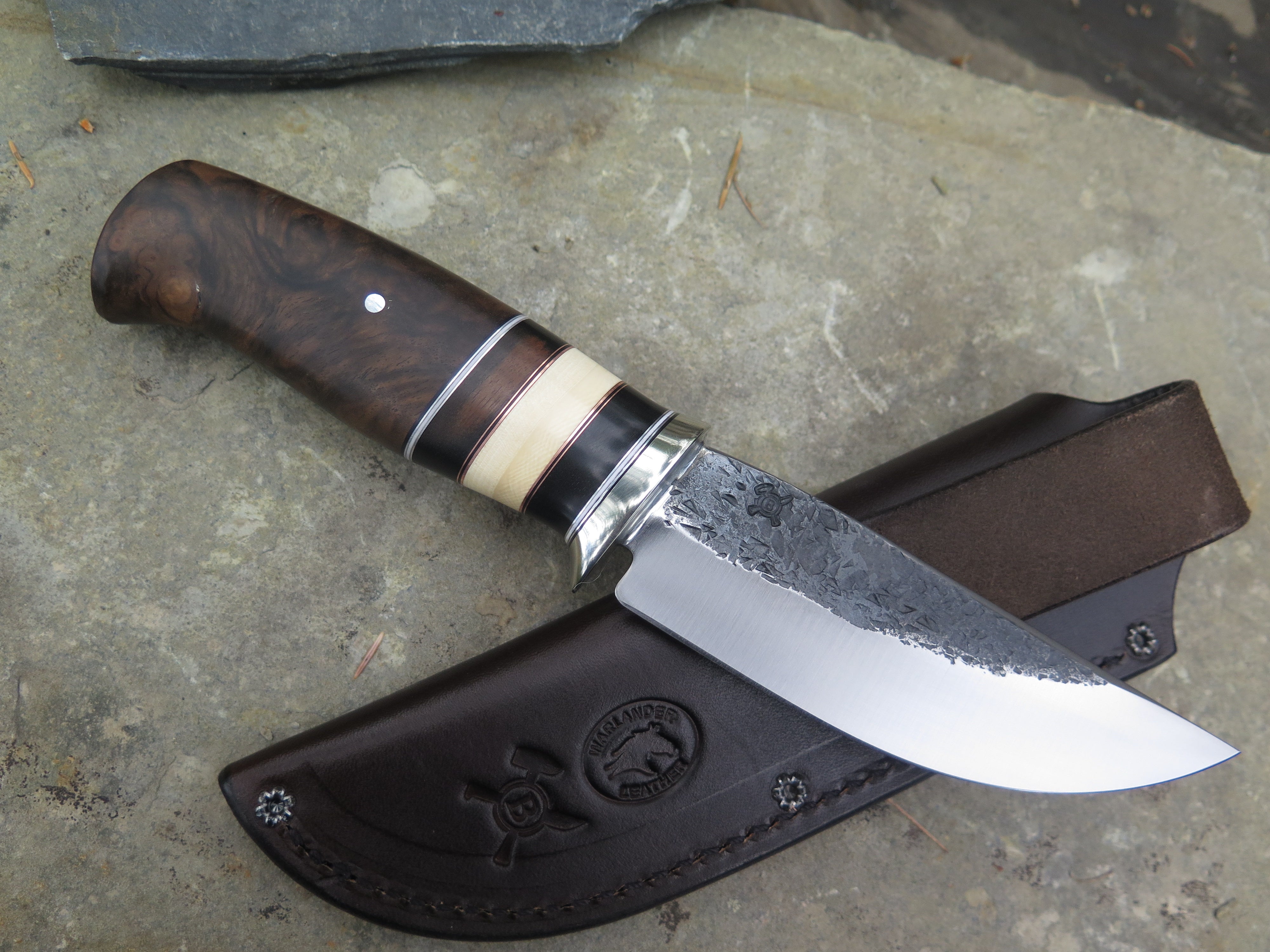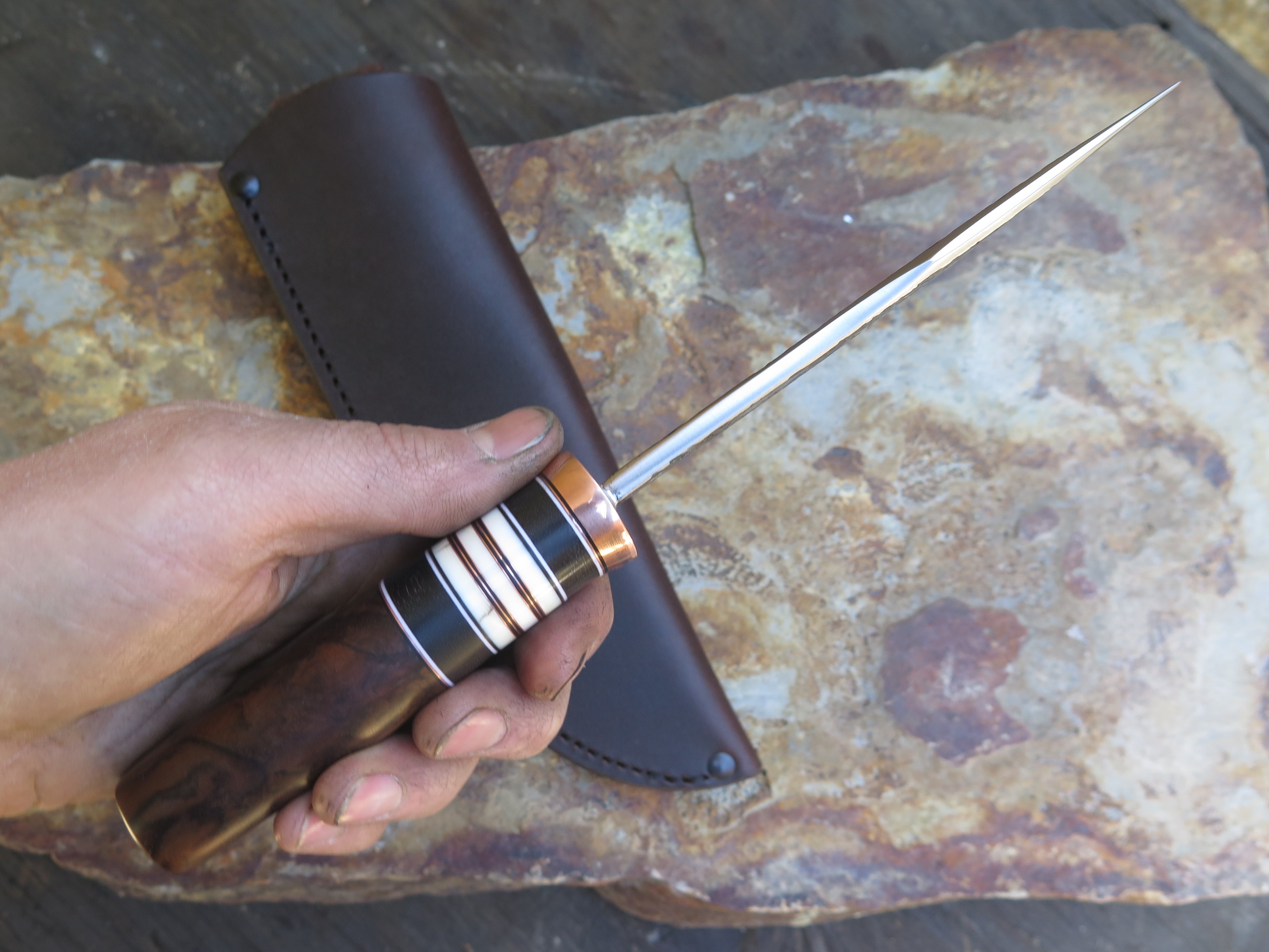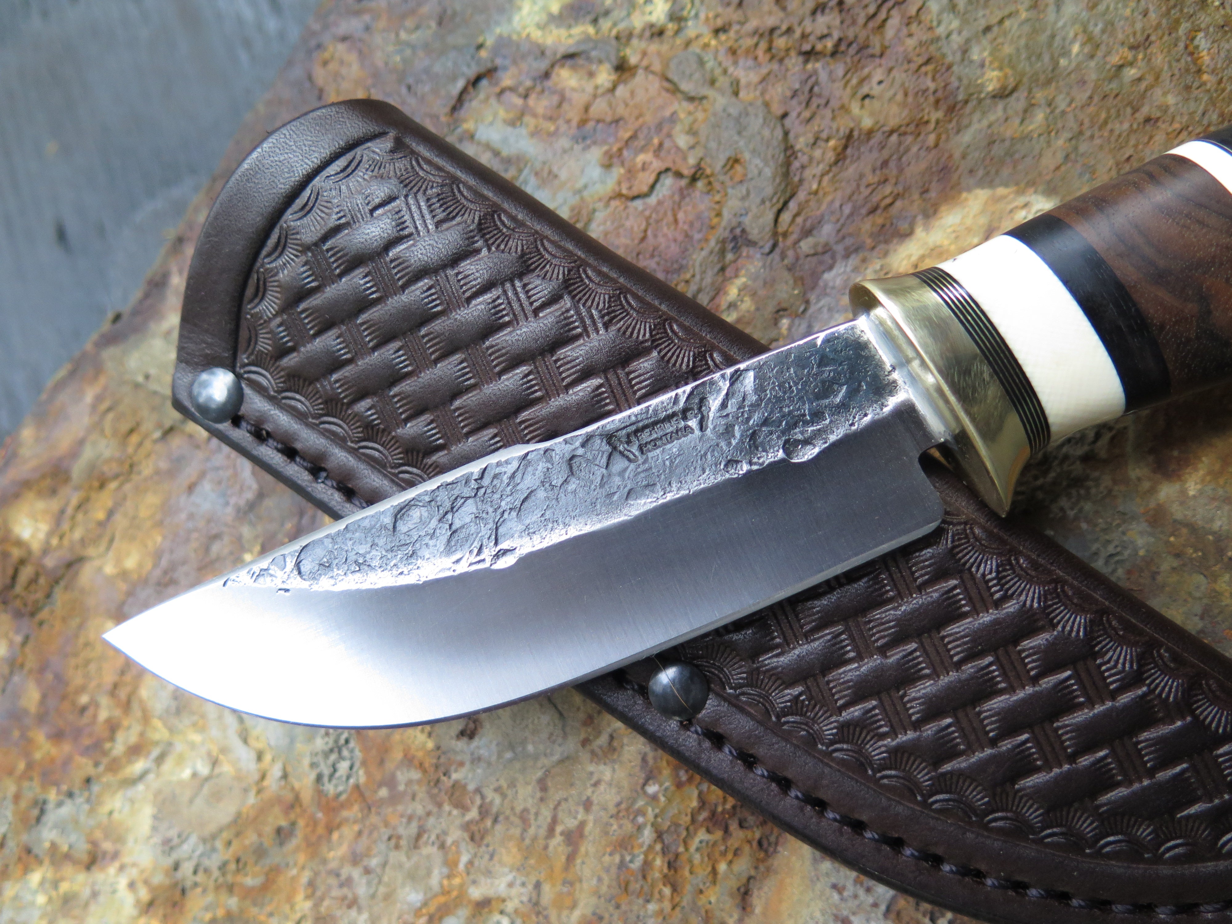 This awesome new one from Behring Made© is a Clip Point Hunter and it's hand forged from 3/16" thick high carbon 01 tool steel and it measures 5" from tip to guard with a razor sharp hollow grind and a hammermark finish. The copper guard is soldered in place above black and white fiber, copper, ebony and mammoth ivory spacers as well as a beautiful Turkish walnut handle that is pinned through the tang with copper. The overall length measures 9 1/2" and it comes in a classic leather belt pouch sheath.