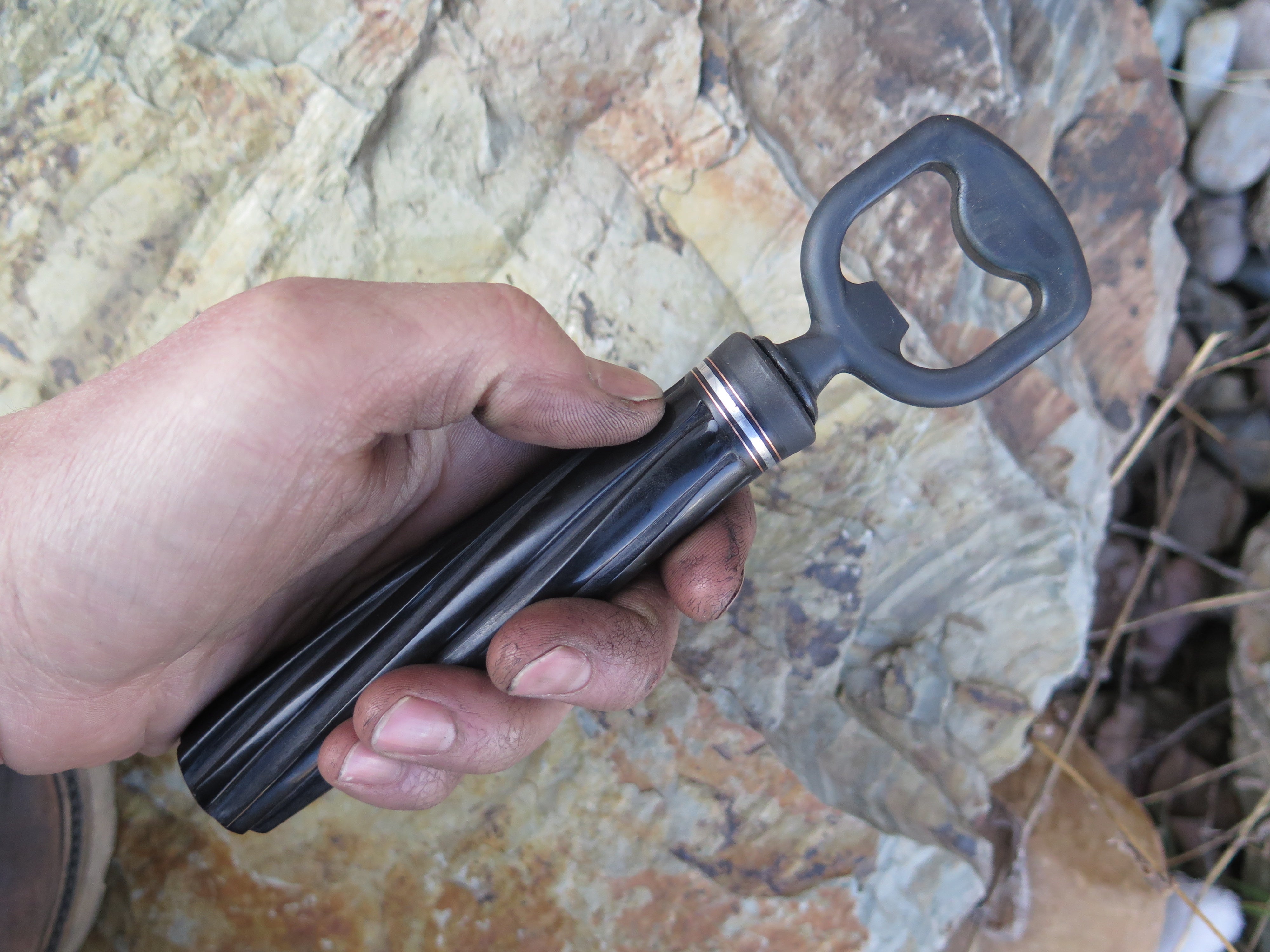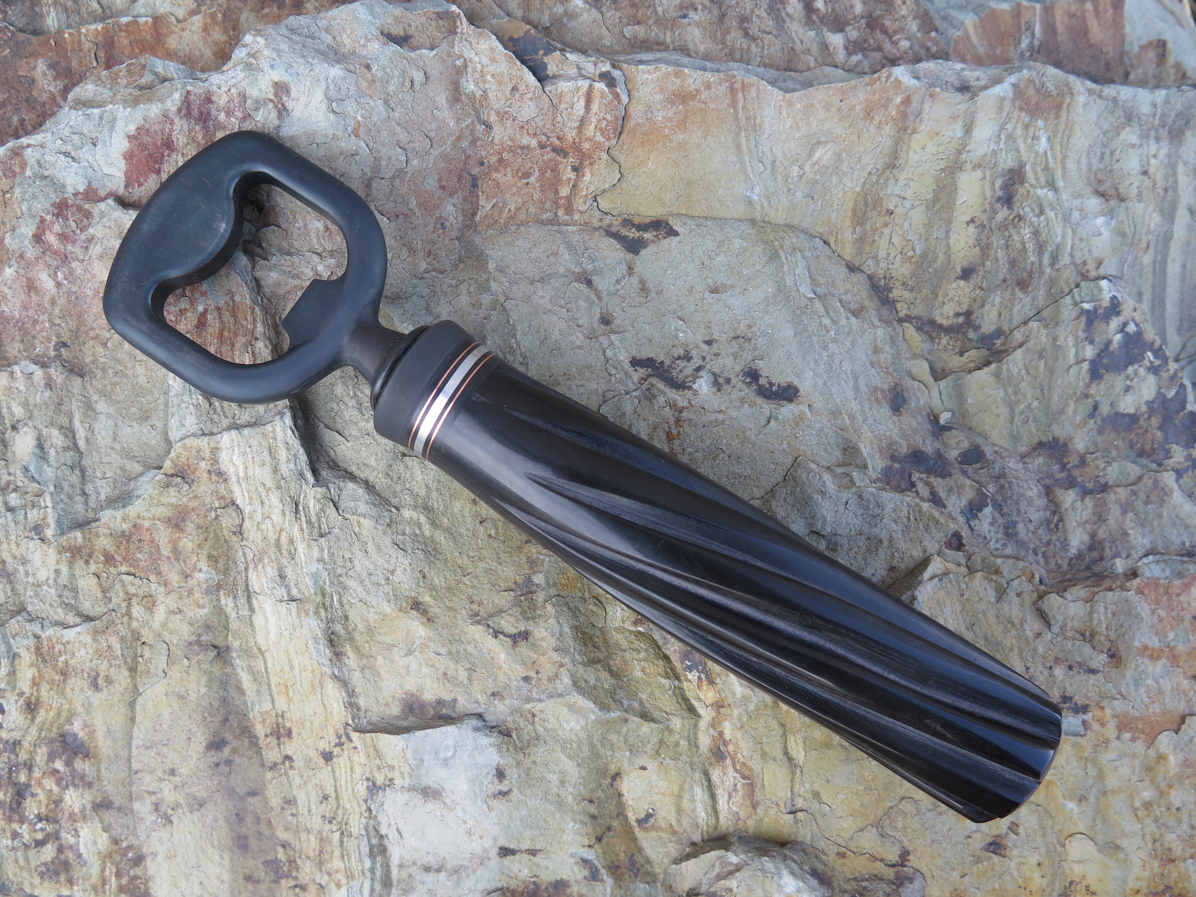 The Behring Made© bottle opener is the ultimate way to sip in style. We soldered the blued steel guard in place above black and white fiber with aluminum spacers that join the jigged buffalo handle together, and what a cool tool it is! Overall length measures 7 3/8" and it comes in a Behring Made© zipper case too.