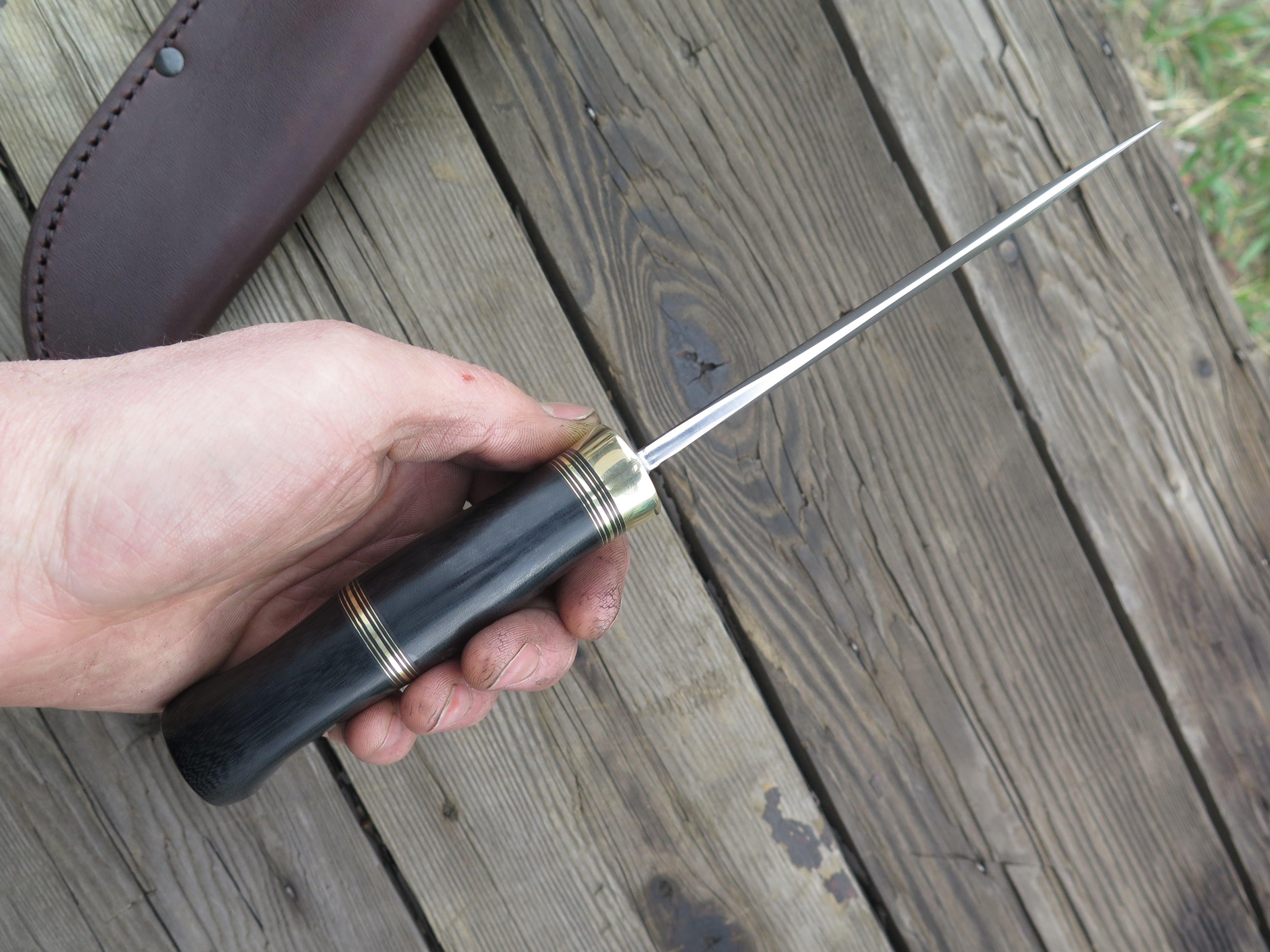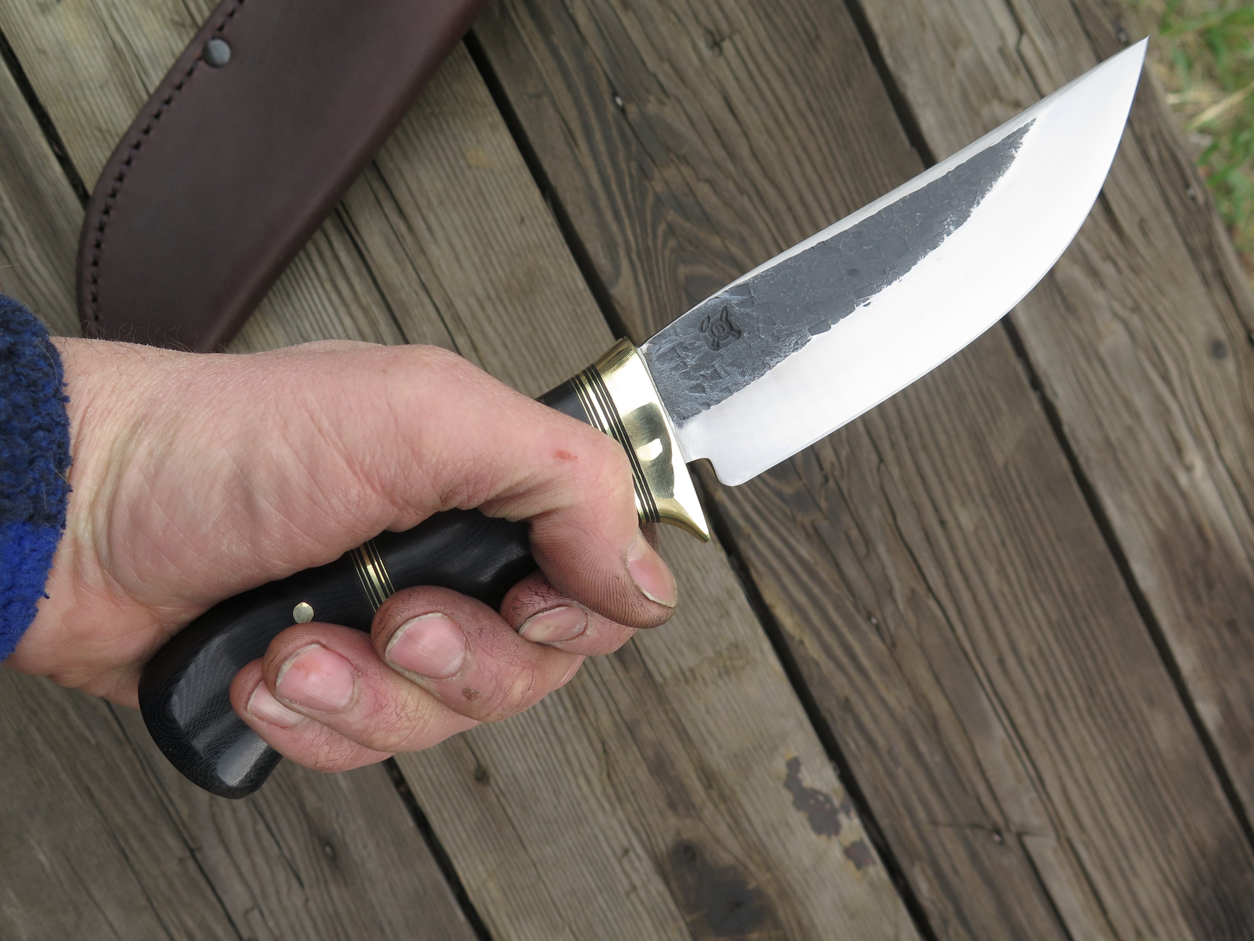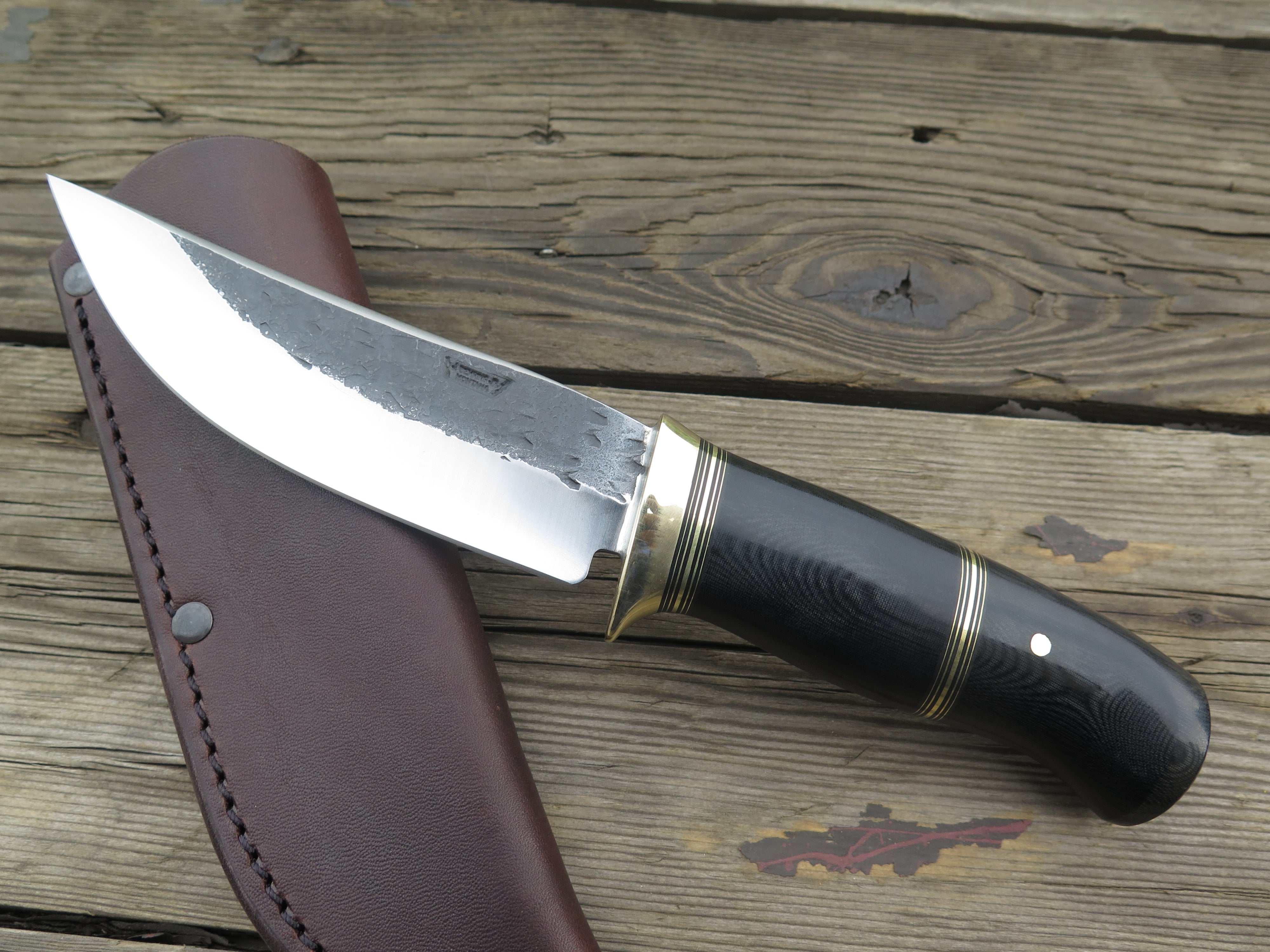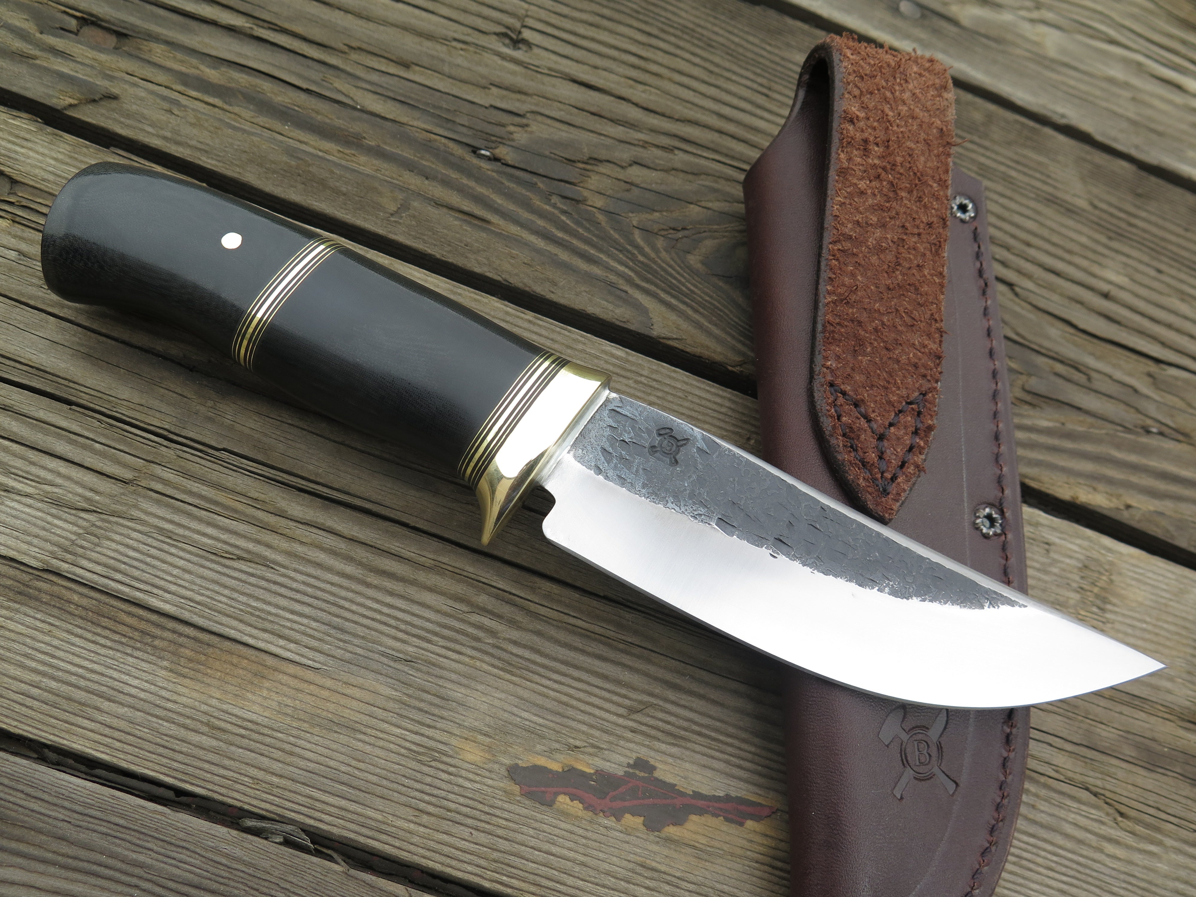 This beastly new Hunter from Behring Made© is hand forged from 3/16" thick high carbon 01 tool steel and it measures 5" from tip to guard with a razor sharp hollow grind and our hammermark finish. The brass guard is soldered in place above black fiber, brass and a two-piece construction of black micarta that's pinned through the tang with brass. The overall length measures 9 5/8" and it comes in a classic belt pouch sheath.