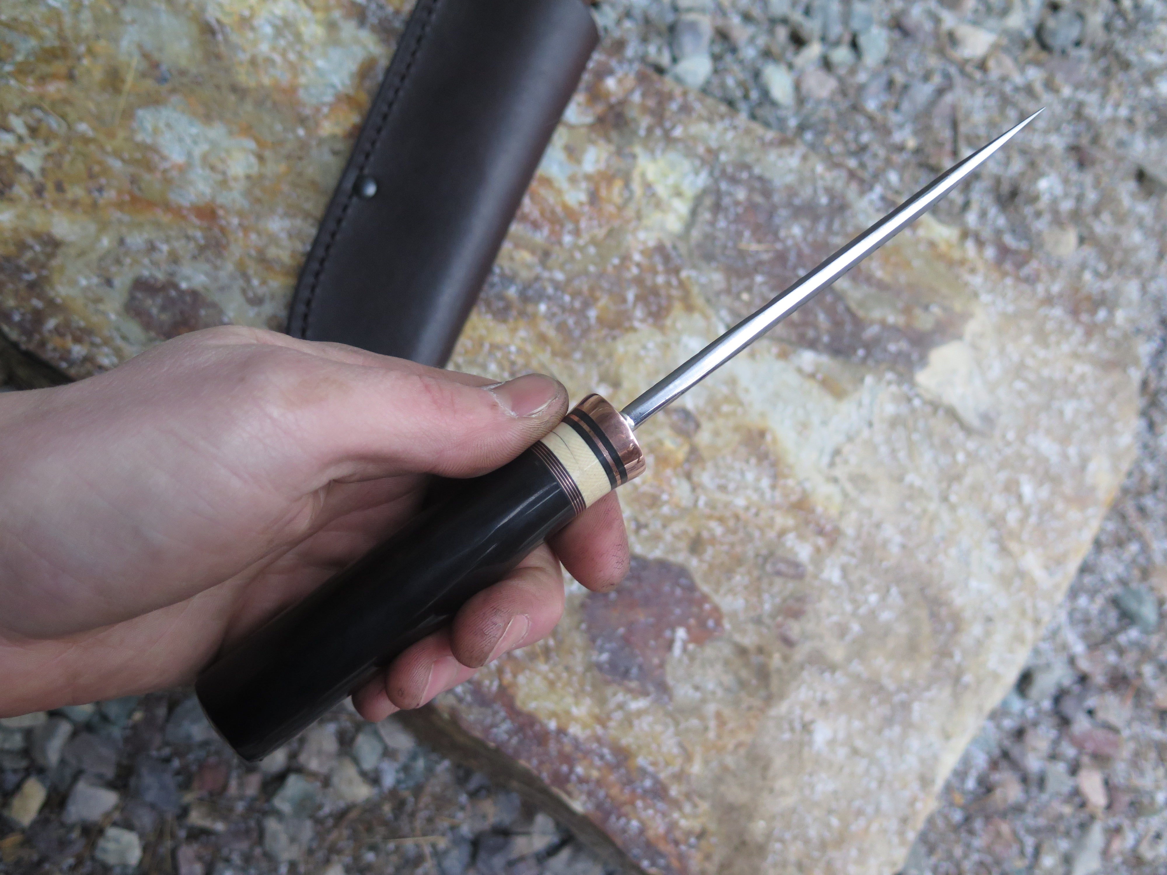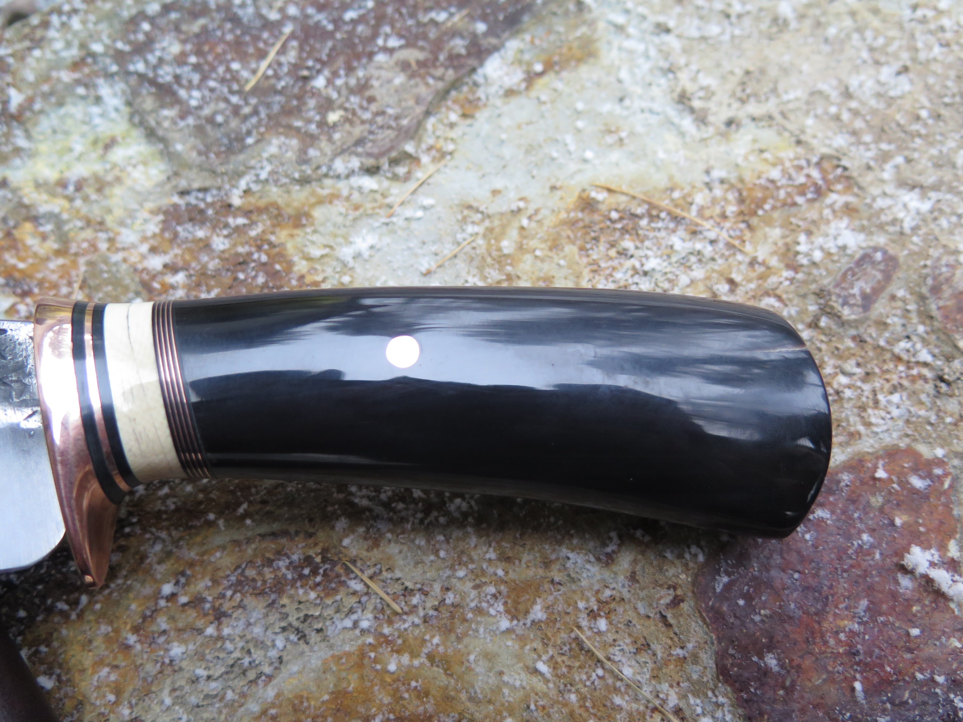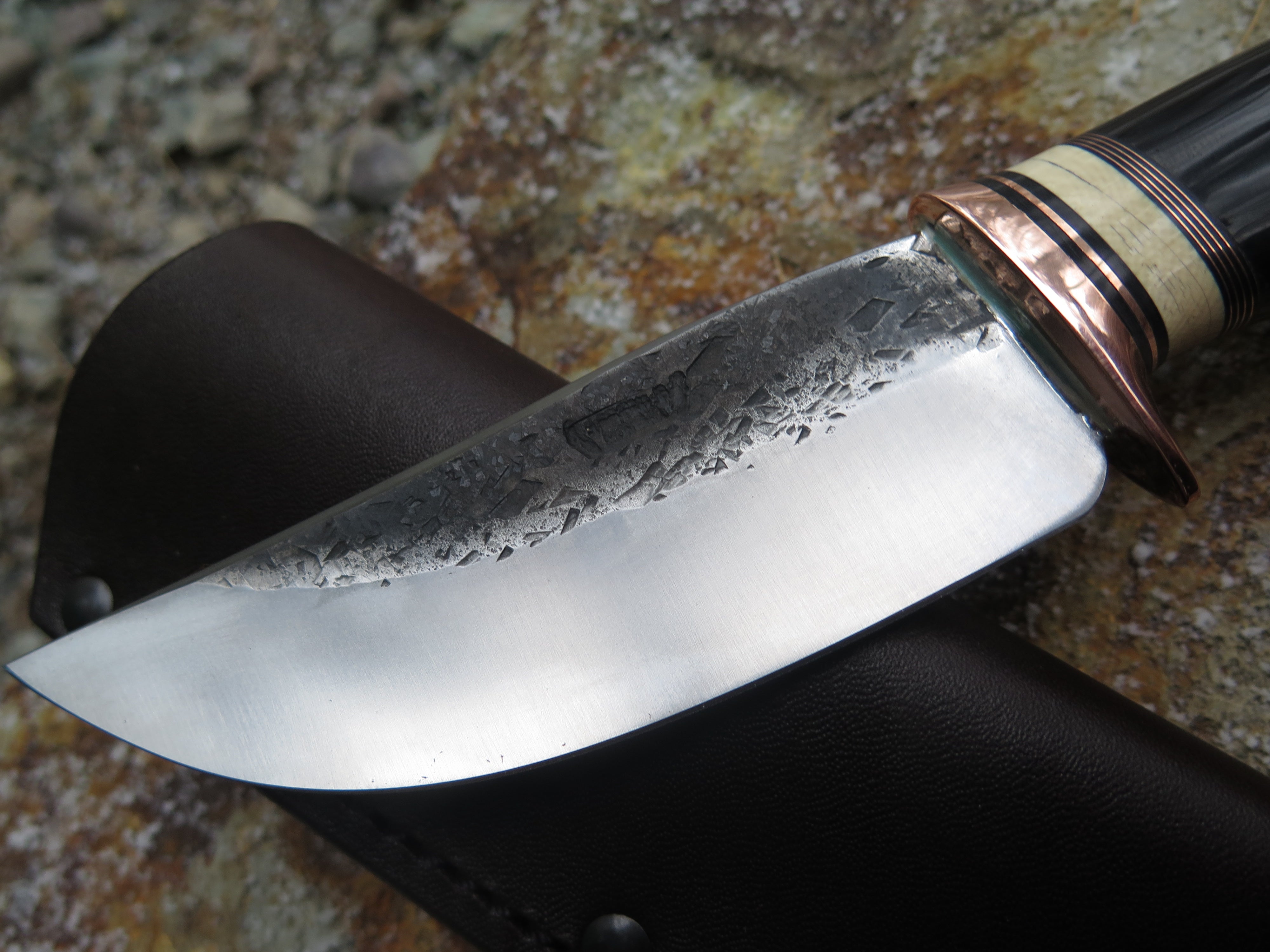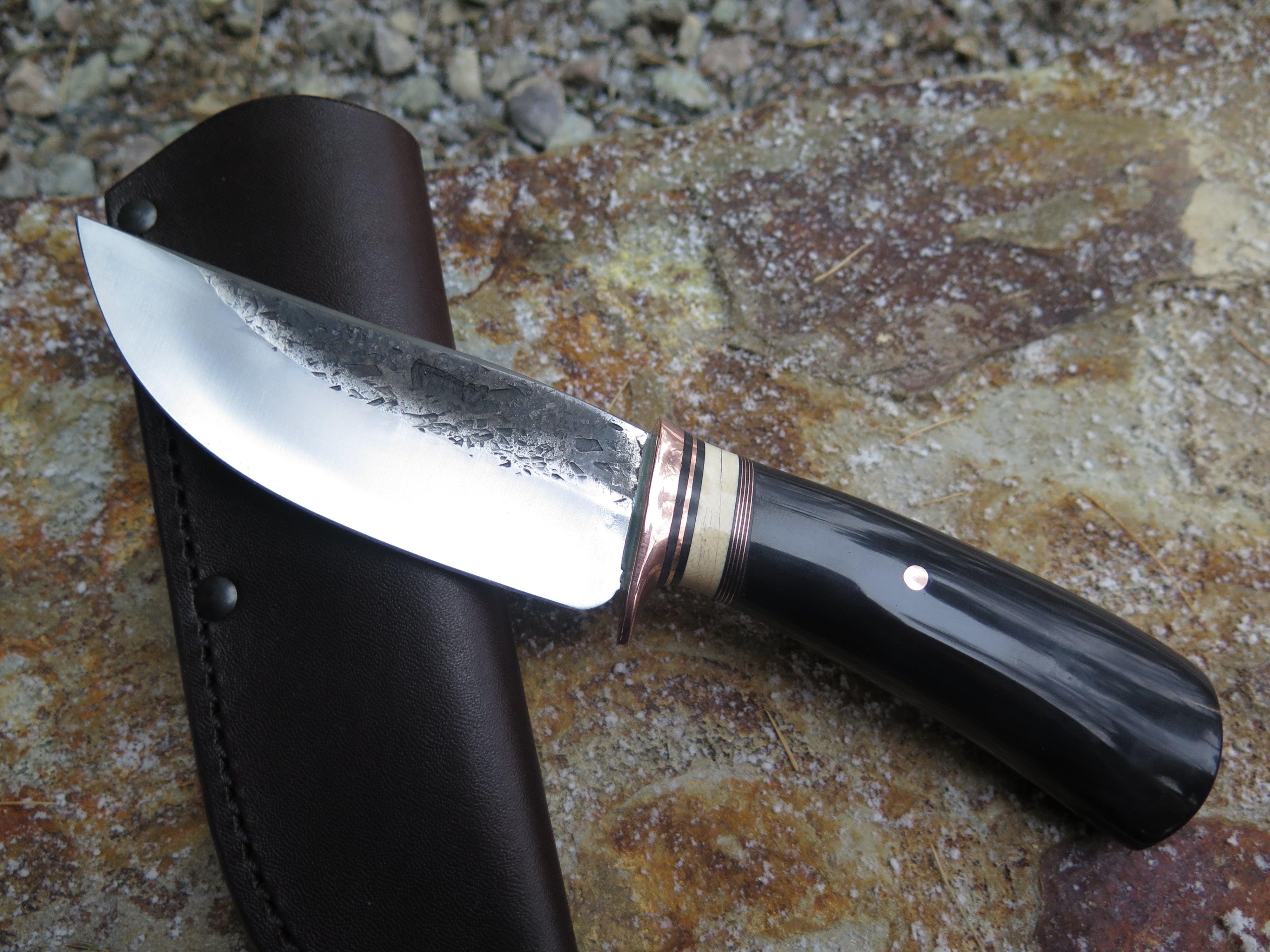 This new Hunter from Behring Made© is hand forged out of 3/16" thick high carbon 01 tool steel and it measures 4 1/2" from tip to guard with a razor sharp hollow grind and our hammermark finish. The copper guard is soldered in place above black fiber, copper and mammoth ivory spacers in addition to the buffalo horn handle that's pinned through the tang with copper. The overall length measures 8 7/8" and it comes in a classic leather belt pouch sheath.