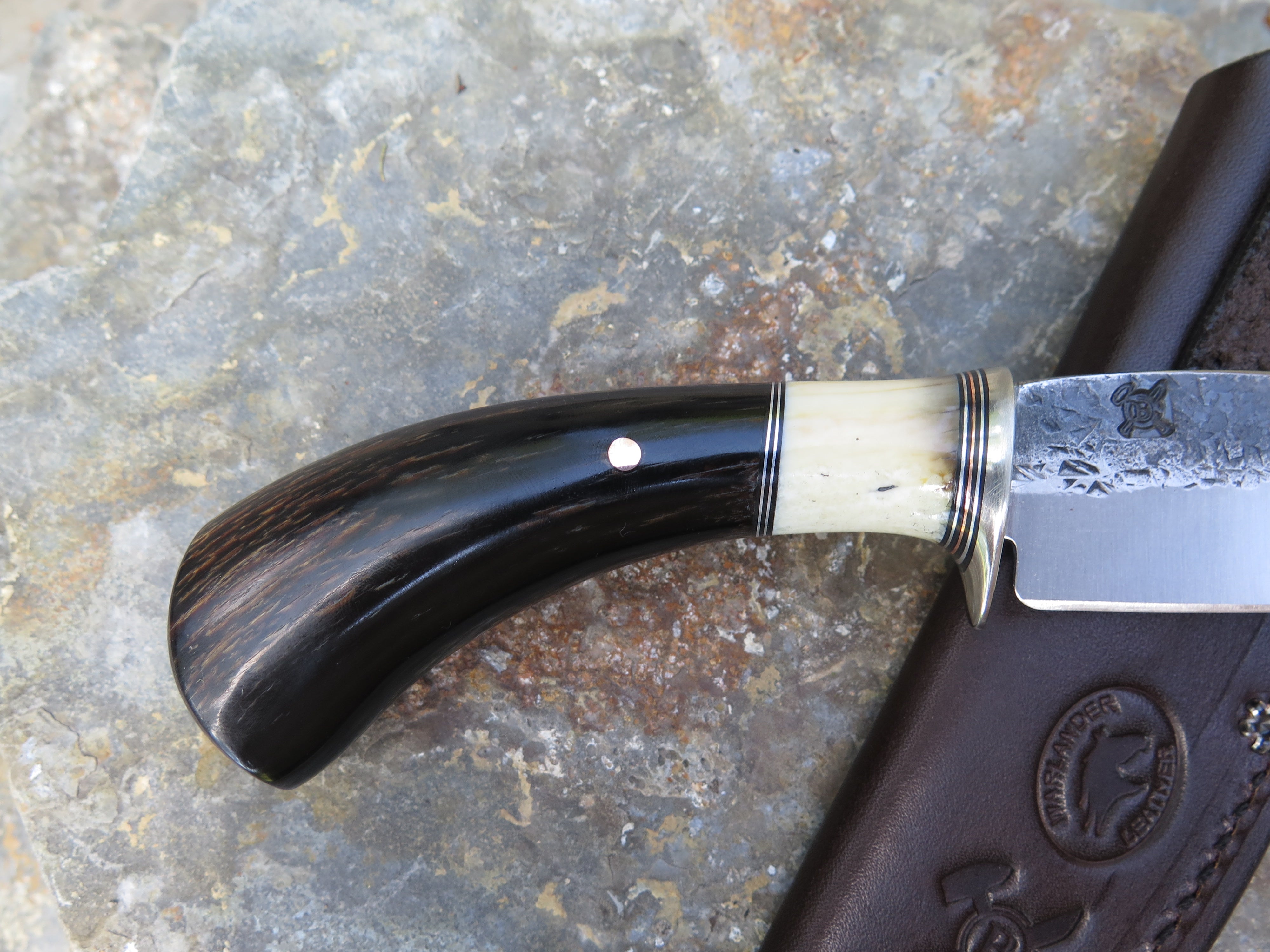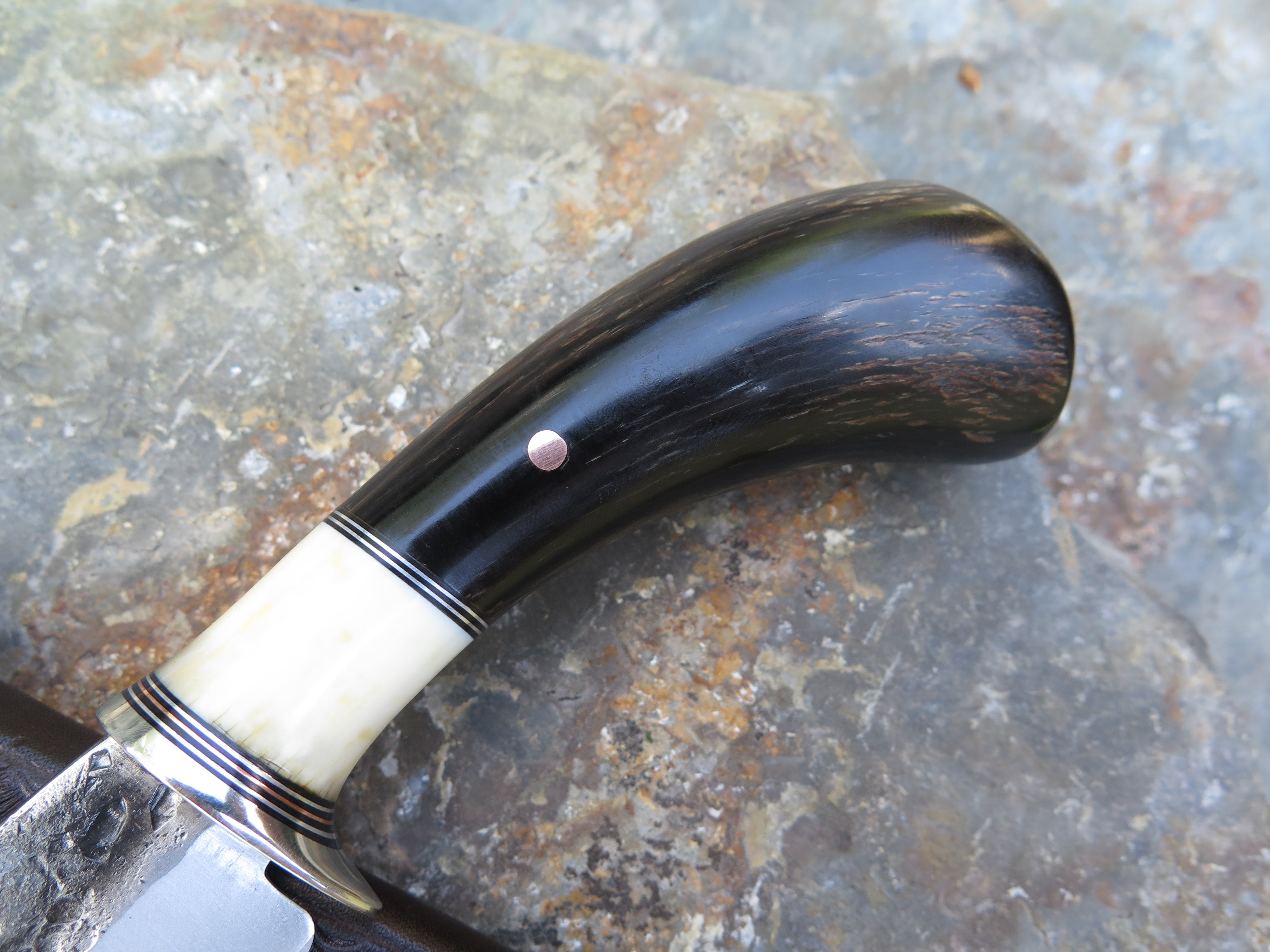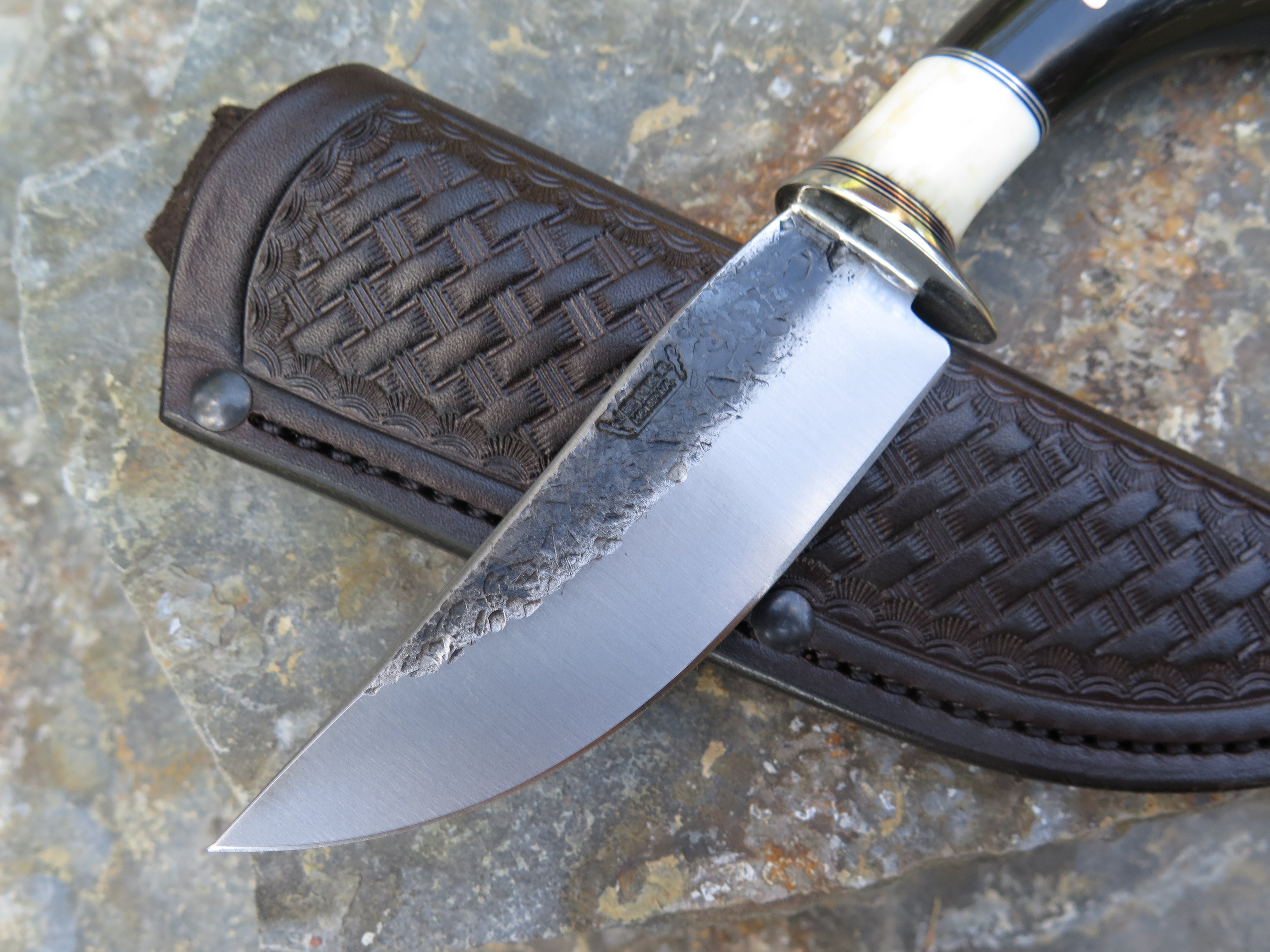 This beautiful new Hunter from Behring Made© is hand forged from 1/8" thick high carbon 01 tool steel and it measures 4" from tip to guard with a razor sharp hollow grind and our hammermark finish. The nickel silver guard is soldered in place above black fiber, copper, aluminum and fossil walrus spacers as well as an African water buffalo horn handle that is pinned with copper. The overall length measures 8 1/4" and it comes in a basketweave tooled pouch sheath.
