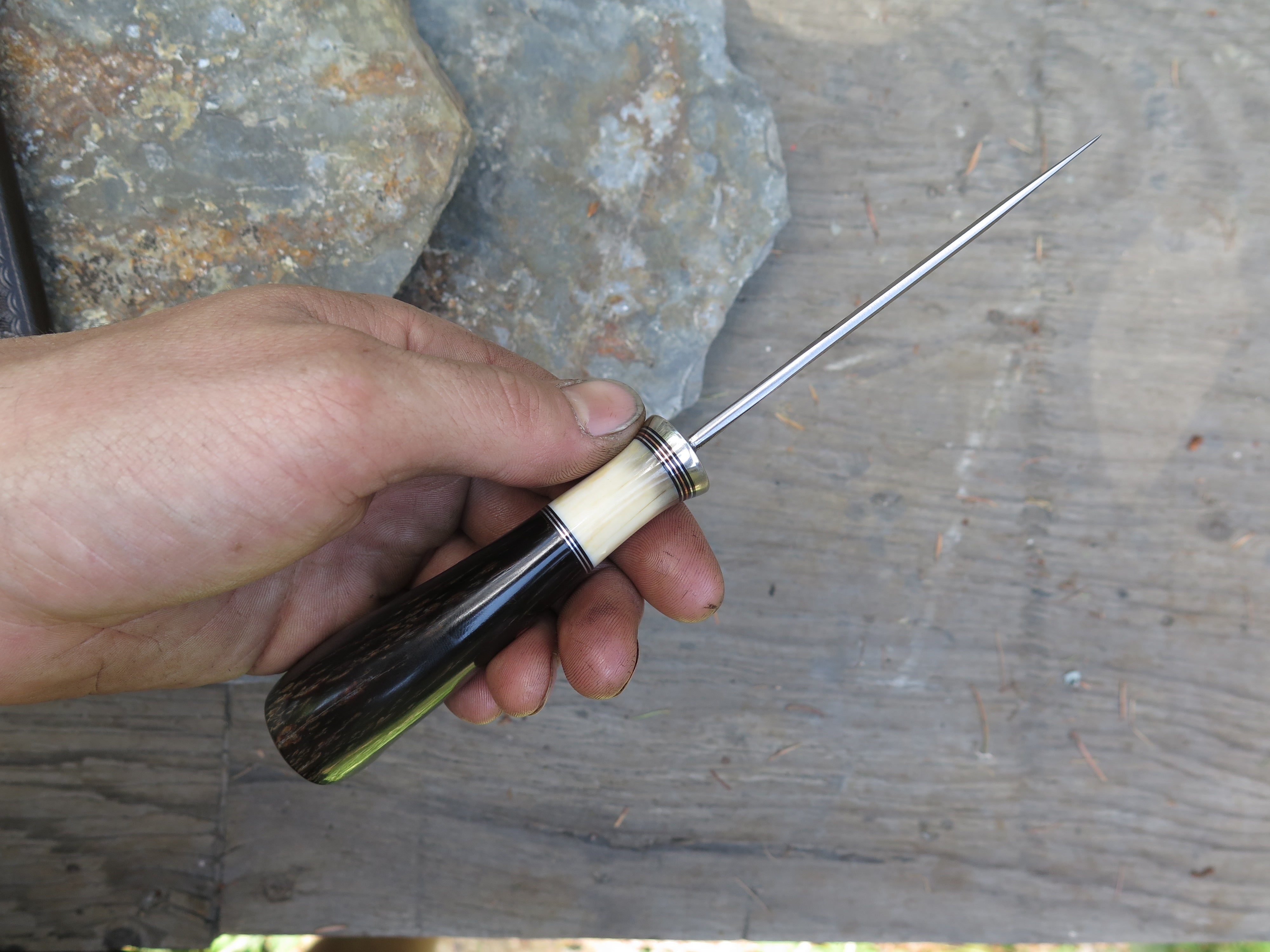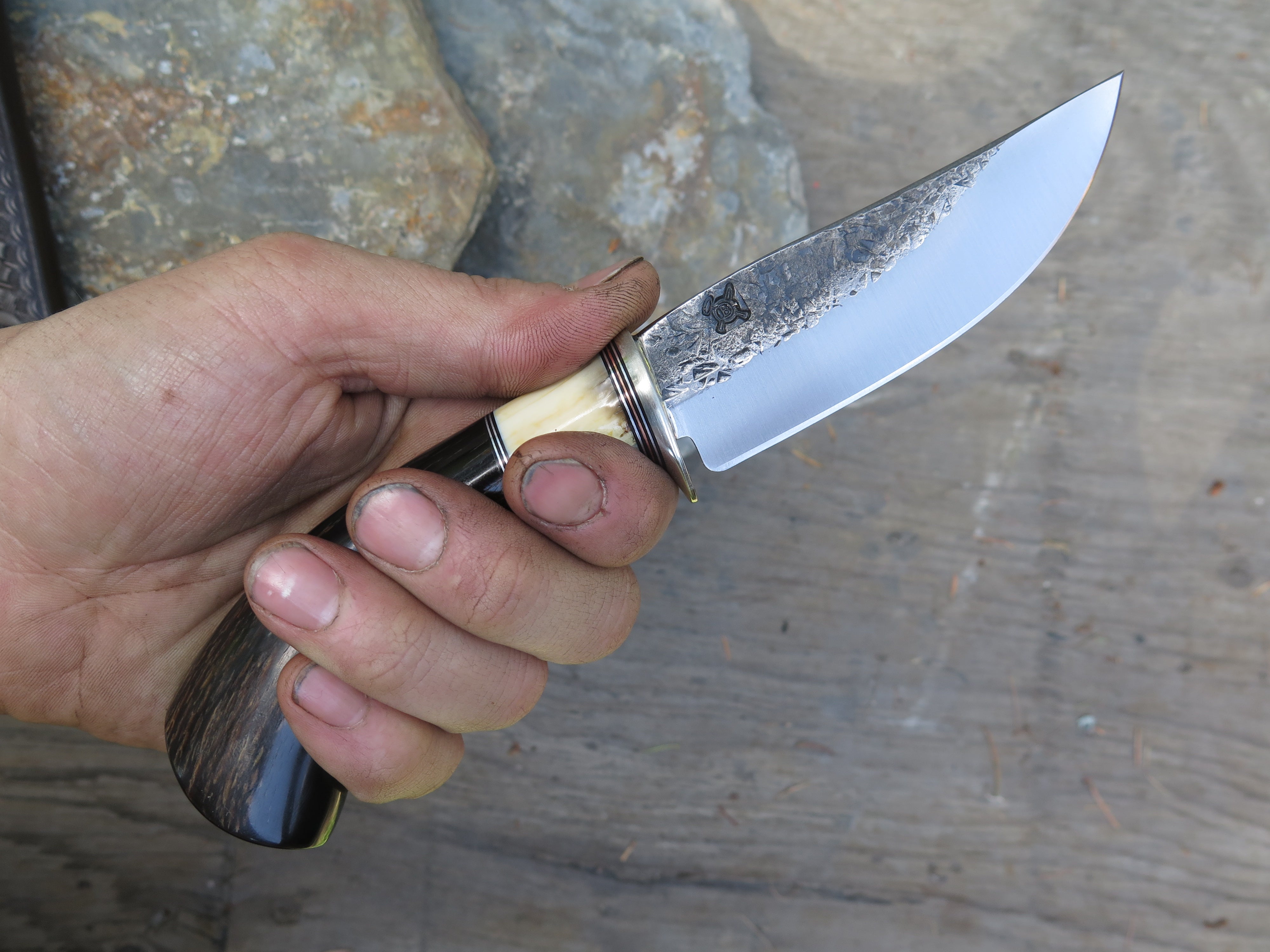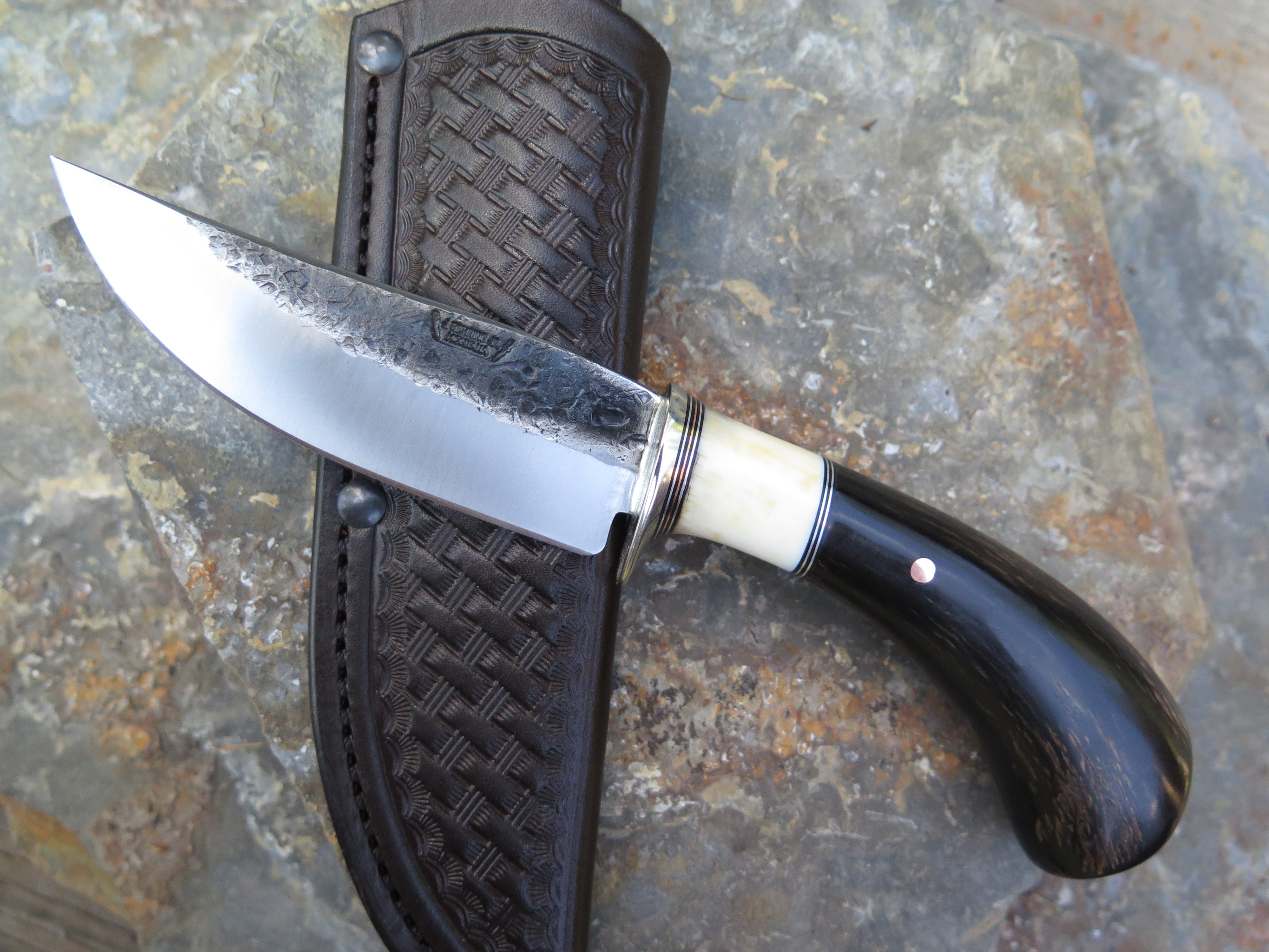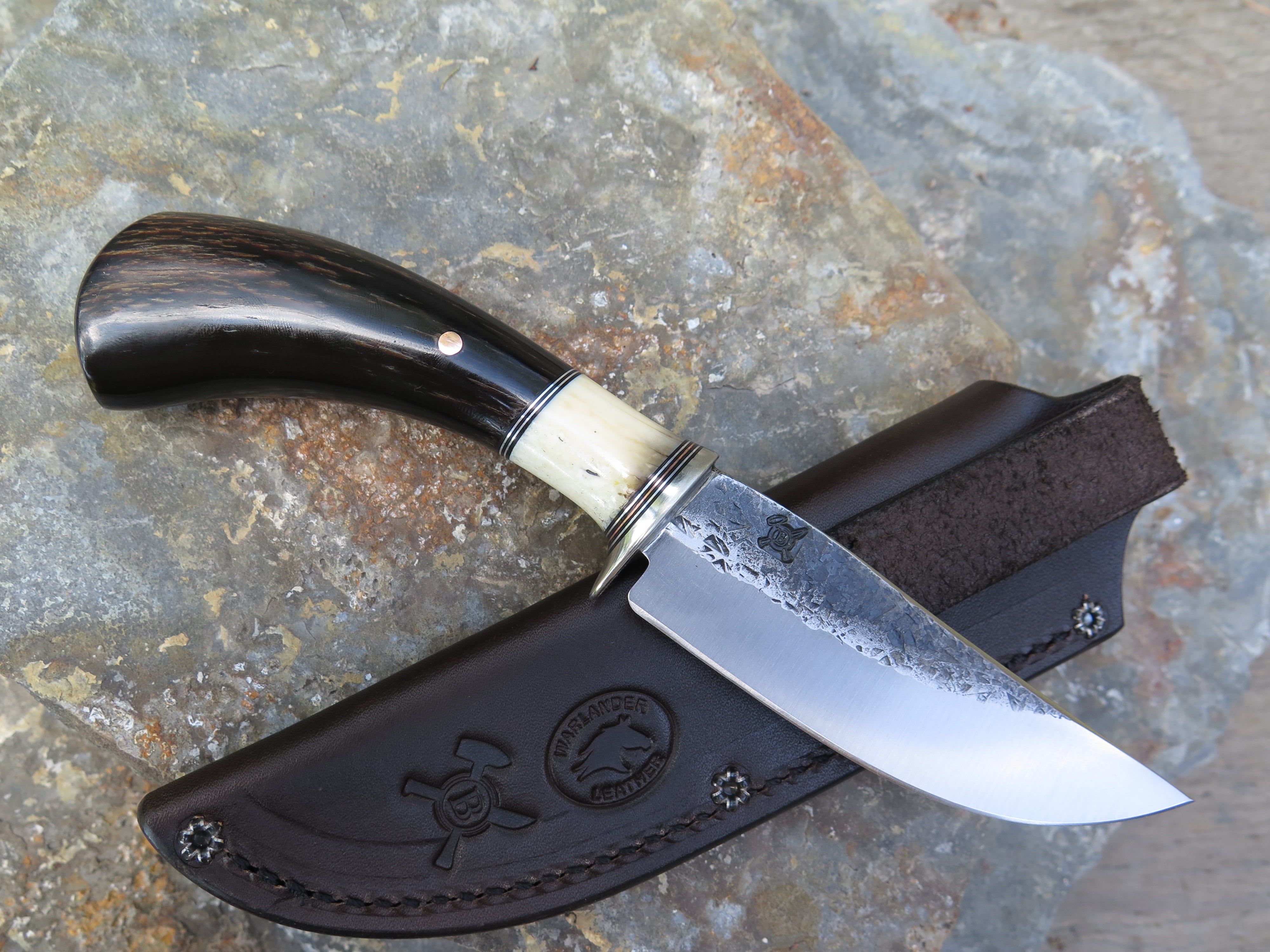 This beautiful new Hunter from Behring Made© is hand forged from 1/8" thick high carbon 01 tool steel and it measures 4" from tip to guard with a razor sharp hollow grind and our hammermark finish. The nickel silver guard is soldered in place above black fiber, copper, aluminum and fossil walrus spacers as well as an African water buffalo horn handle that is pinned with copper. The overall length measures 8 1/4" and it comes in a basketweave tooled pouch sheath.