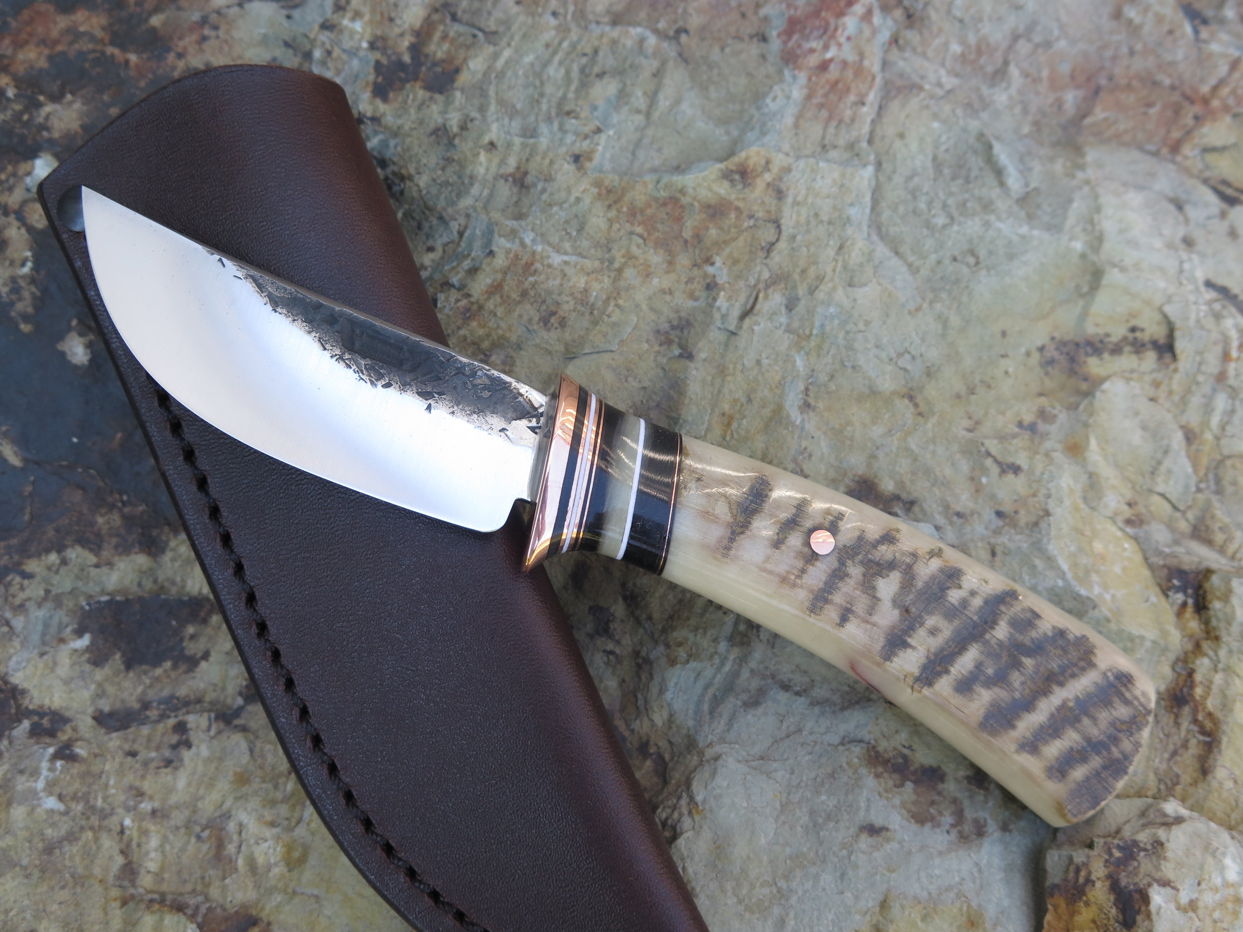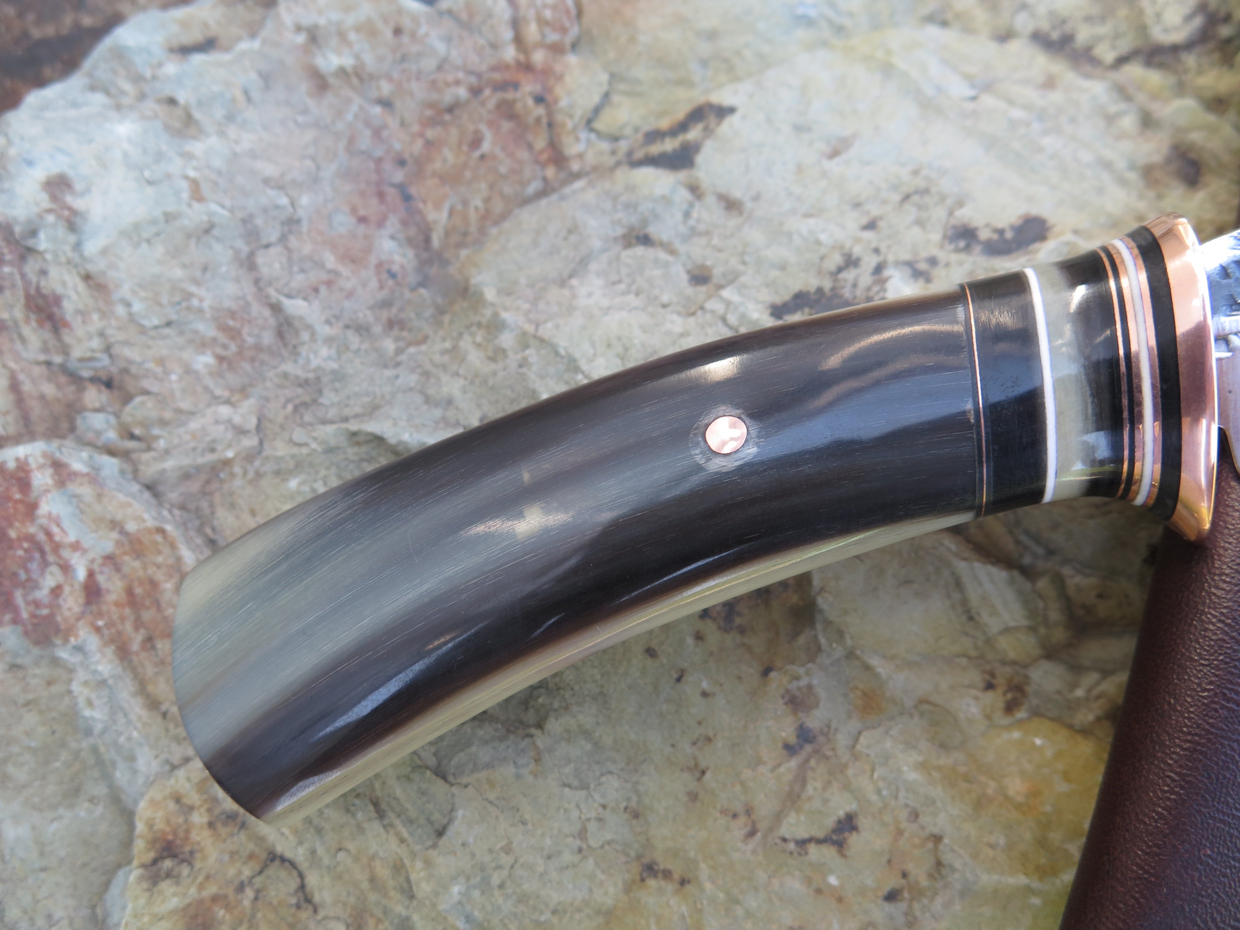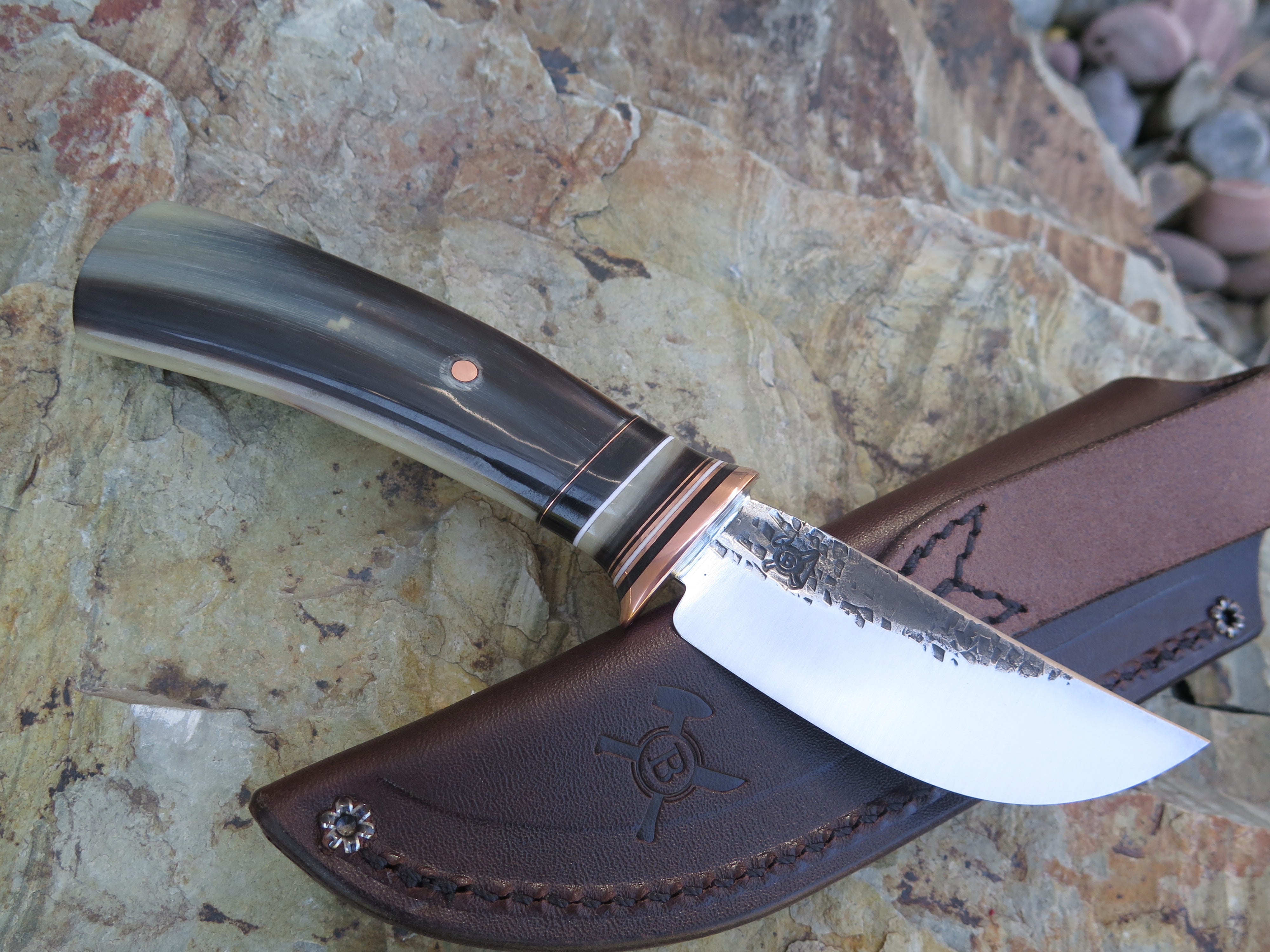This outstanding new Hunter from Behring Made© is hand forged from 1/8" thick high carbon 01 tool steel and it measures 3" from tip to guard with a razor sharp hollow grind and our hammermark finish. The copper guard is soldered in place above black and white fiber, copper and sheep horn spacers- a perfect transition to the highly figured premium Dall's sheep horn handle. We pinned it through the tang with copper and the overall length measures 7 1/4" plus it comes in a leather belt pouch sheath. *Material figure will vary