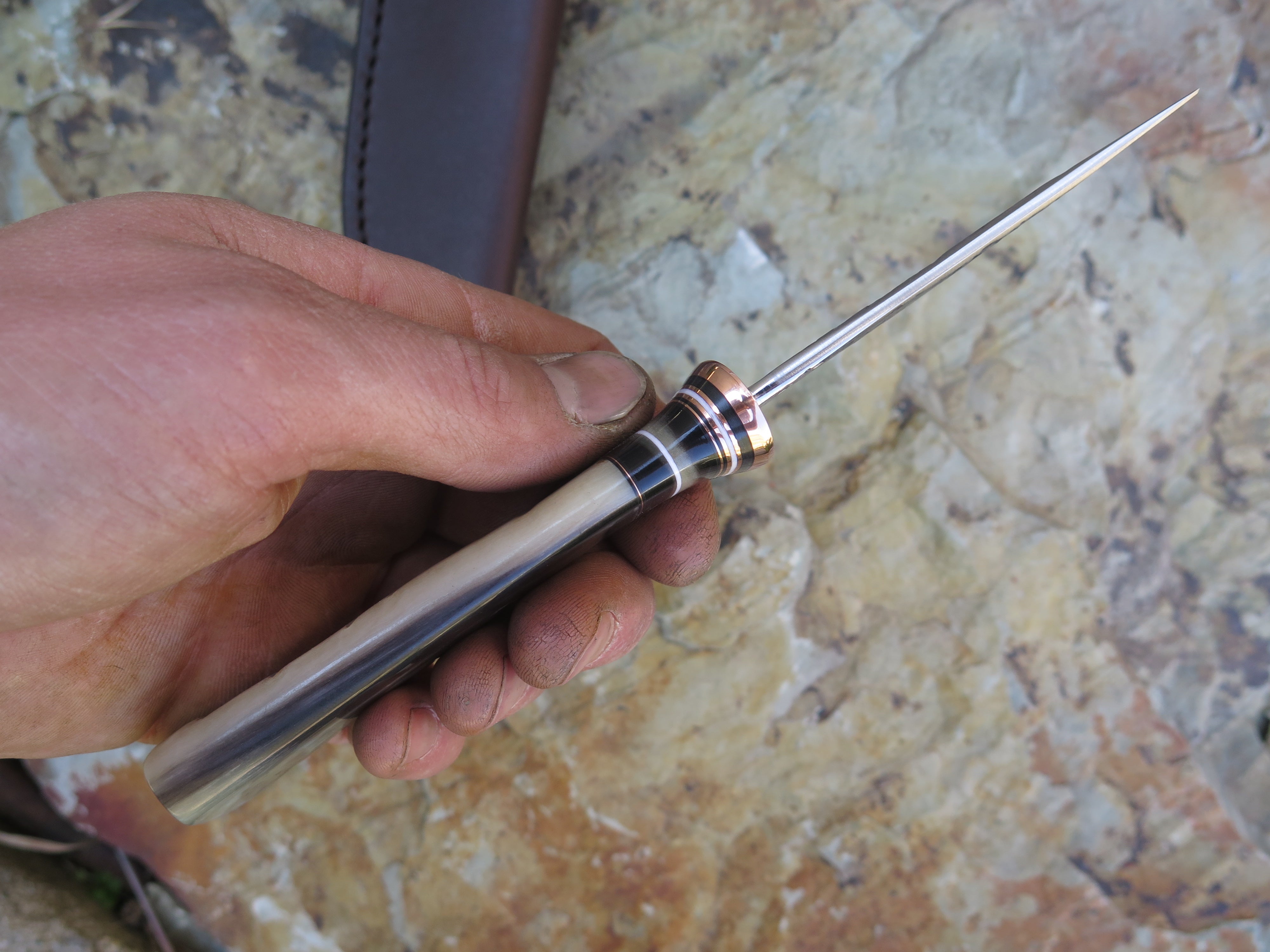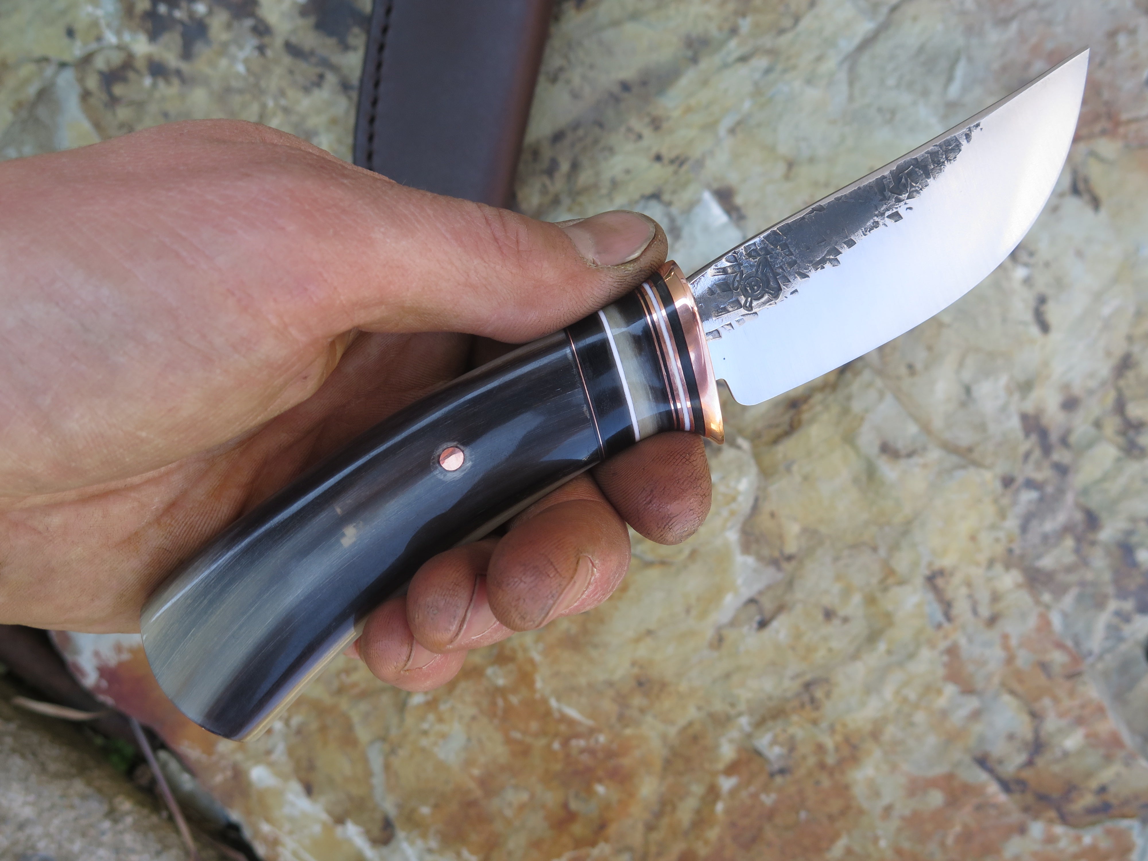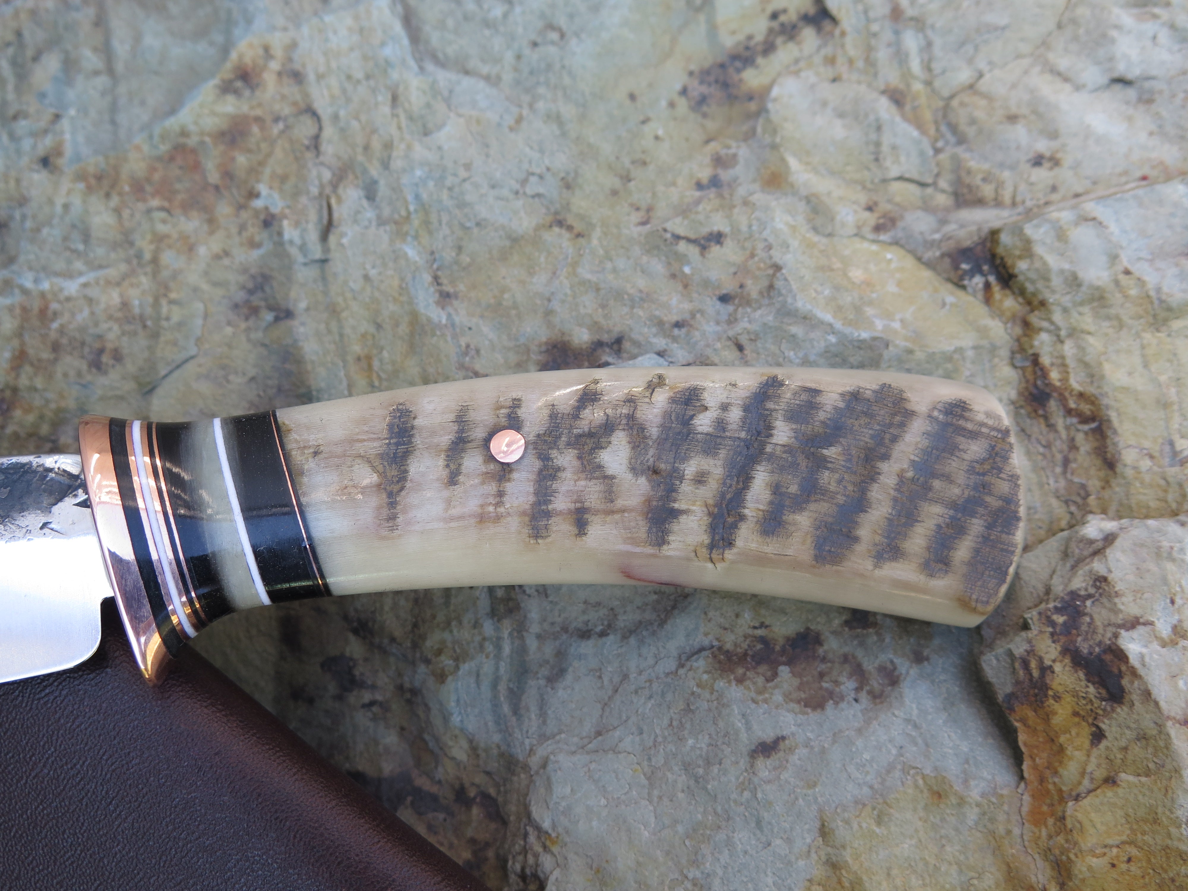 This outstanding new Hunter from Behring Made© is hand forged from 1/8" thick high carbon 01 tool steel and it measures 3" from tip to guard with a razor sharp hollow grind and our hammermark finish. The copper guard is soldered in place above black and white fiber, copper and sheep horn spacers- a perfect transition to the highly figured premium Dall's sheep horn handle. We pinned it through the tang with copper and the overall length measures 7 1/4" plus it comes in a leather belt pouch sheath. *Material figure will vary