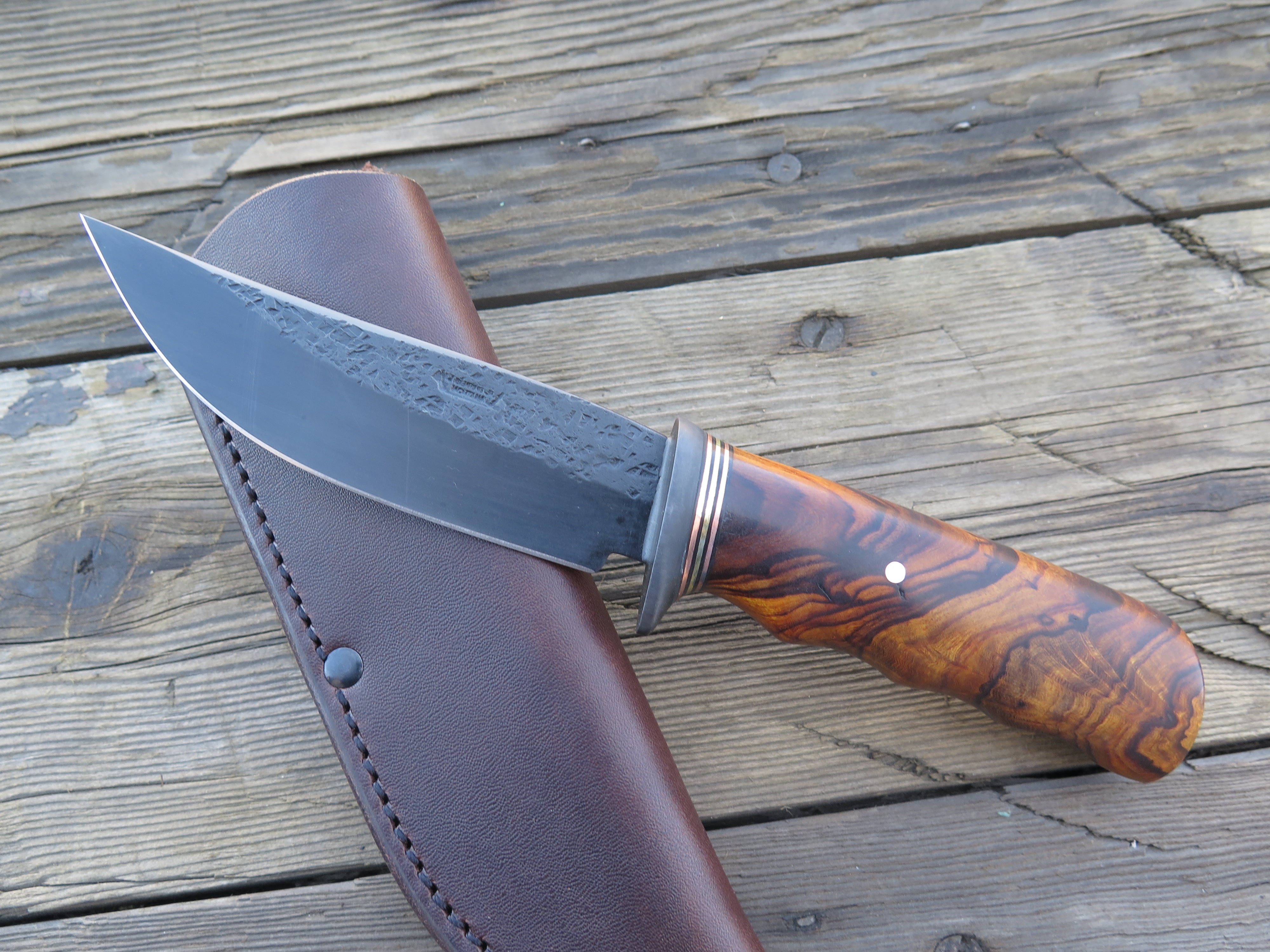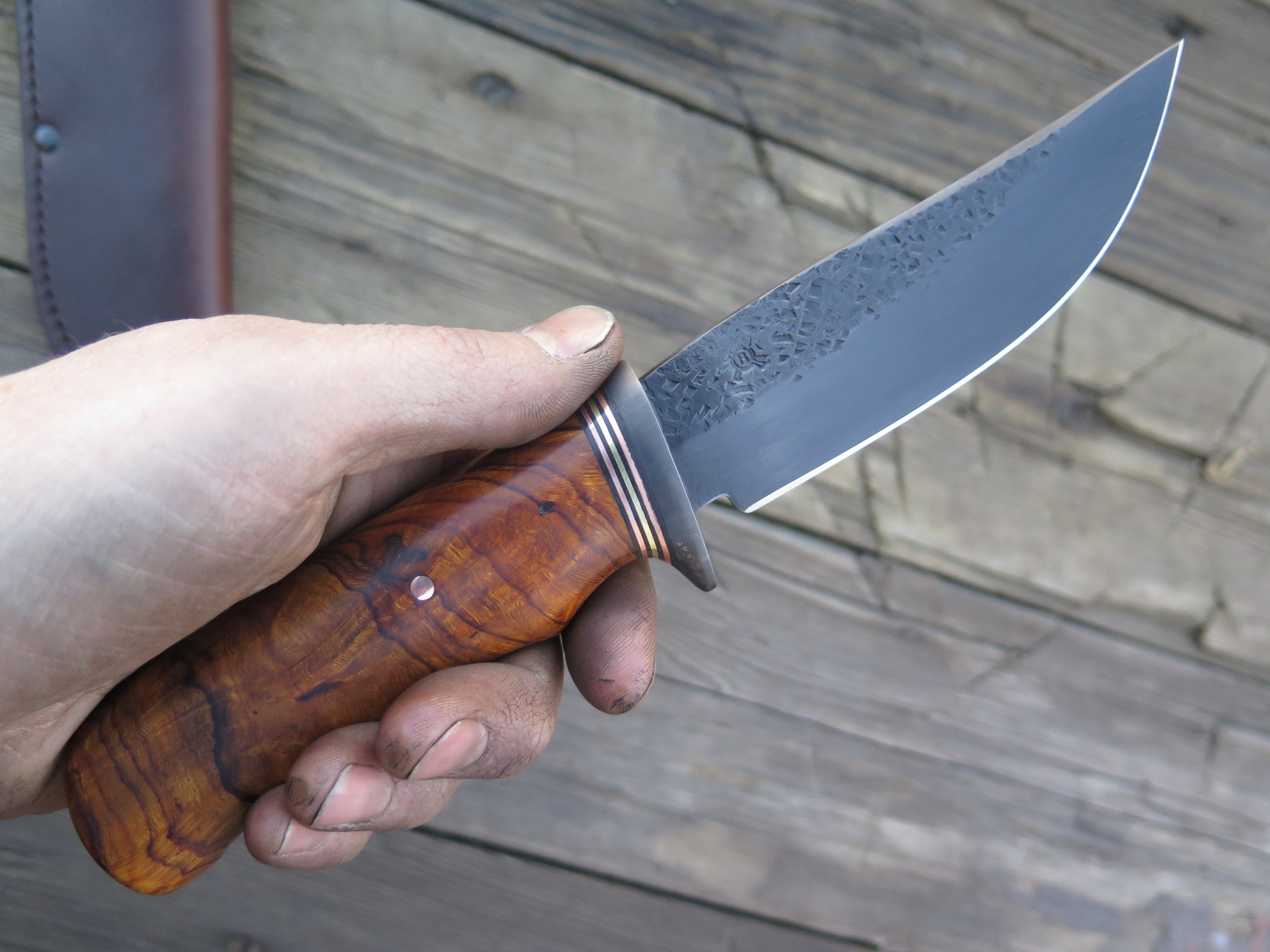 This beautiful new Hunter from Behring Made© is hand forged from 3/16" thick high carbon 01 tool steel and it measures 5" from tip to guard with a razor sharp hollow grind with our hammermark finish. The blued steel guard is soldered in place above black fiber, copper and brass spacers as well as a beautiful desert ironwood burl handle that's pinned through the tang with copper. The overall length measures 9 3/8" and it comes in the shown classic belt pouch sheath.
