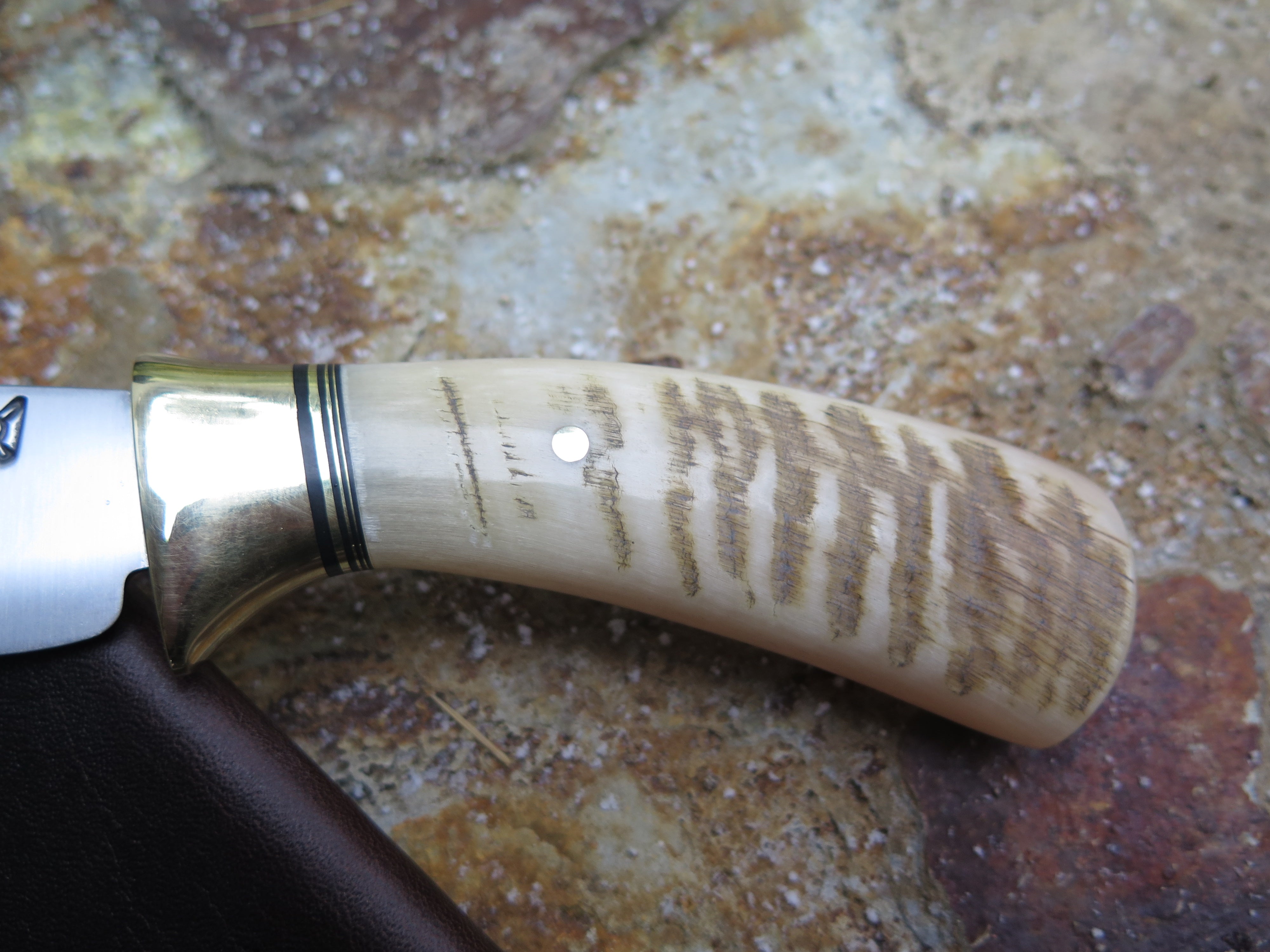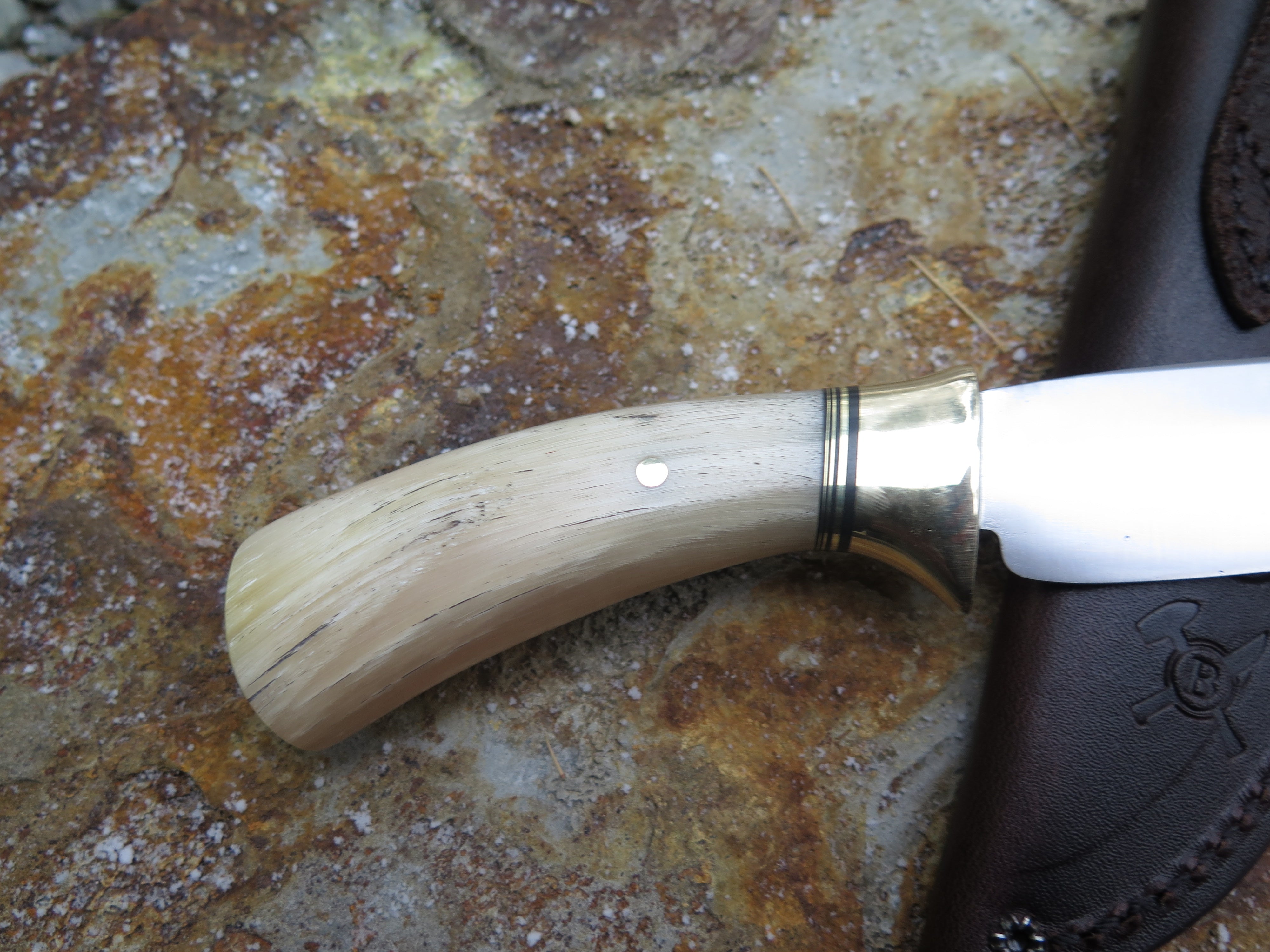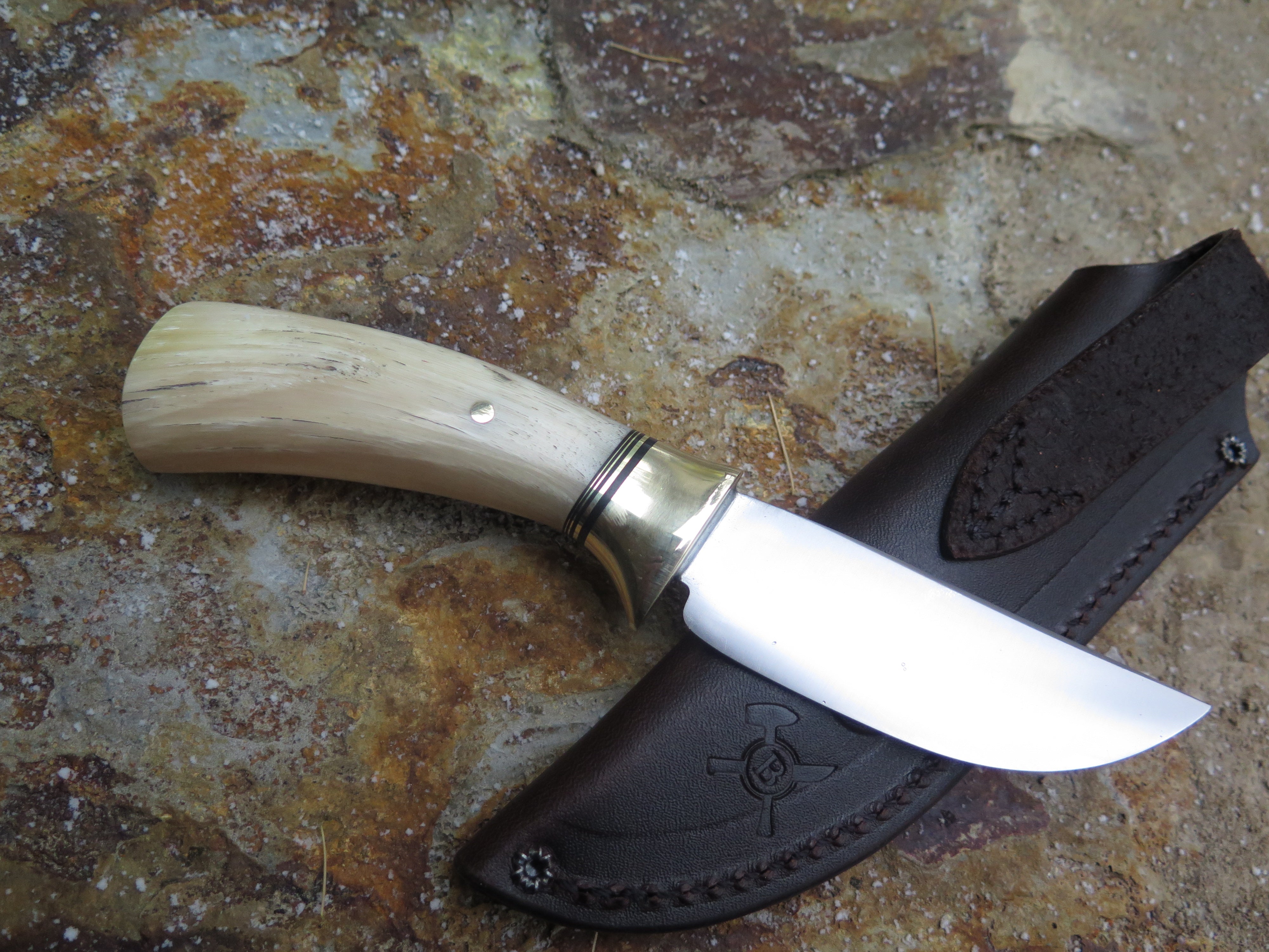 This beautiful Hunter from Behring Made© is hand forged from 1/8" thick high carbon 01 tool steel and it measures 3 3/4" from tip to guard with a razor sharp convex grind. The brass collar is soldered in place above a gradient black fiber and brass spacer stack as well as a premium sheep horn handle that's pinned through the tang with brass. The overall length measures 7 3/4" and it comes in a classic leather belt pouch sheath.