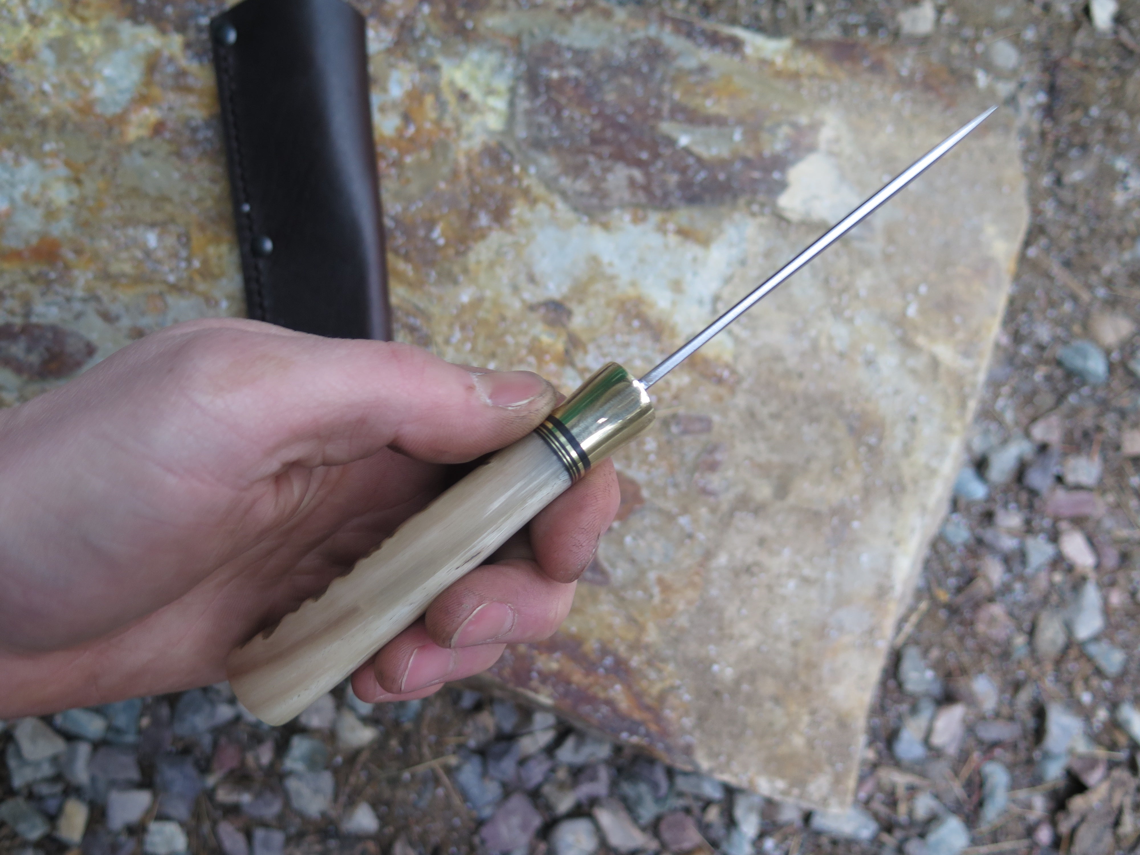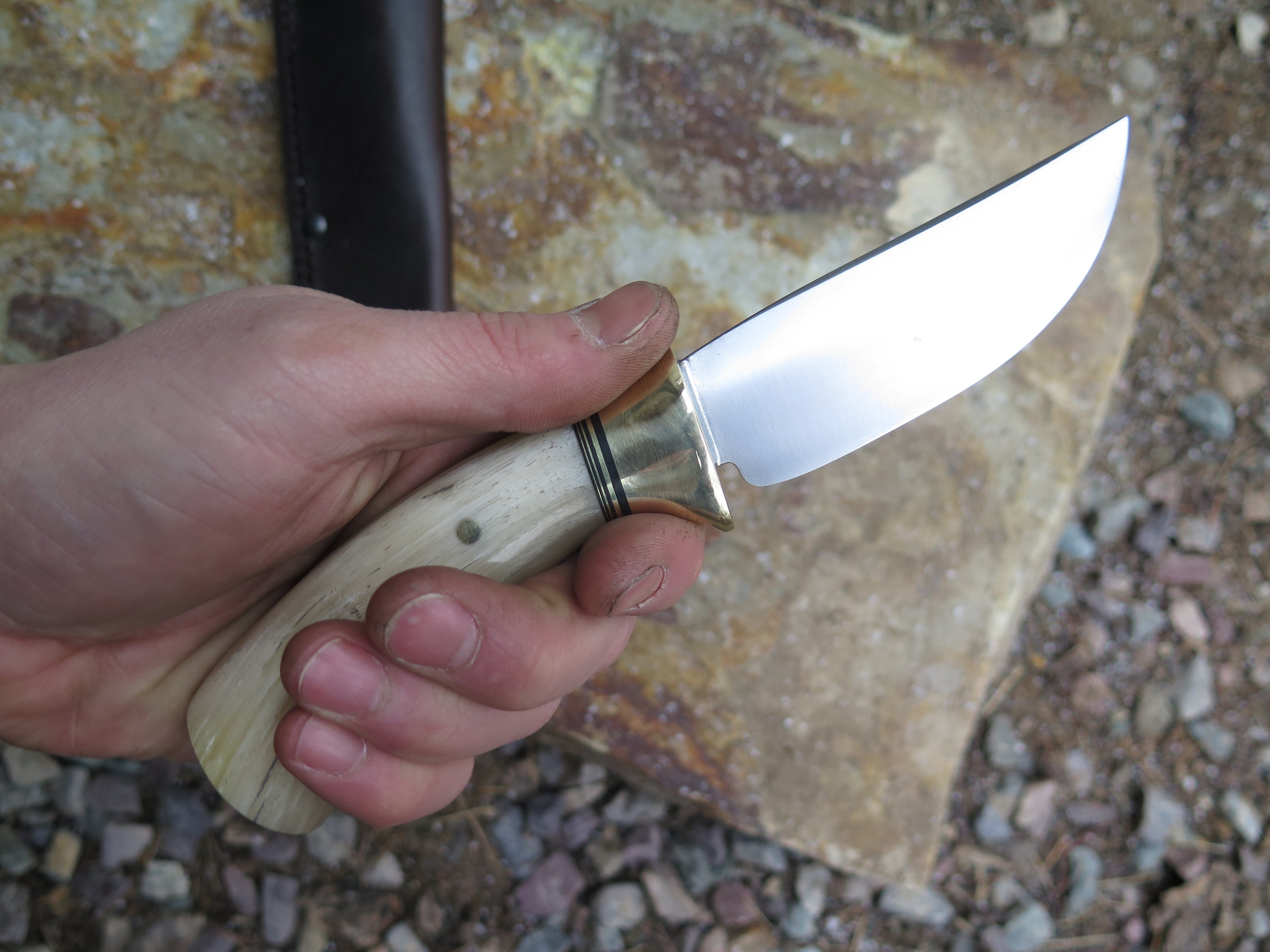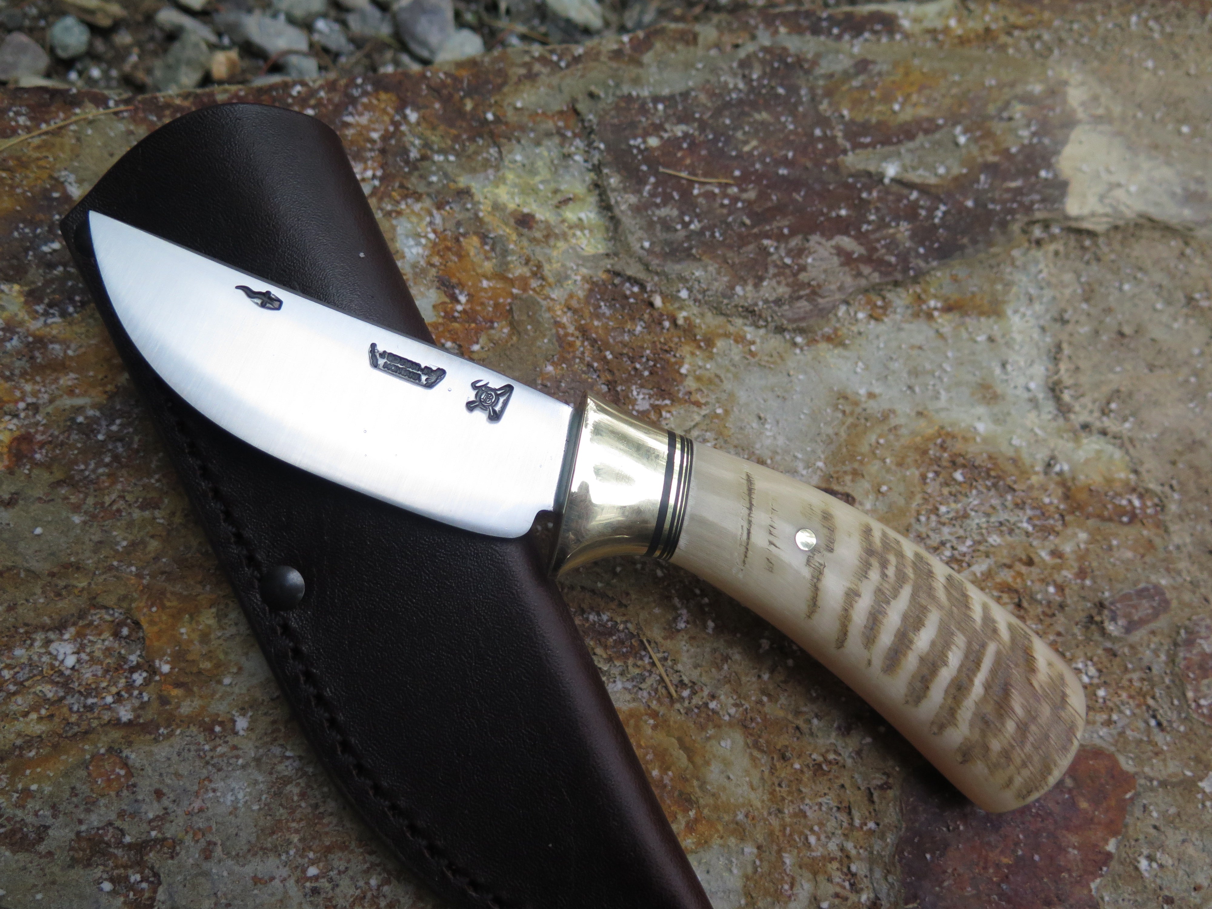 This beautiful Hunter from Behring Made© is hand forged from 1/8" thick high carbon 01 tool steel and it measures 3 3/4" from tip to guard with a razor sharp convex grind. The brass collar is soldered in place above a gradient black fiber and brass spacer stack as well as a premium sheep horn handle that's pinned through the tang with brass. The overall length measures 7 3/4" and it comes in a classic leather belt pouch sheath.