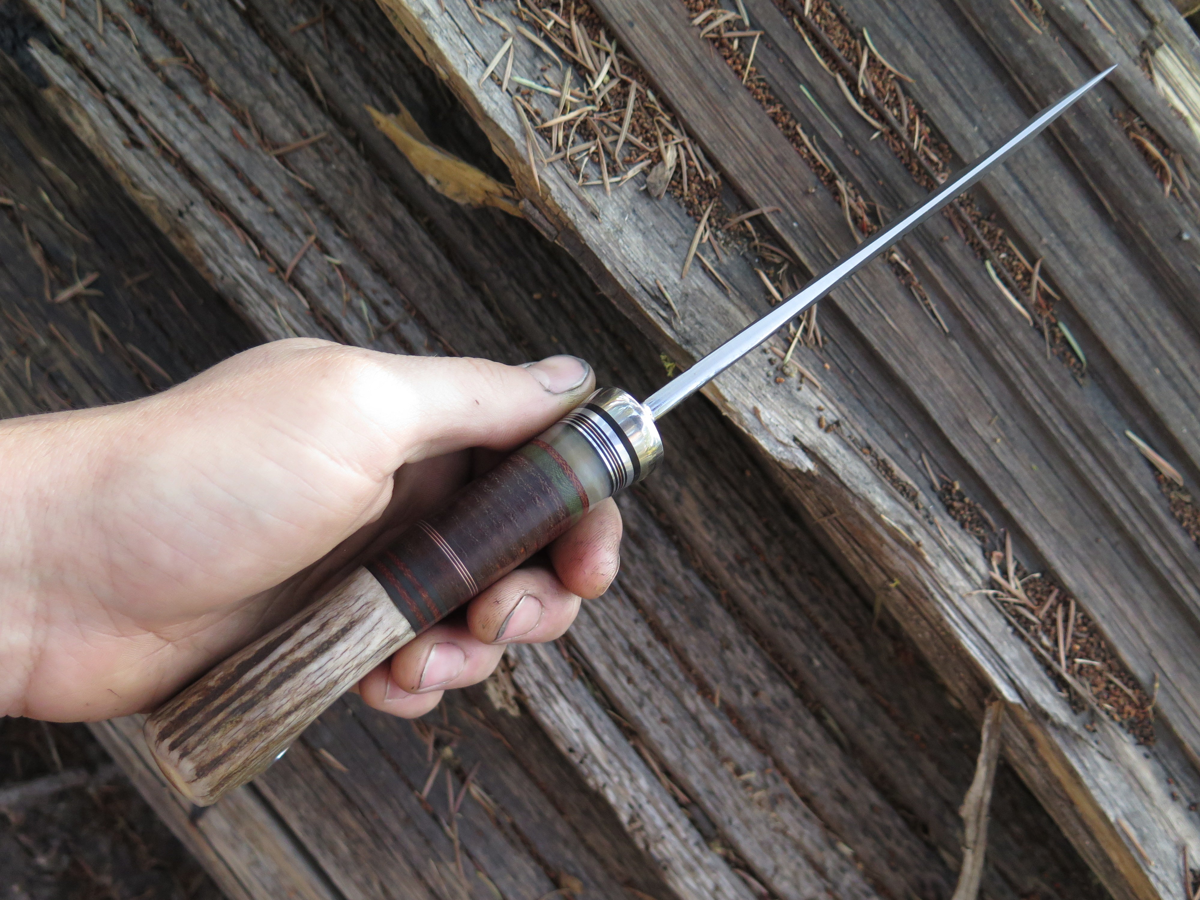 This incredible new XL Hunter from Behring Made© is hand forged from 13/64" thick 5160 spring steel and it measures a whopping 6" from tip to guard with a razor sharp hollow grind and our hammermark finish. The nickel silver guard is soldered in place above black fiber, green micarta, horsehide leather, musk ox, aluminum, copper and brown micarta spacers as well as a shiras moose paddle butt that's pinned and thonged with aluminum. The overall length measures 11" and it comes in a classic belt pouch sheath. You may never need another knife!