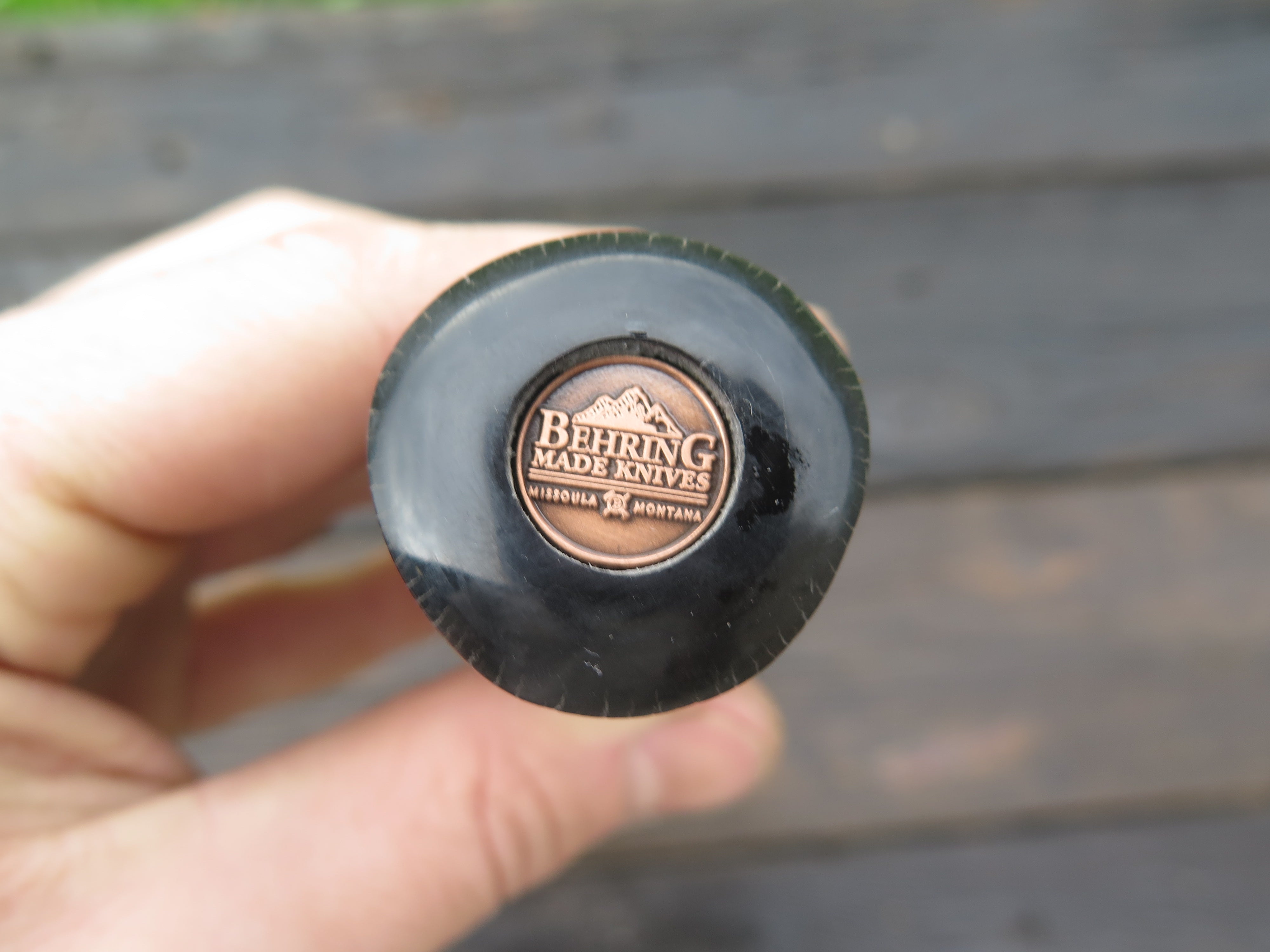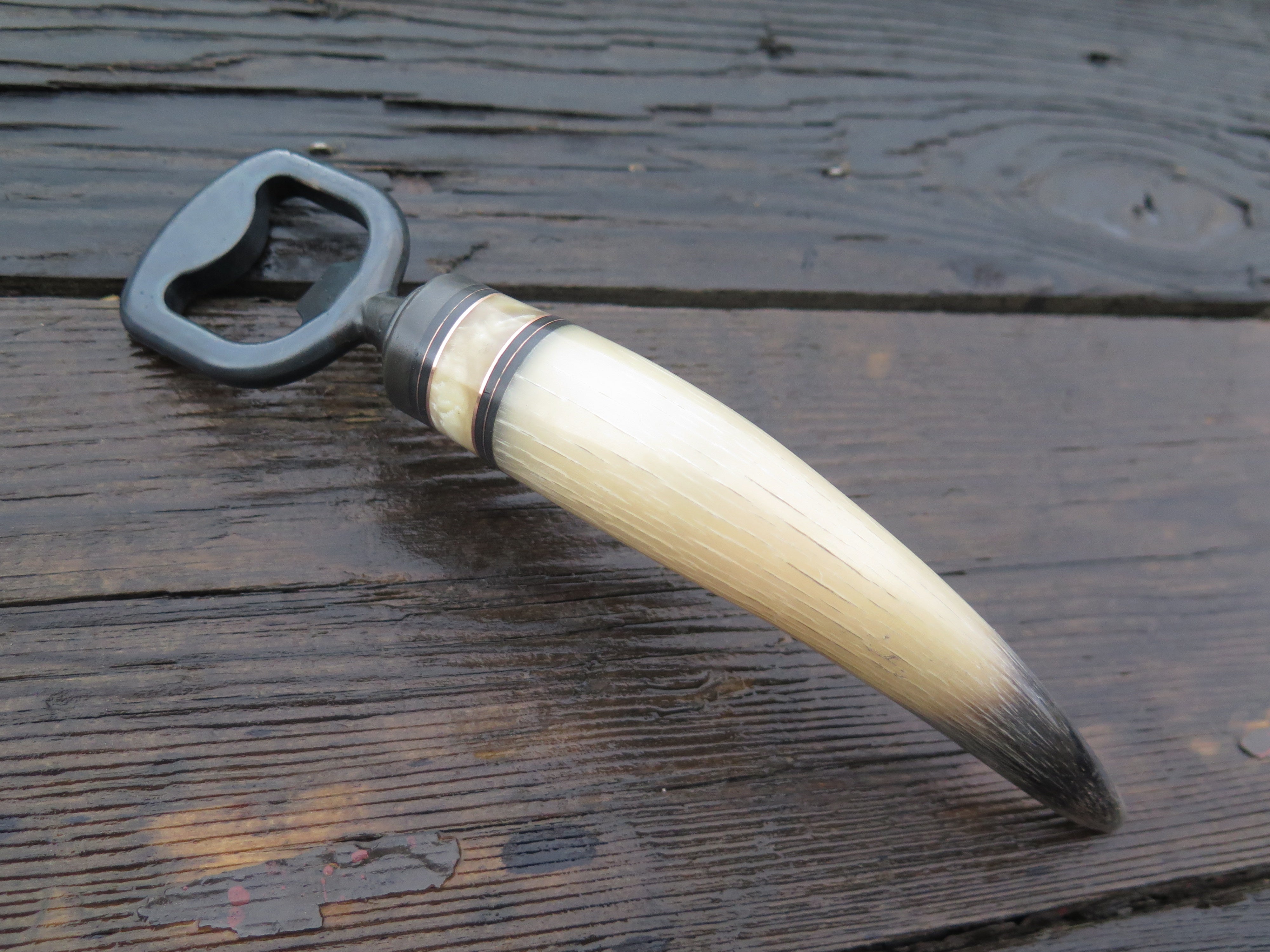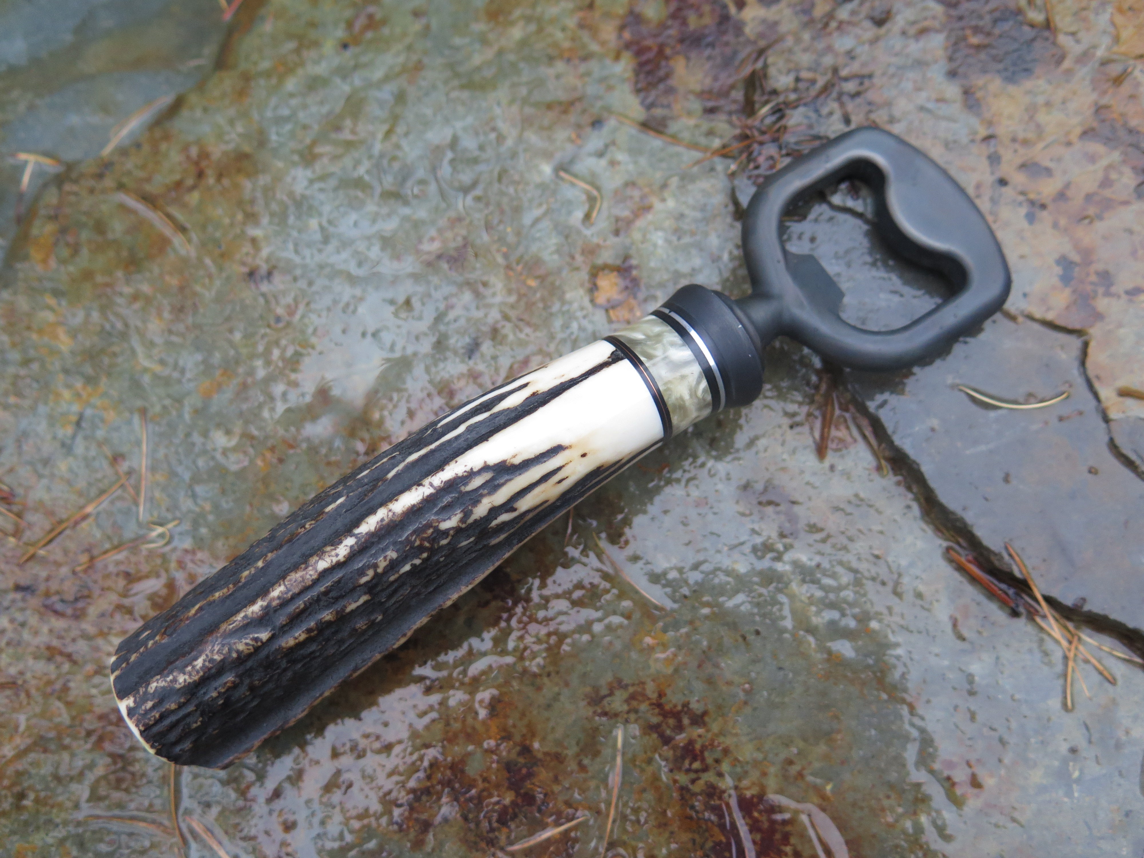 There's really no better compliment to your beer than the Behring Made© bottle opener. We soldered the blued steel guard in place above black fiber, copper and musk ox boss spacers that join a beautiful musk ox tine with a beautiful range of blacks to cream tones. Overall length measures 7 3/8" and it comes in a Behring Made© zipper case.