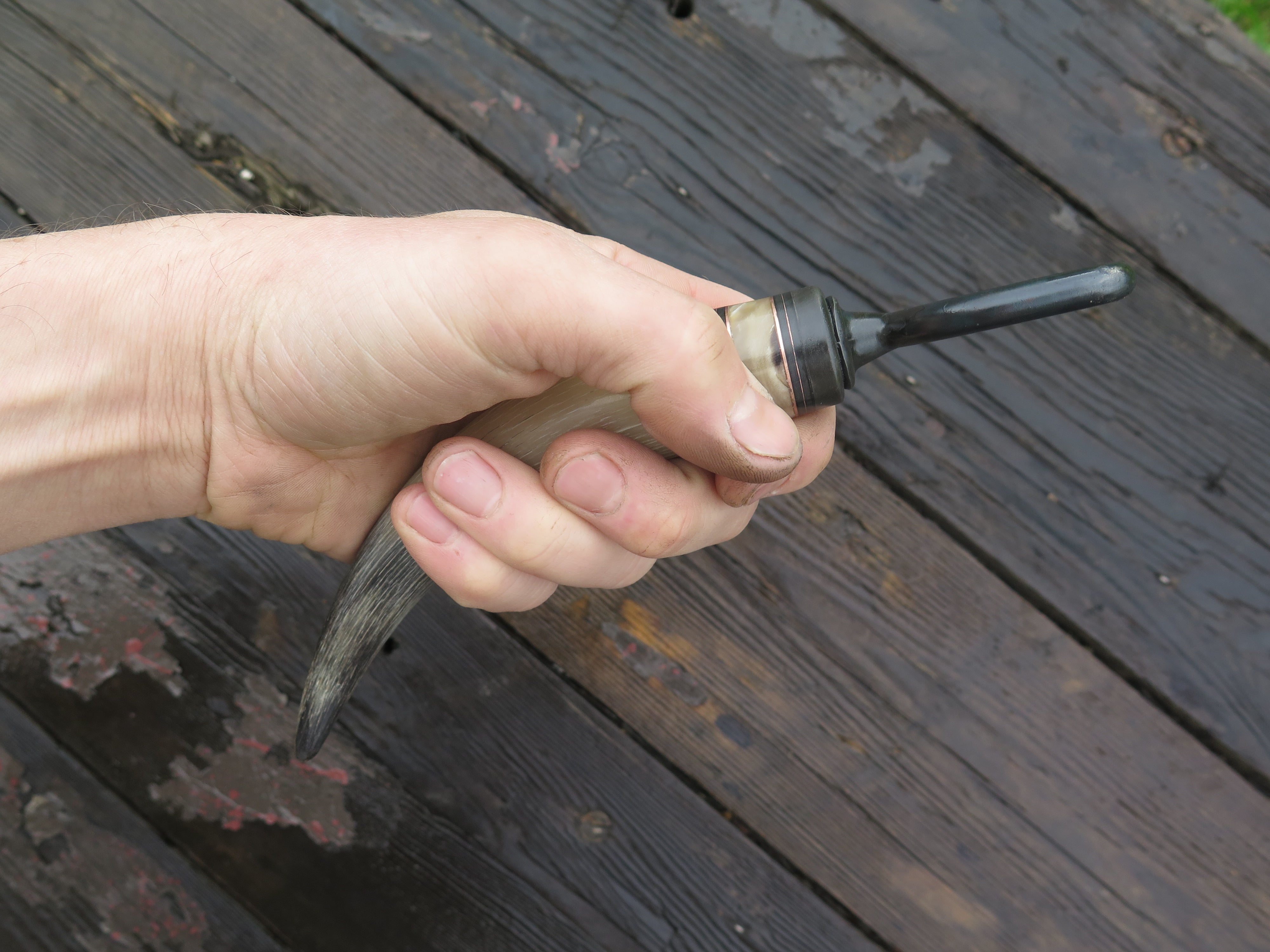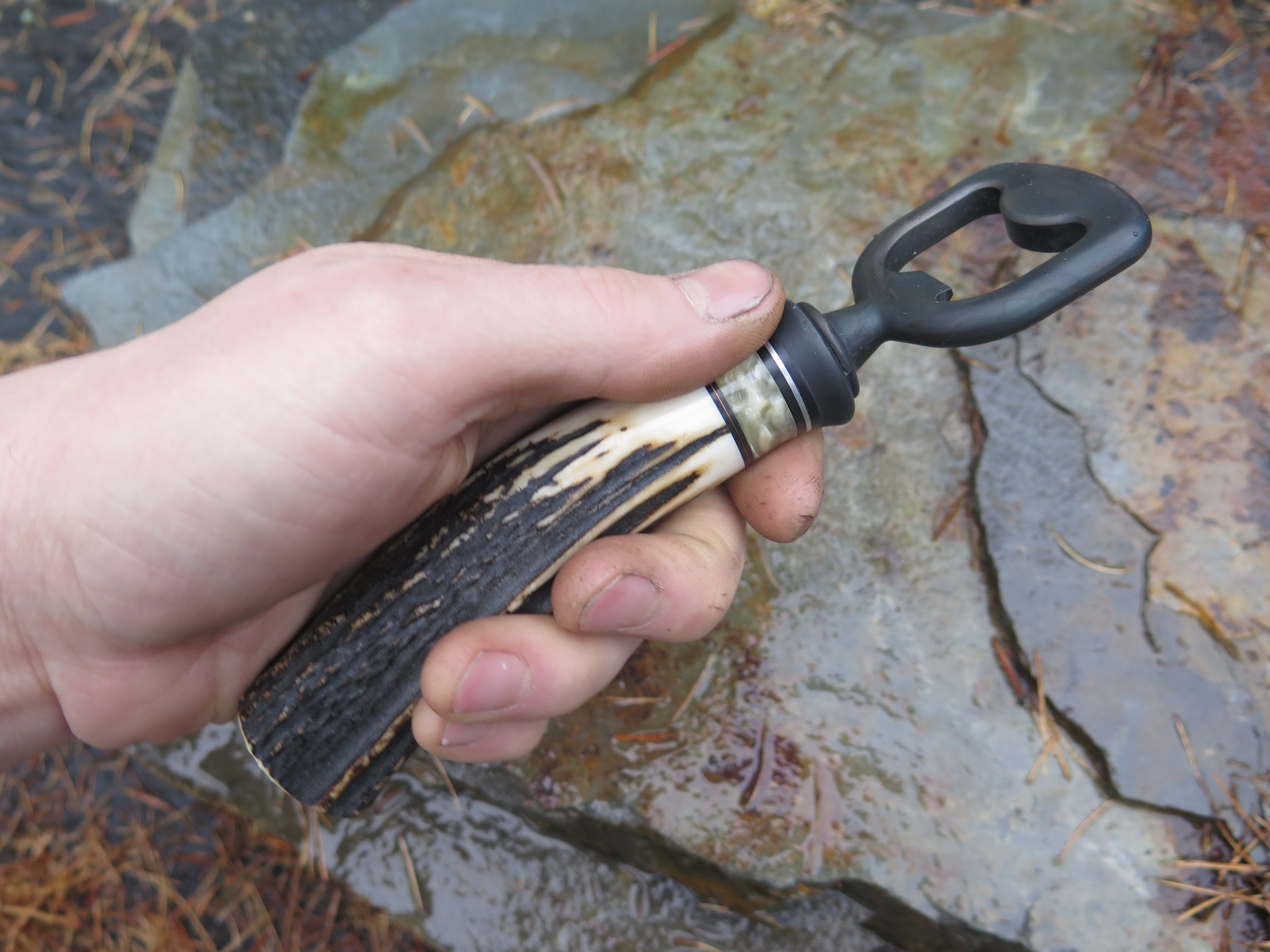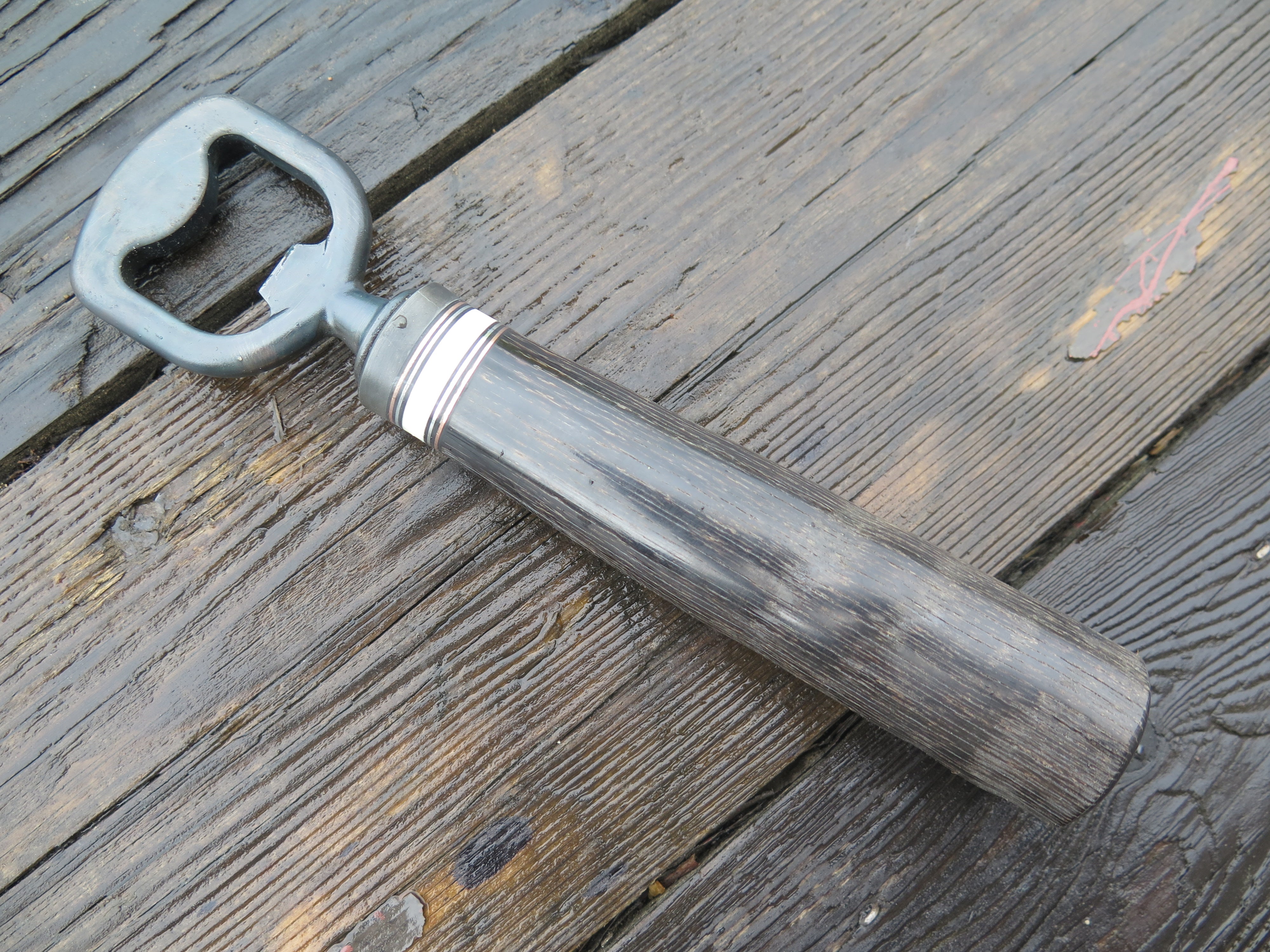 There's really no better compliment to your beer than the Behring Made© bottle opener. We soldered the blued steel guard in place above black fiber, copper and musk ox boss spacers that join a beautiful musk ox tine with a beautiful range of blacks to cream tones. Overall length measures 7 3/8" and it comes in a Behring Made© zipper case.