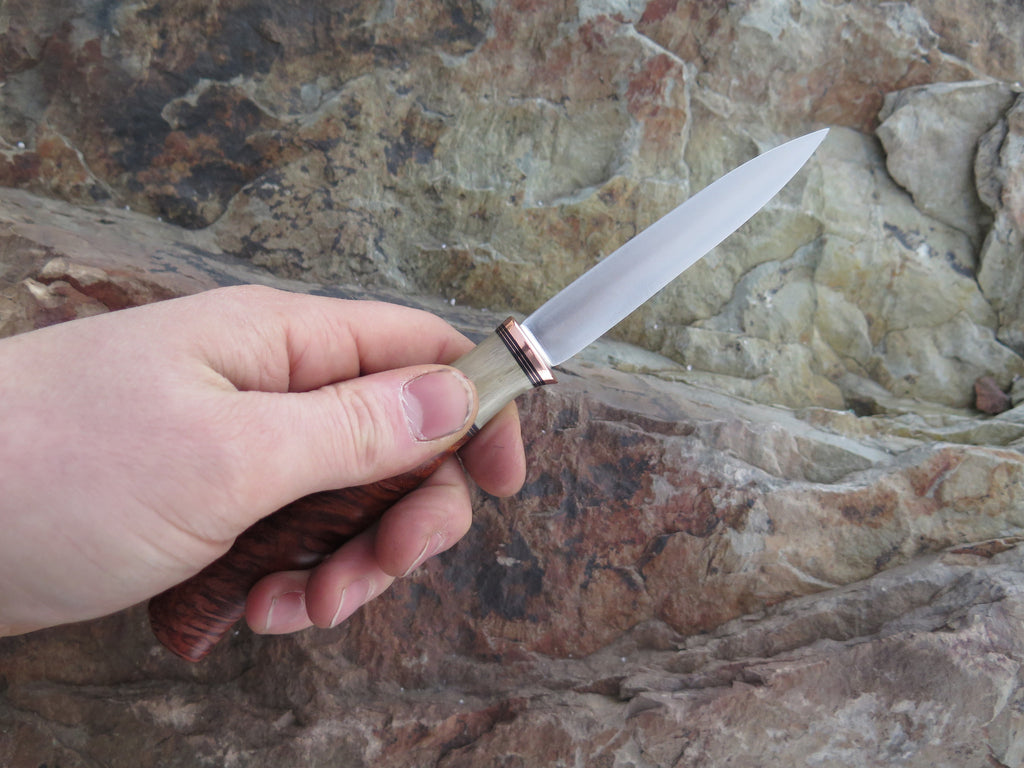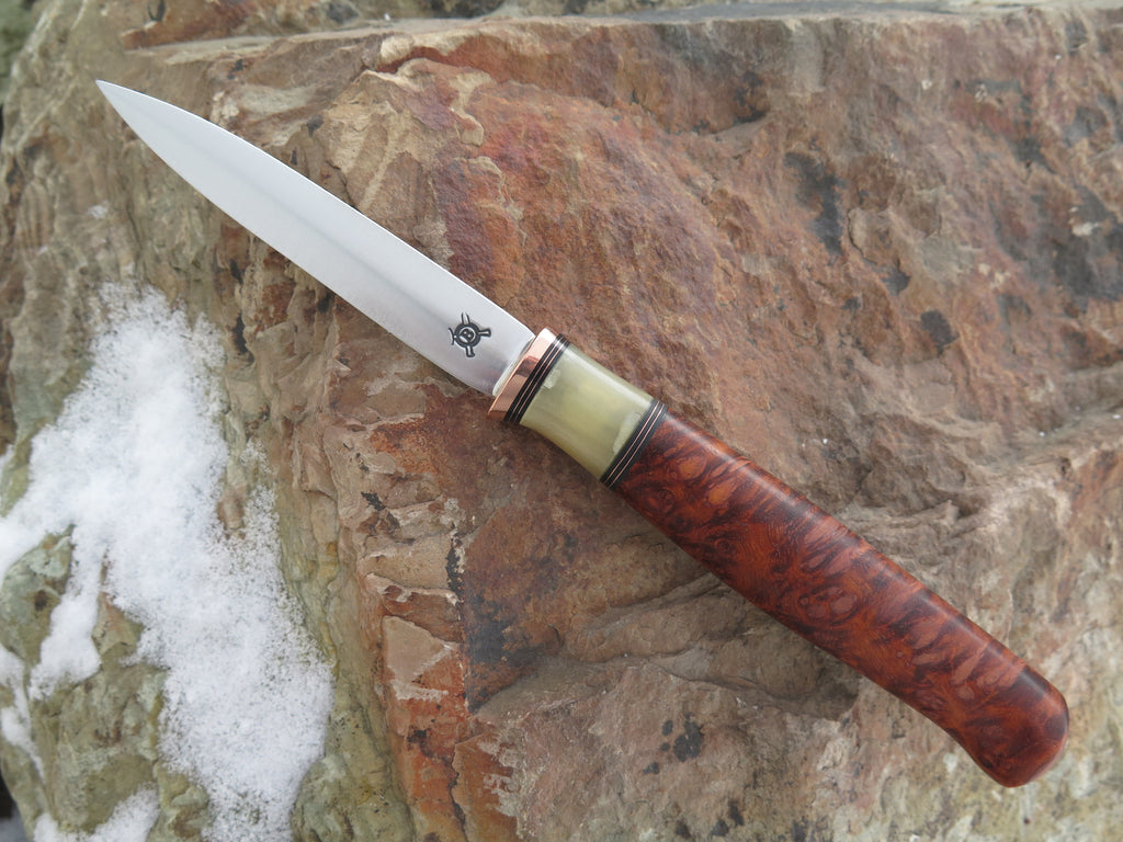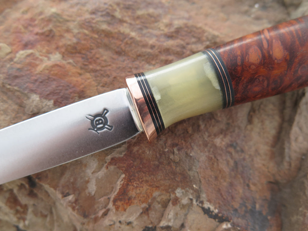 This remarkable Behring Made Letter Opener is entirely handmade starting with the 440c stainless steel blade that measures 3 1/2" from tip to guard with a beautiful convex grind. The copper guard is soldered in place above black fiber, copper and musk ox horn spacers. The handle is incredible California Redwood burl and the overall length measures just under 8 1/4", plus it comes in our Behring Made zipper case.