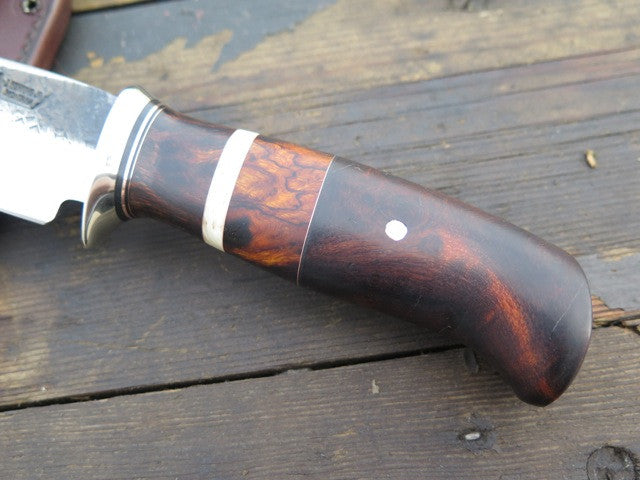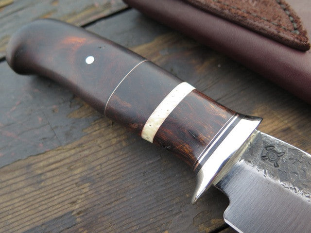 This Ironwood Hunter is a great hunting knife and all over excellent companion. The blade is hand forged high carbon steel and measures 5" from tip to guard with a razor sharp hollow grind and a hammermark finish. The nickel silver guard is soldered in place above black, copper and musk ox boss spacers, as well as three different pieces of truly premium desert ironwood. The overall length measures 9 1/2" from tip to guard and it will come in a Behring Made sheath. Lead time is 6-8 weeks.