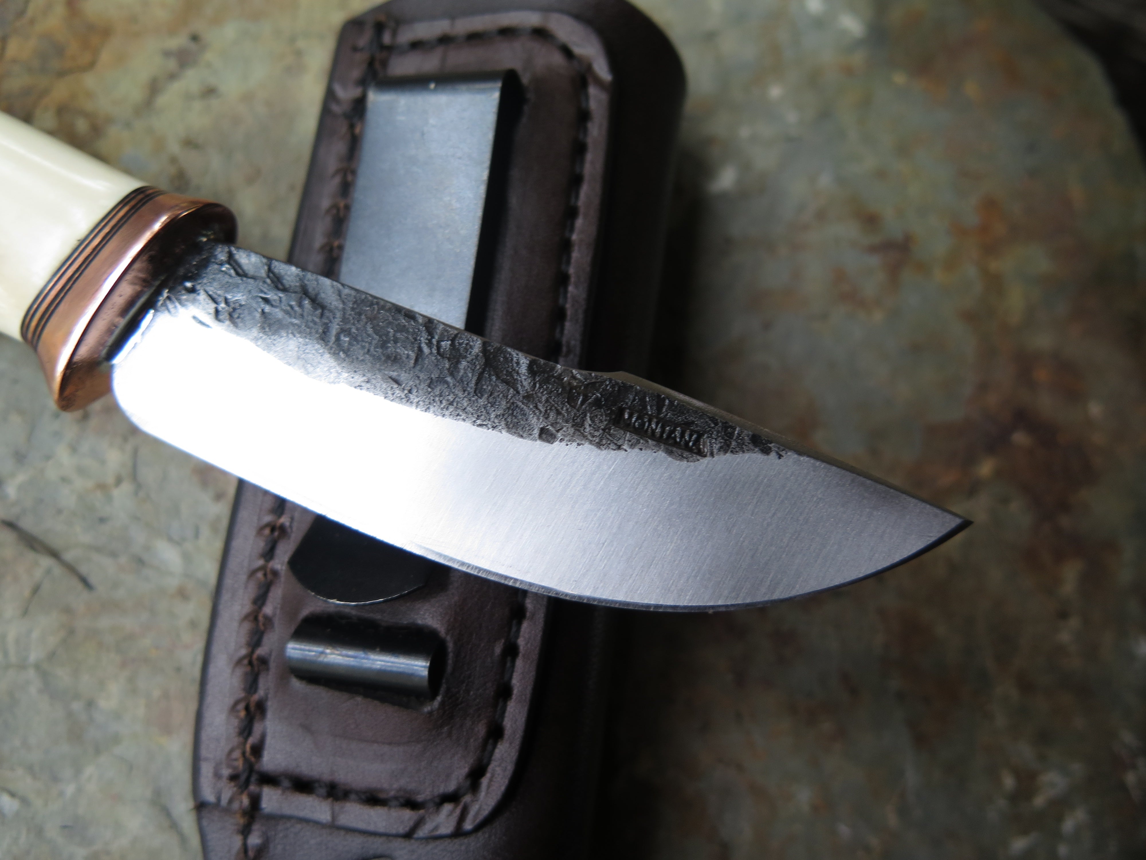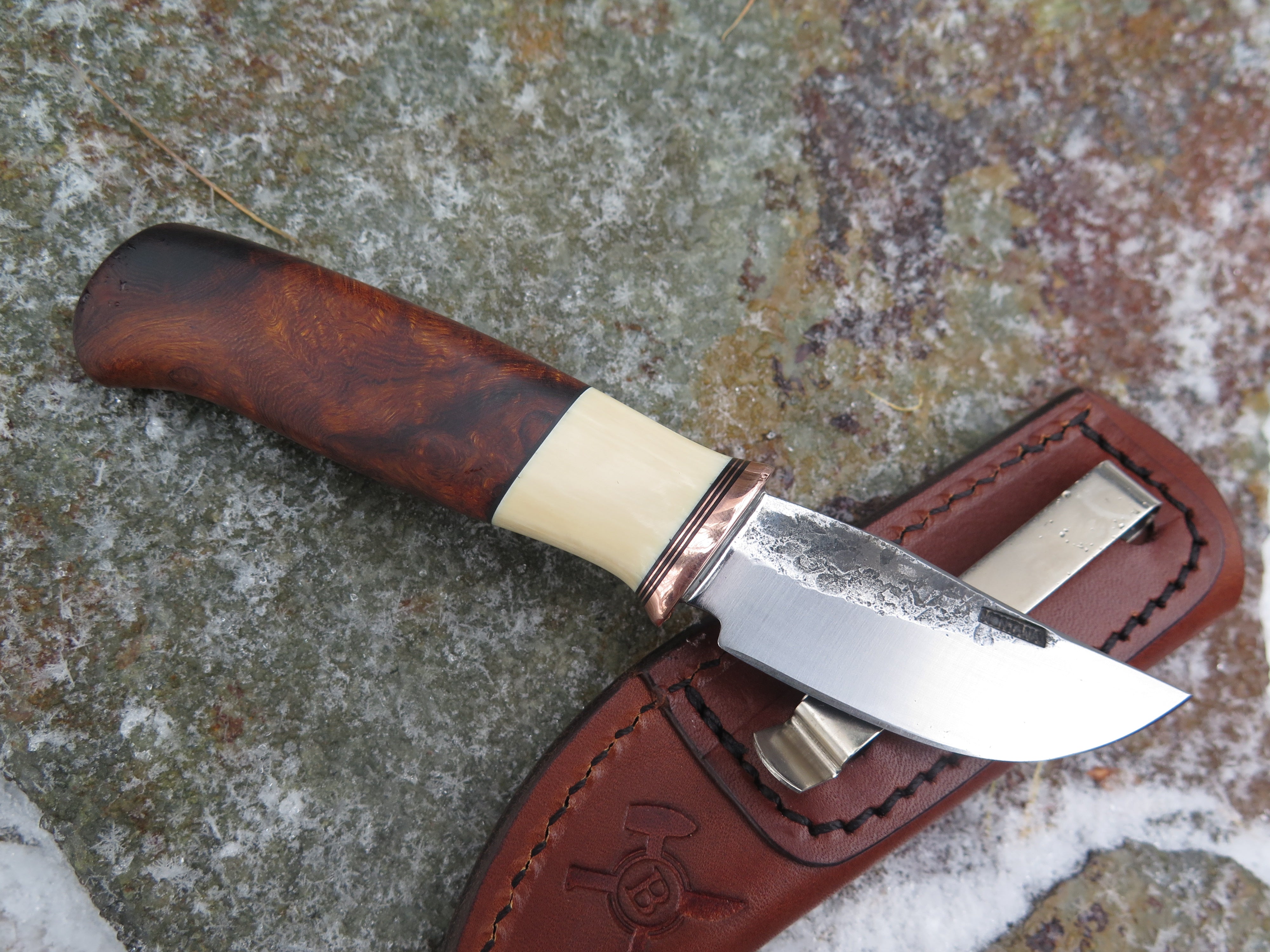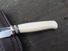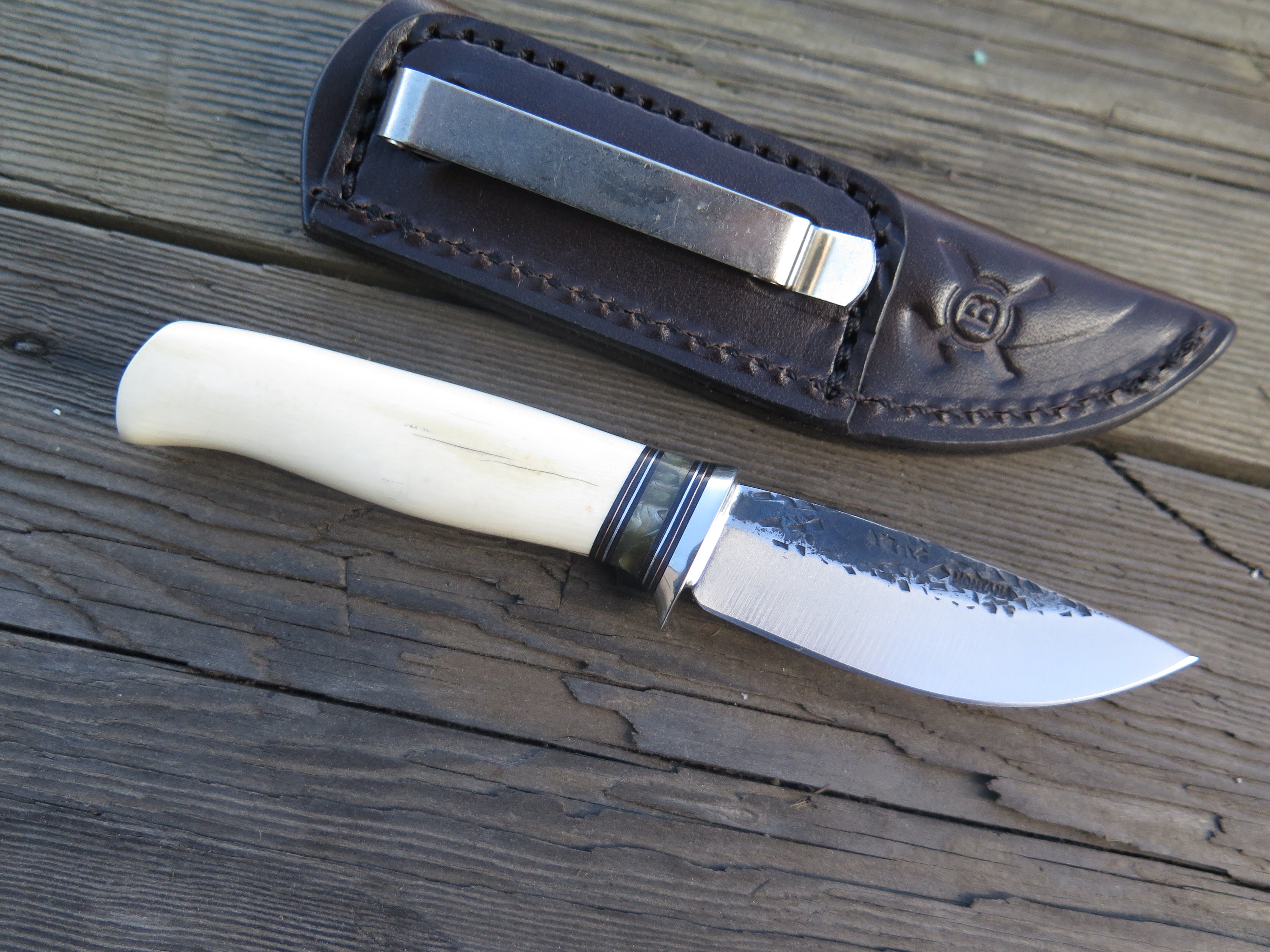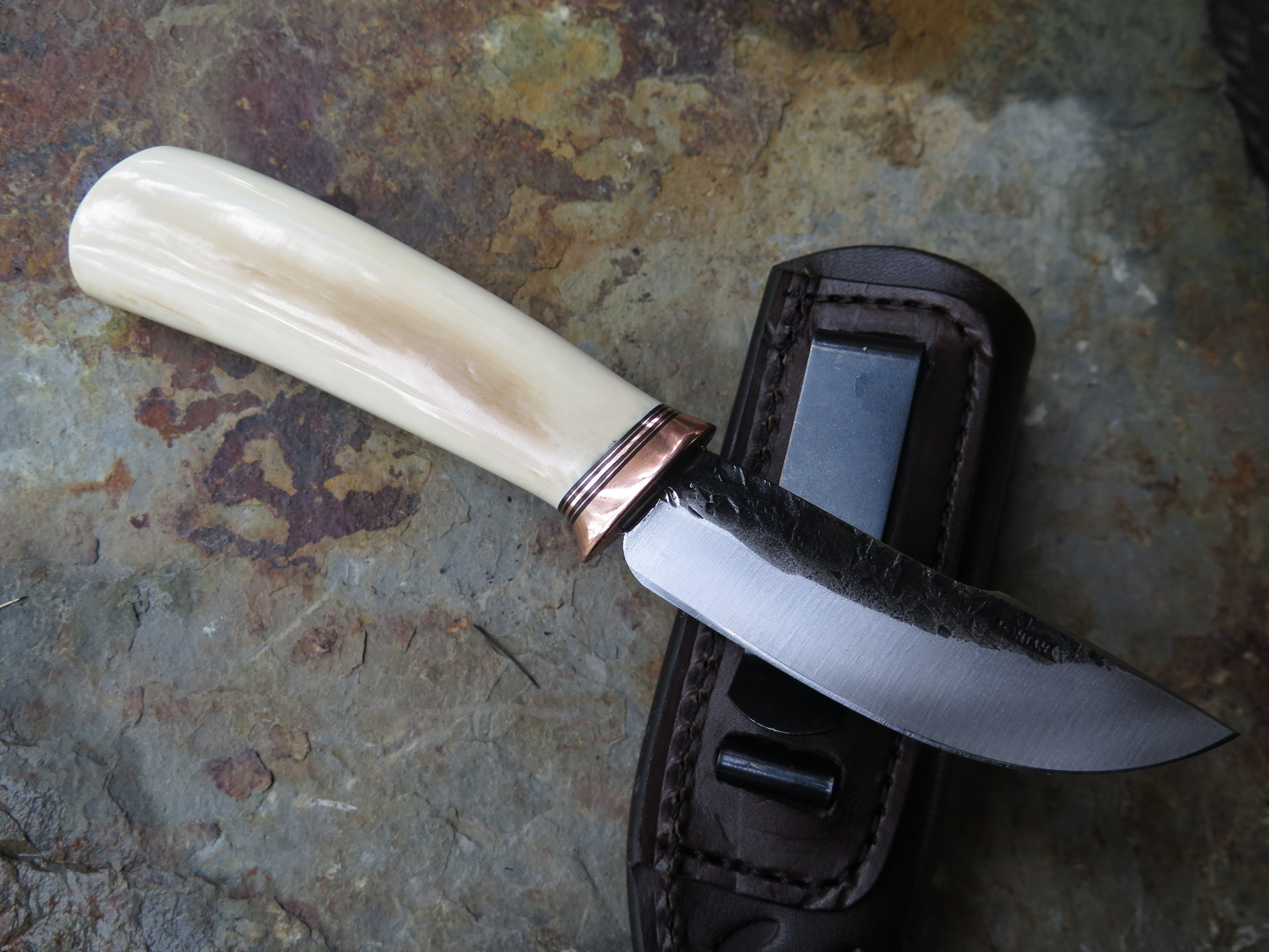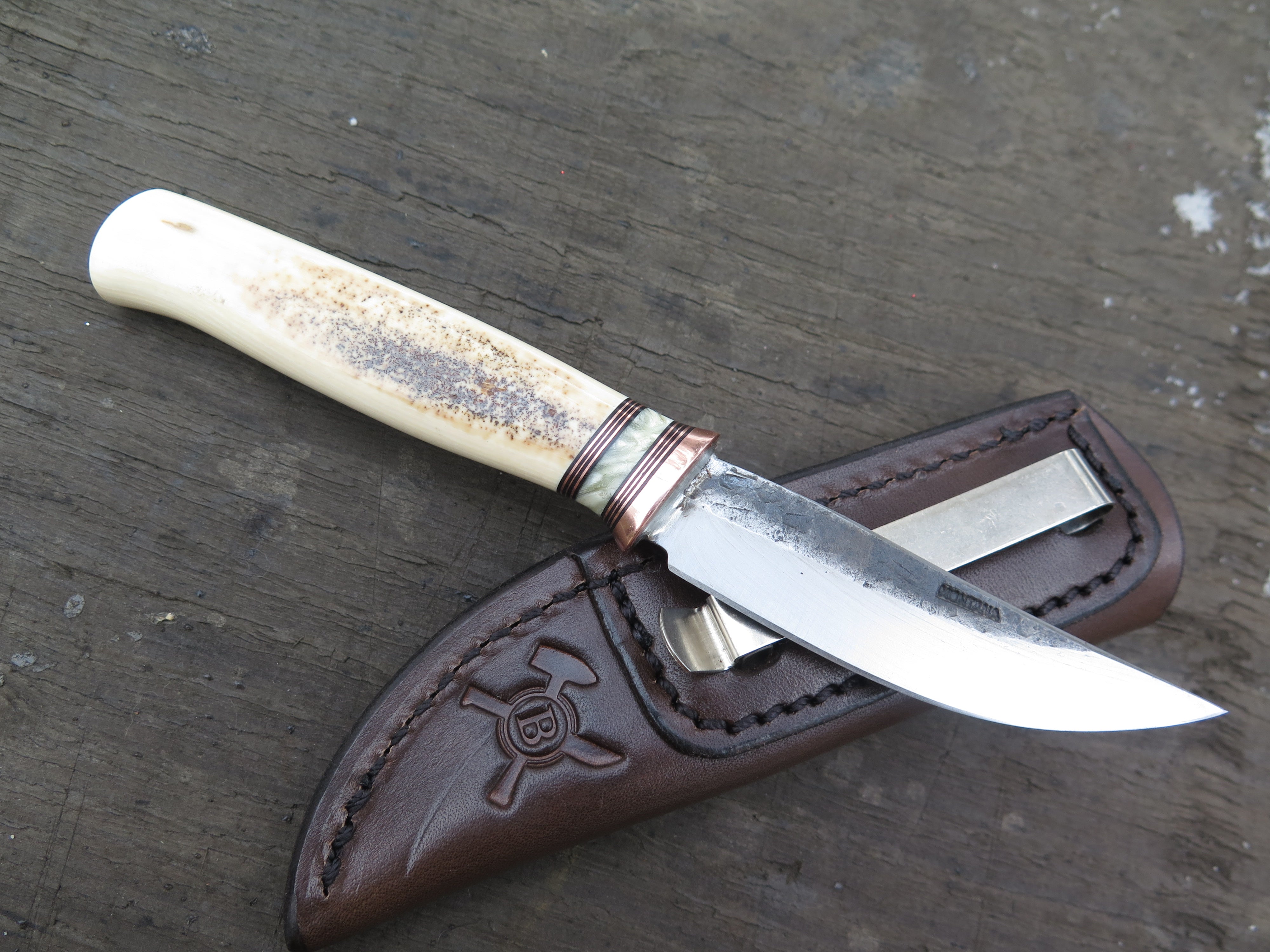 This remarkable fixed blade Pocket Knife from Behring Made© is hand forged from 1/8" thick high carbon 01 tool steel and it measures 3" from tip to guard with a razor sharp hollow grind and our hammermark finish. The copper guard is soldered in place above black fiber, copper and musk ox boss spacers as well as a gorgeous handle of ancient mammoth ivory. The overall length measures a total of 6 1/2" and it comes in a leather pocket clip sheath.