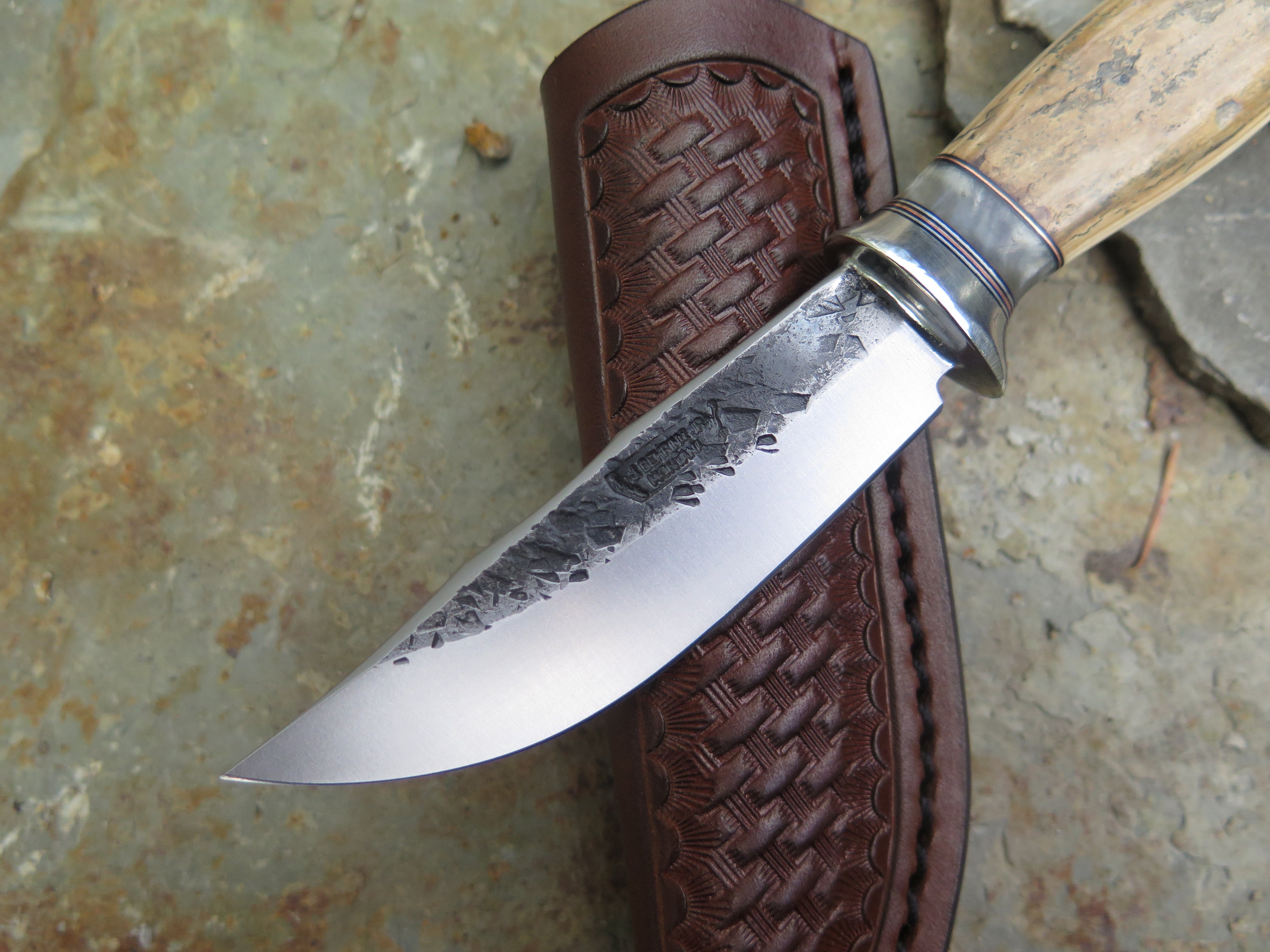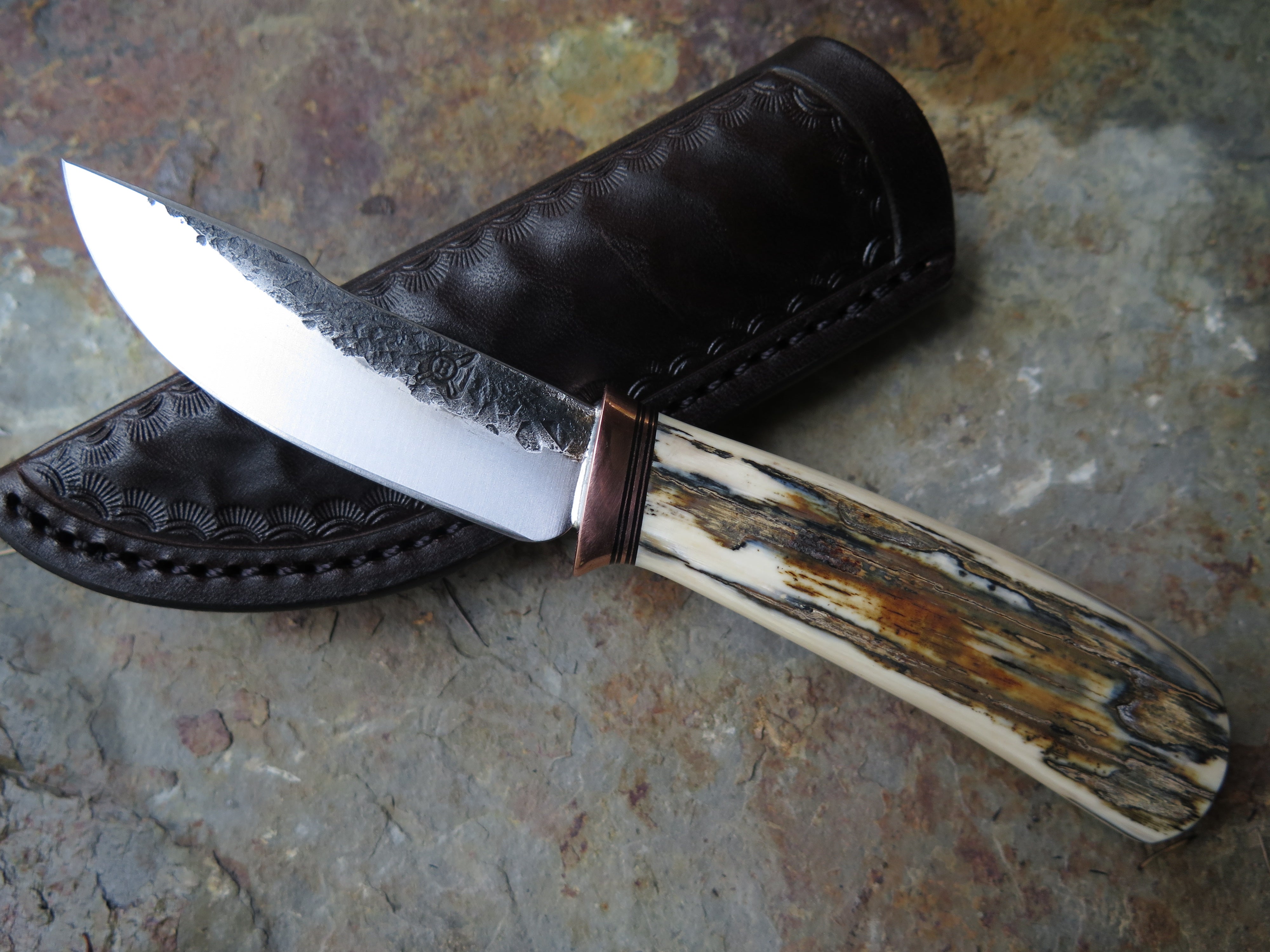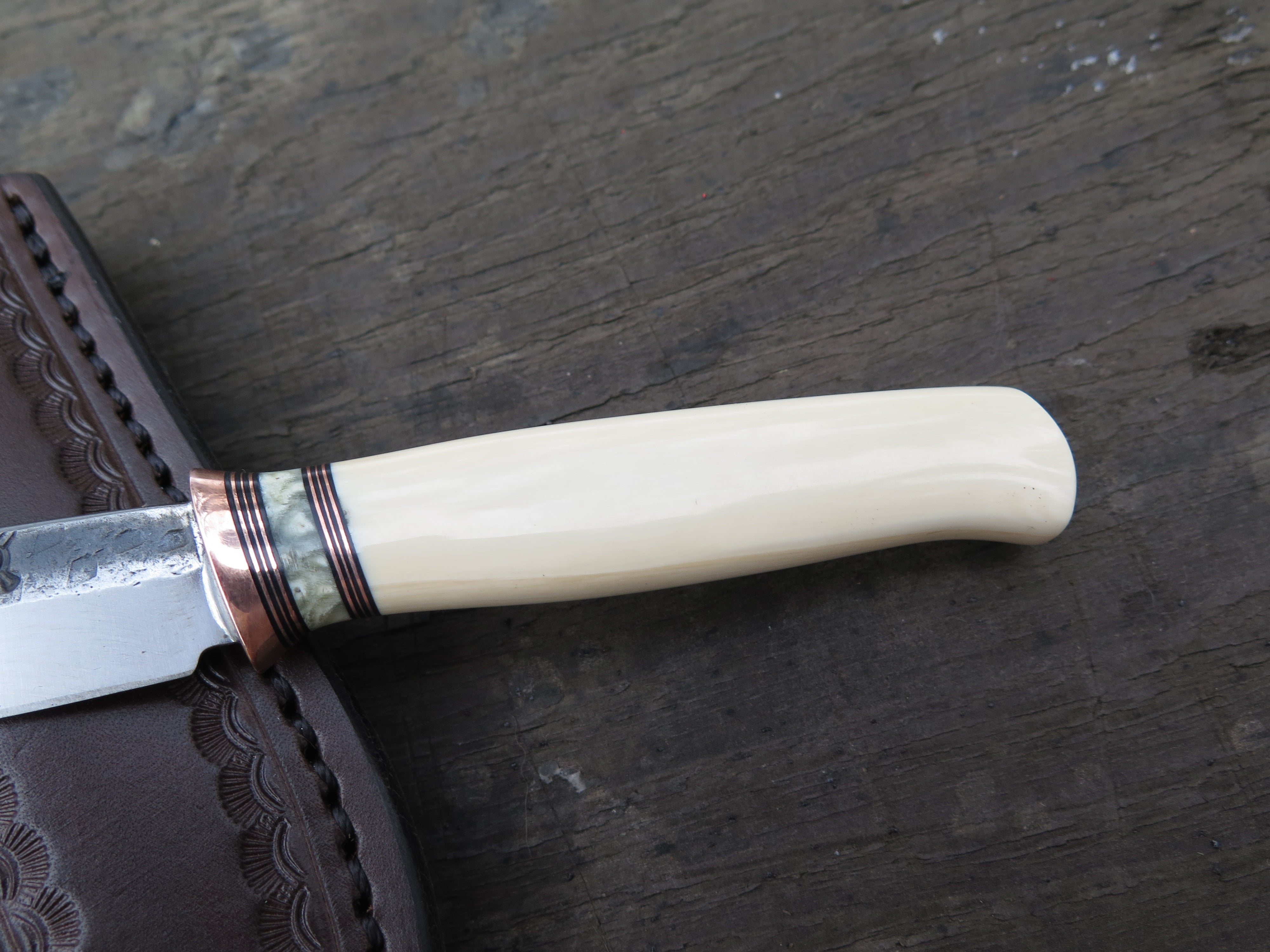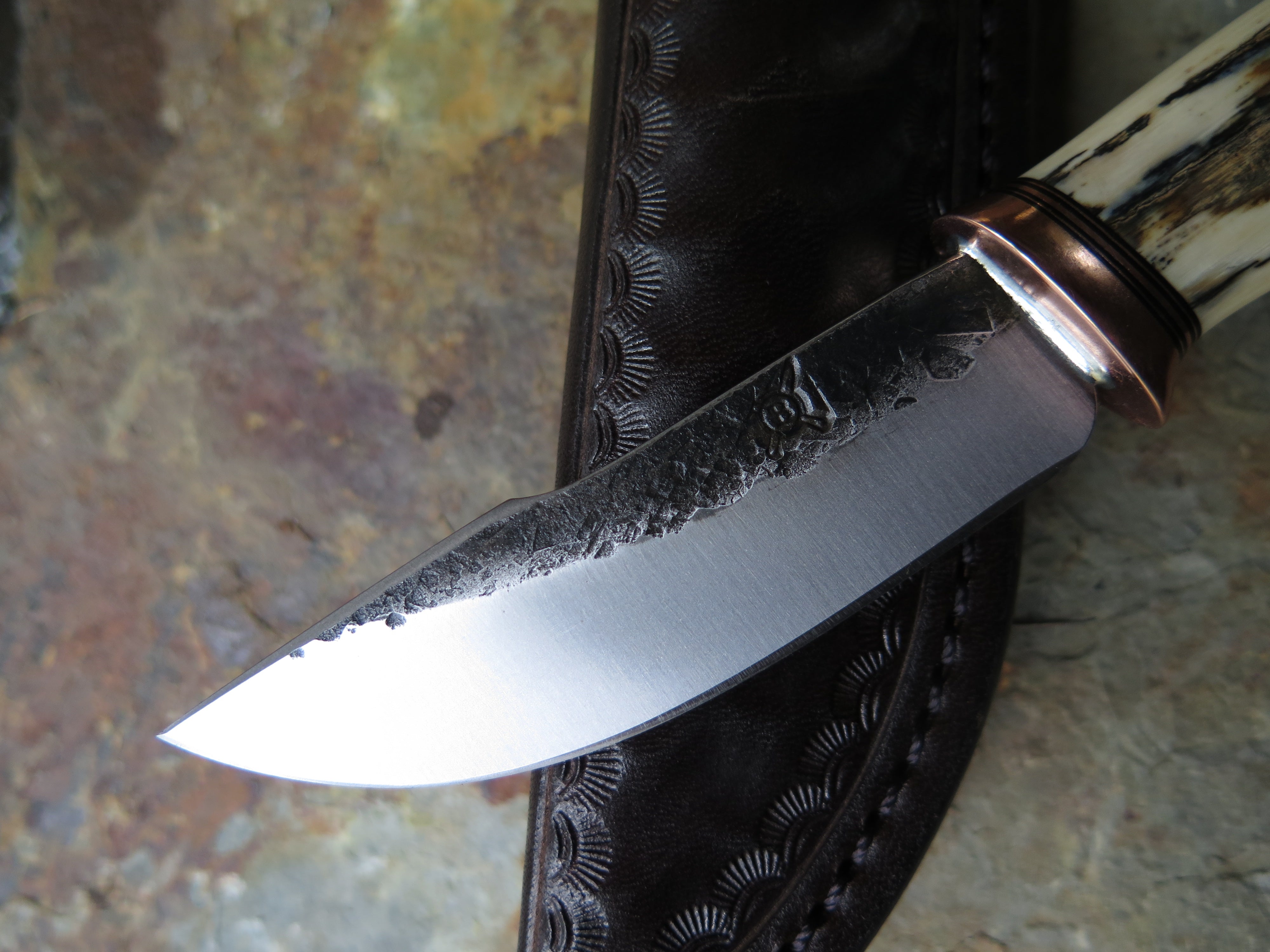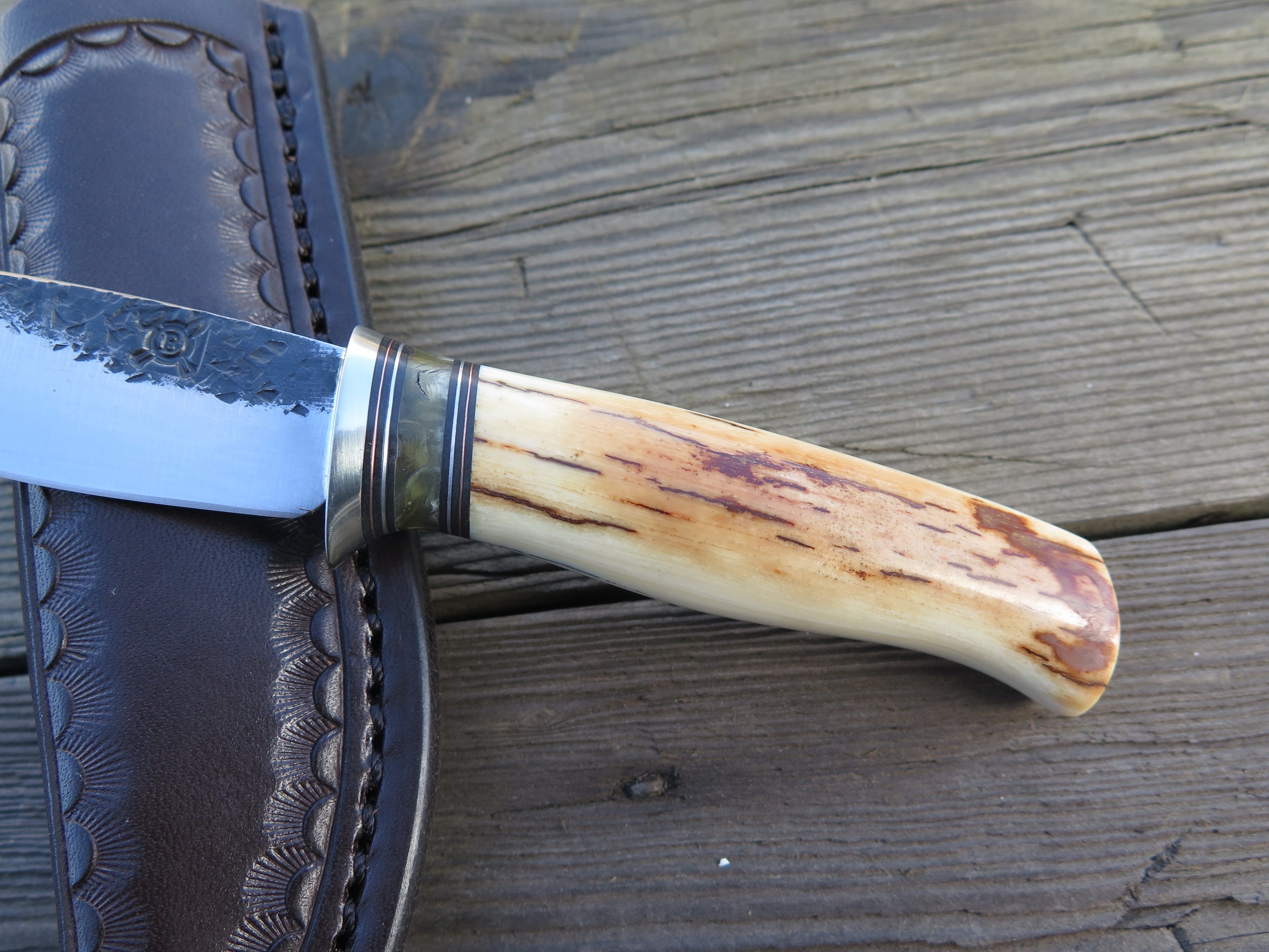 This remarkable fixed blade Pocket Knife from Behring Made© is hand forged from 1/8" thick high carbon 01 tool steel and it measures 3" from tip to guard with a razor sharp hollow grind and our hammermark finish. The copper guard is soldered in place above black fiber, copper and musk ox boss spacers as well as a gorgeous handle of ancient mammoth ivory. The overall length measures a total of 6 1/2" and it comes in a leather pocket clip sheath.